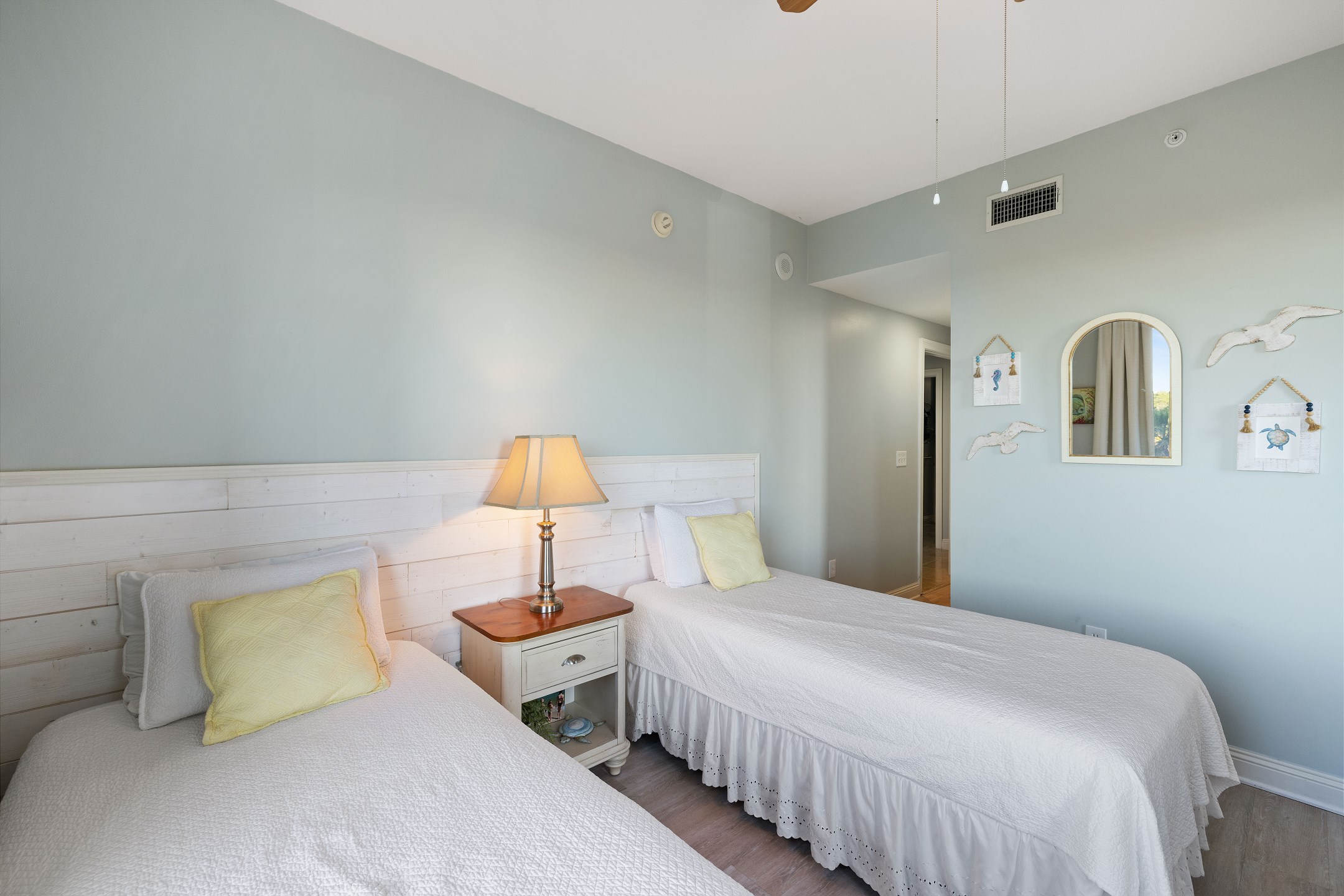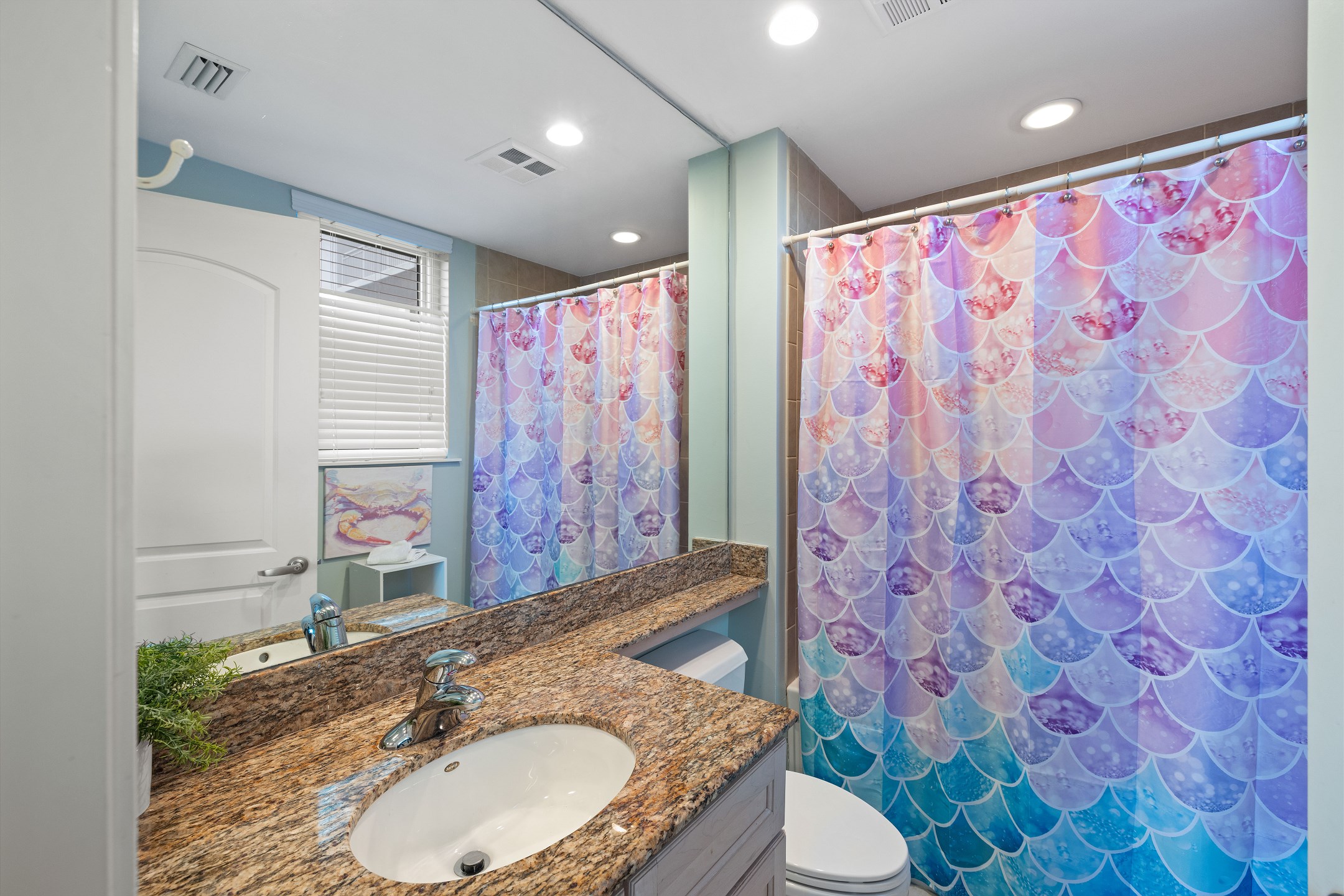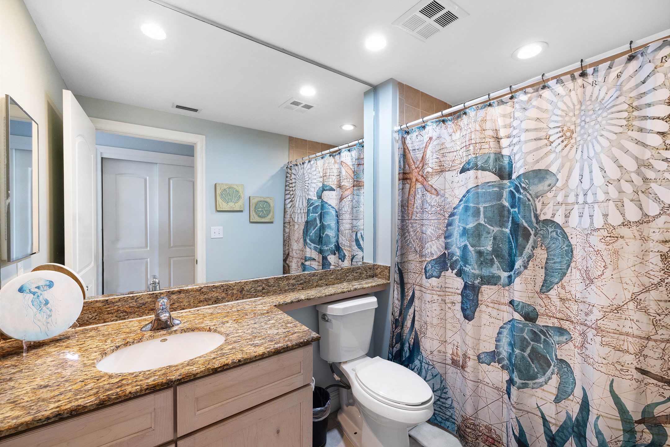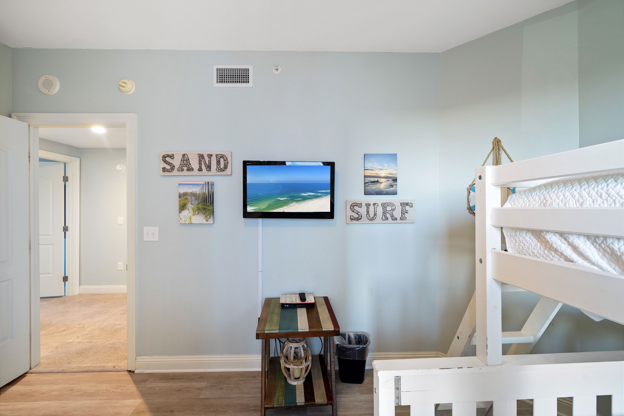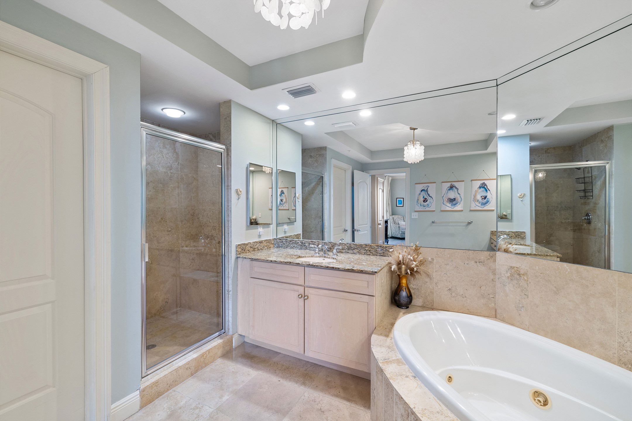 The primary bedroom is a relaxing retreat with a king bed, floor-to-ceiling windows leading out to the balcony, and a private ensuite bathroom featuring a jetted tub and a walk-in shower. The second bedroom also offers a king bed and an ensuite bathroom with granite countertops and a tiled shower tub combination. The third bedroom includes a twin over full bunk bed along with an additional twin bed, while the fourth bedroom features two twin beds, providing flexible sleeping options for families or groups.