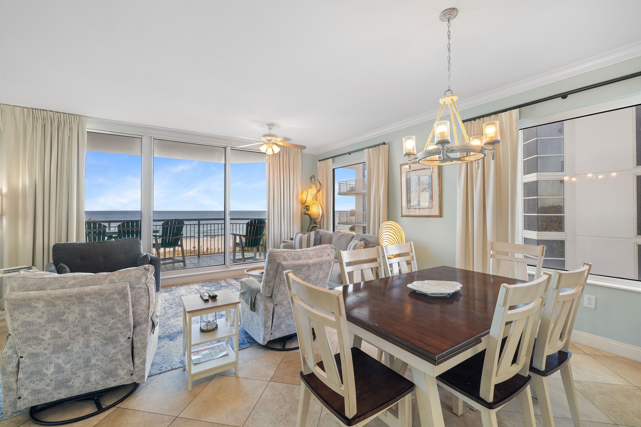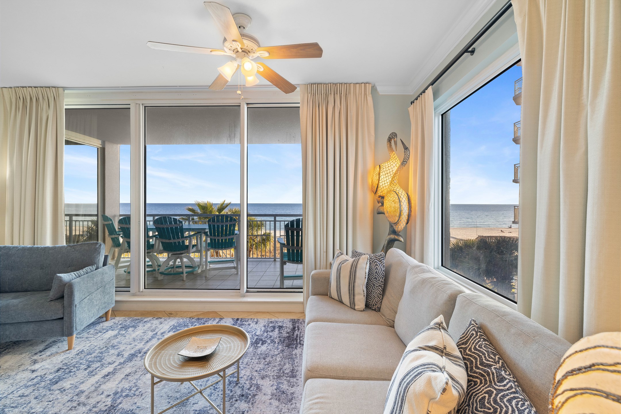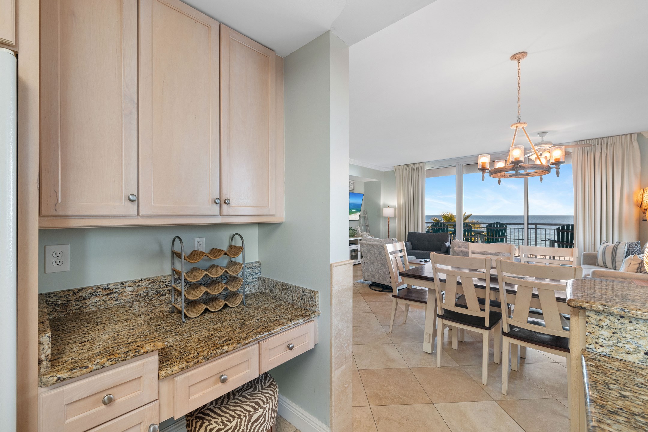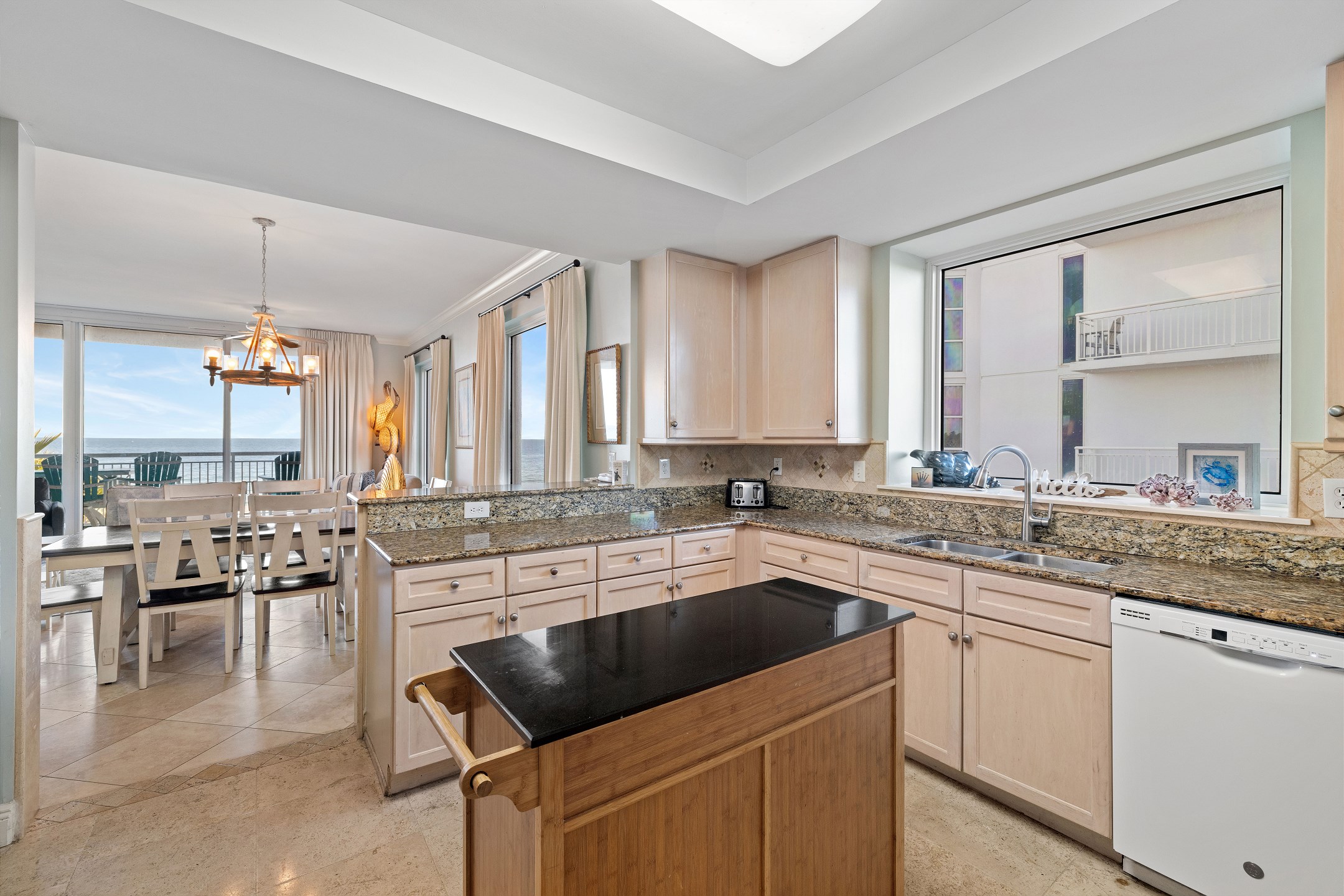 The bright and open living room is designed to impress, featuring panoramic floor-to-ceiling windows that fill the space with natural light and provide direct access to a private balcony overlooking the Gulf. With comfortable seating and a sofa sleeper, this inviting space is perfect for relaxing after a day at the beach. The fully equipped kitchen includes granite countertops and a dining table, making it easy to prepare and enjoy meals together.