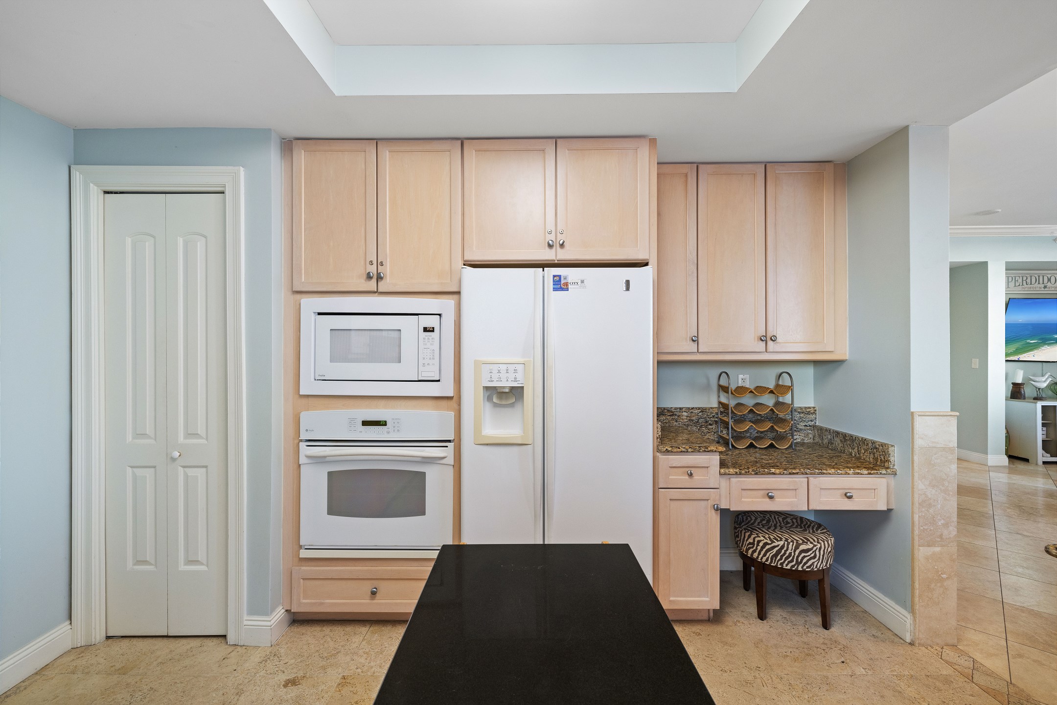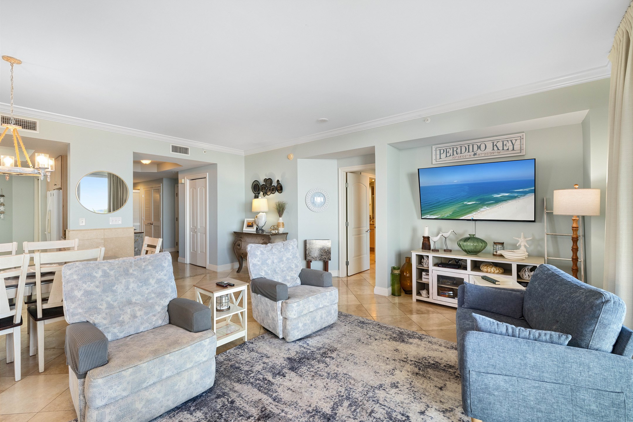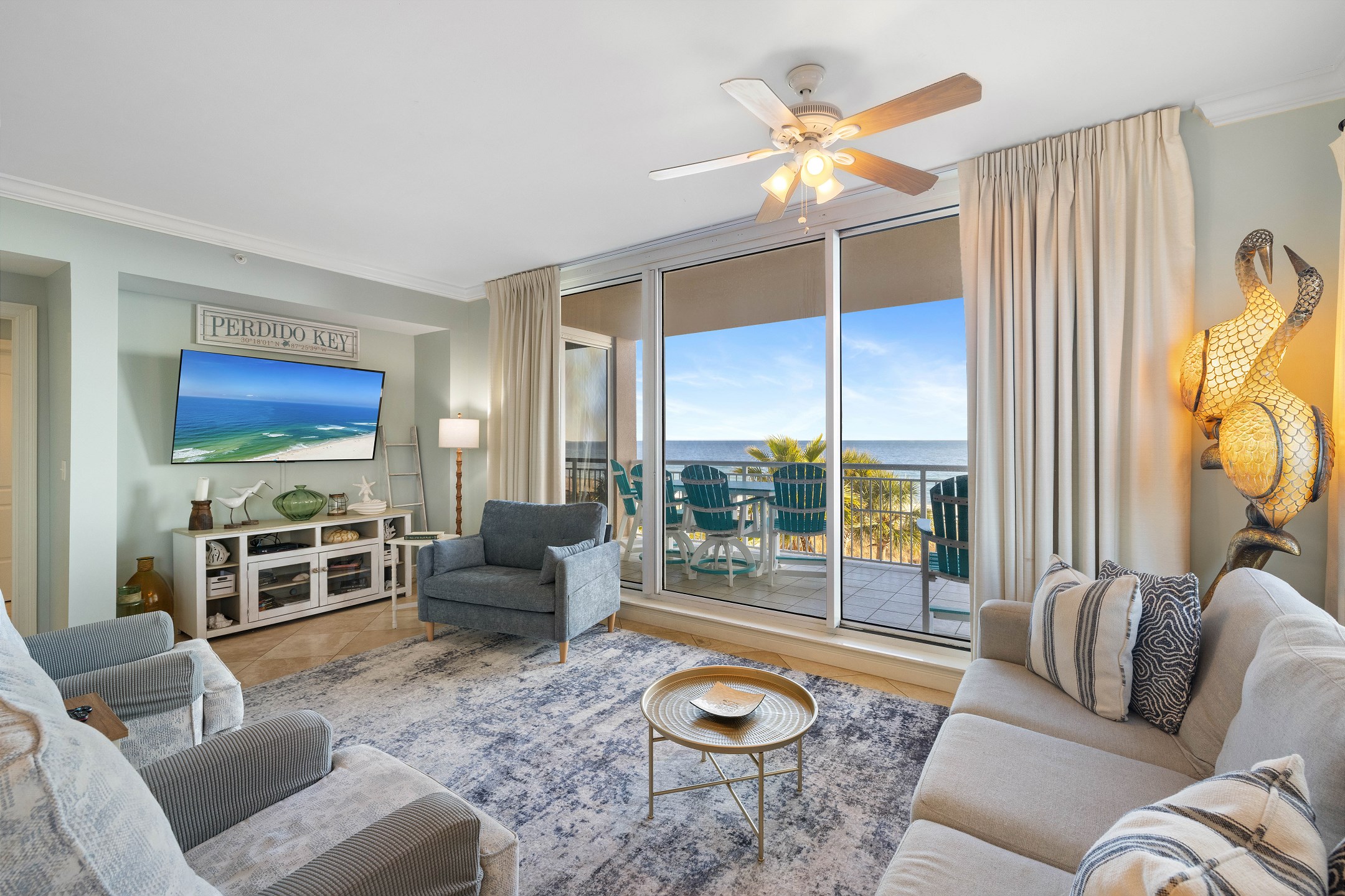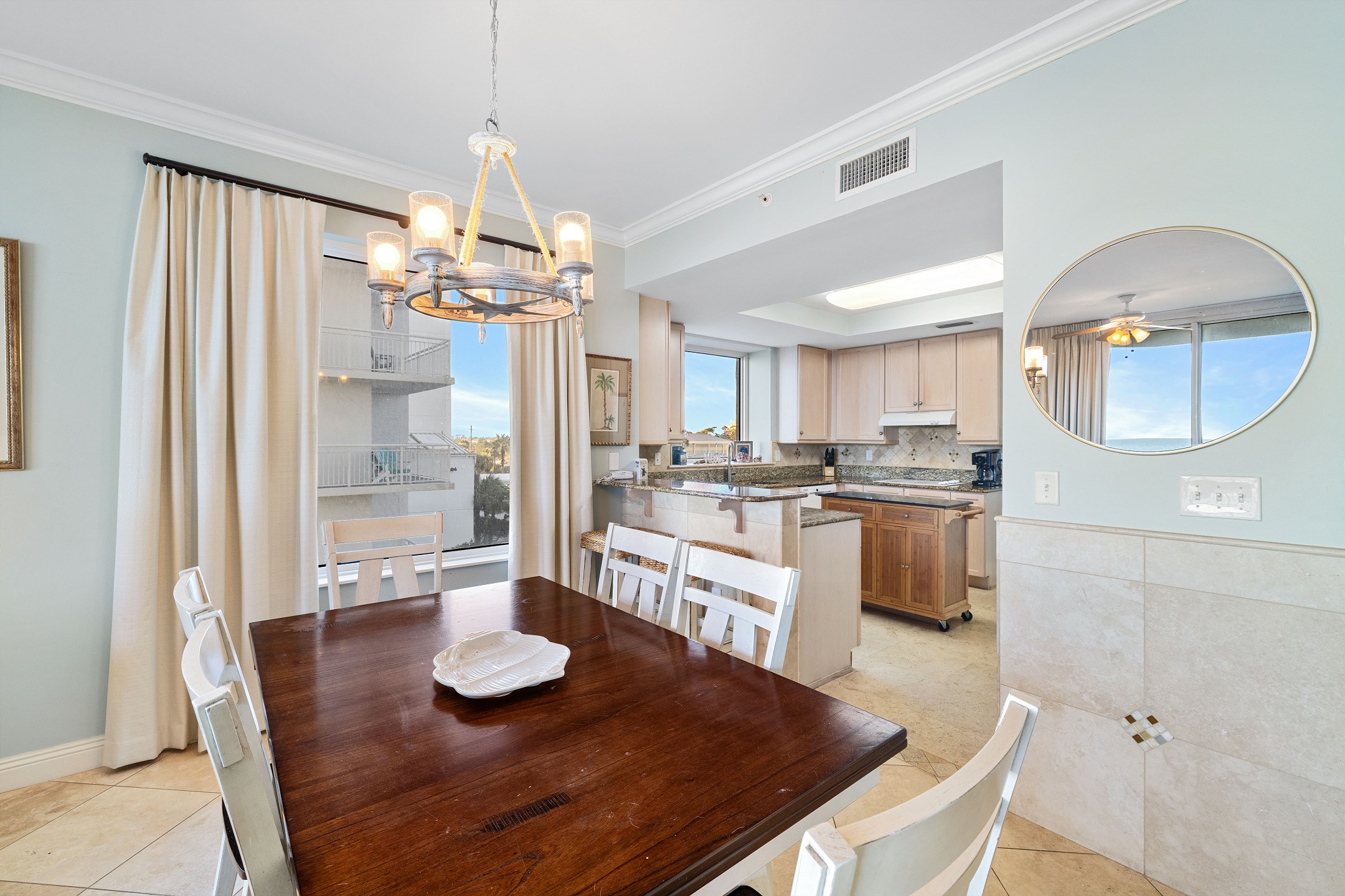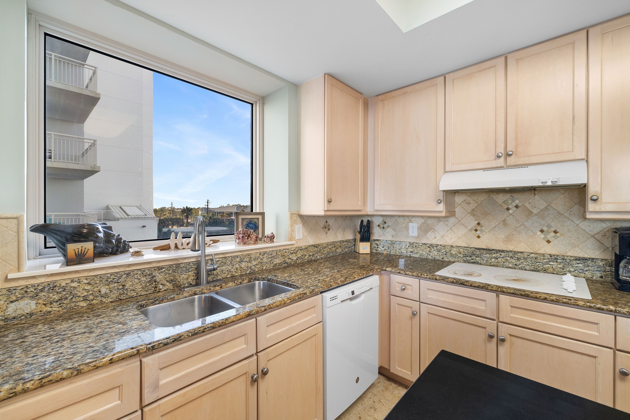 The bright and open living room is designed to impress, featuring panoramic floor-to-ceiling windows that fill the space with natural light and provide direct access to a private balcony overlooking the Gulf. With comfortable seating and a sofa sleeper, this inviting space is perfect for relaxing after a day at the beach. The fully equipped kitchen includes granite countertops and a dining table, making it easy to prepare and enjoy meals together.