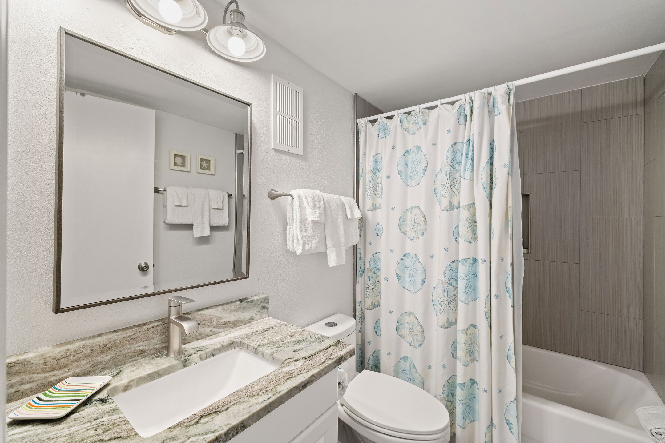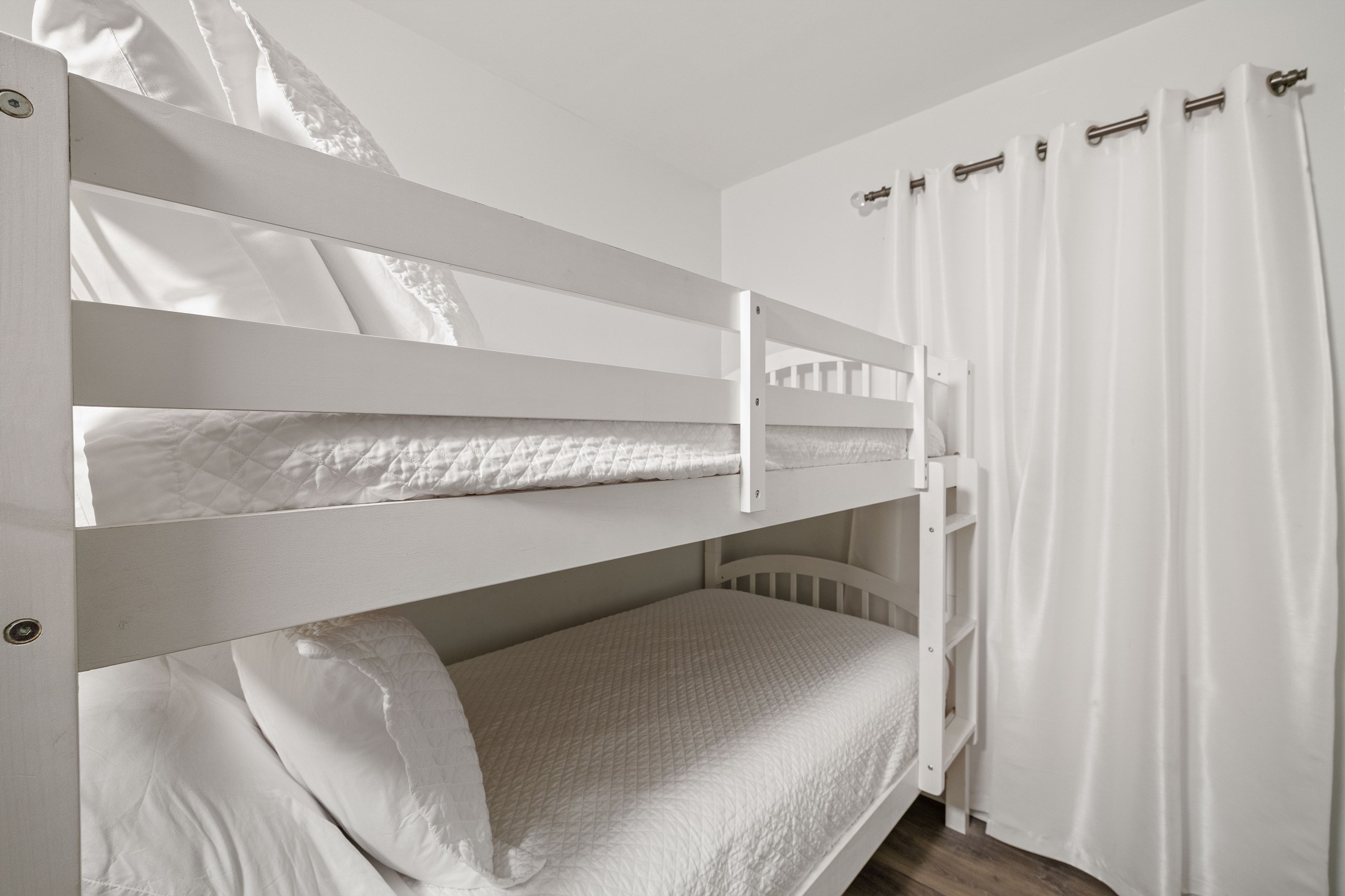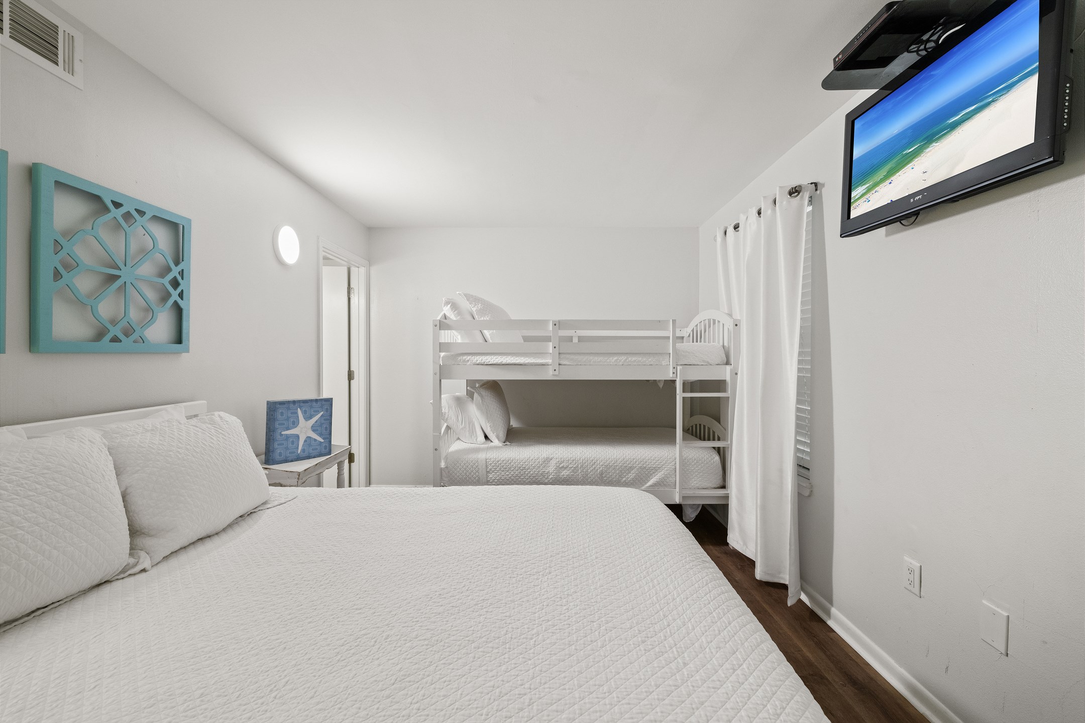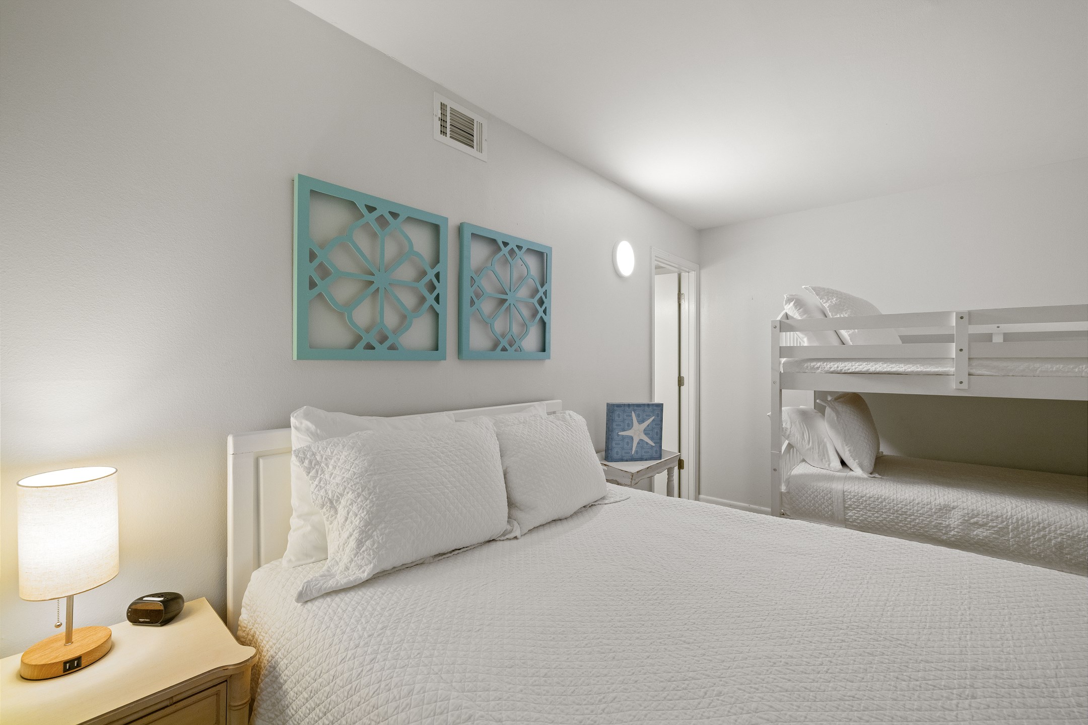 The primary bedroom offers a king bed and an ensuite bathroom with a tiled walk-in shower. The second bedroom includes a queen bed and a twin-over-twin bunk bed, making it ideal for families or groups. A sofa sleeper in the living room provides additional sleeping space.