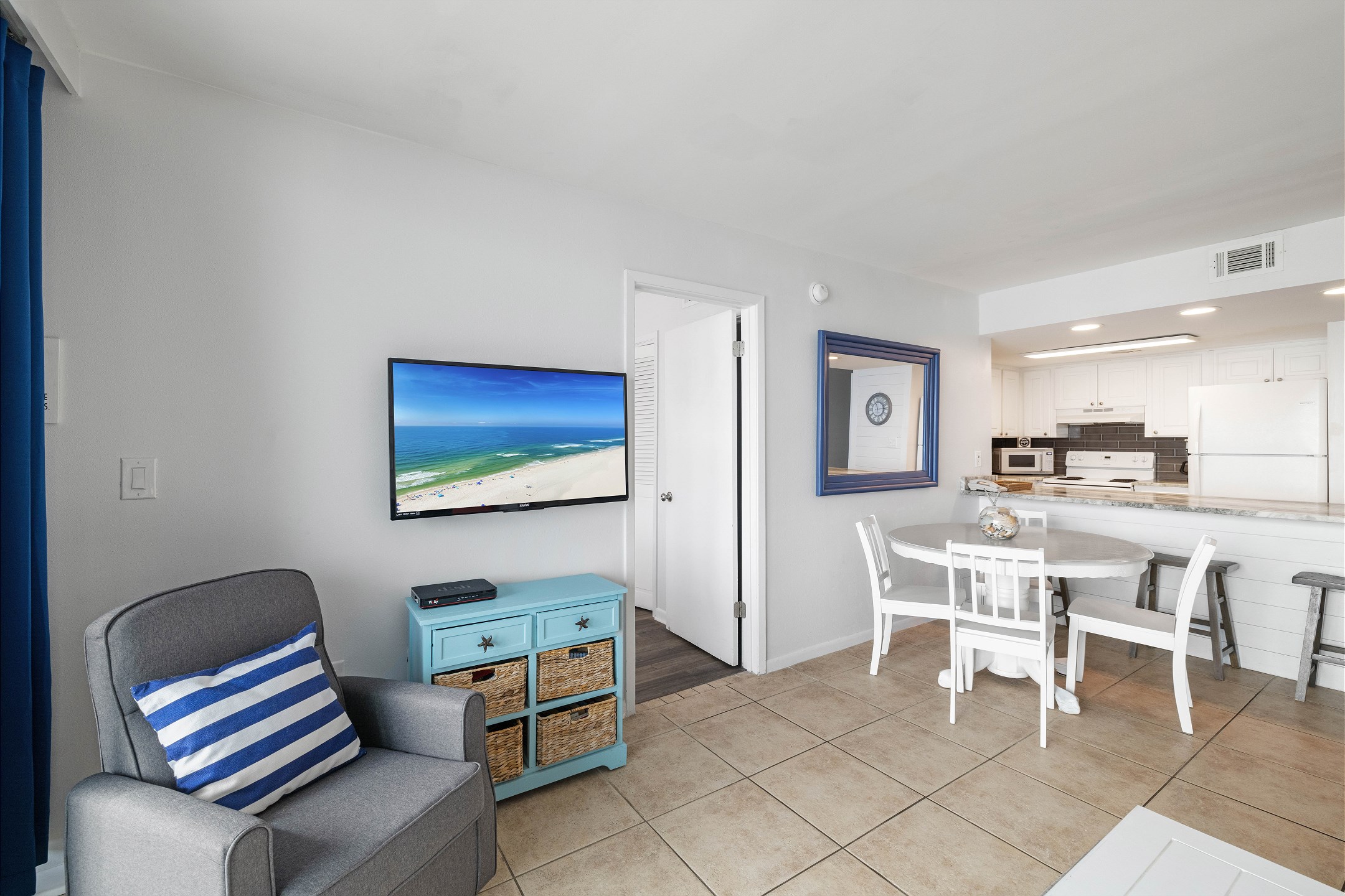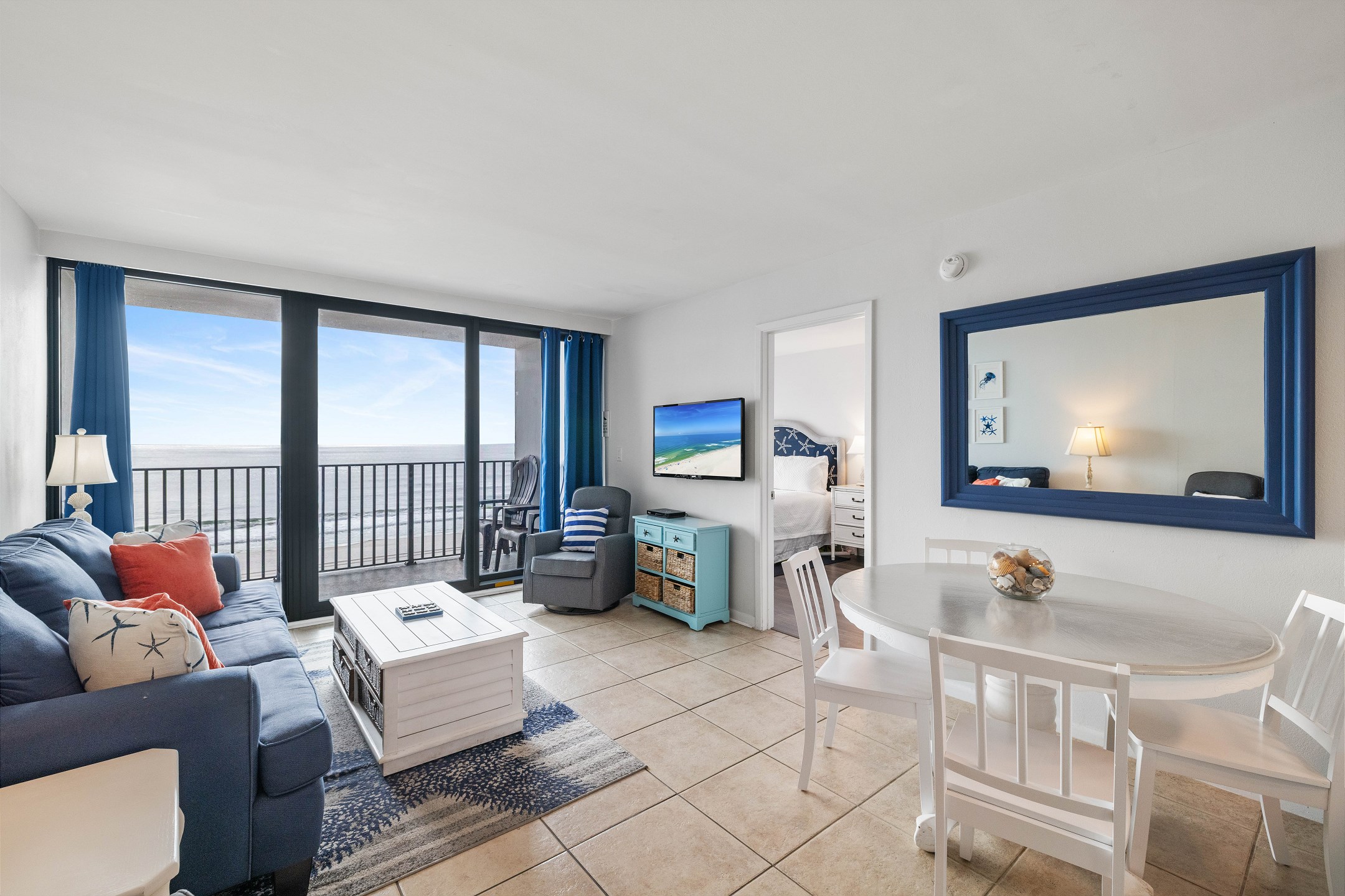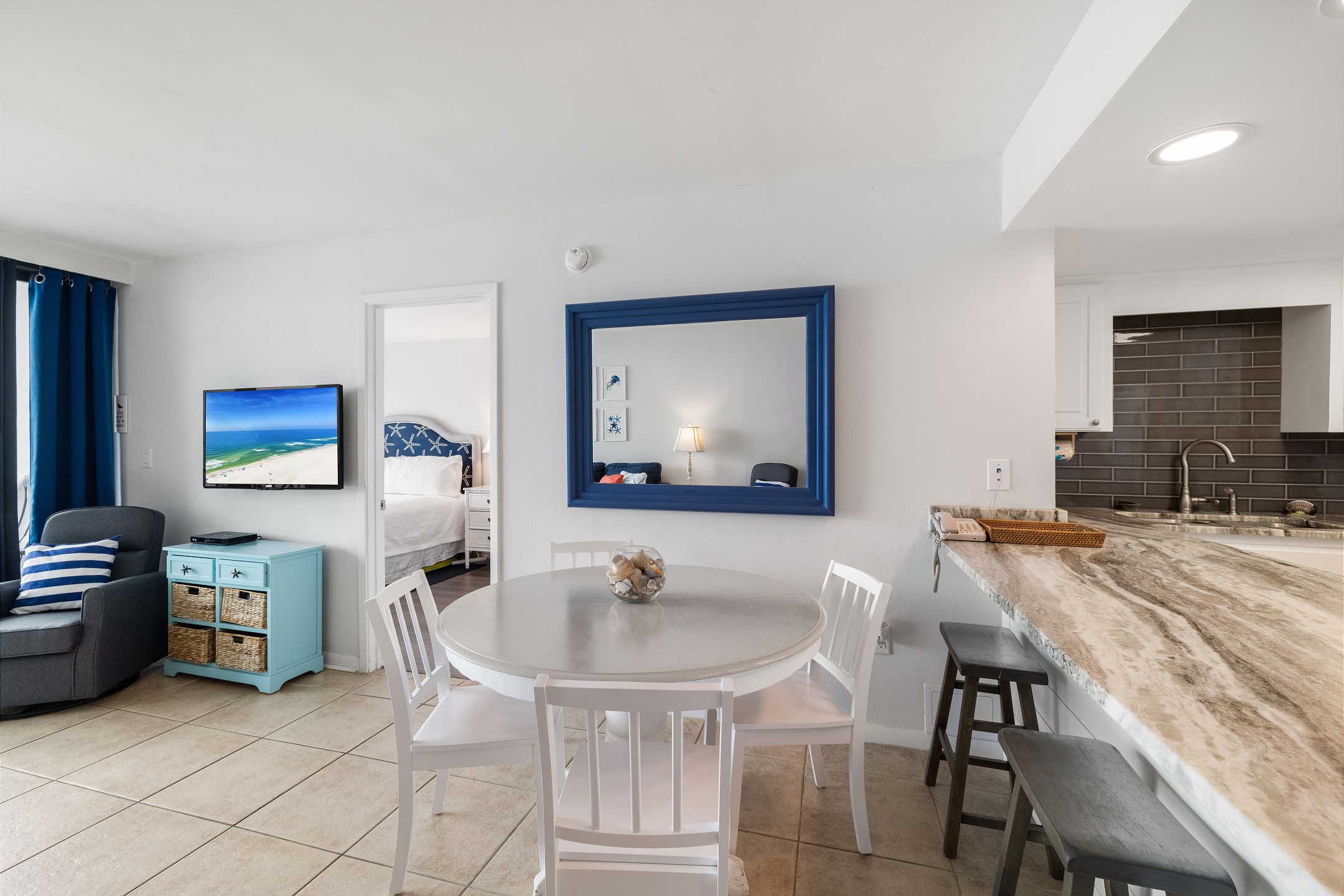 The living room features a flat-screen TV and floor-to-ceiling windows leading out to a private balcony overlooking the Gulf, the perfect spot to relax and take in the stunning views. The fully equipped kitchen includes granite countertops and a dining table, providing everything you need to enjoy meals together.