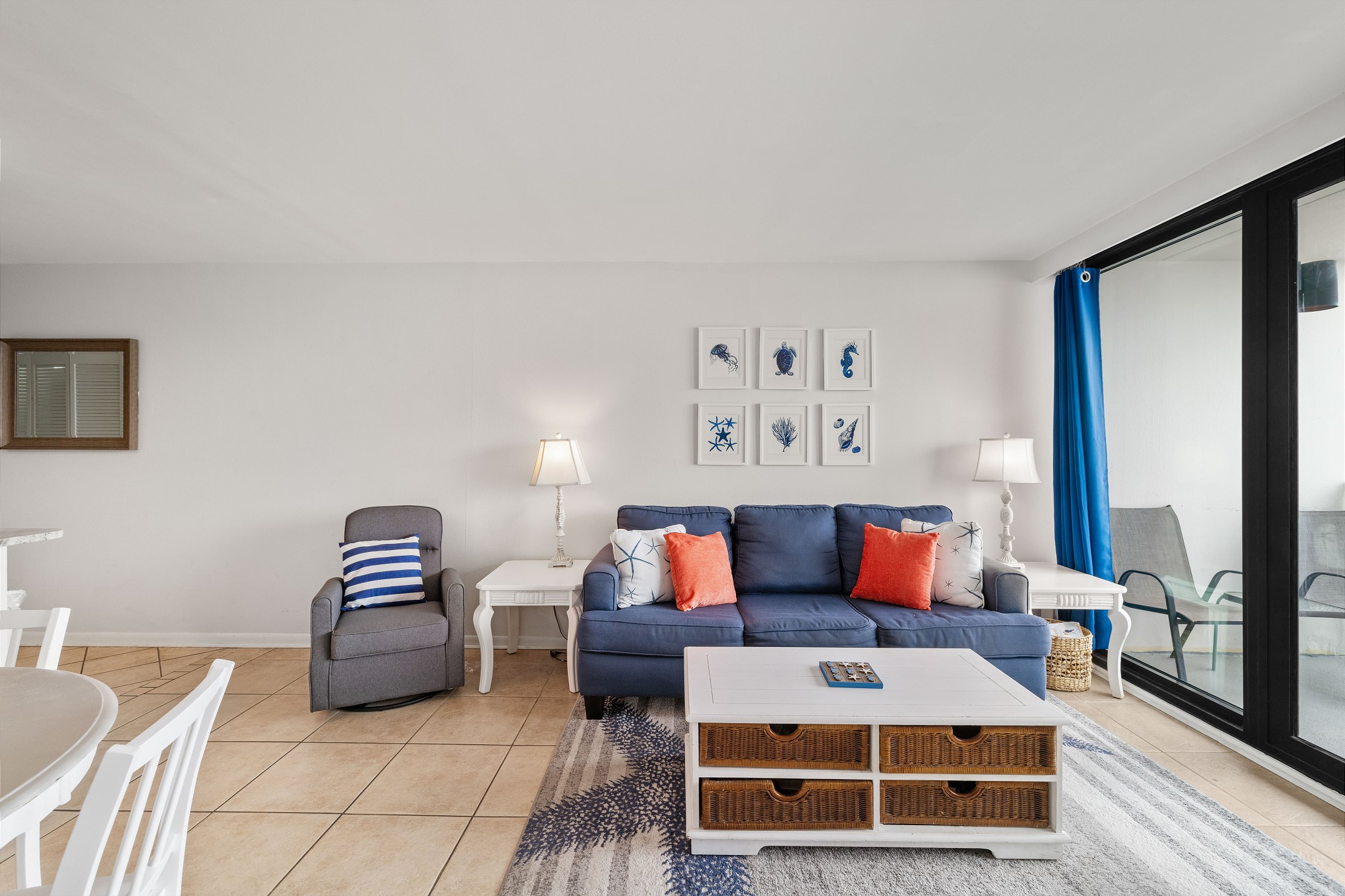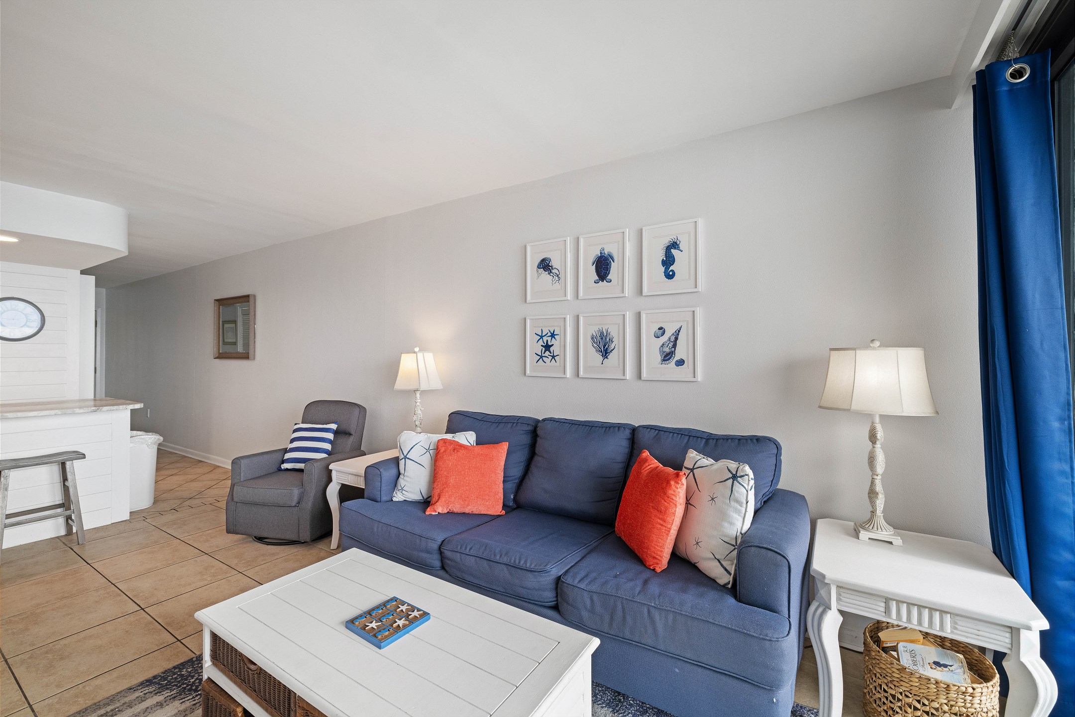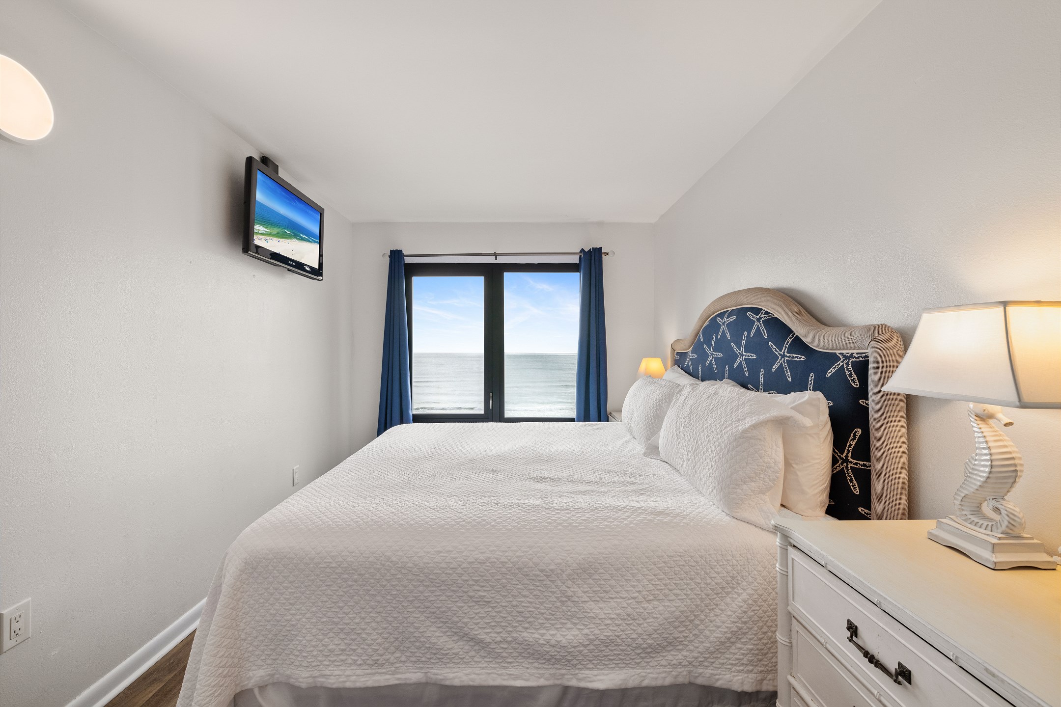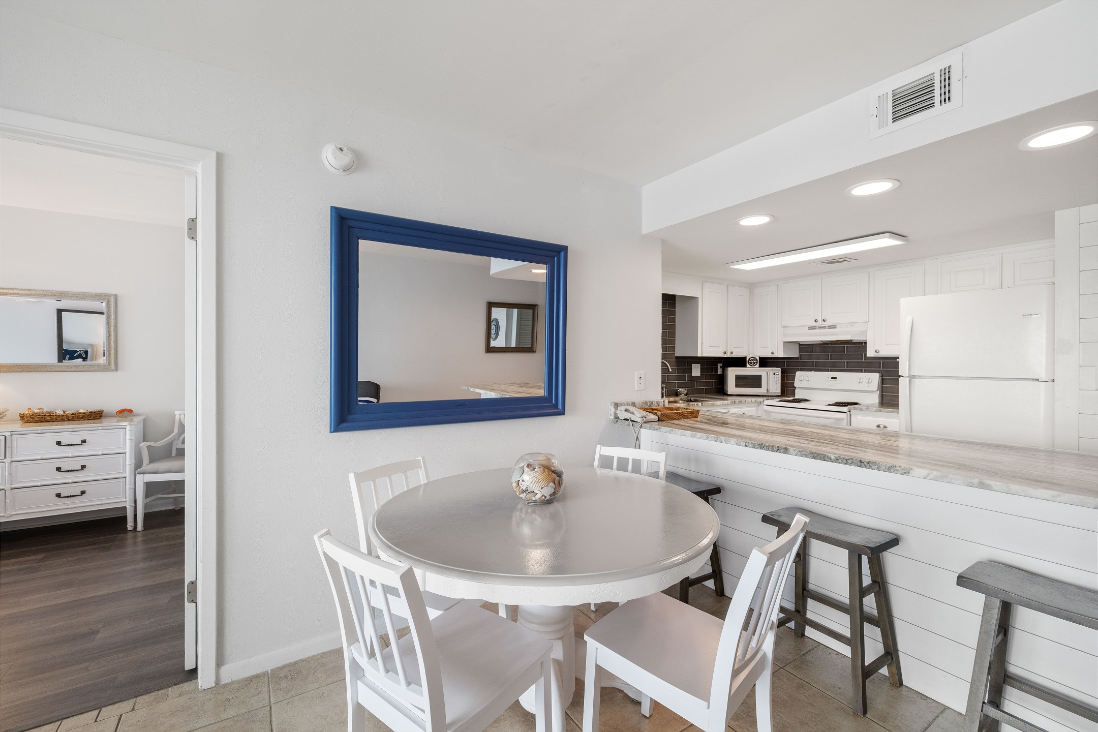 The living room features a flat-screen TV and floor-to-ceiling windows leading out to a private balcony overlooking the Gulf, the perfect spot to relax and take in the stunning views. The fully equipped kitchen includes granite countertops and a dining table, providing everything you need to enjoy meals together.