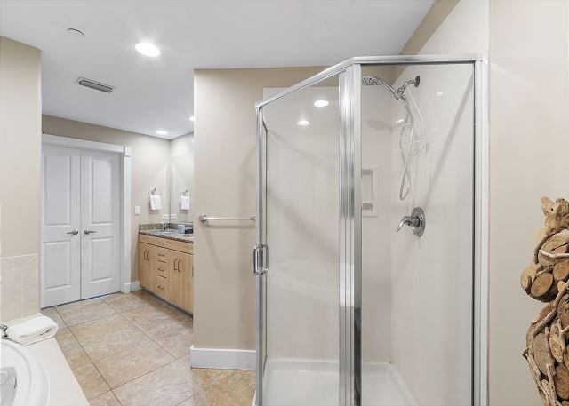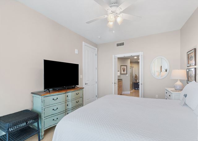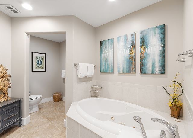 The primary bedroom and one guest room each feature a king bed, both with private baths. The master bath includes a separate shower and jetted tub, while the guest bath offers a tub/shower combination. The third bedroom has a queen bed and its own private bath with a tub/shower combination.