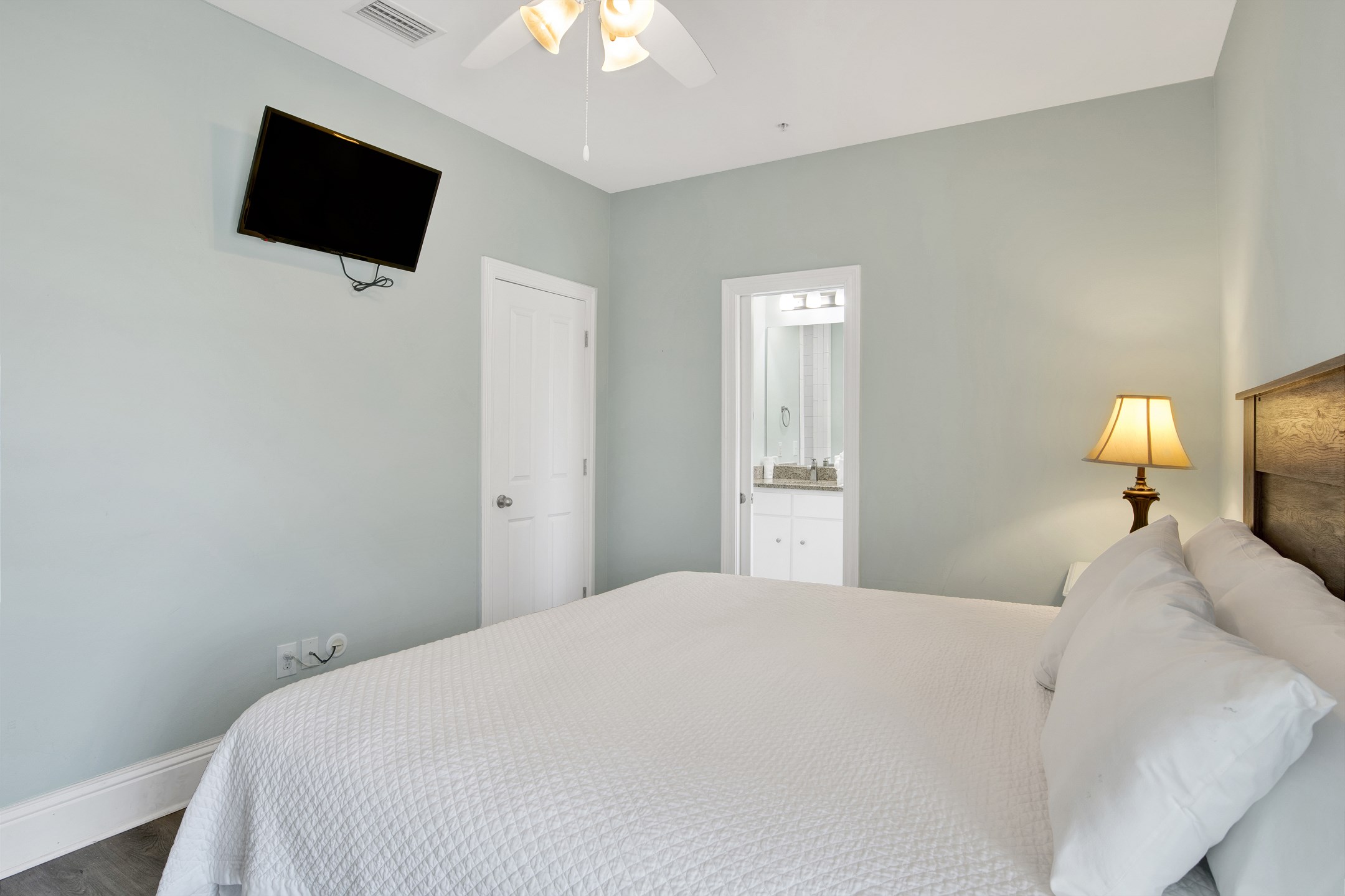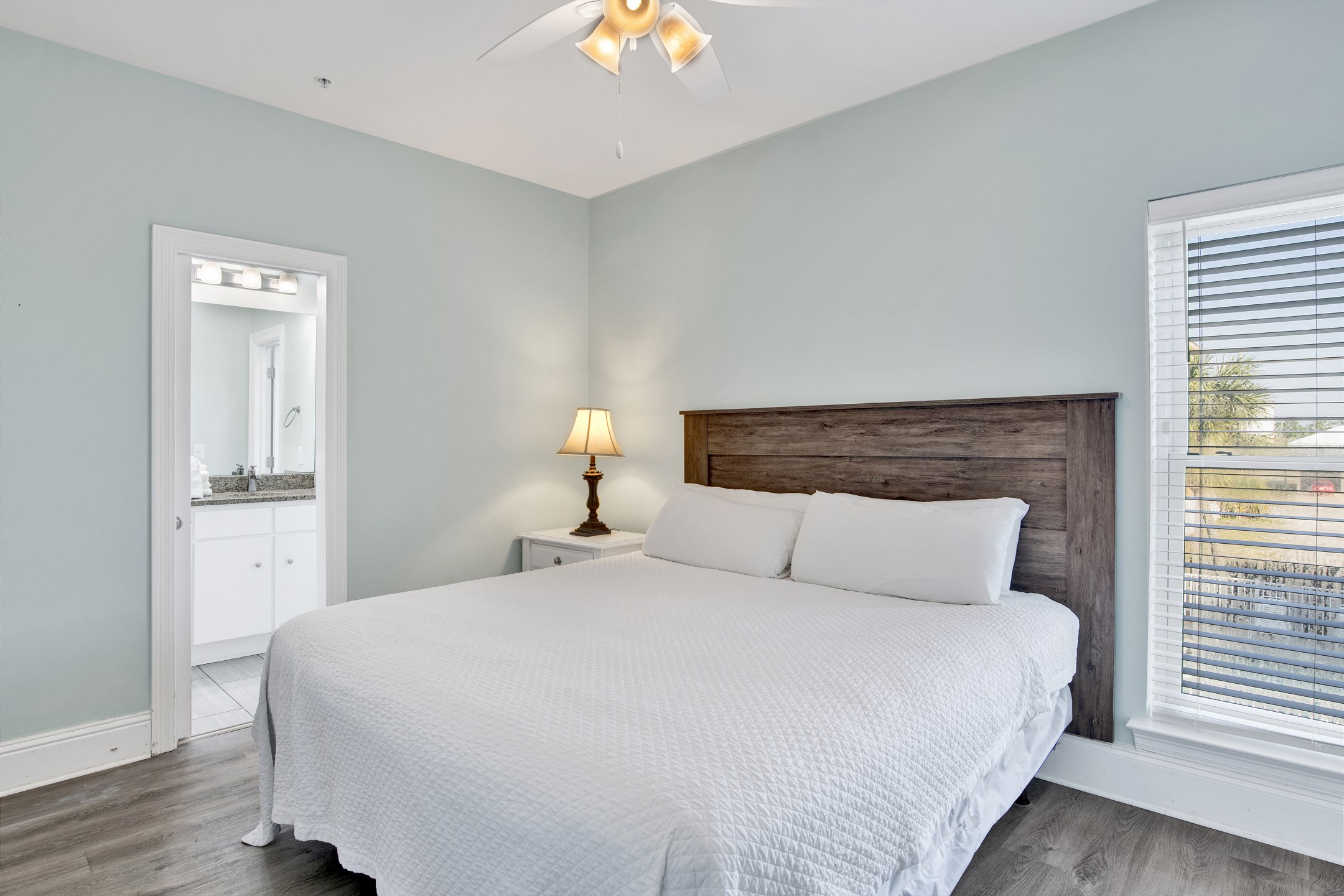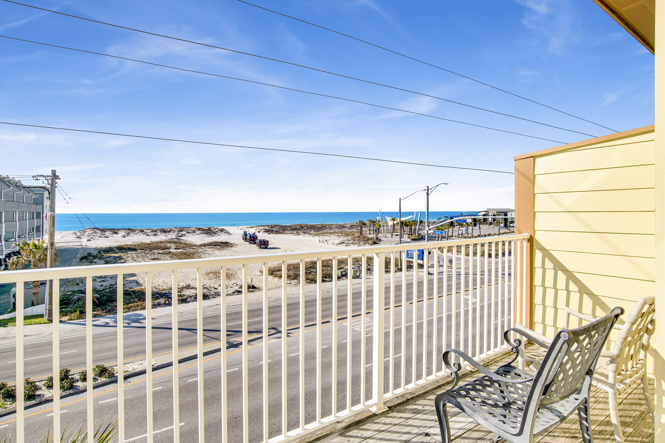 Each two-story townhouse features a fully equipped kitchen with stainless steel appliances and granite countertops, open living areas with comfortable seating and flat-screen TVs, and private balconies for enjoying the fresh Gulf breeze. Every unit includes a primary bedroom on the main floor with a king bed and ensuite bathroom, along with additional guest bedrooms upstairs featuring queen beds, private or shared bathrooms, and balcony access.