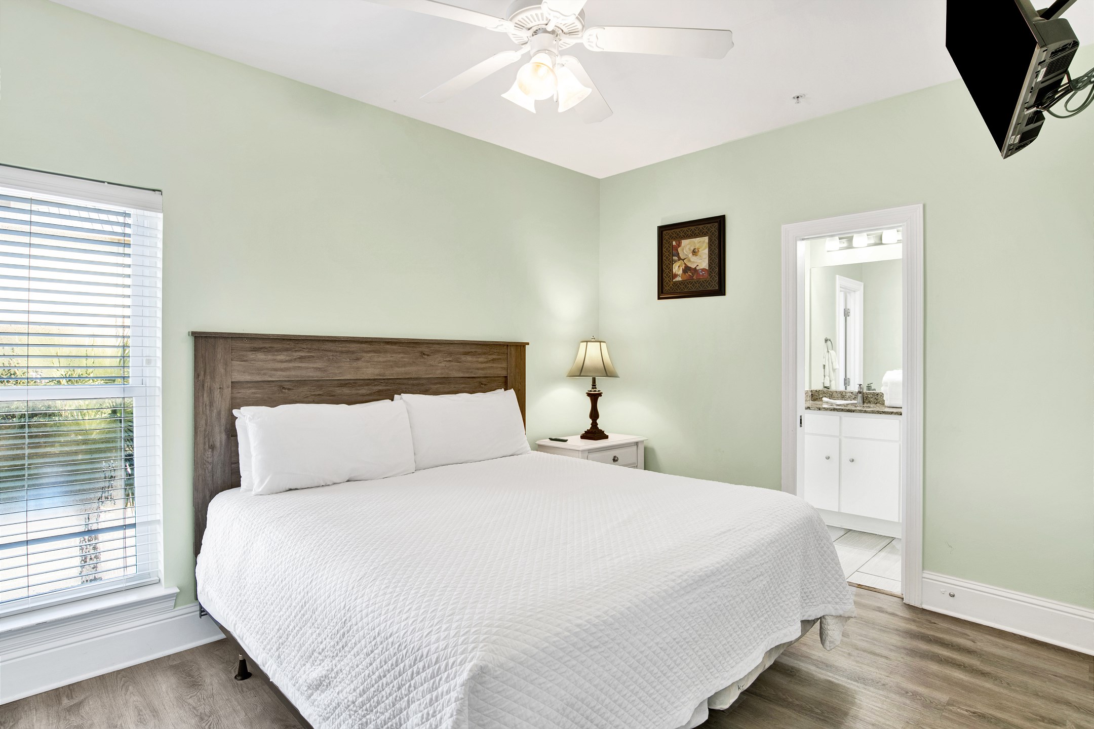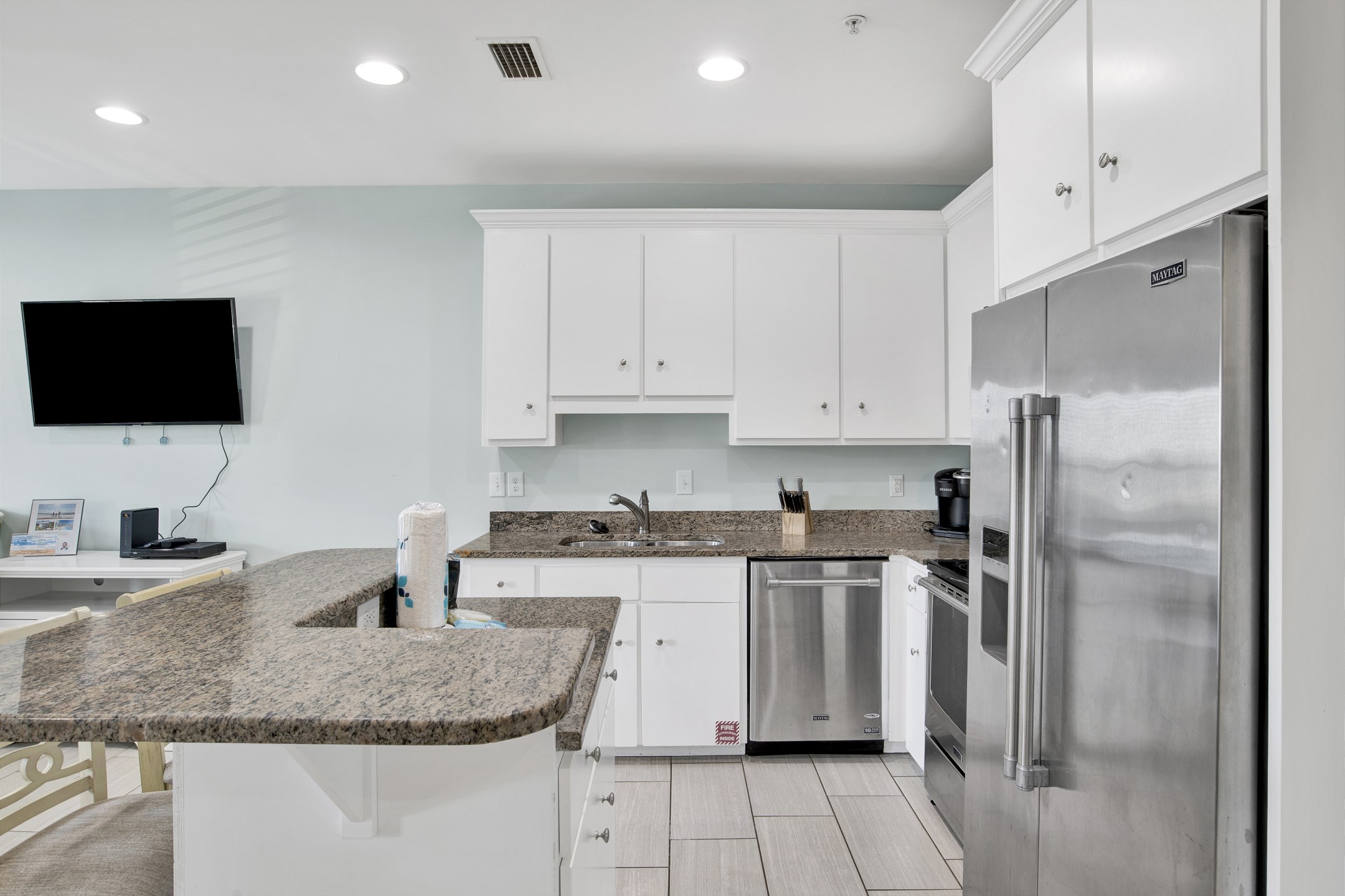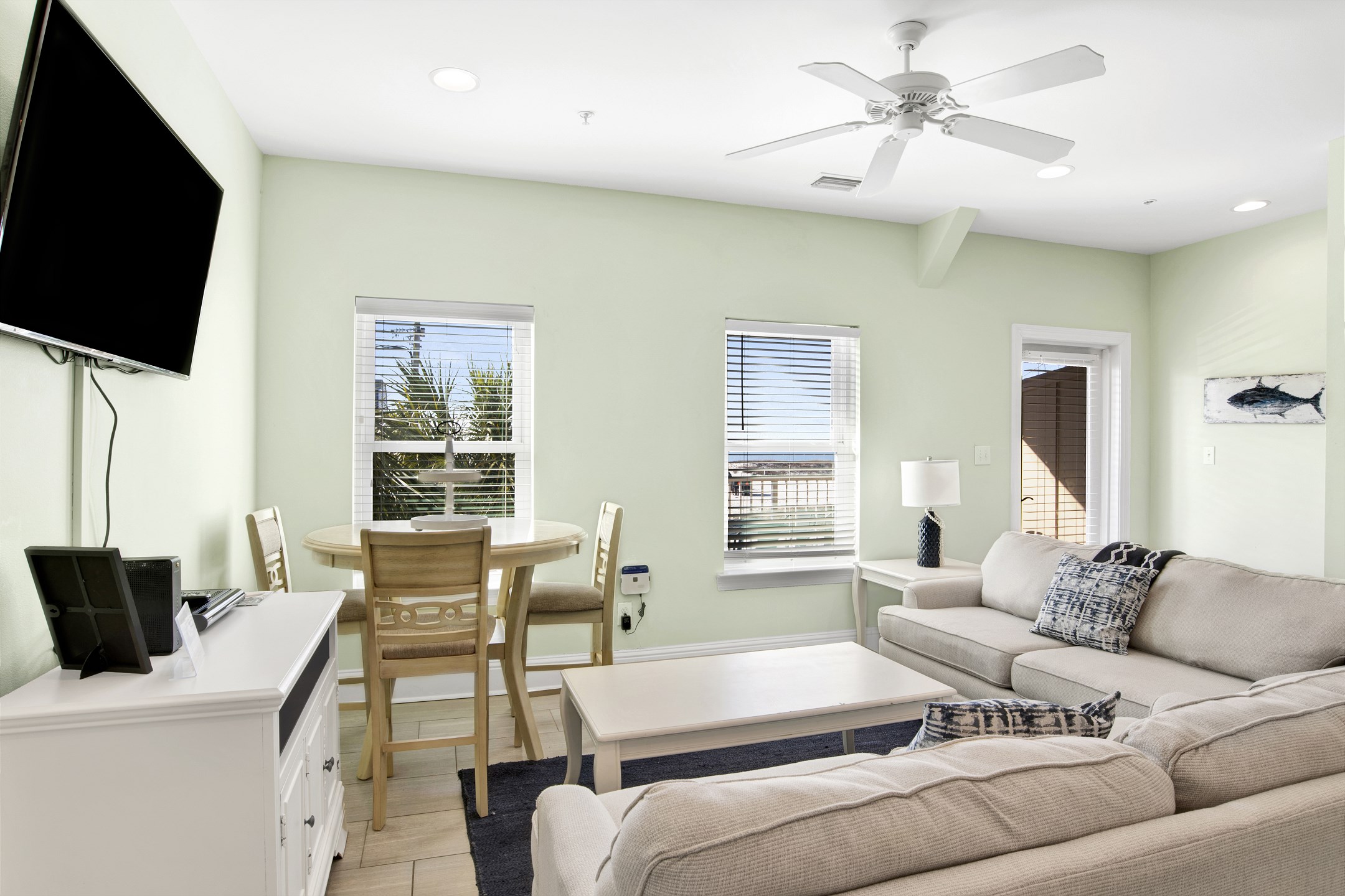 Each two-story townhouse features a fully equipped kitchen with stainless steel appliances and granite countertops, open living areas with comfortable seating and flat-screen TVs, and private balconies for enjoying the fresh Gulf breeze. Every unit includes a primary bedroom on the main floor with a king bed and ensuite bathroom, along with additional guest bedrooms upstairs featuring queen beds, private or shared bathrooms, and balcony access.