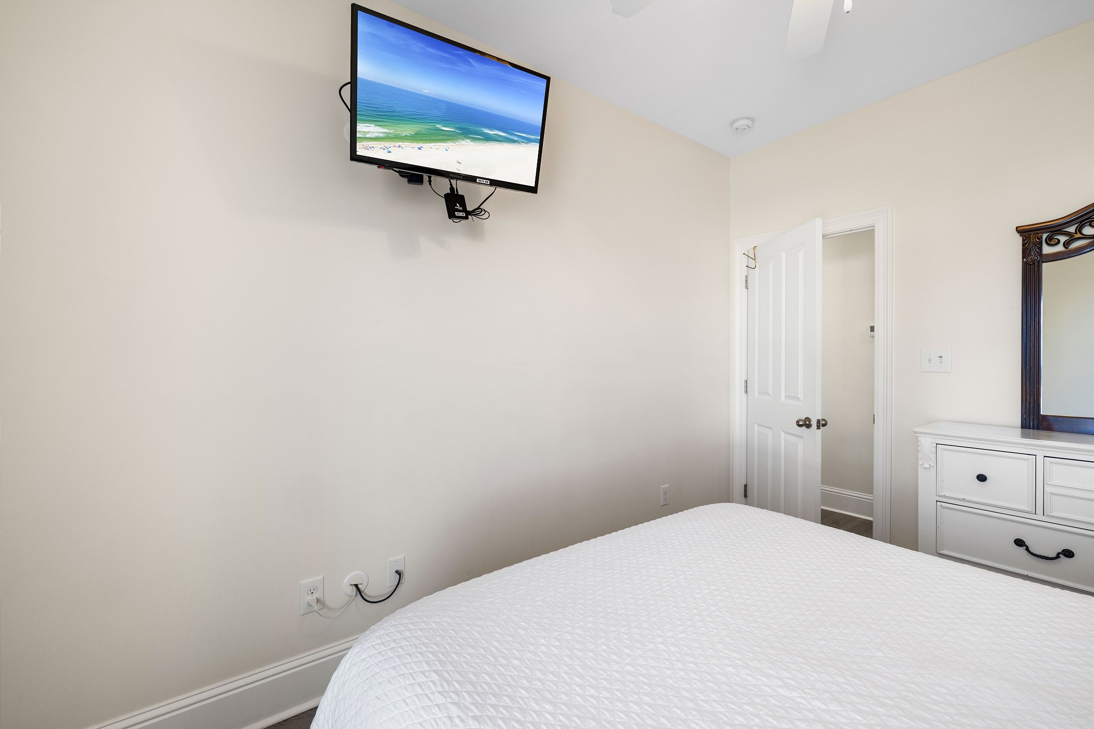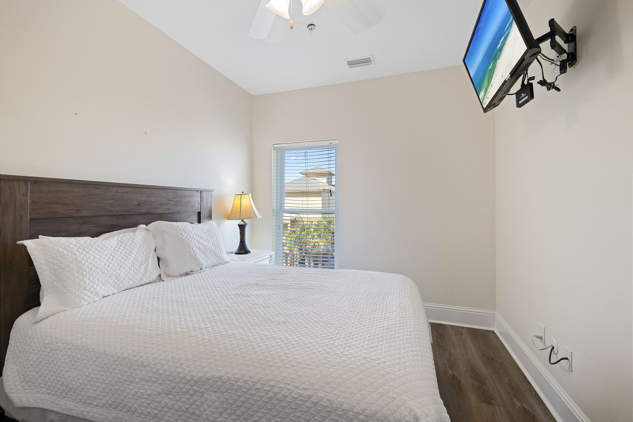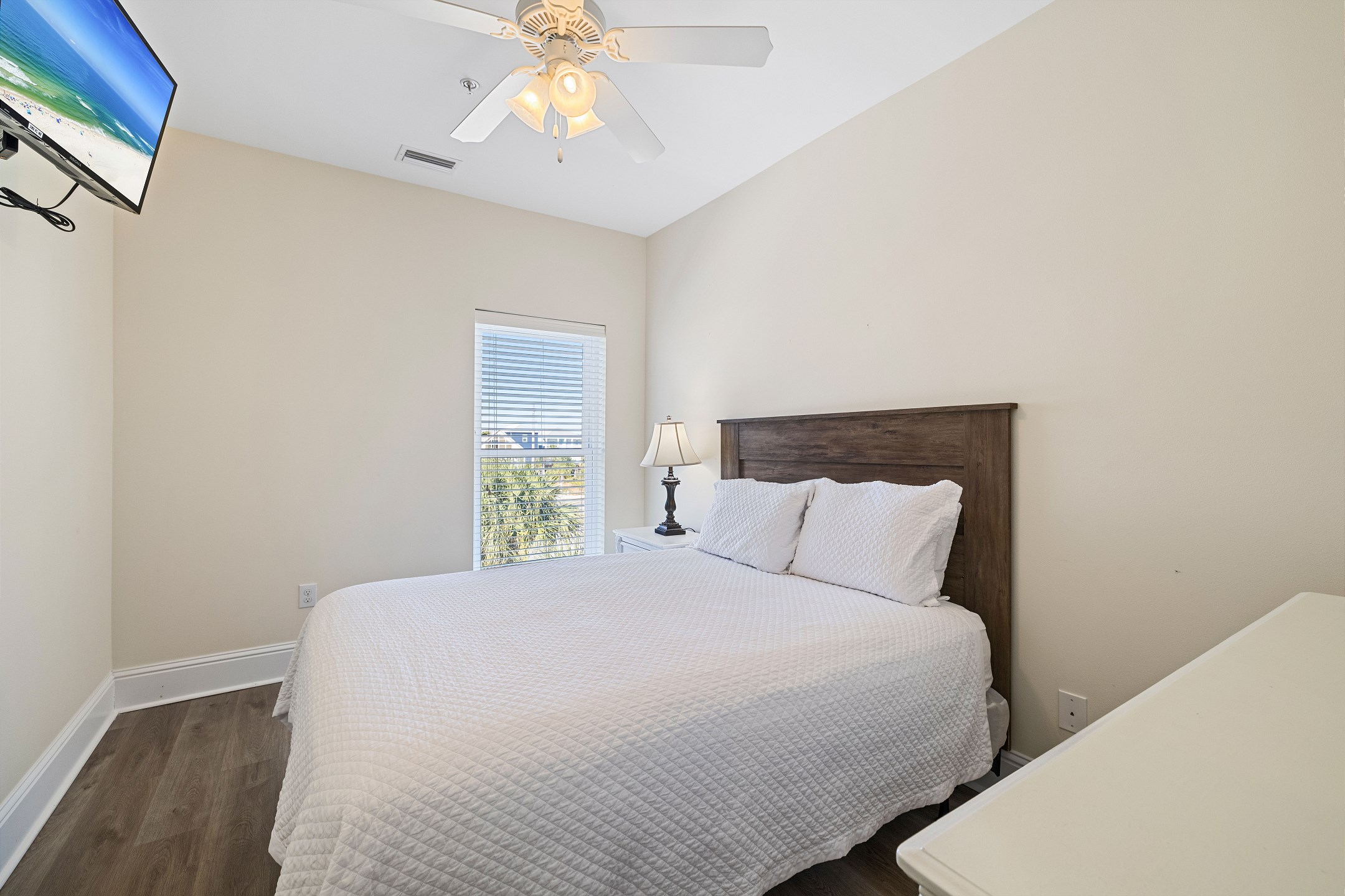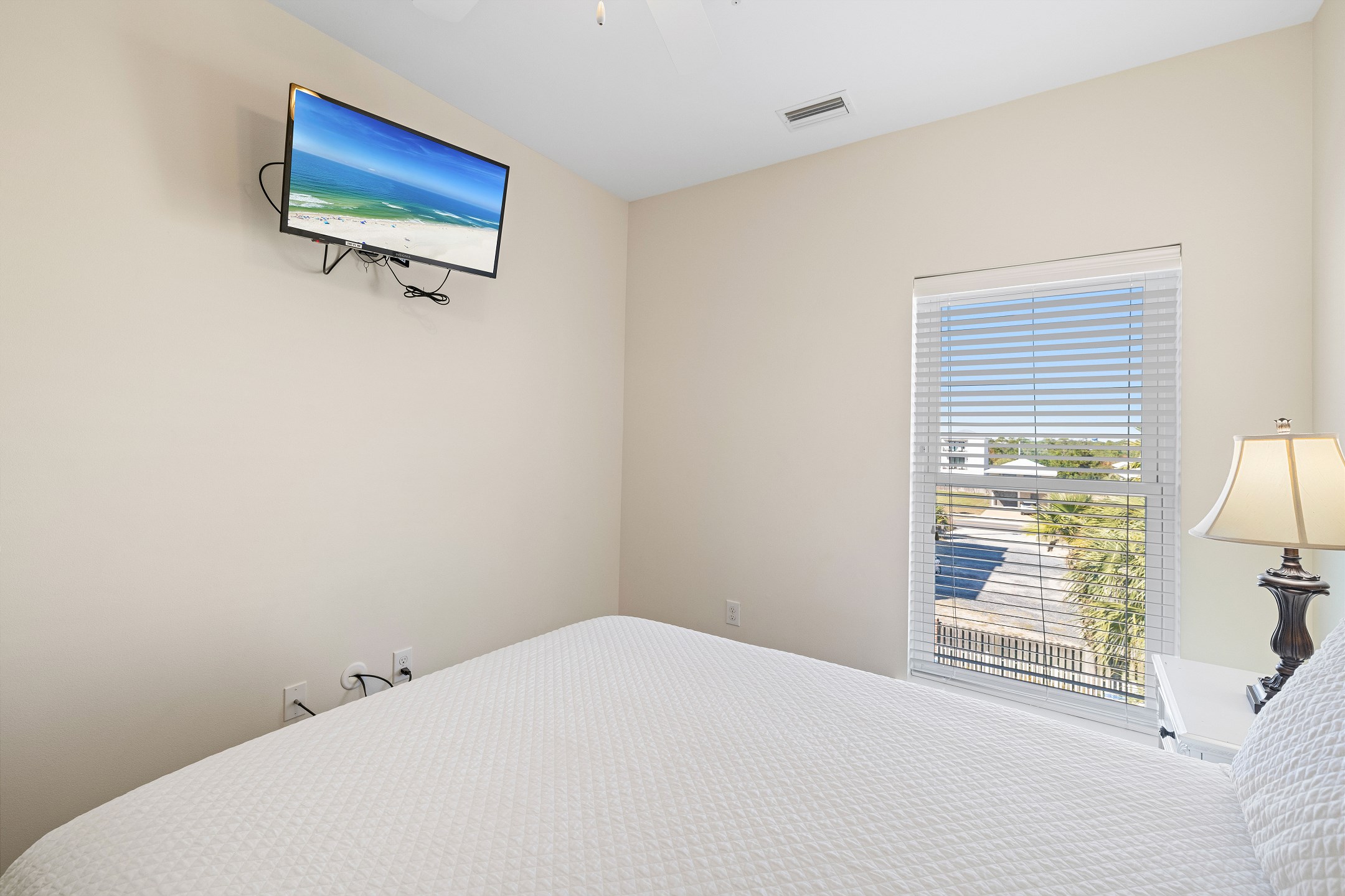 Upstairs, the first guest bedroom features a queen bed, a private bathroom with a tiled walk-in shower, and direct access to its own balcony. Two additional bedrooms, each with queen beds, share a hallway bathroom, making this floor ideal for extra family members or friends. A washer and dryer are included in the unit for added convenience during your stay.