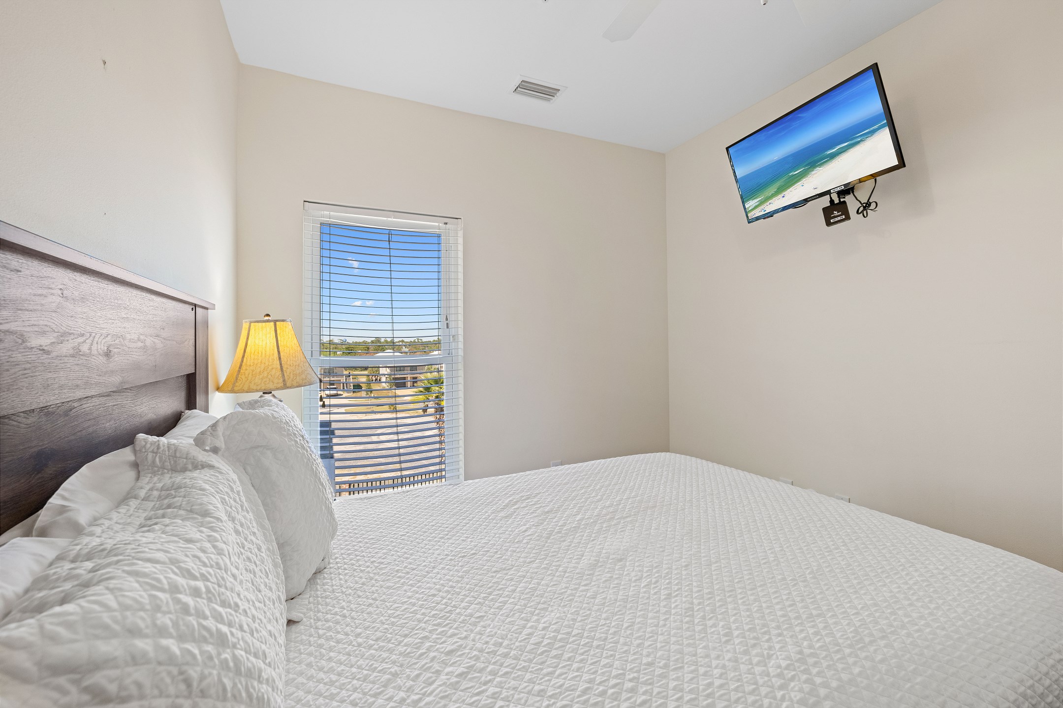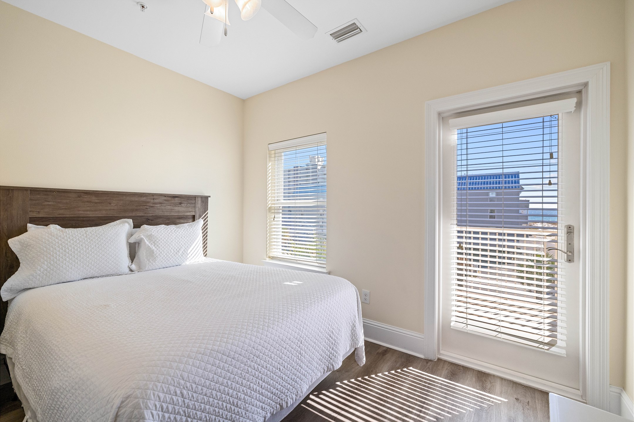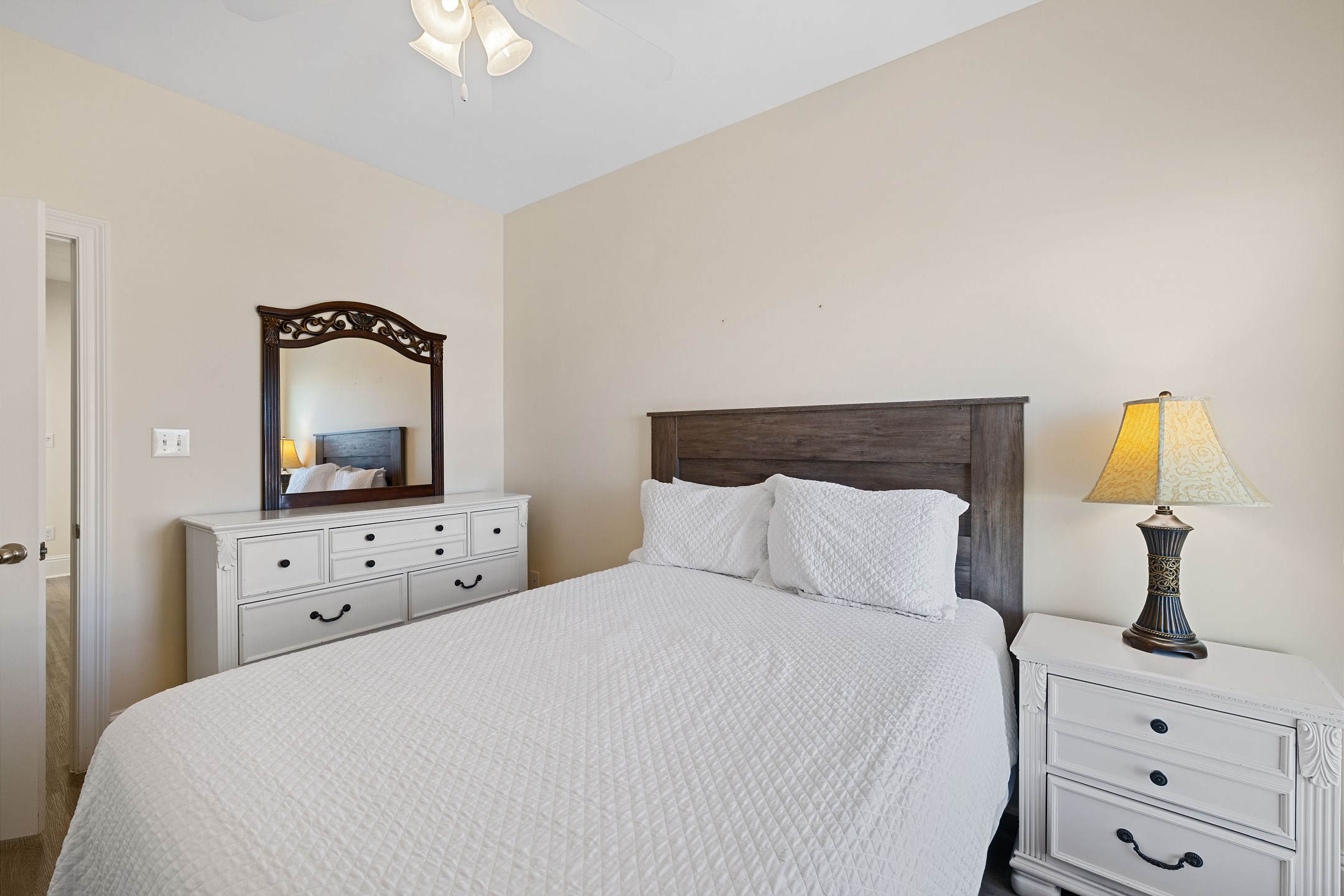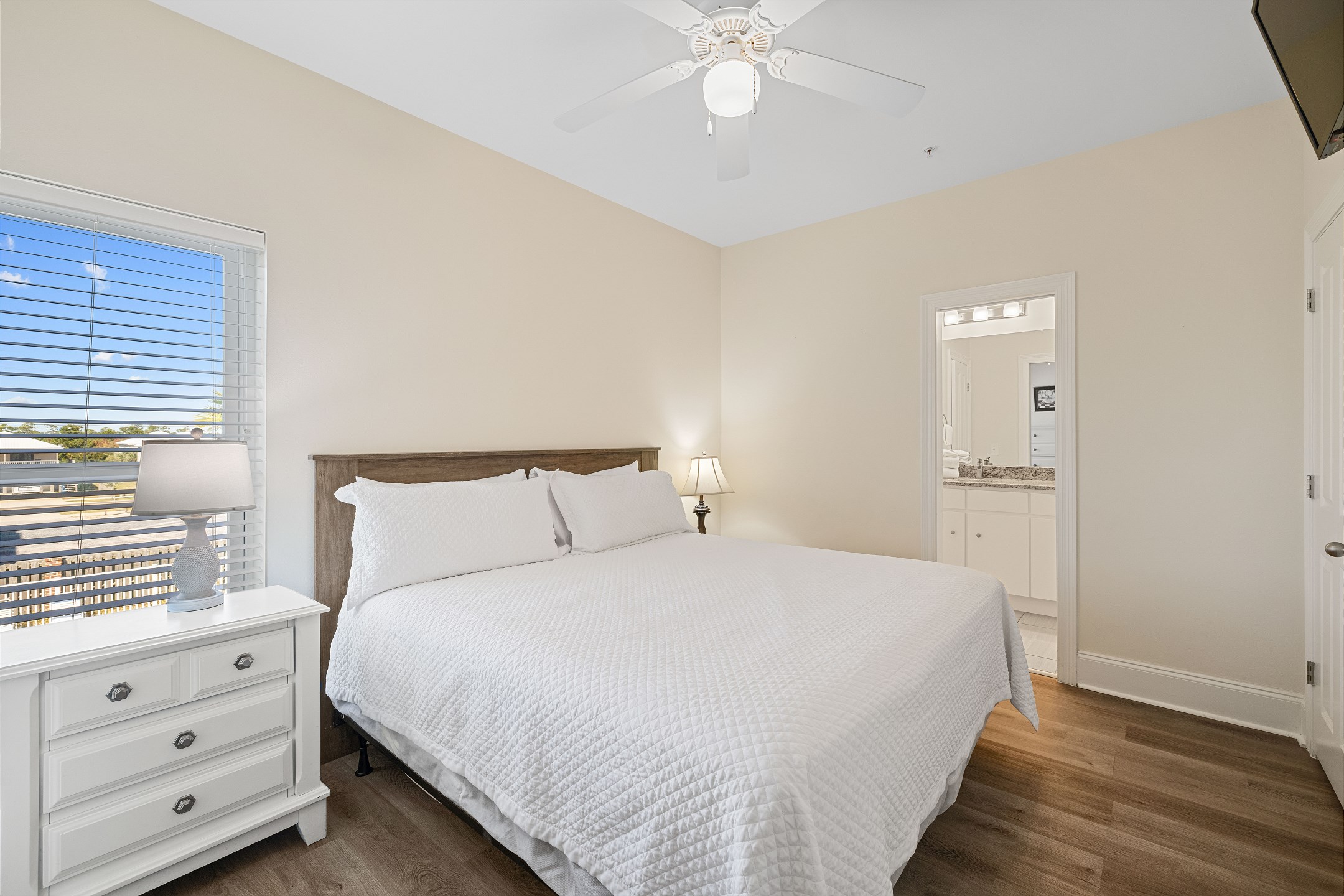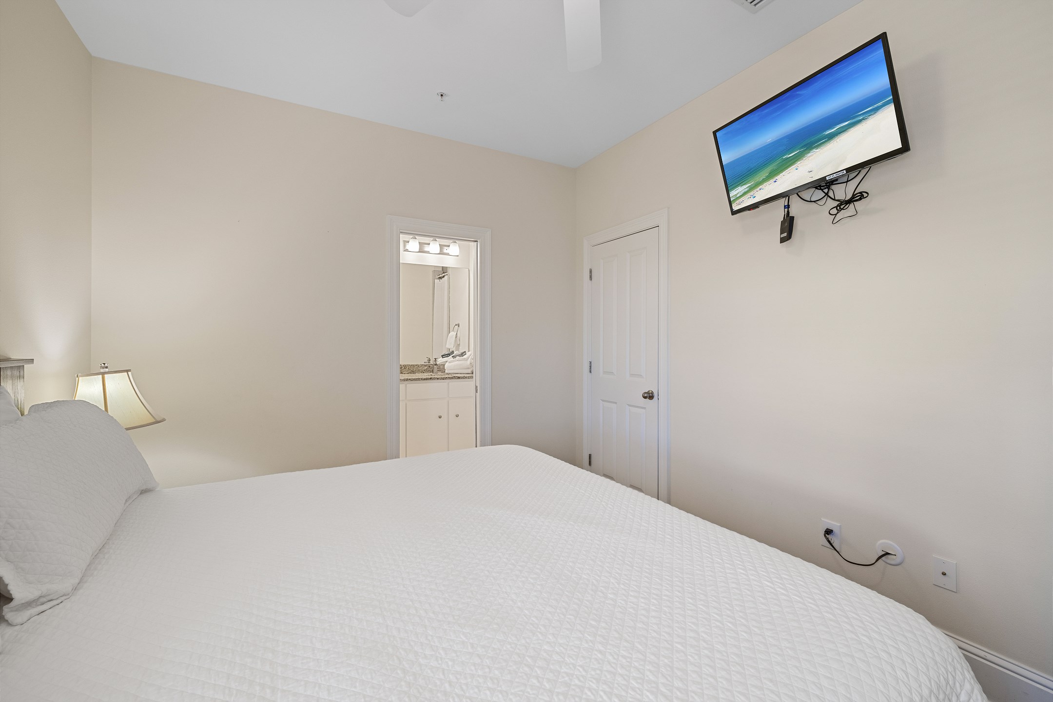 Upstairs, the first guest bedroom features a queen bed, a private bathroom with a tiled walk-in shower, and direct access to its own balcony. Two additional bedrooms, each with queen beds, share a hallway bathroom, making this floor ideal for extra family members or friends. A washer and dryer are included in the unit for added convenience during your stay.