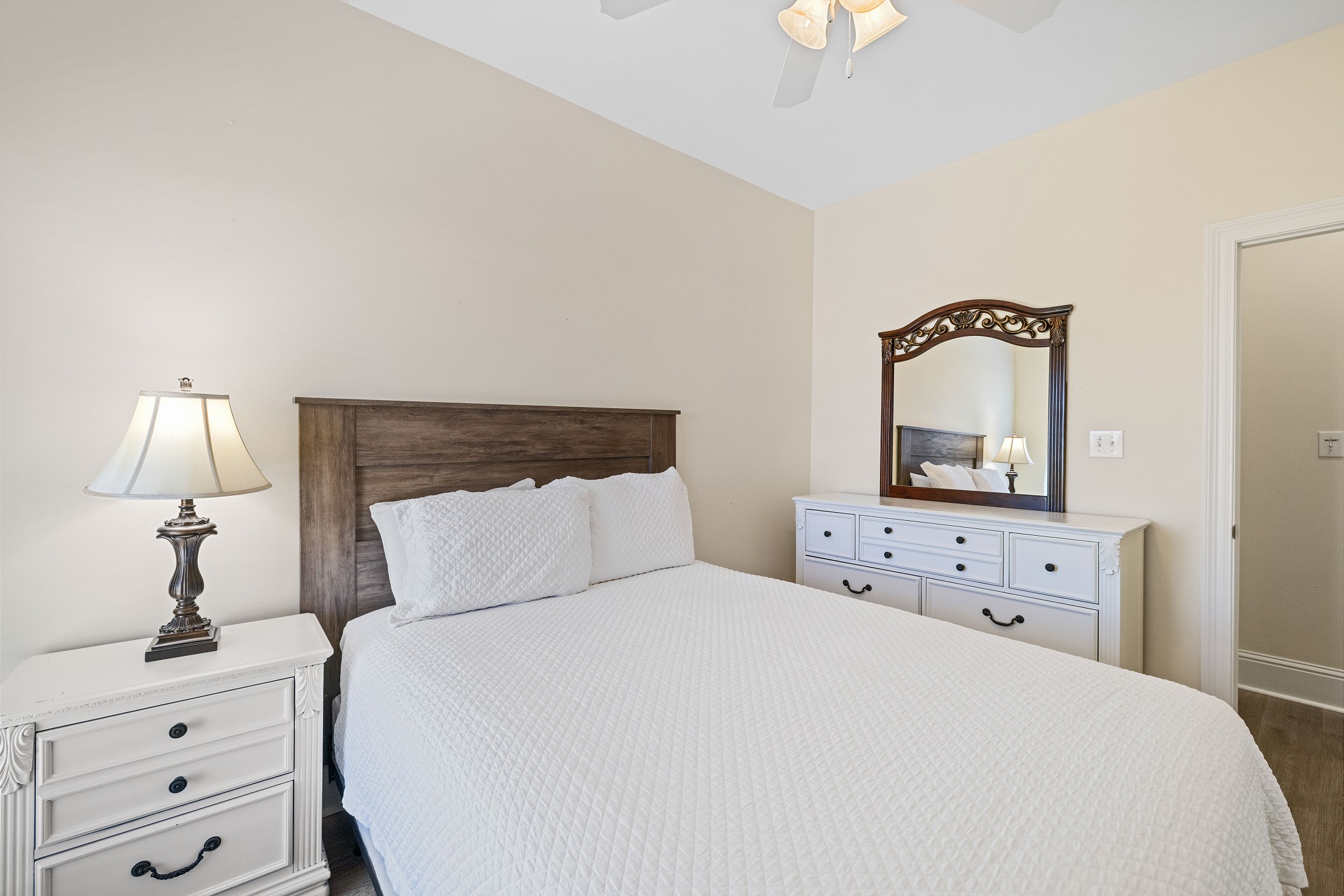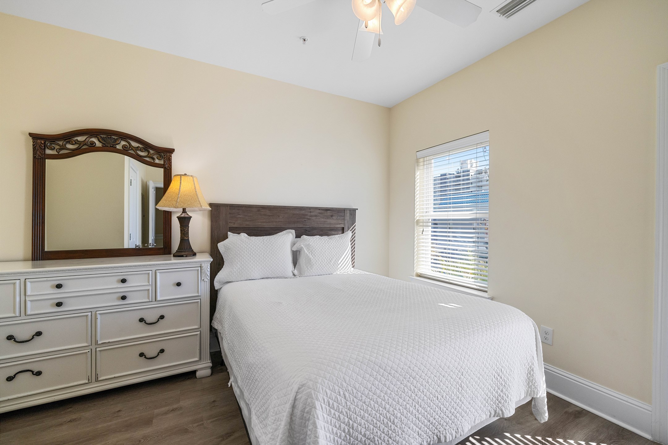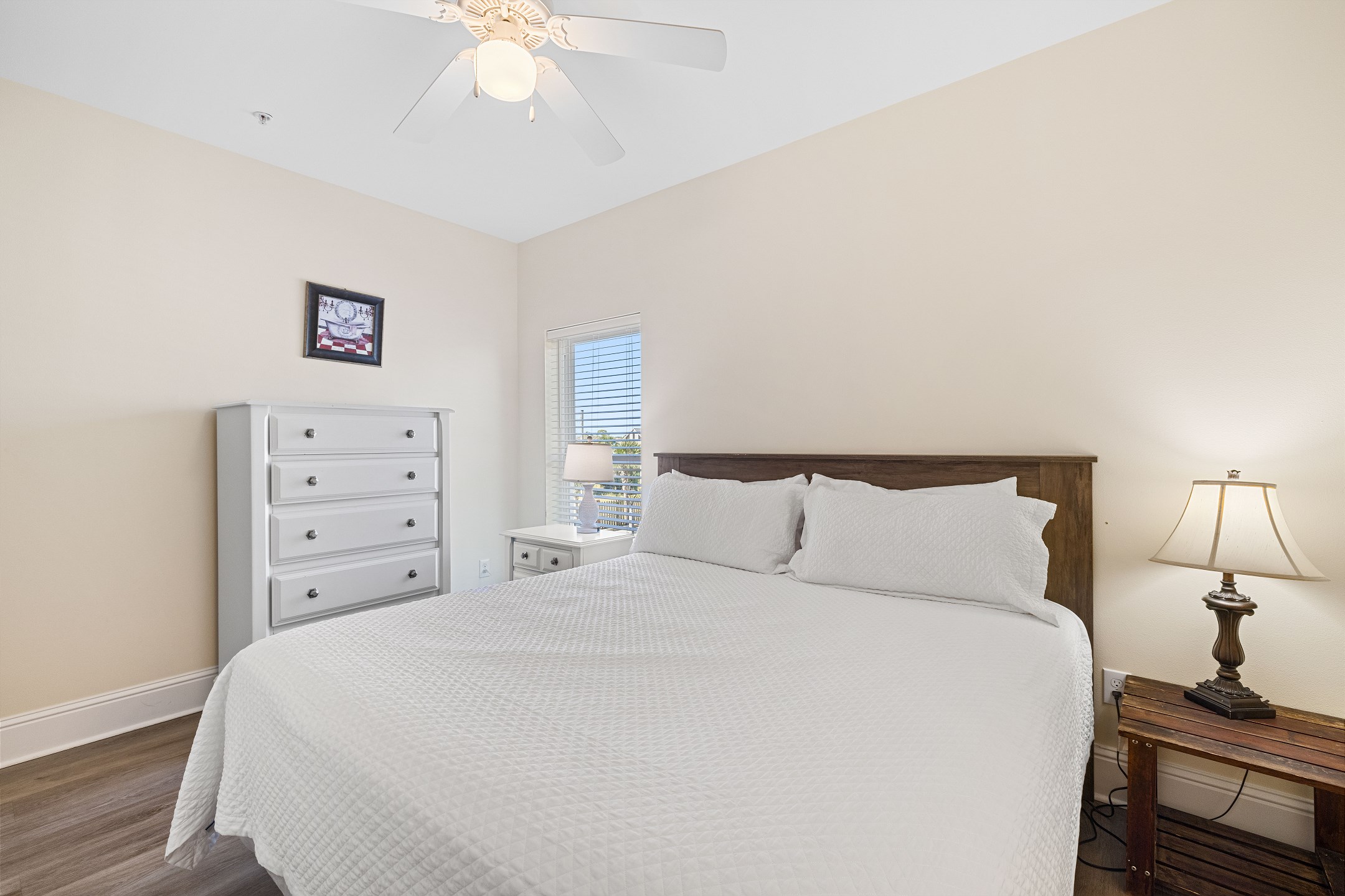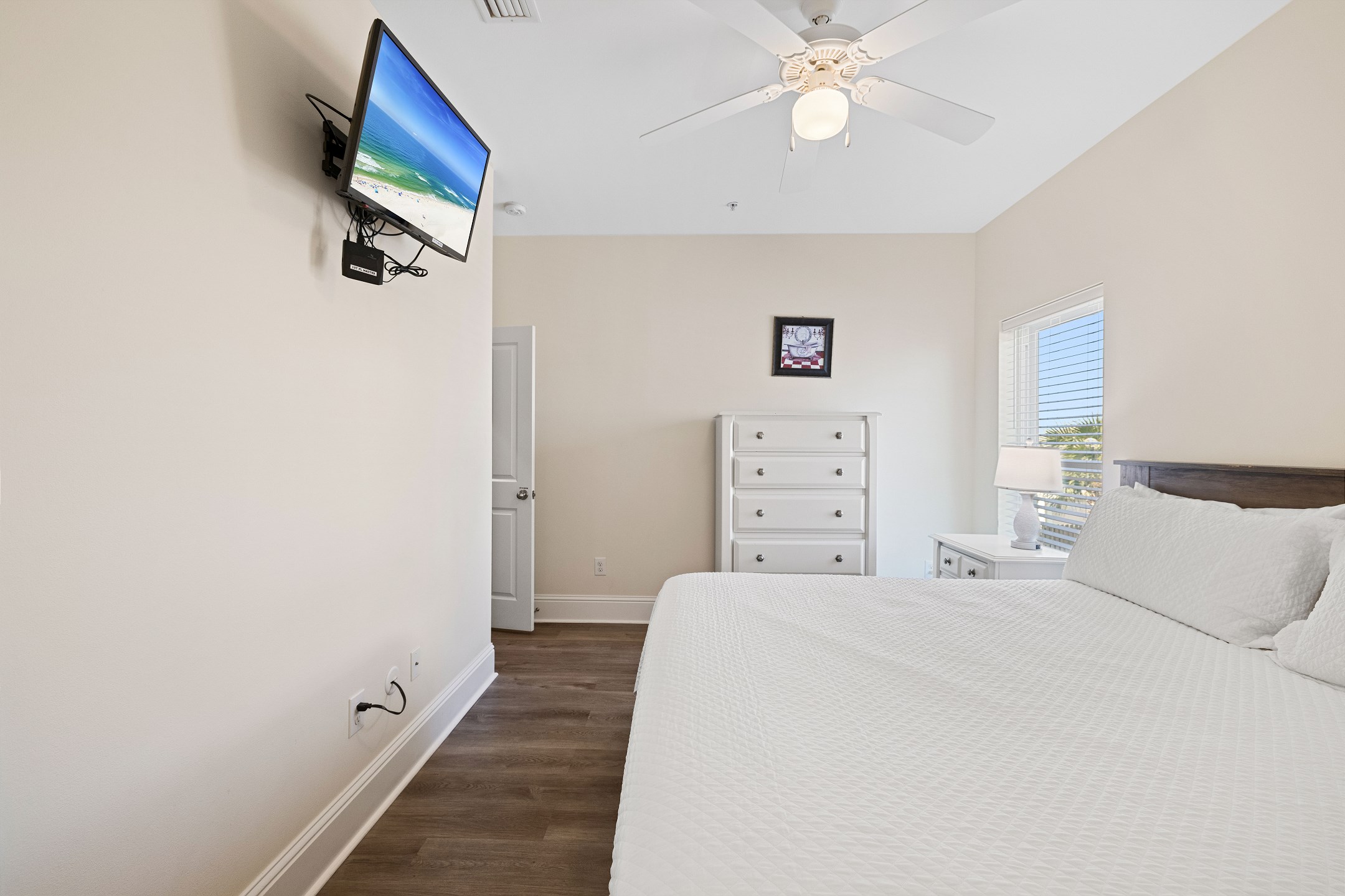 Upstairs, the first guest bedroom features a queen bed, a private bathroom with a tiled walk-in shower, and direct access to its own balcony. Two additional bedrooms, each with queen beds, share a hallway bathroom, making this floor ideal for extra family members or friends. A washer and dryer are included in the unit for added convenience during your stay.