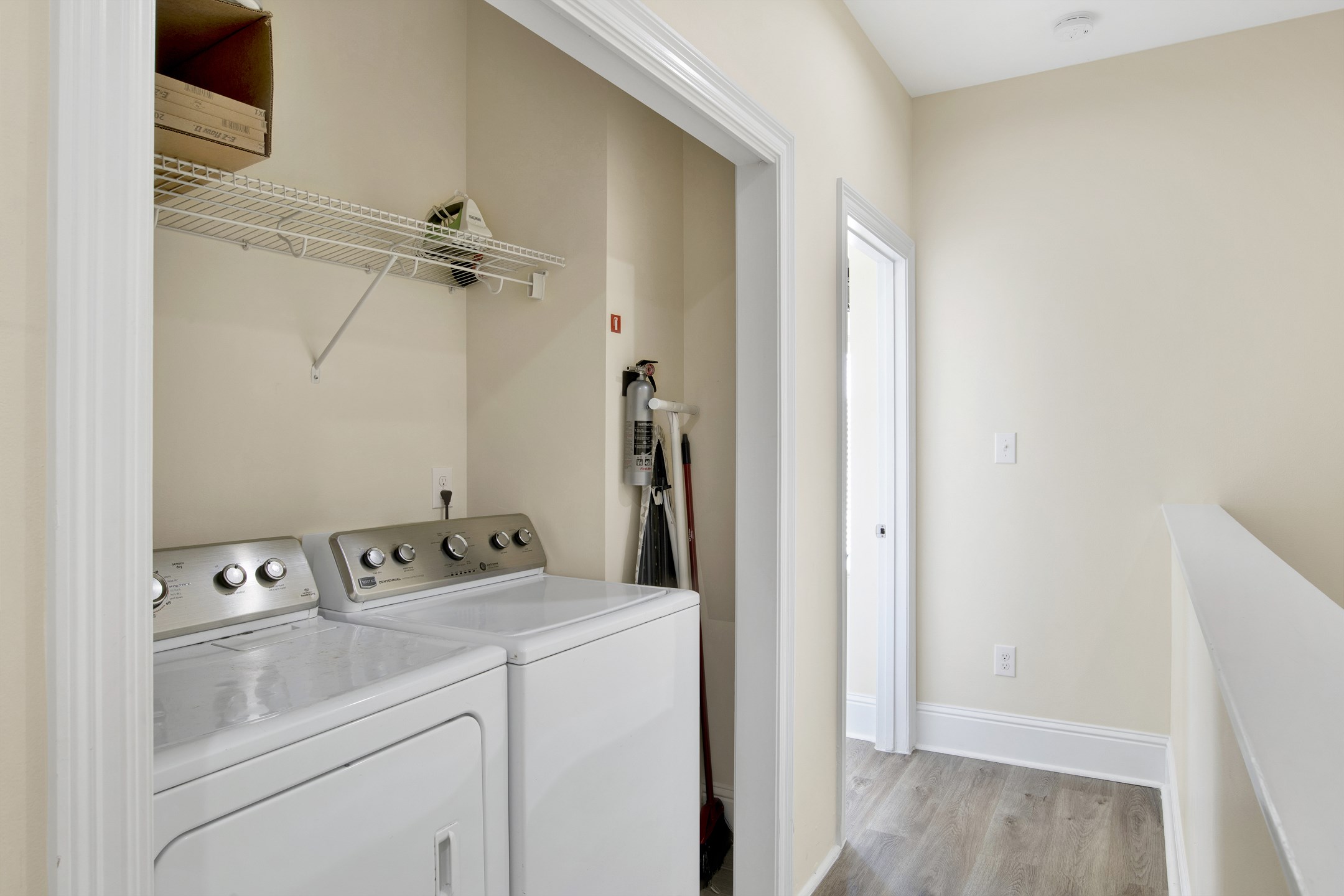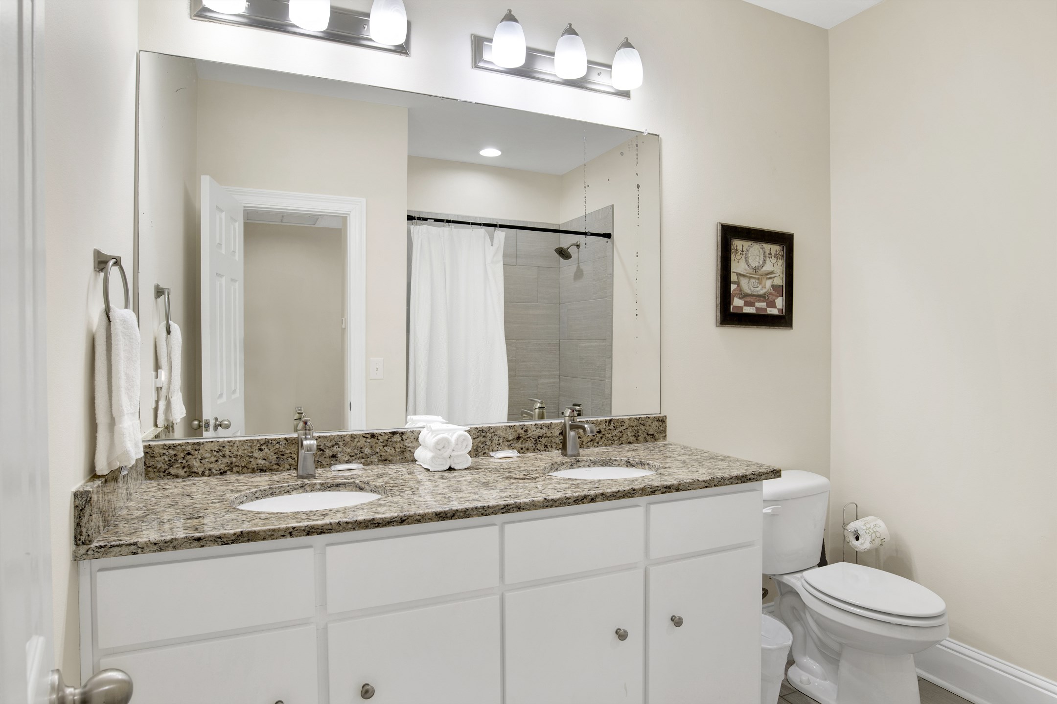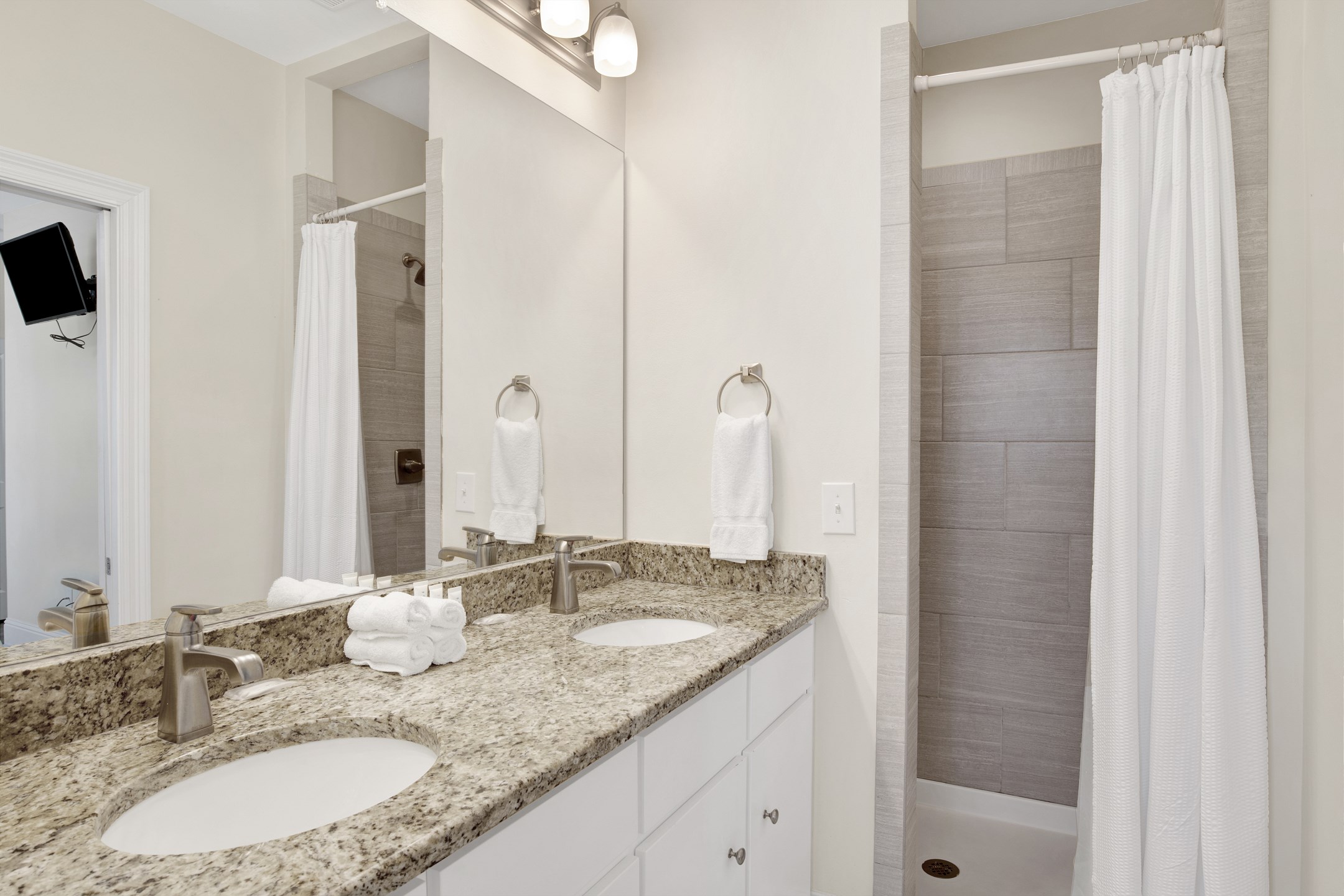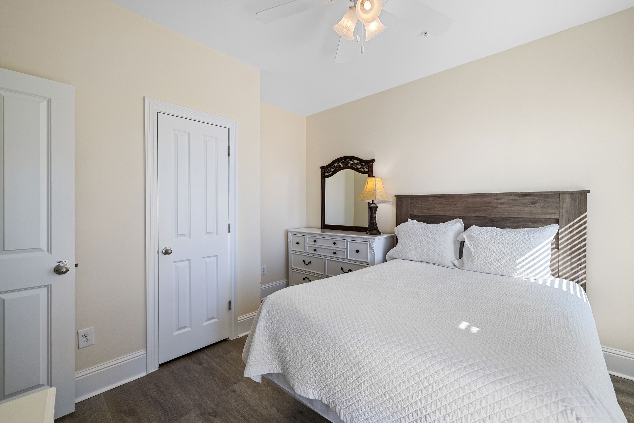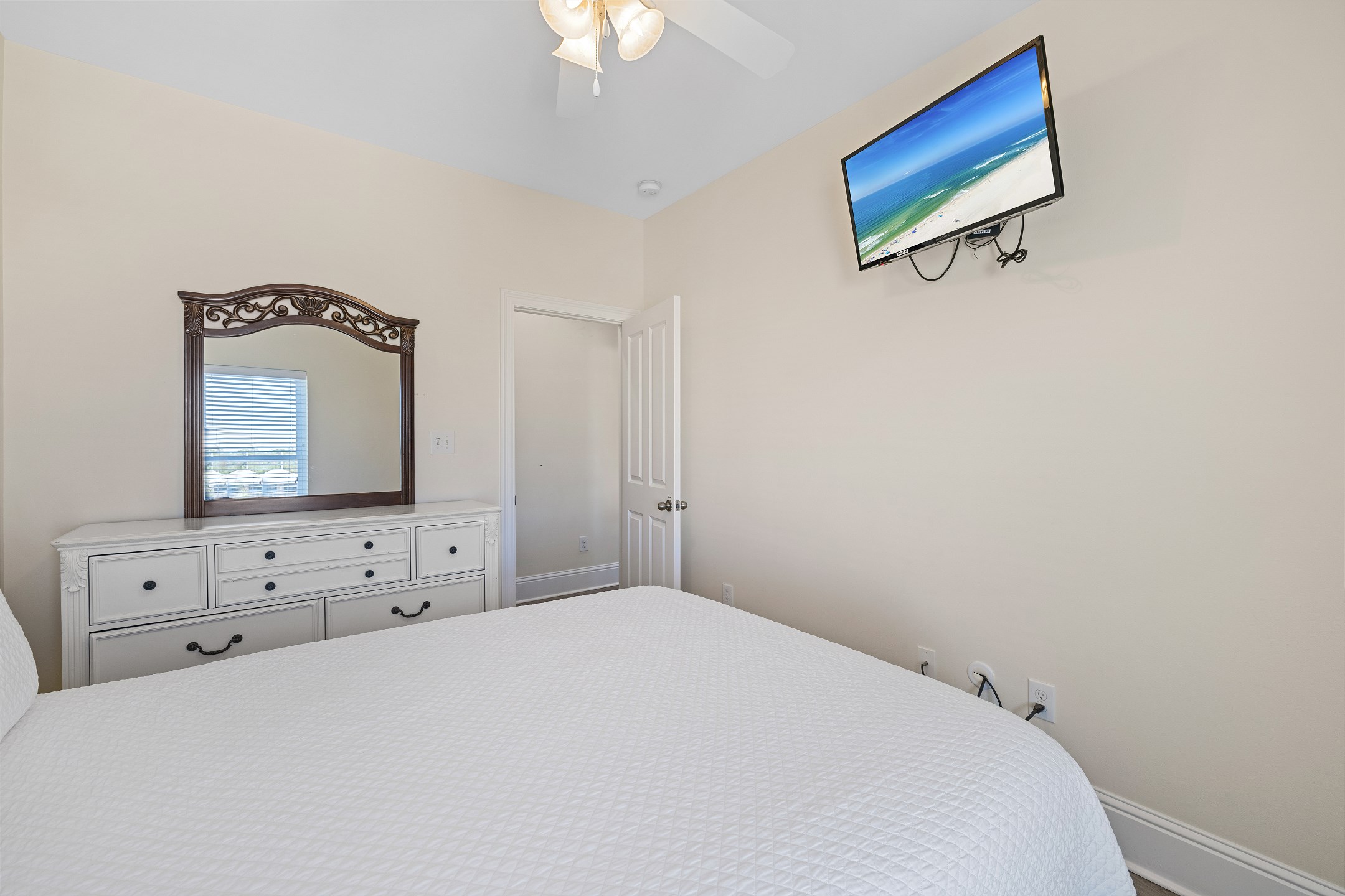 Upstairs, the first guest bedroom features a queen bed, a private bathroom with a tiled walk-in shower, and direct access to its own balcony. Two additional bedrooms, each with queen beds, share a hallway bathroom, making this floor ideal for extra family members or friends. A washer and dryer are included in the unit for added convenience during your stay.