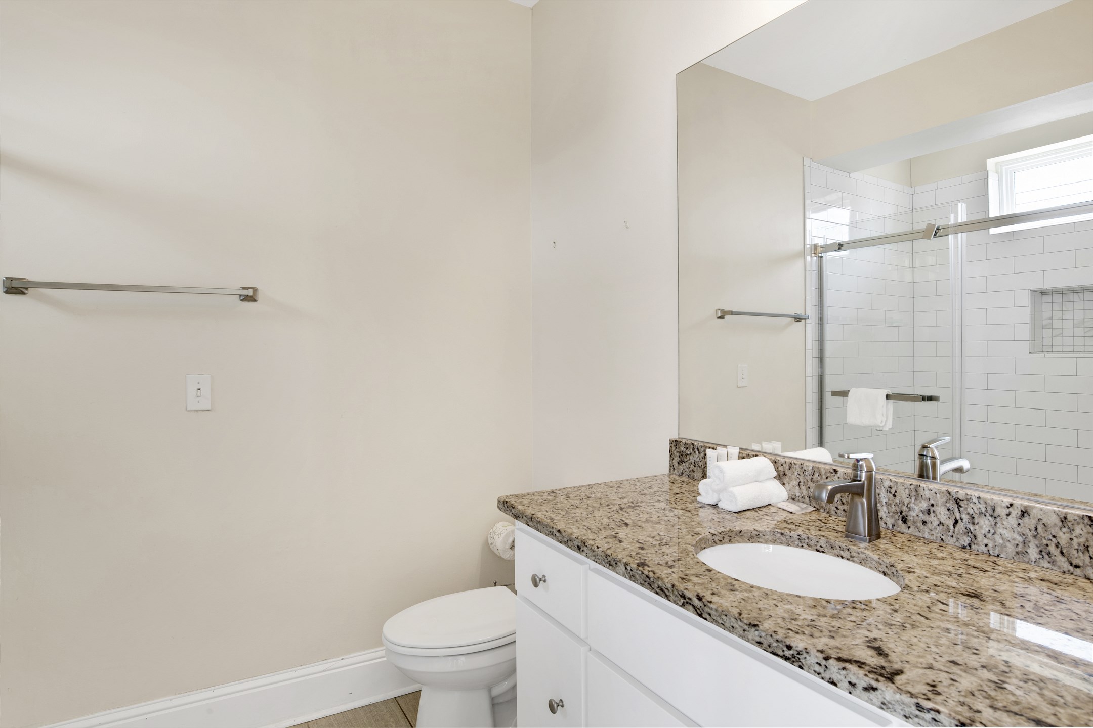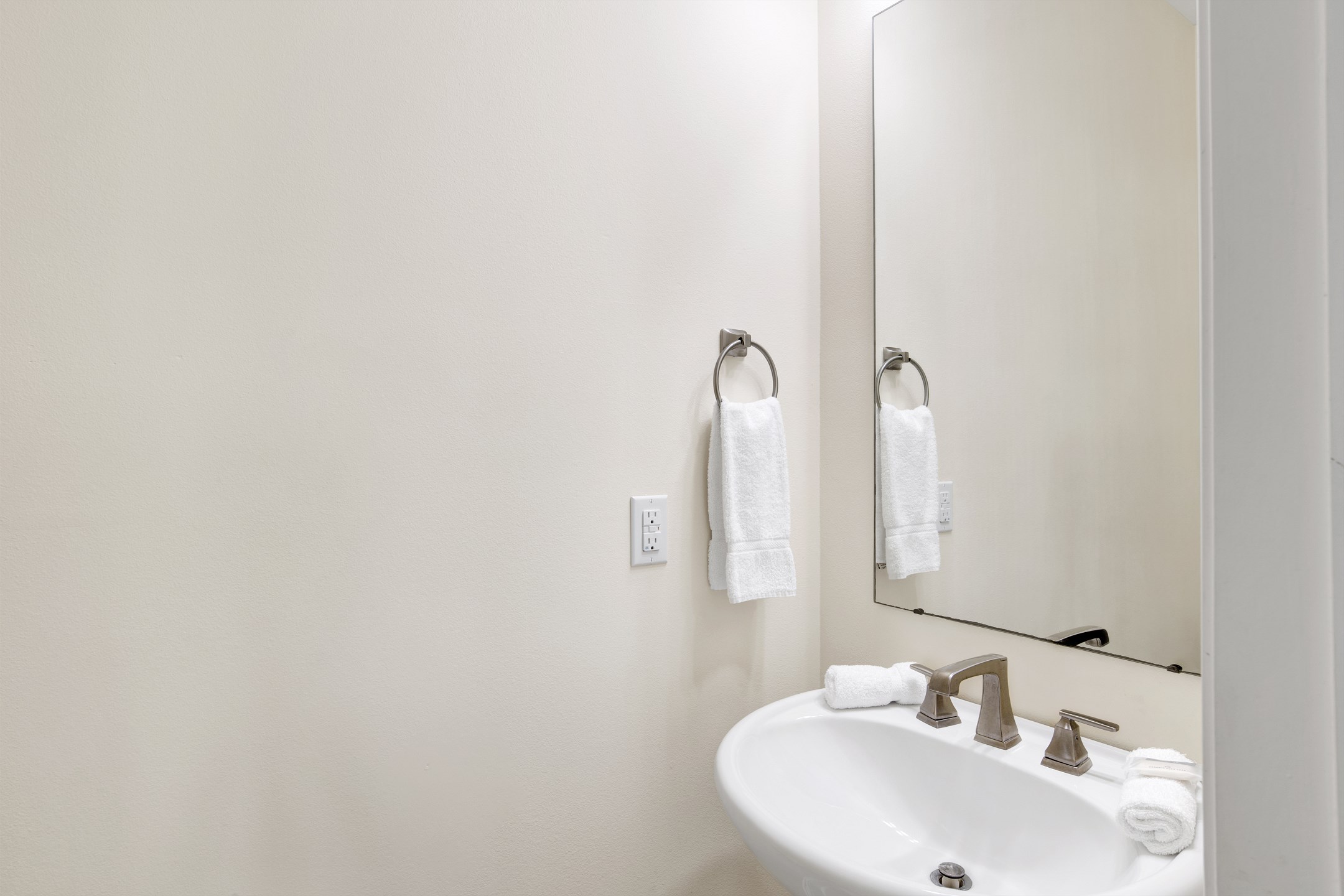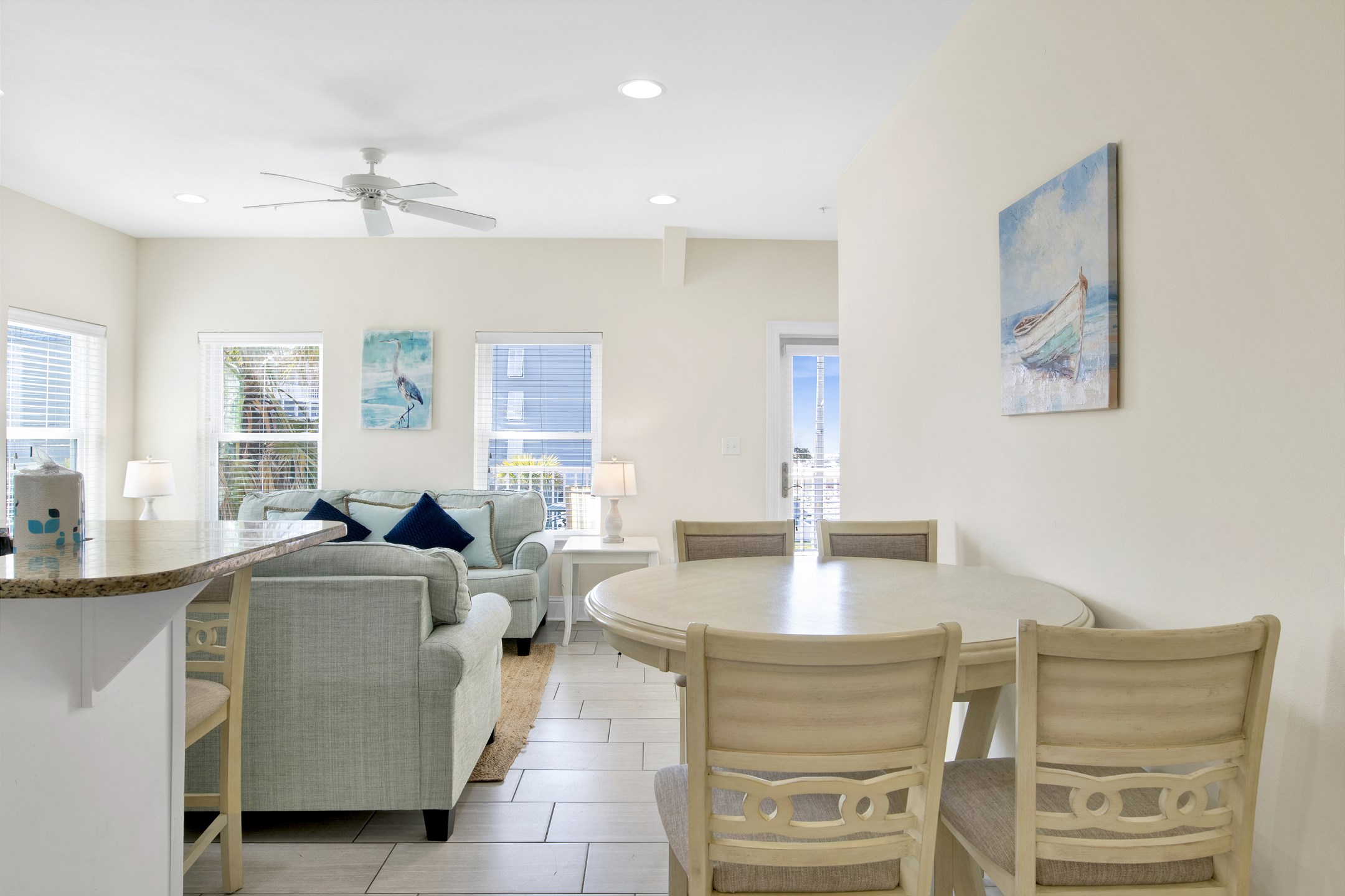The main floor includes a fully equipped kitchen with stainless steel appliances, granite countertops, and everything you need to prepare meals at home. The living room offers two comfortable sofas, a flat-screen TV, and access to a private balcony for enjoying the coastal breeze. Also on this level is the primary bedroom with a king bed and an ensuite bathroom with a walk-in shower, along with a convenient half bathroom.