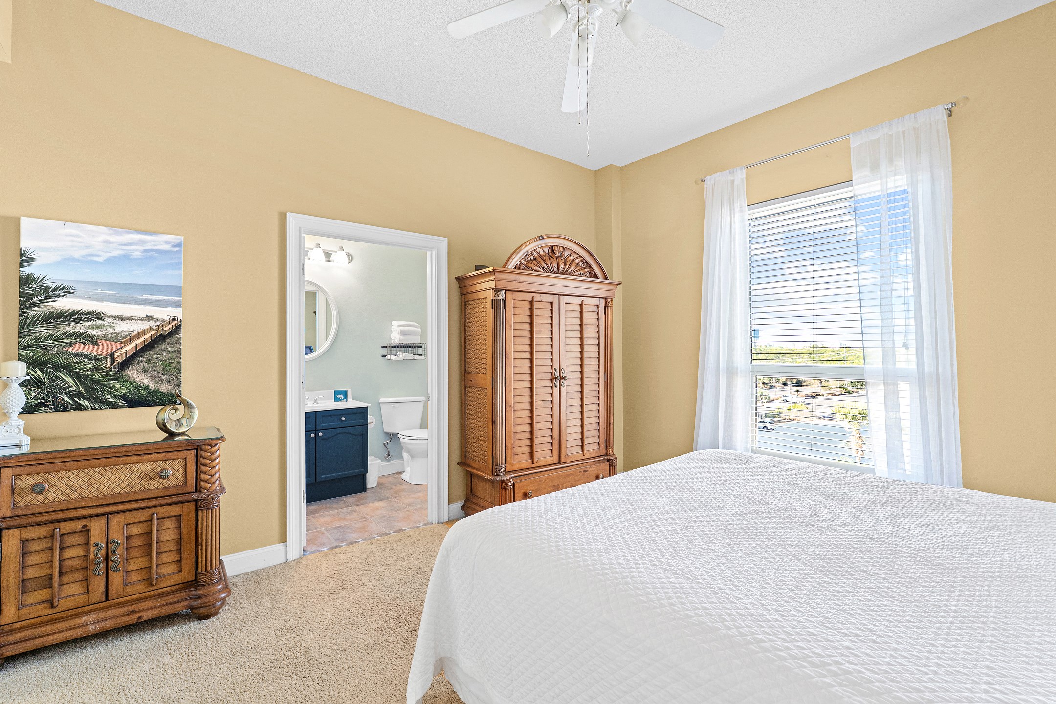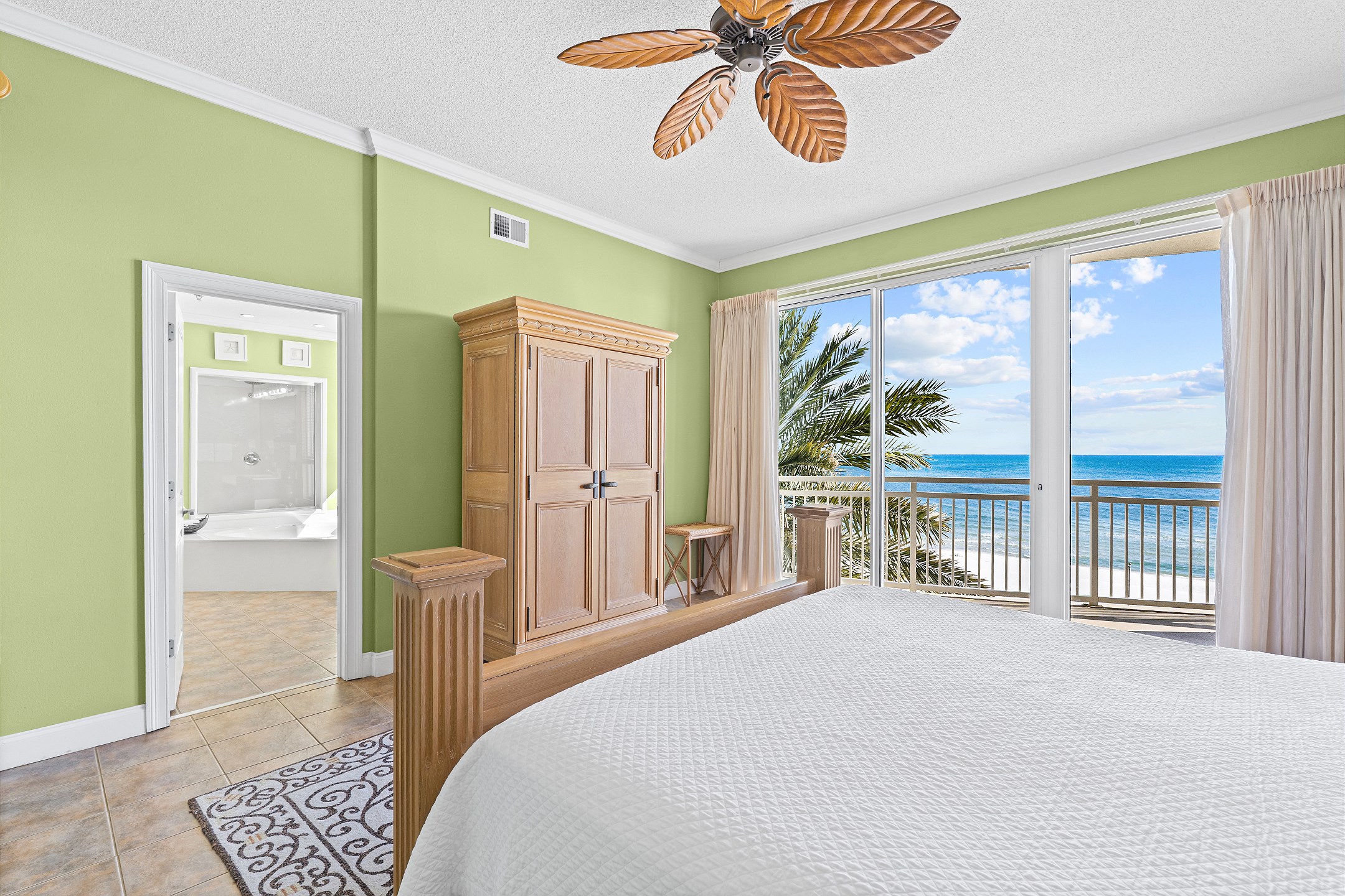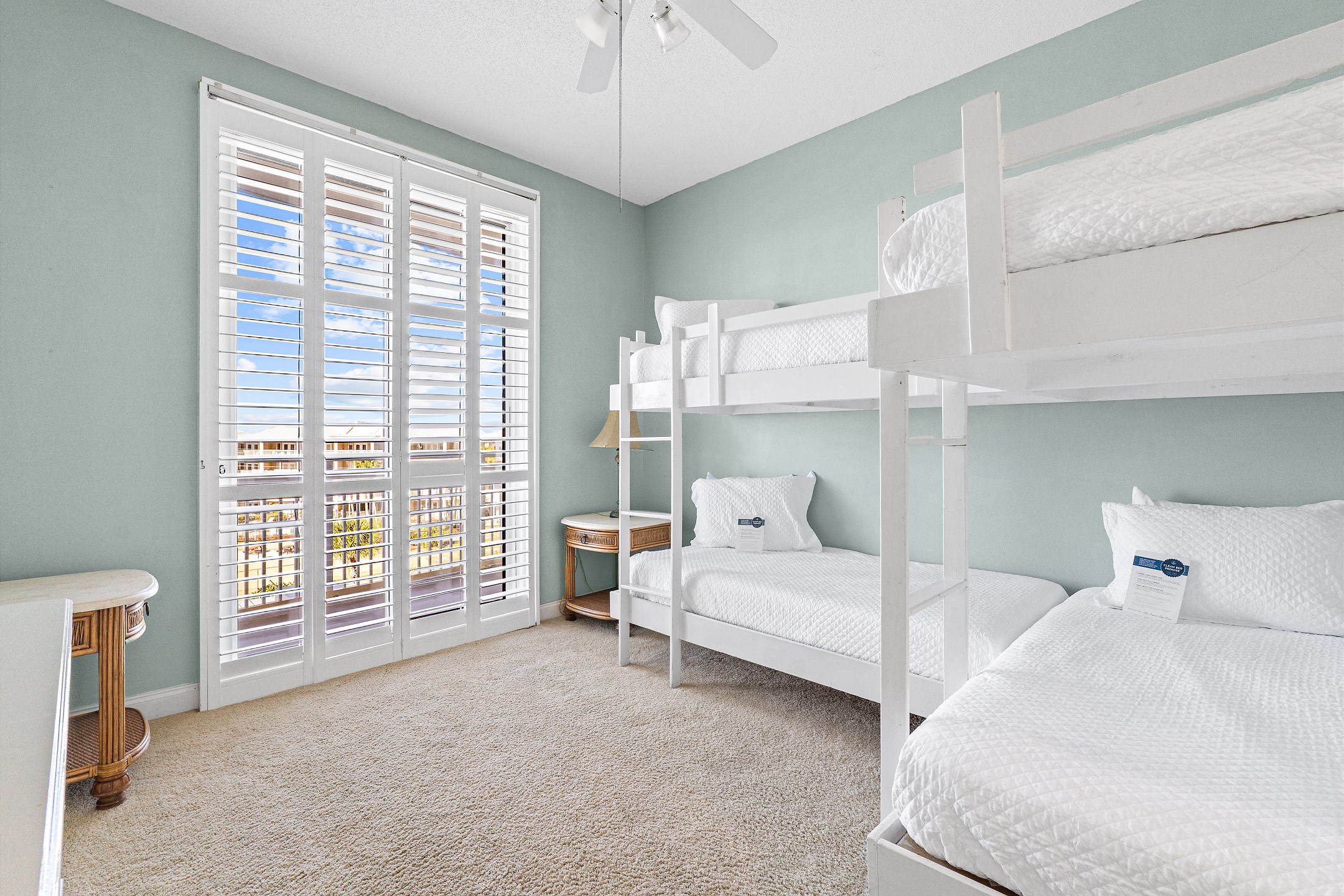 The primary suite is a true retreat with a king bed, floor-to-ceiling windows, direct balcony access, and an ensuite bathroom featuring a jetted tub, a walk-in shower, and generous counter space. Two additional guest bedrooms each include a king bed and their own private ensuite bathroom. The fourth bedroom is designed with families in mind, offering two twin-over-twin bunk beds to sleep four comfortably, along with its own ensuite bathroom.