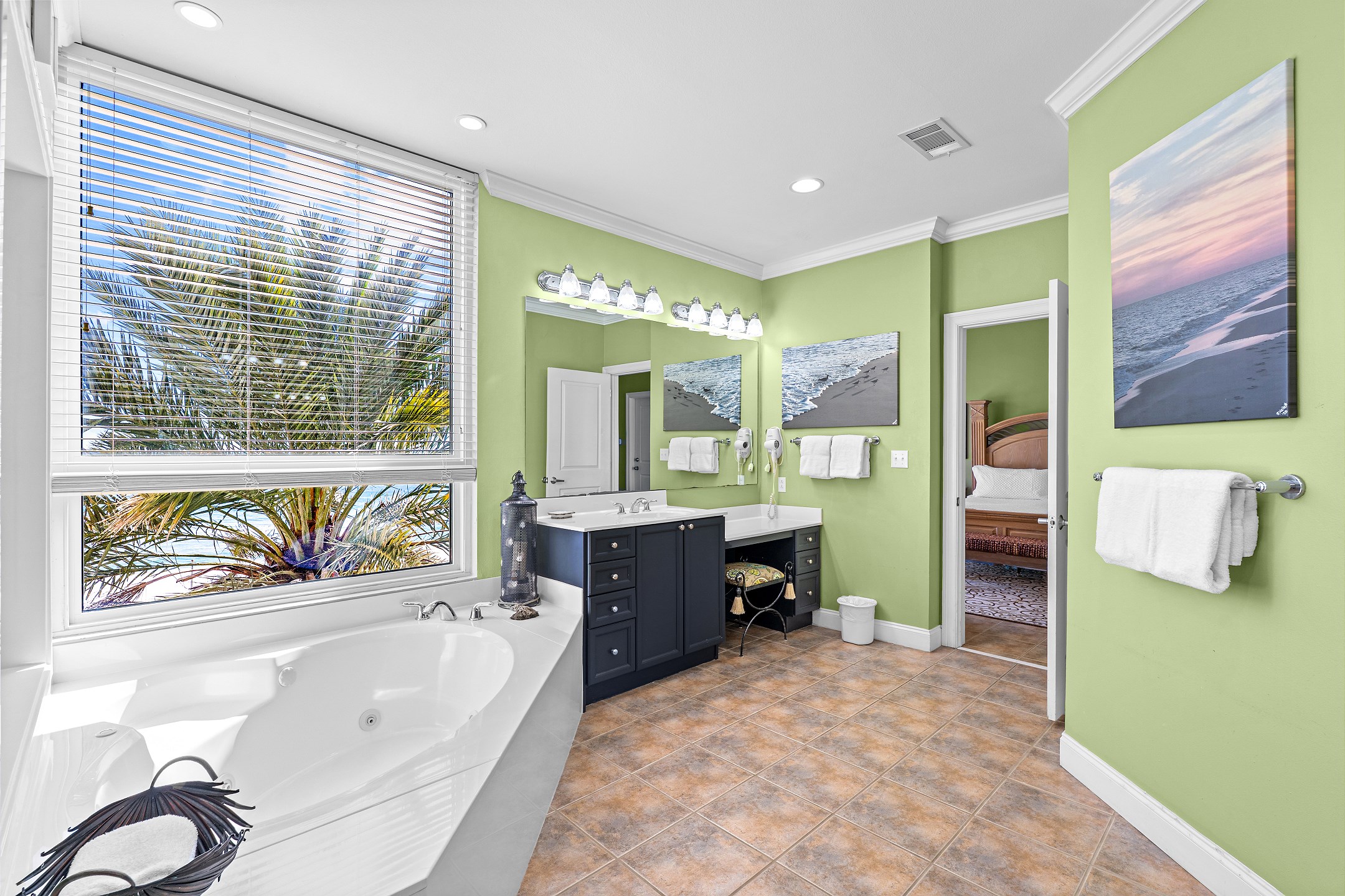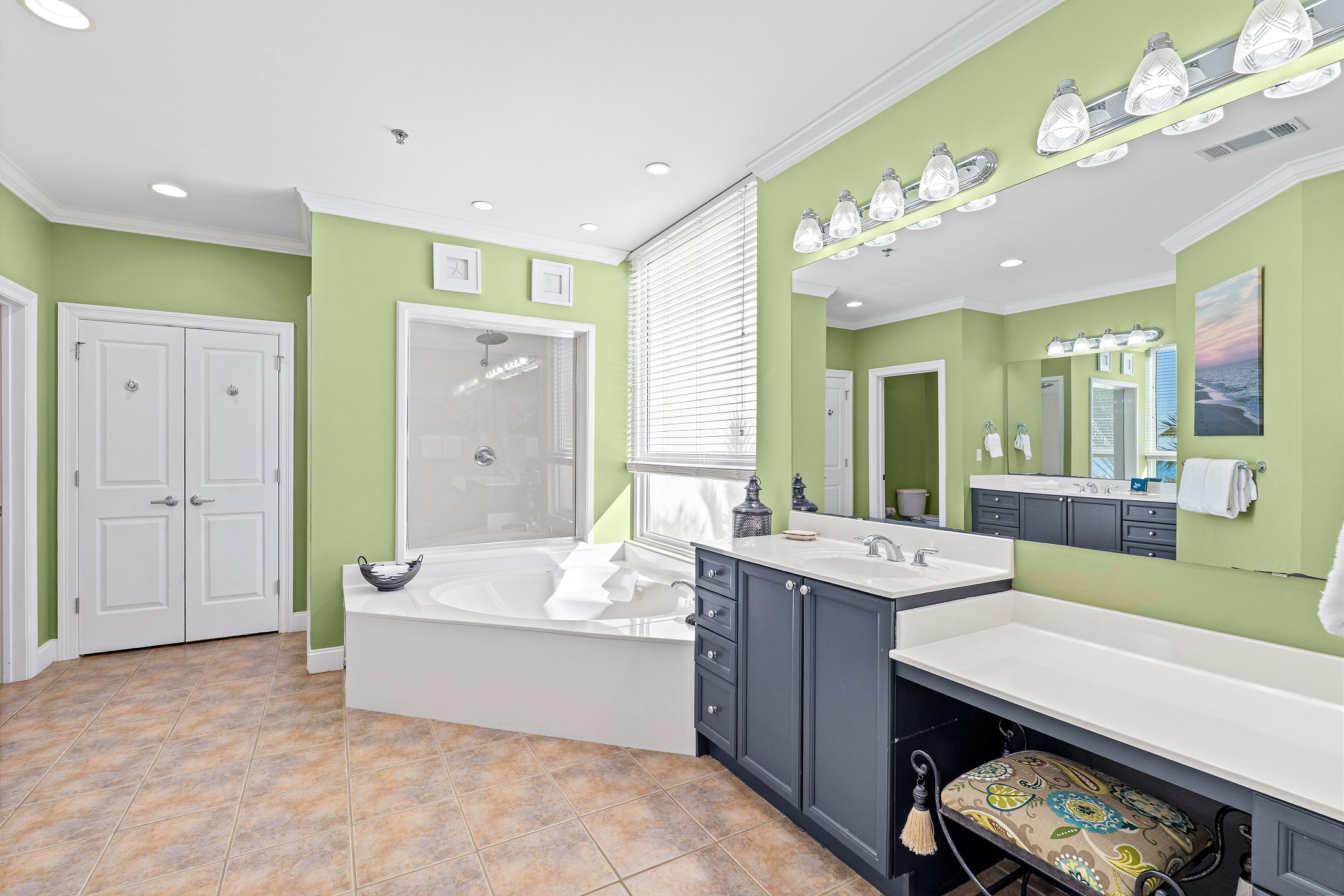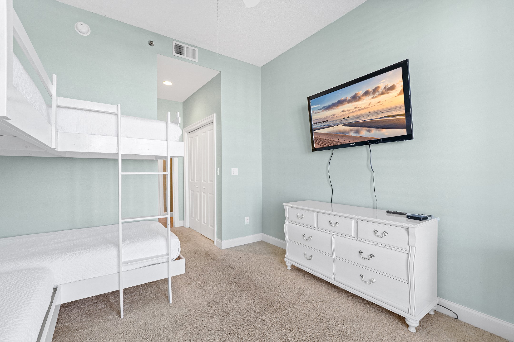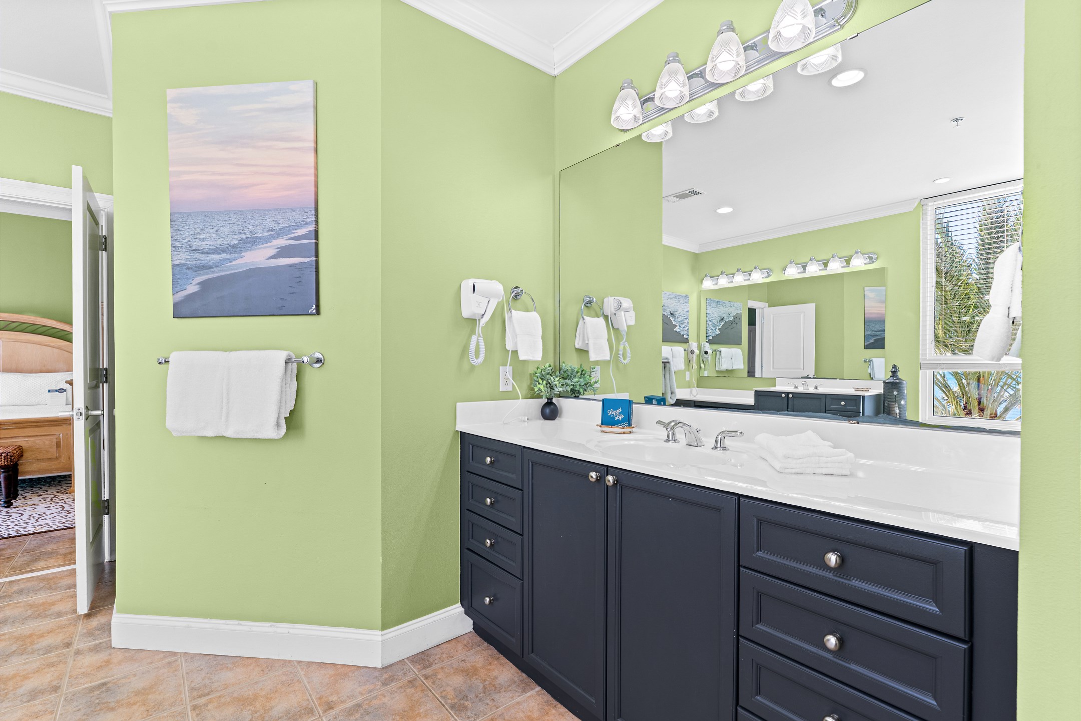 The primary suite is a true retreat with a king bed, floor-to-ceiling windows, direct balcony access, and an ensuite bathroom featuring a jetted tub, a walk-in shower, and generous counter space. Two additional guest bedrooms each include a king bed and their own private ensuite bathroom. The fourth bedroom is designed with families in mind, offering two twin-over-twin bunk beds to sleep four comfortably, along with its own ensuite bathroom.