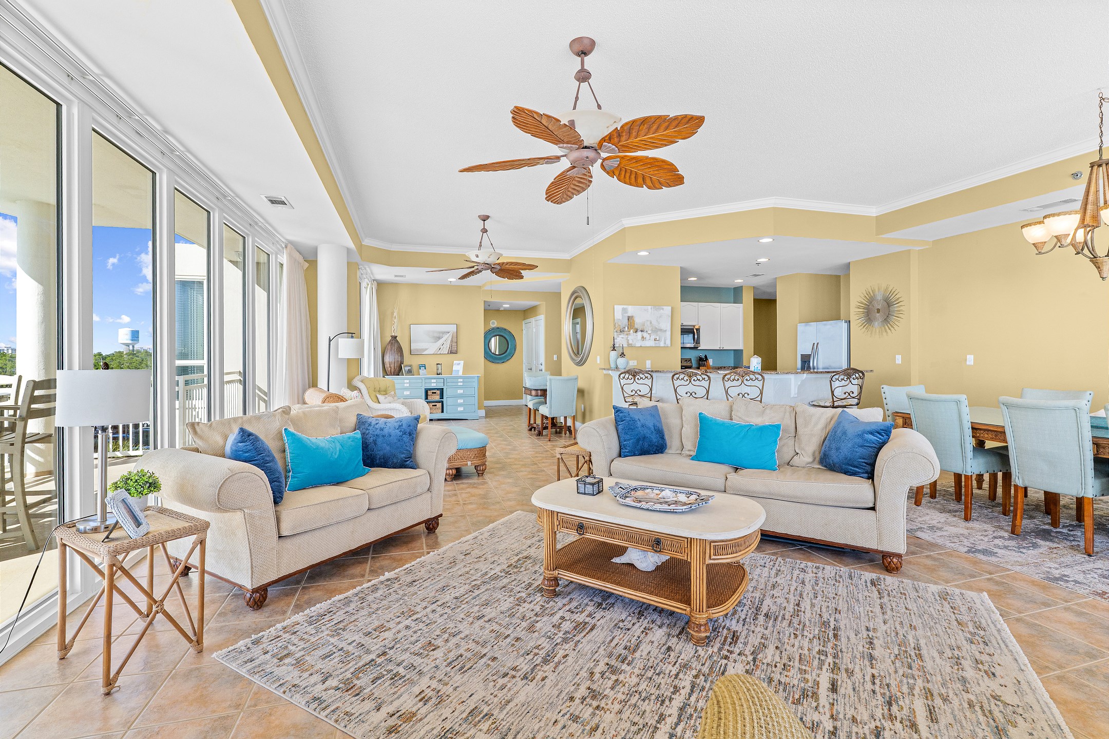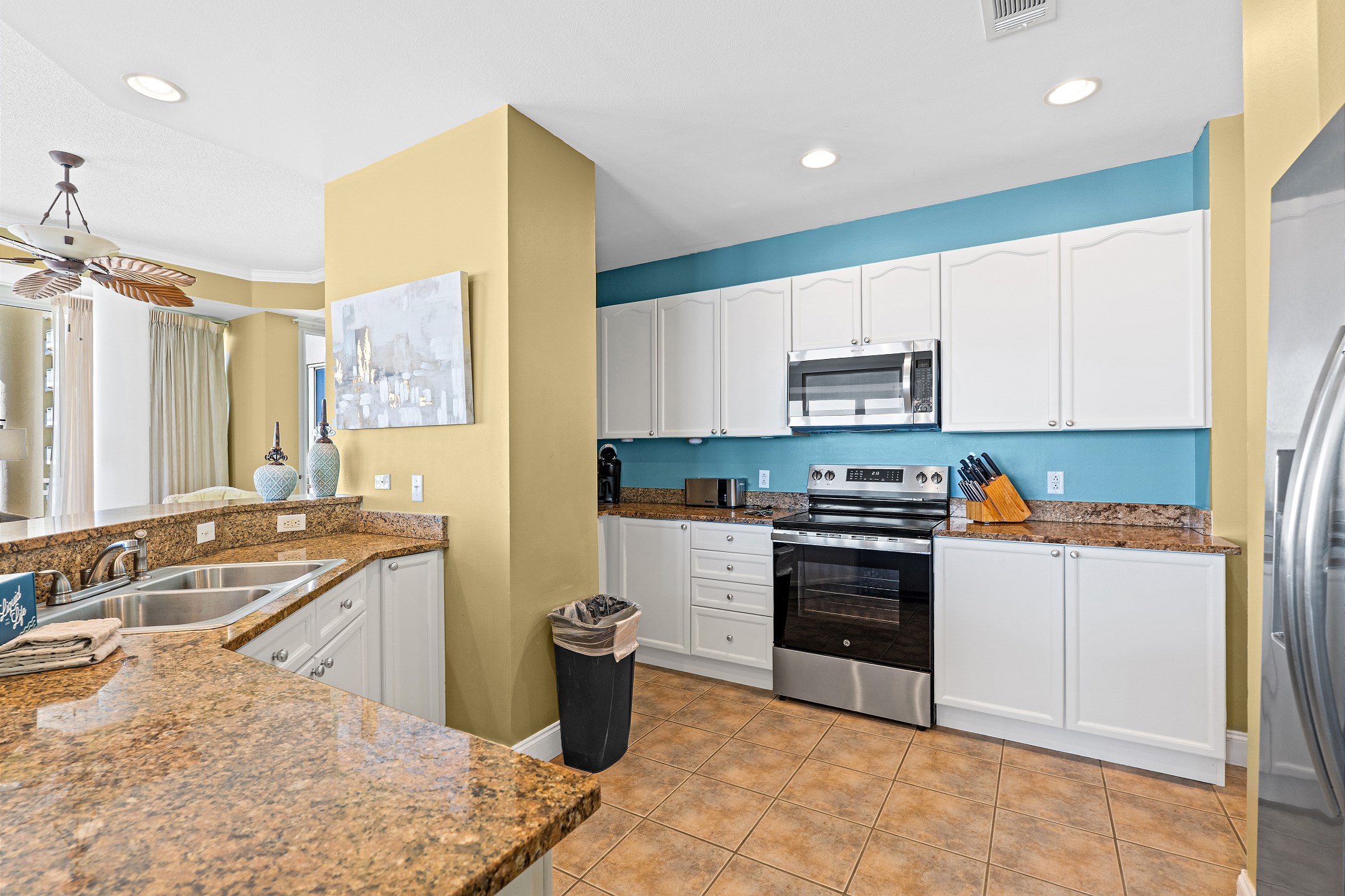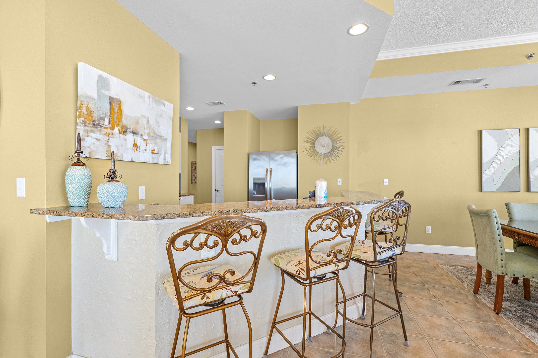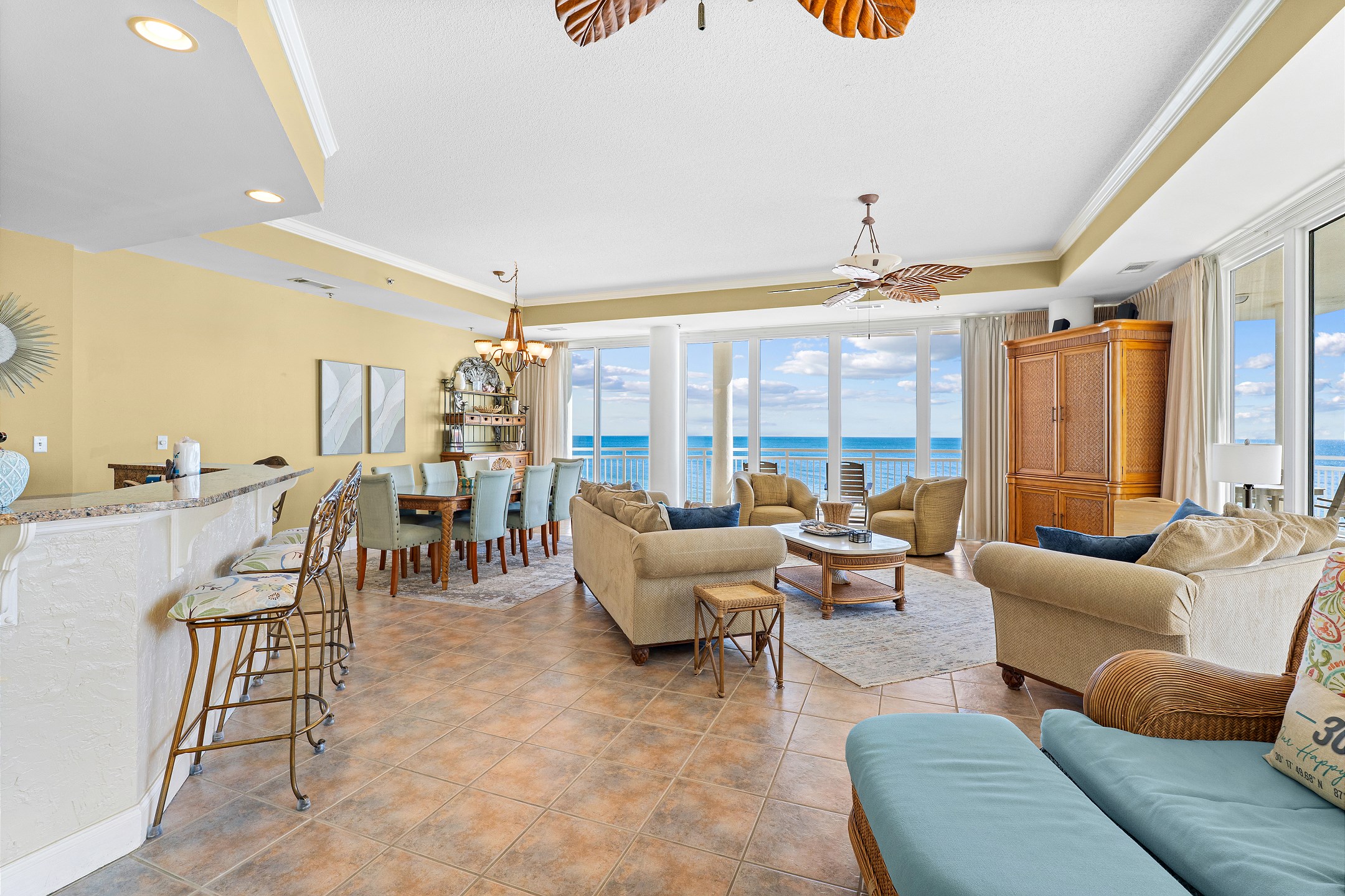 The living room is surrounded by floor-to-ceiling windows that showcase panoramic views of the Gulf and opens onto a private wraparound balcony with plenty of seating for relaxing or dining outdoors. The fully equipped kitchen features stainless steel appliances, ample counter space, and a dining table for enjoying meals together.