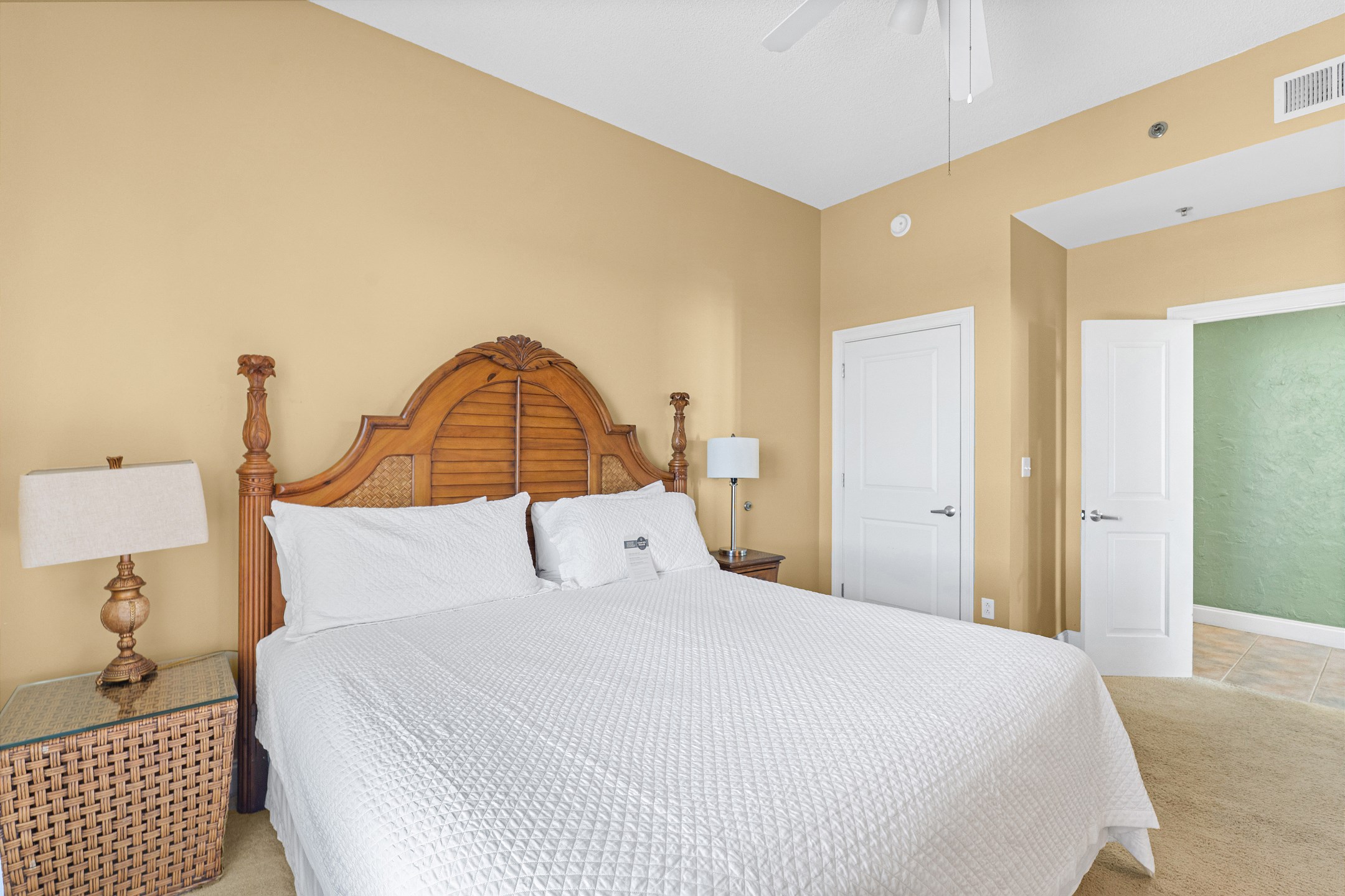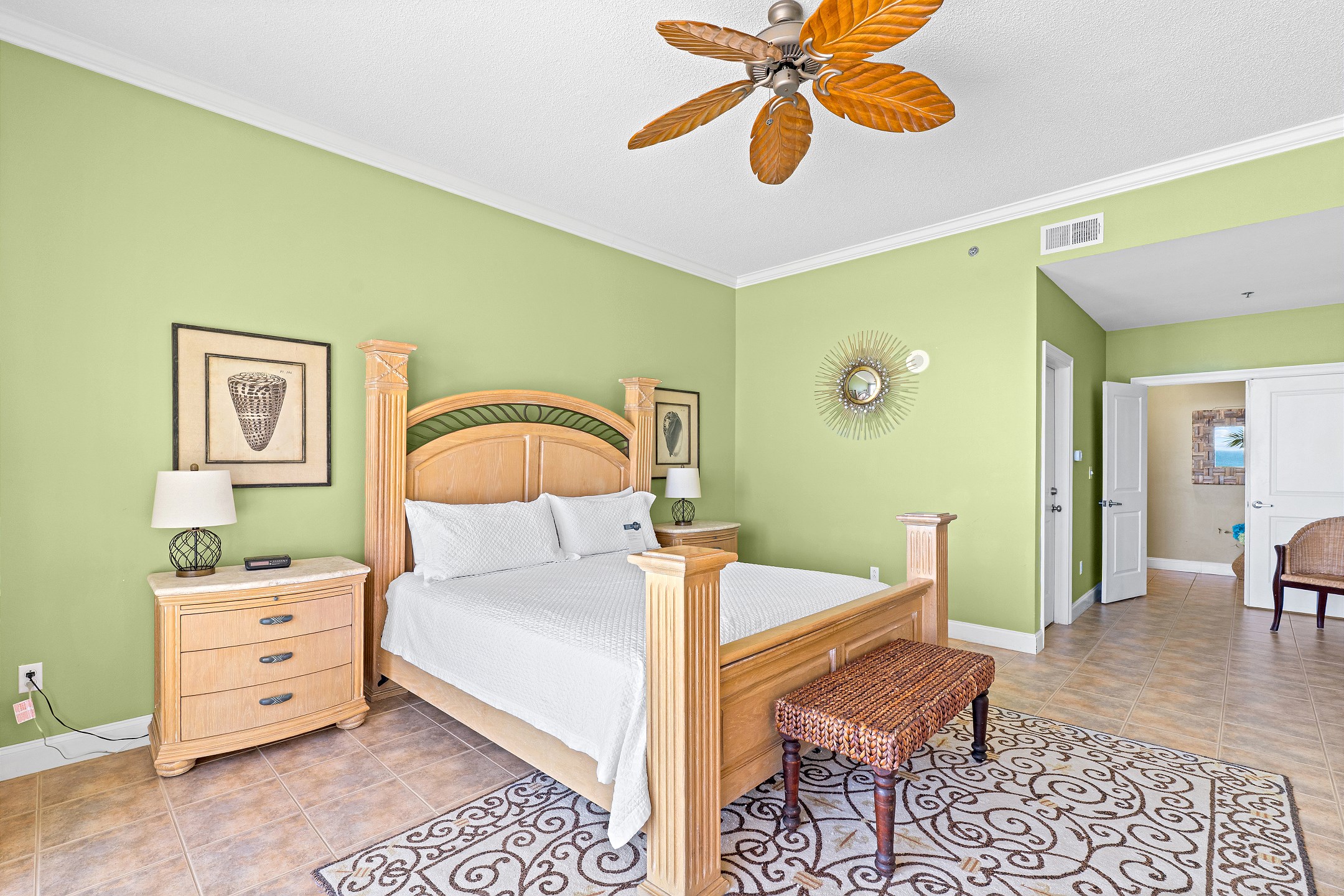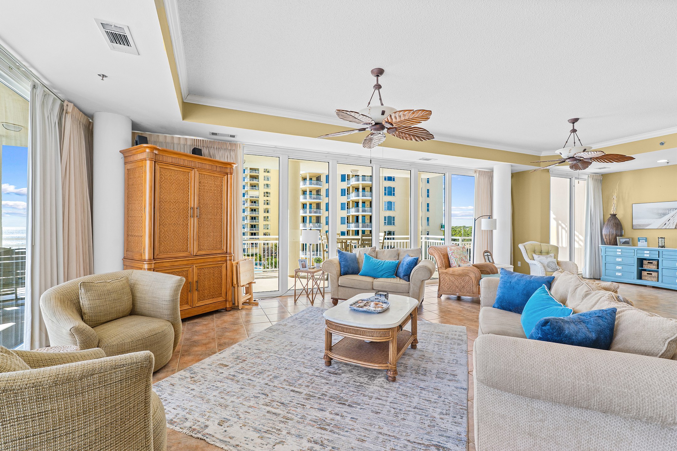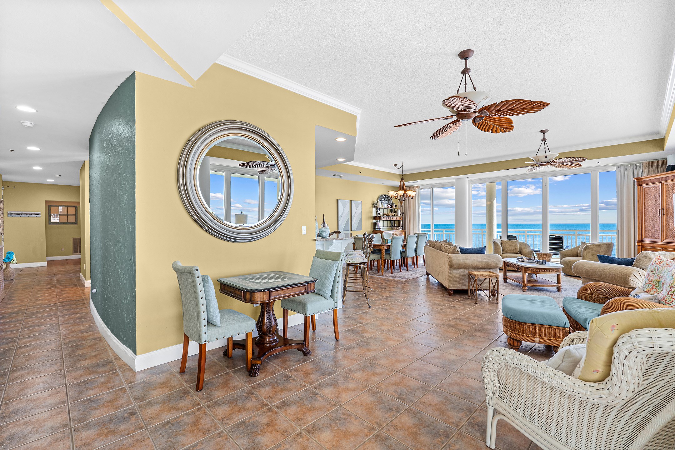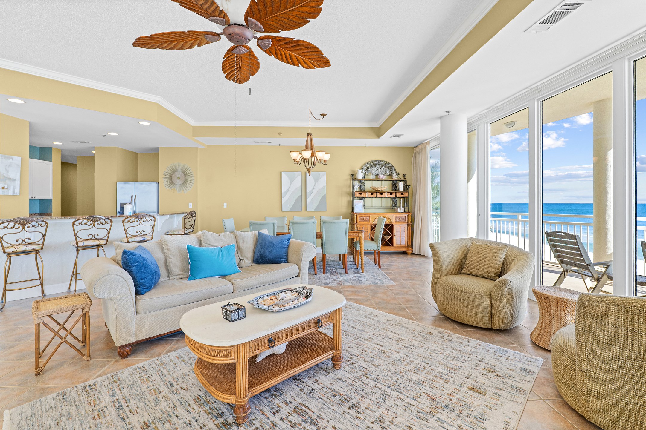The living room is surrounded by floor-to-ceiling windows that showcase panoramic views of the Gulf and opens onto a private wraparound balcony with plenty of seating for relaxing or dining outdoors. The fully equipped kitchen features stainless steel appliances, ample counter space, and a dining table for enjoying meals together.
