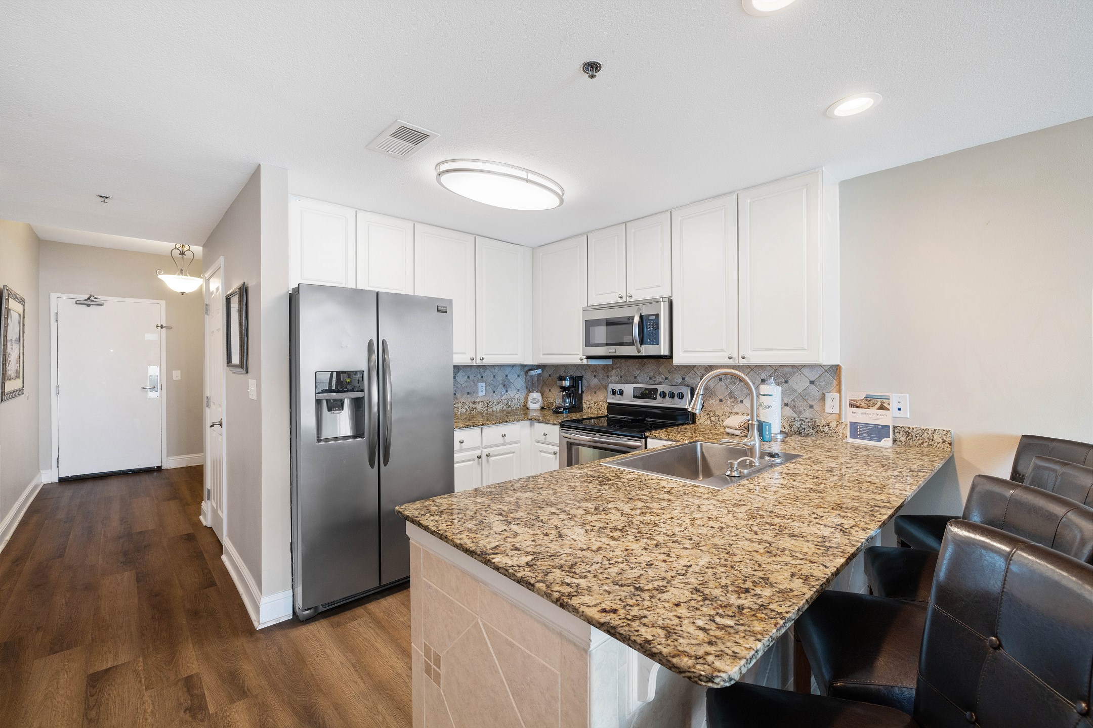 The unit also features a fully equipped kitchen with granite counters and stainless steel appliances, free WiFi, a full-sized washer and dryer, and a flat-screen TV in the living room. The sofa sleeper in the living room allows the unit to accommodate up to 8 people.