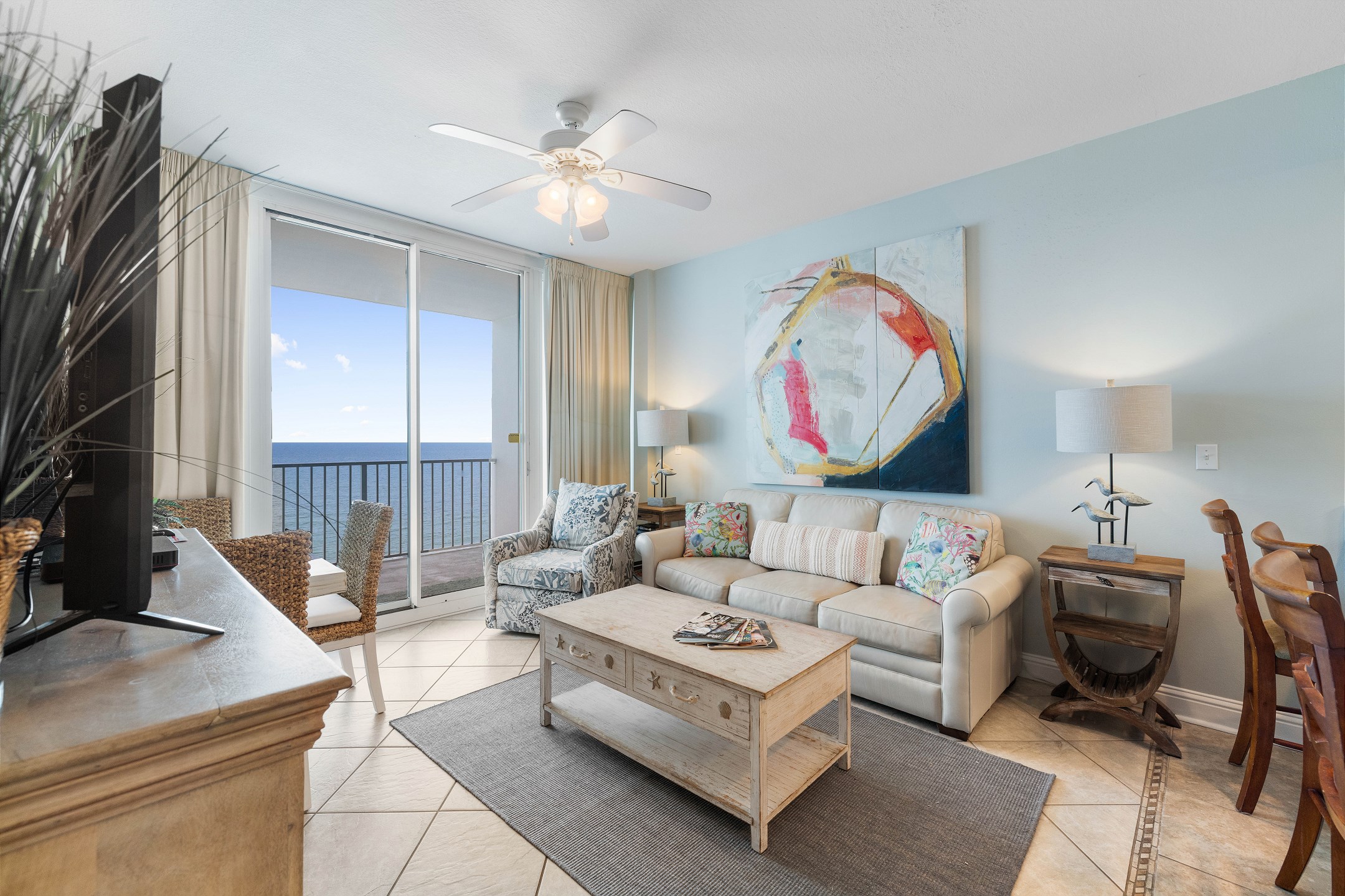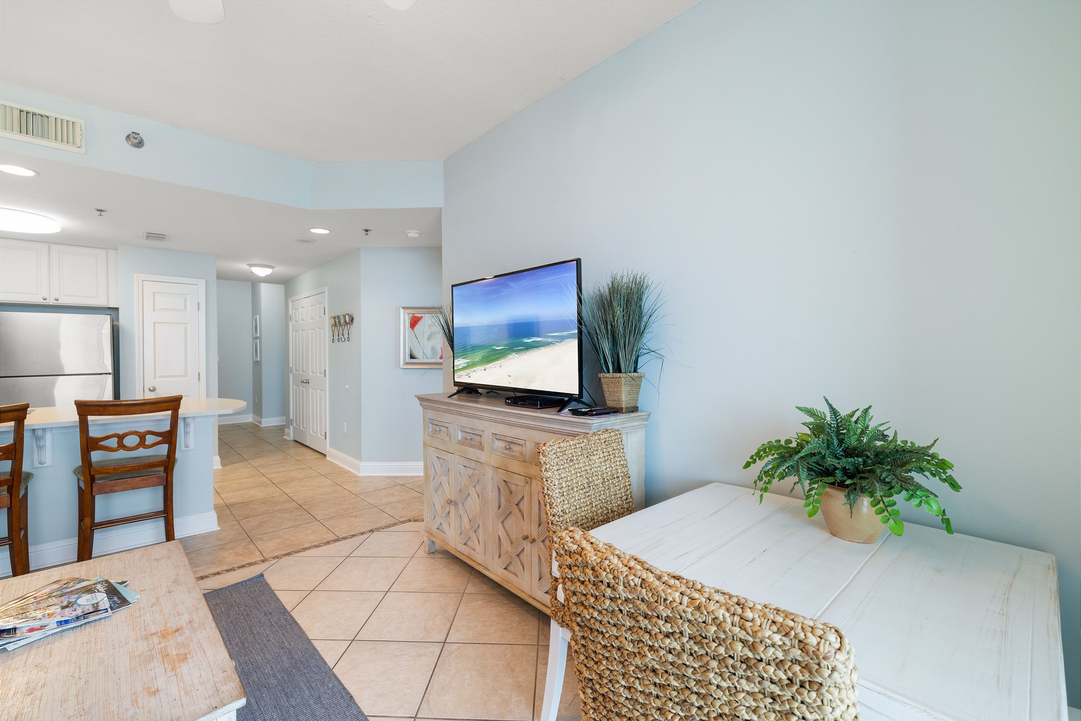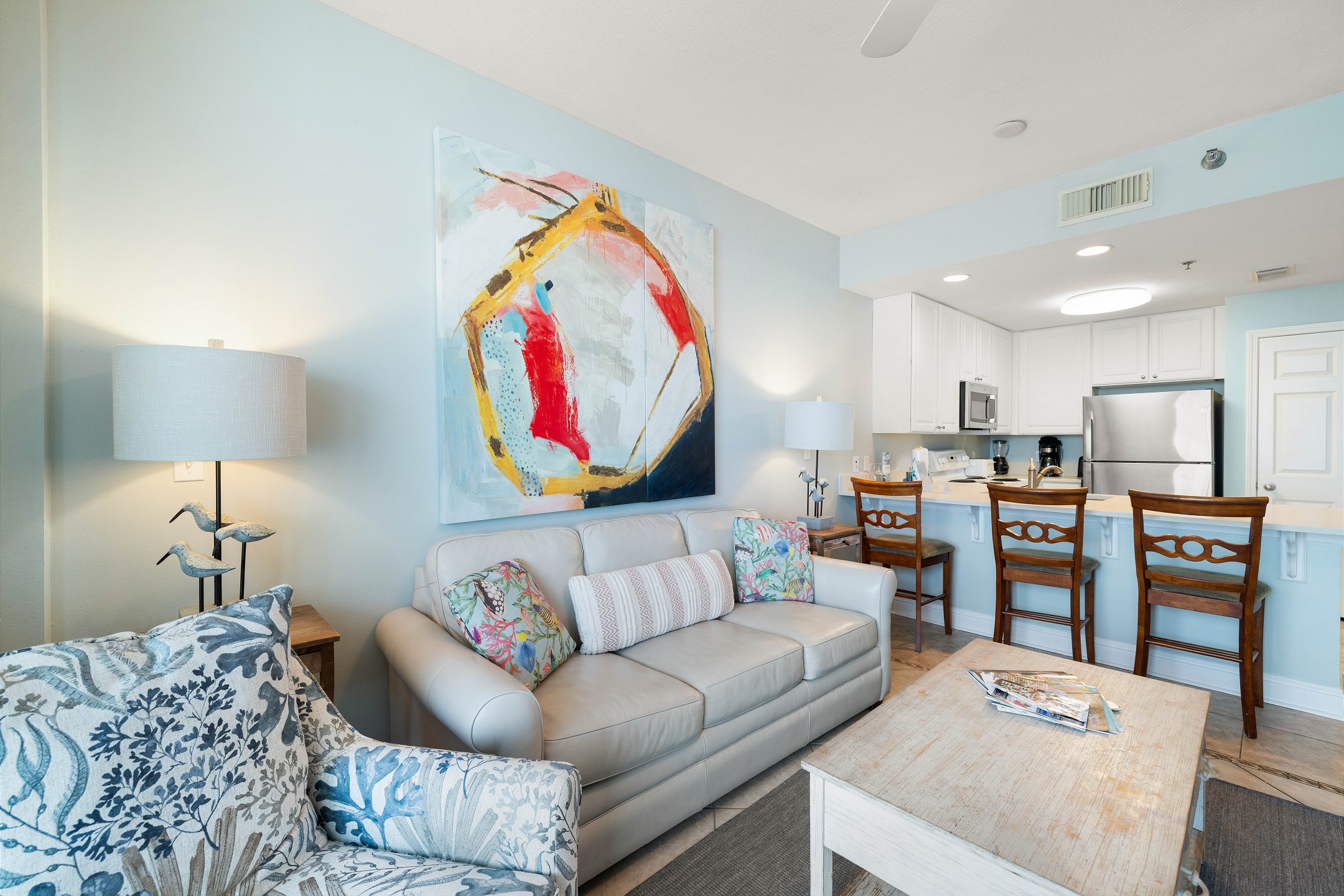 The heart of the condo, the living area, opens to a private balcony accessible from here and the Primary suite. This inviting space is perfect for lounging, equipped with a sofa sleeper and a flat-screen TV, expanding the sleeping arrangements to accommodate up to 6 guests comfortably.