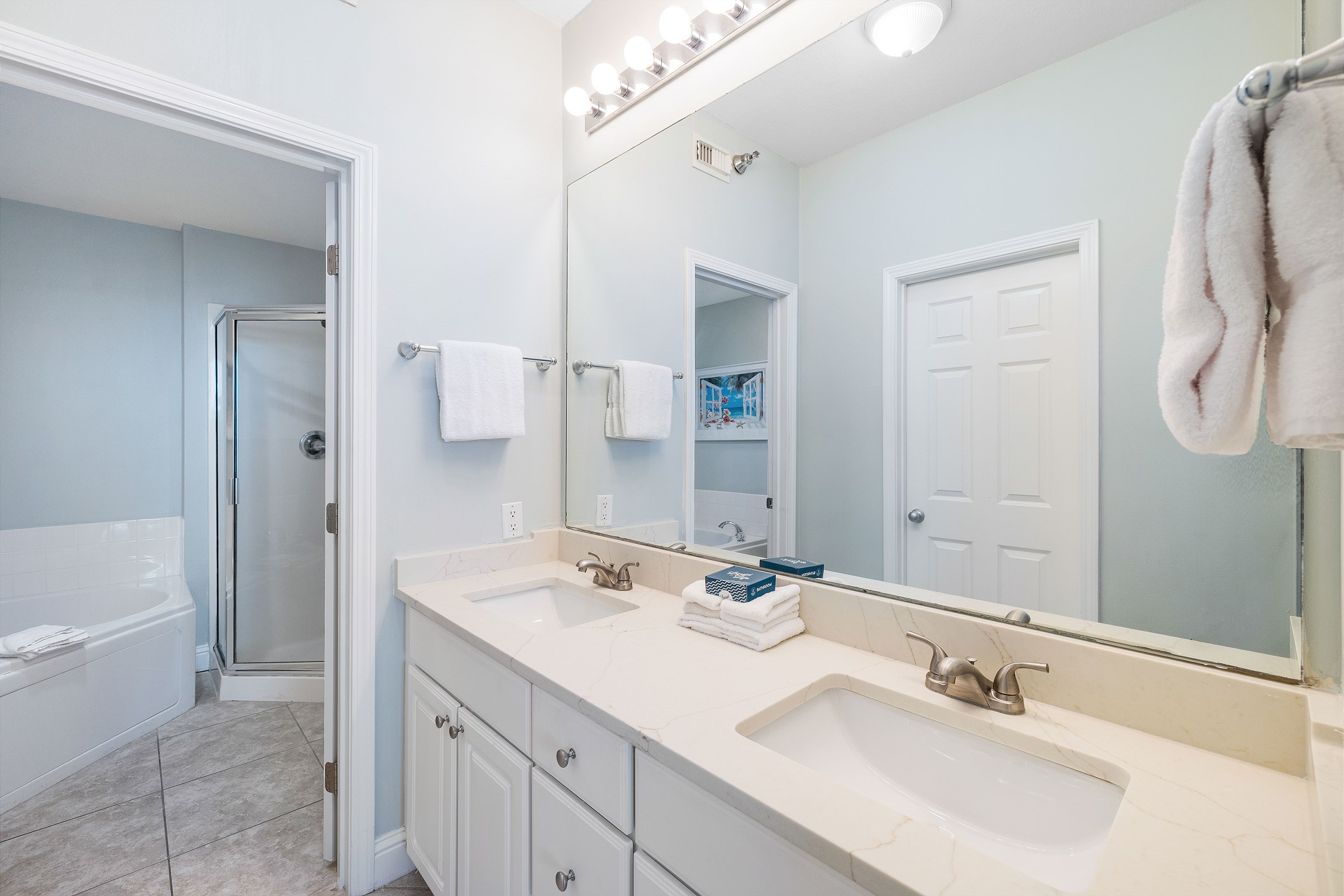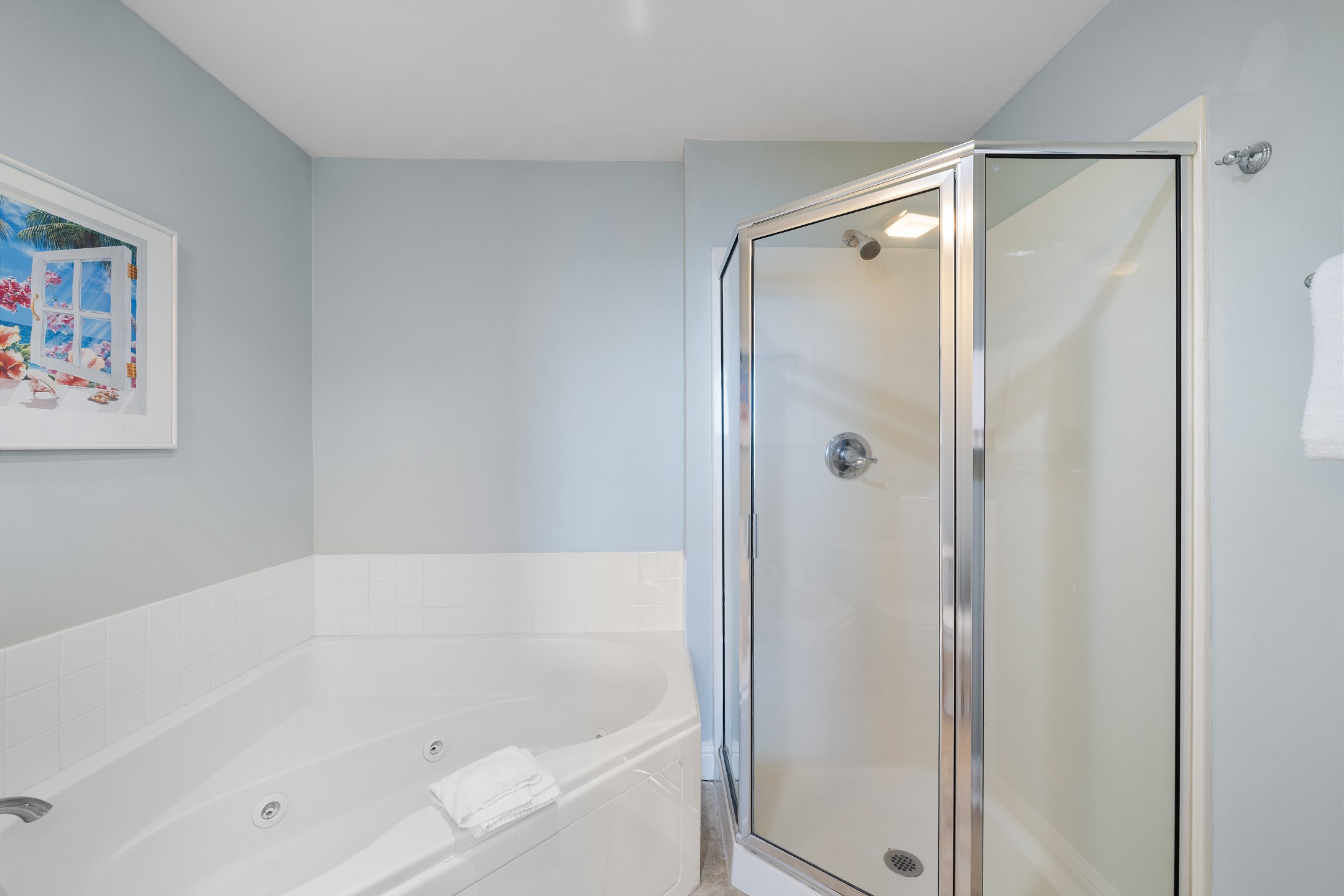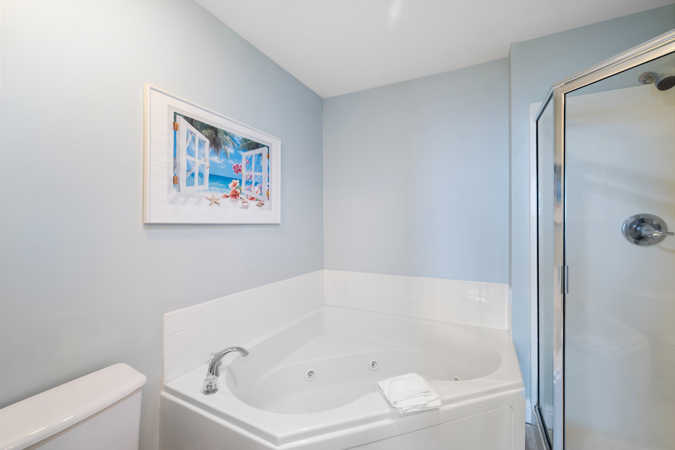 The Primary suite, a serene haven, is equipped with a comfortable King bed and a flat-screen TV, ensuring entertainment and restful nights. The en-suite Primary bath adds a touch of luxury with a Jacuzzi tub and a separate walk-in shower, perfect for unwinding after a day of beach adventures.