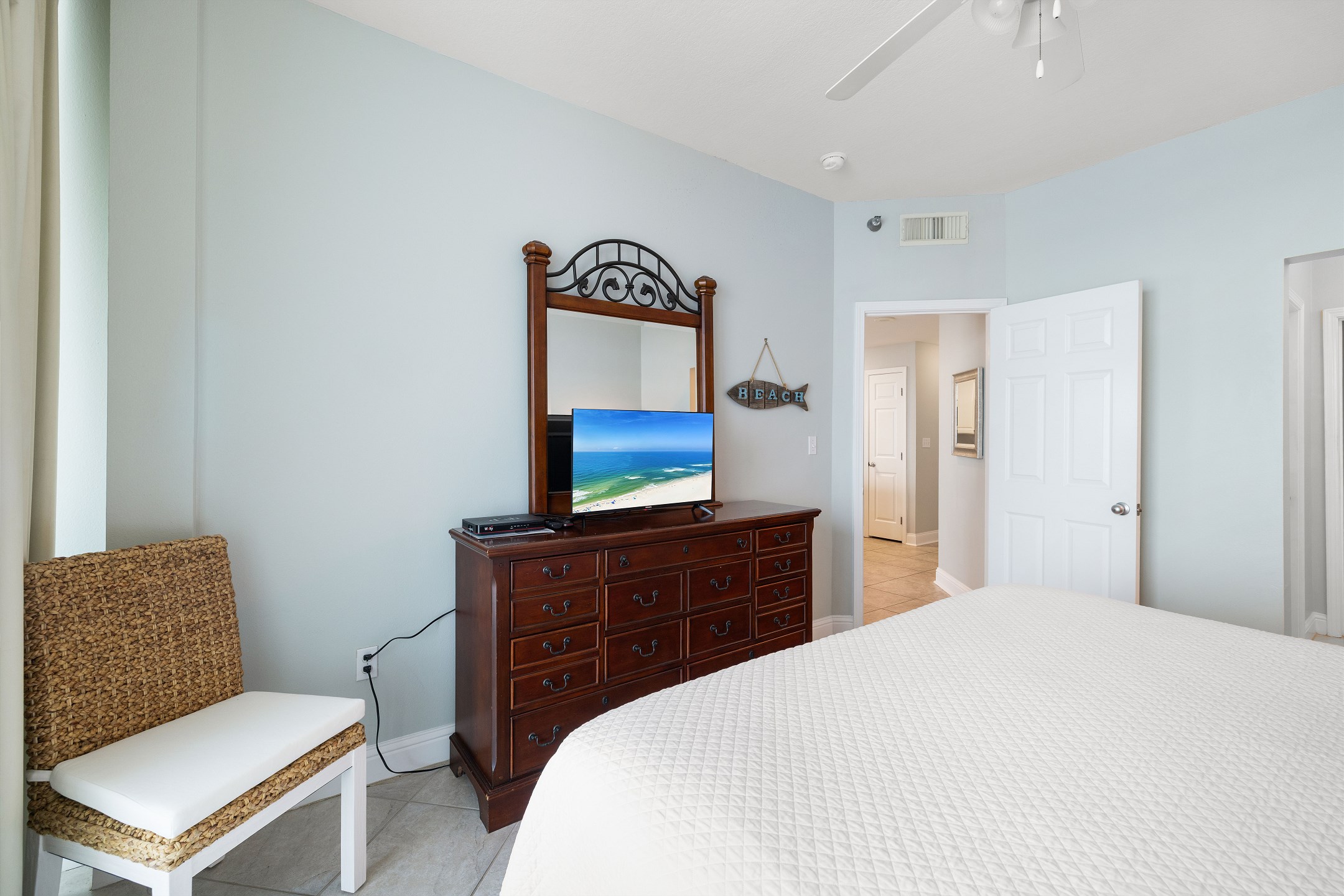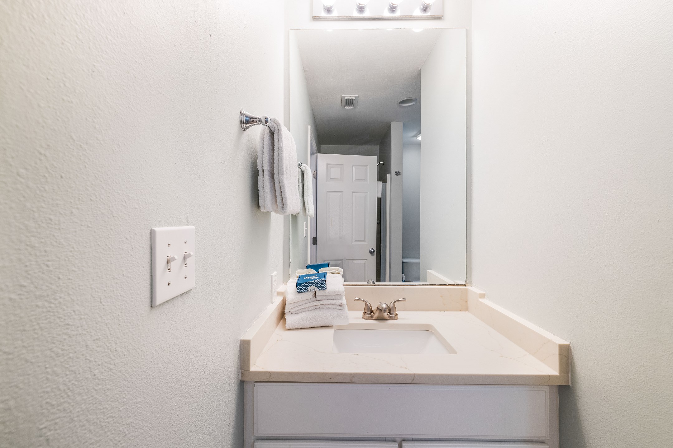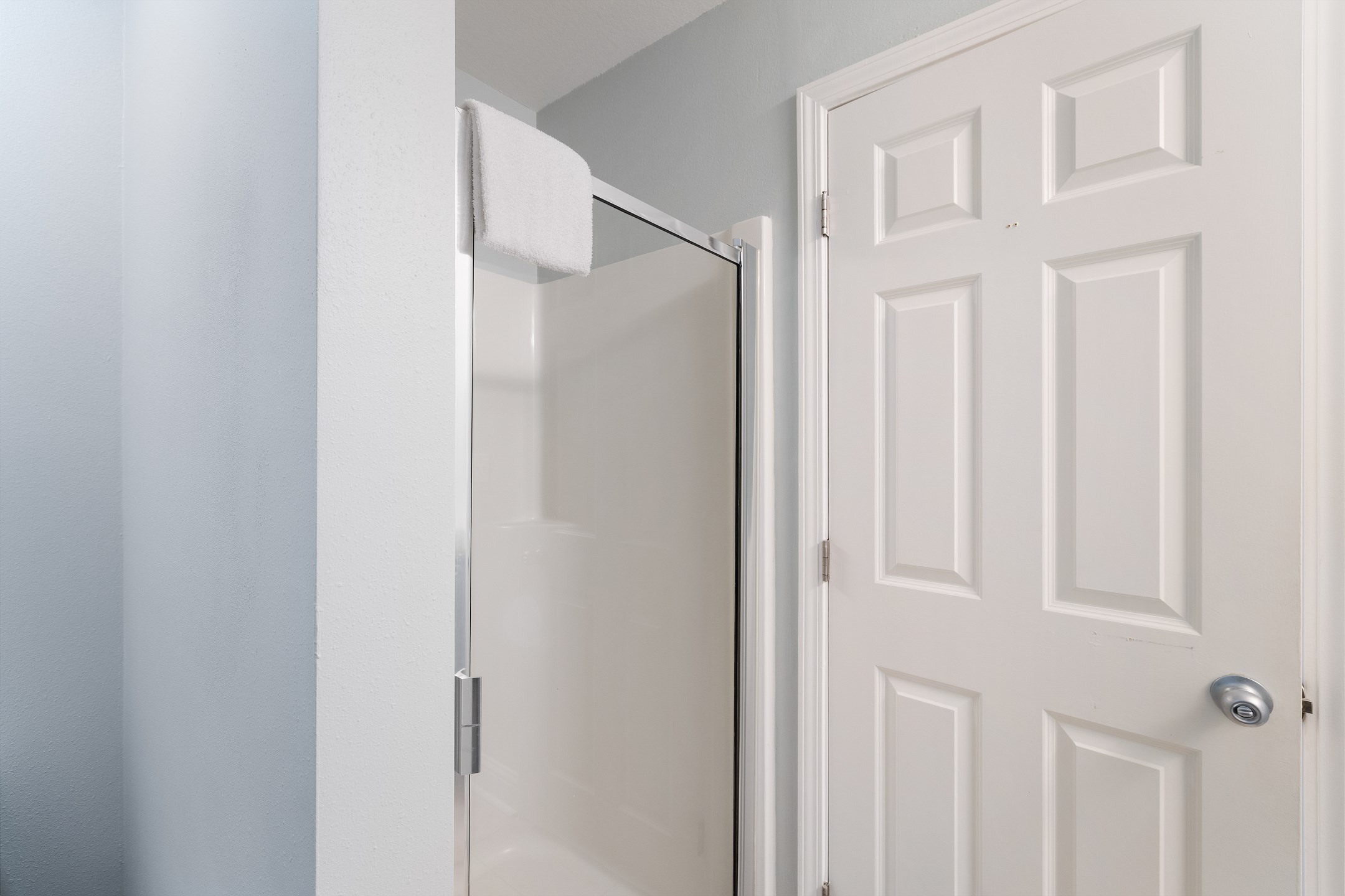 The Primary suite, a serene haven, is equipped with a comfortable King bed and a flat-screen TV, ensuring entertainment and restful nights. The en-suite Primary bath adds a touch of luxury with a Jacuzzi tub and a separate walk-in shower, perfect for unwinding after a day of beach adventures.