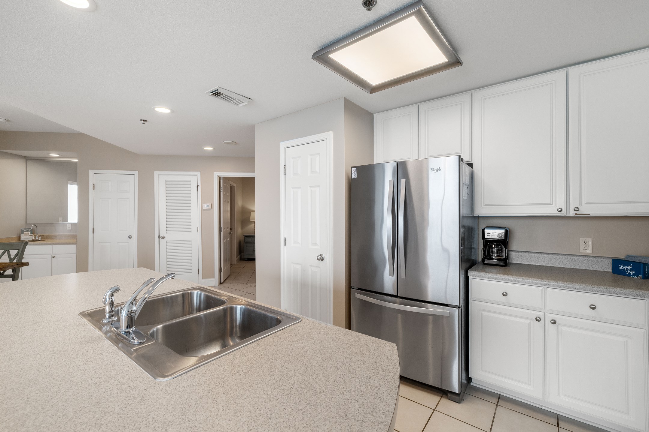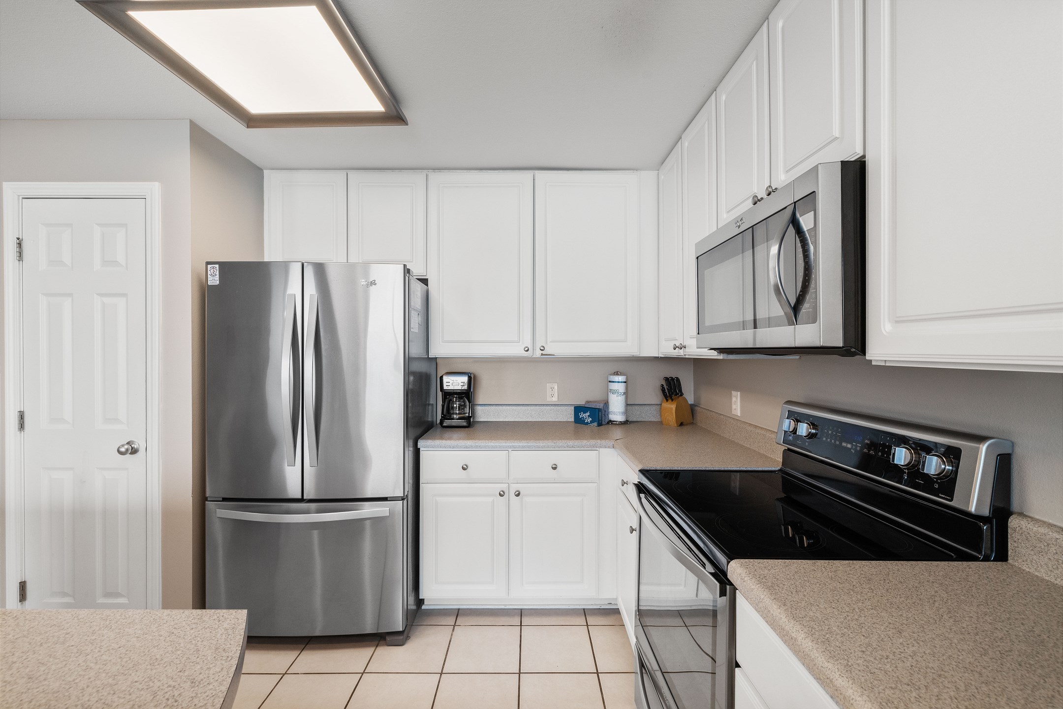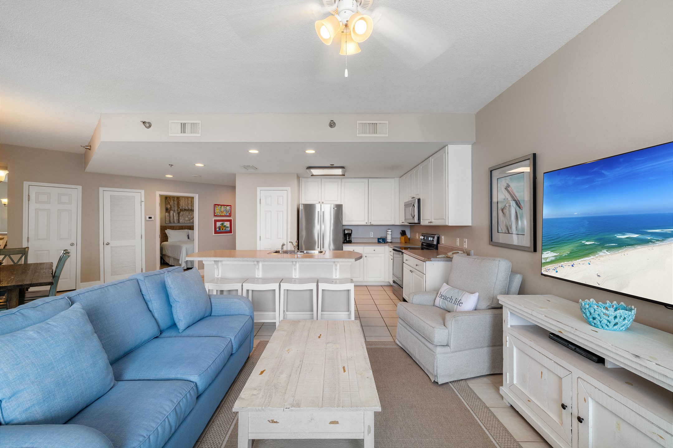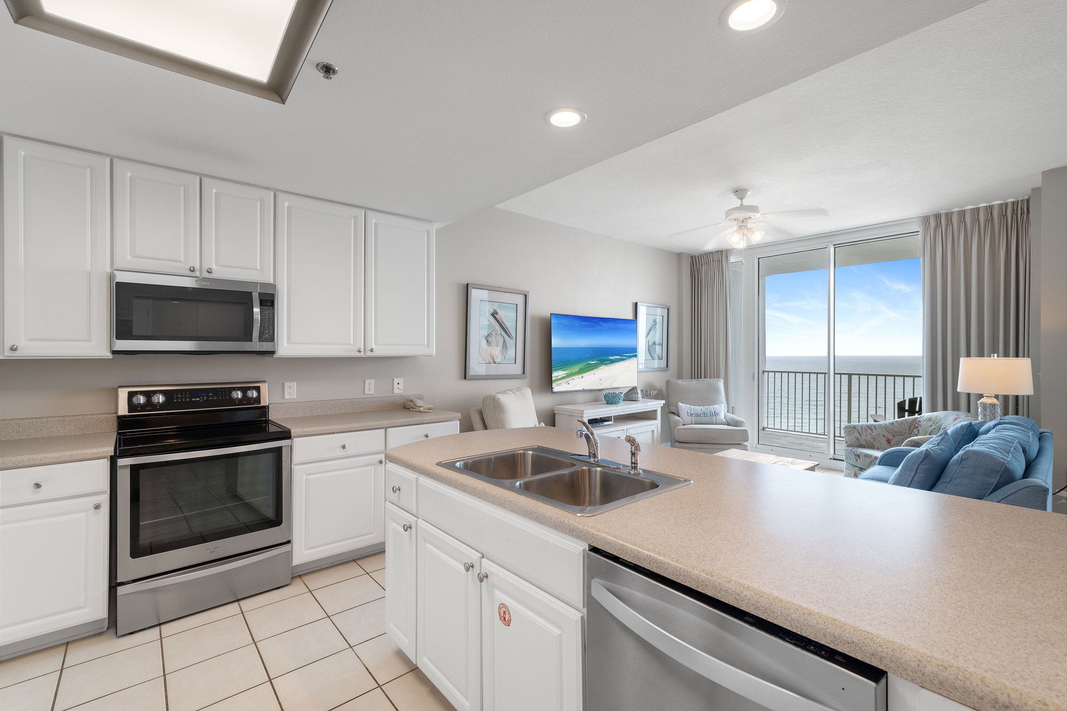 The living room features plenty of comfortable seating, a flat screen TV, and floor to ceiling windows that lead out to your private balcony overlooking the Gulf. This bright and airy space is perfect for gathering together after a day at the beach. The fully equipped kitchen includes stainless steel appliances, granite countertops, and a dining table, making it easy to prepare and enjoy meals during your stay.