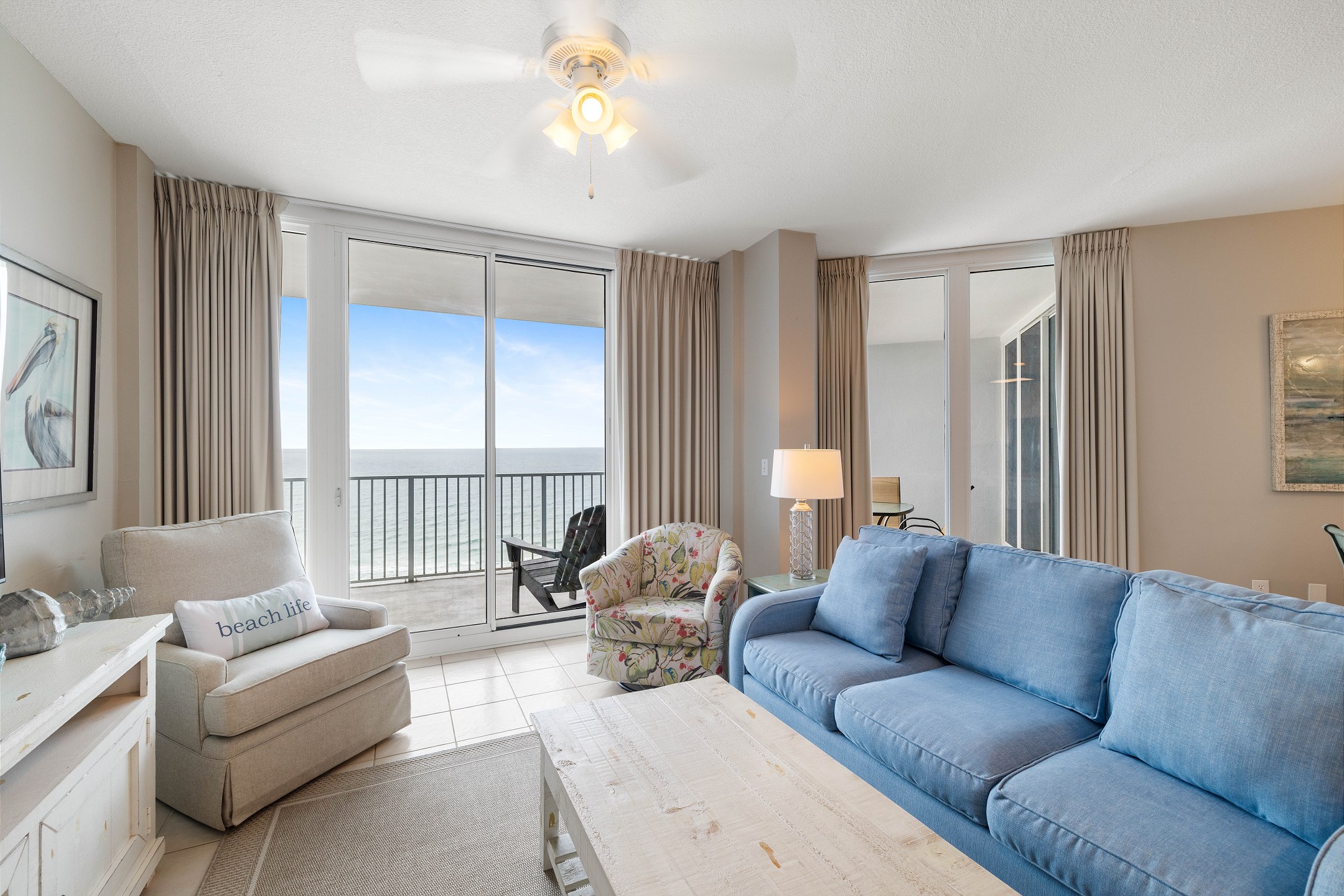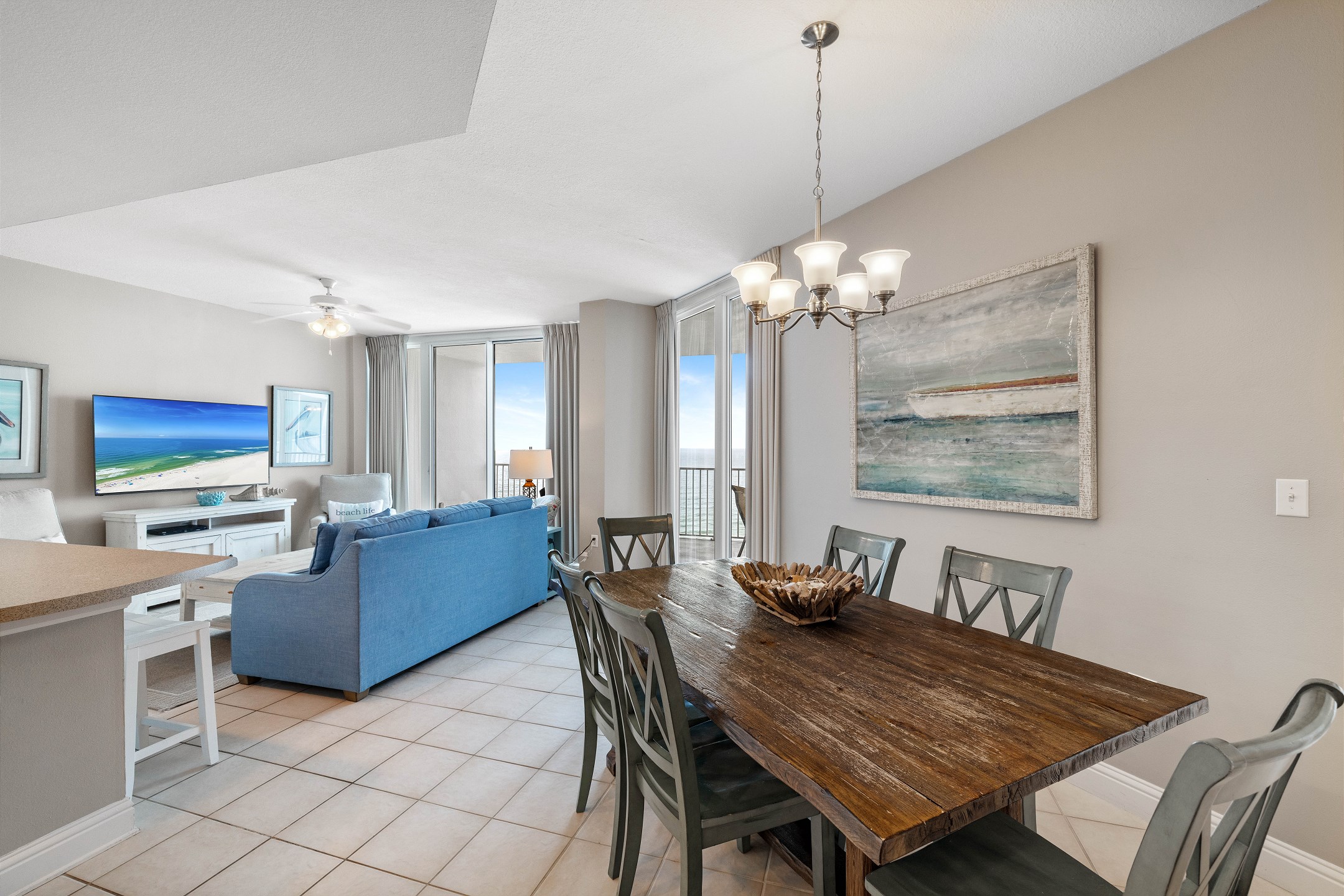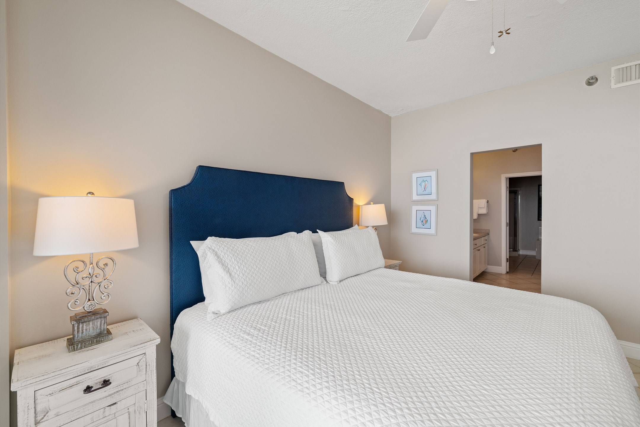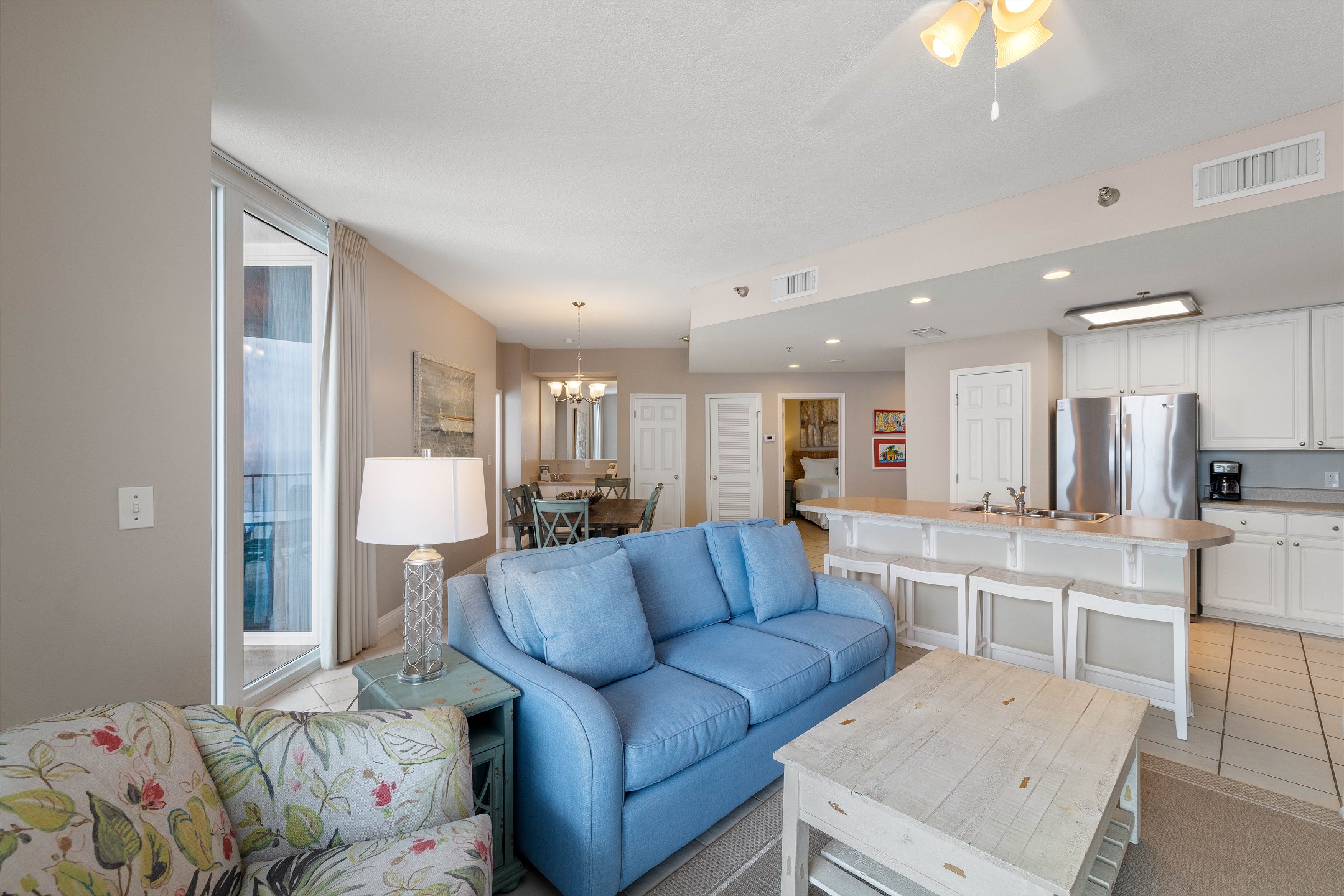 The living room features plenty of comfortable seating, a flat screen TV, and floor to ceiling windows that lead out to your private balcony overlooking the Gulf. This bright and airy space is perfect for gathering together after a day at the beach. The fully equipped kitchen includes stainless steel appliances, granite countertops, and a dining table, making it easy to prepare and enjoy meals during your stay.