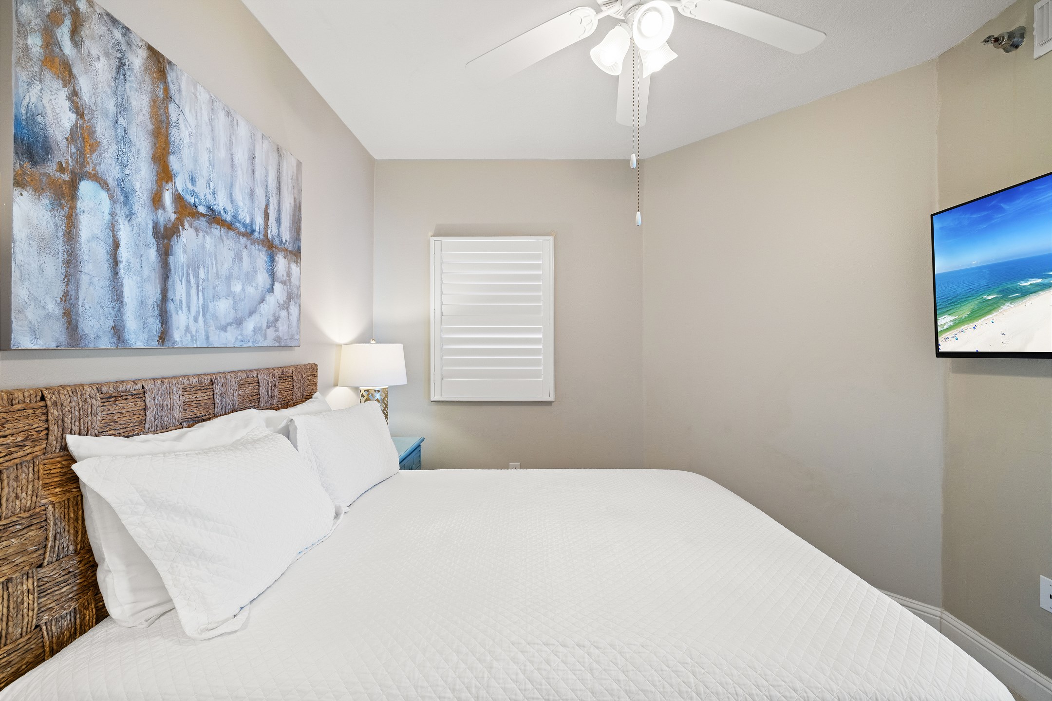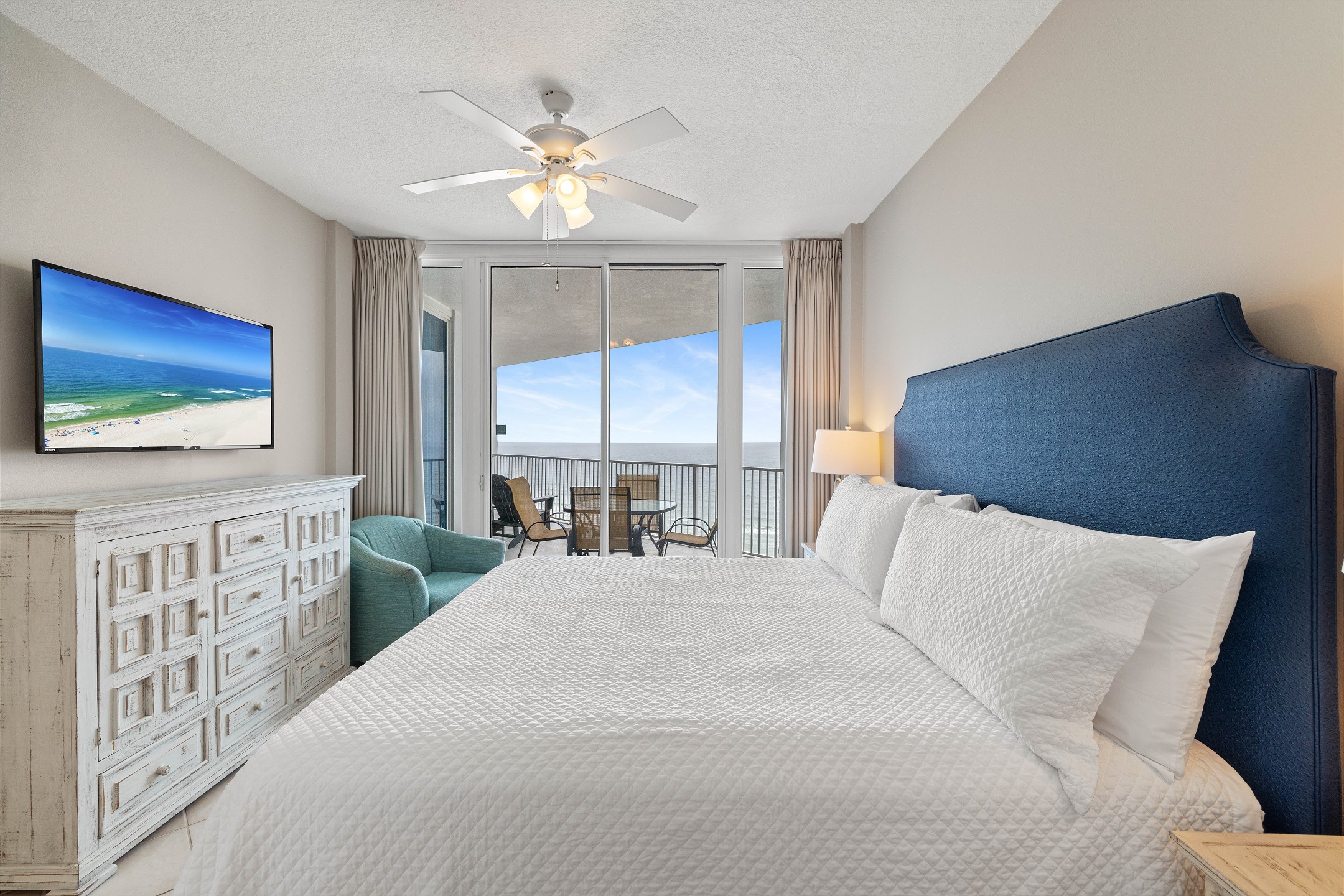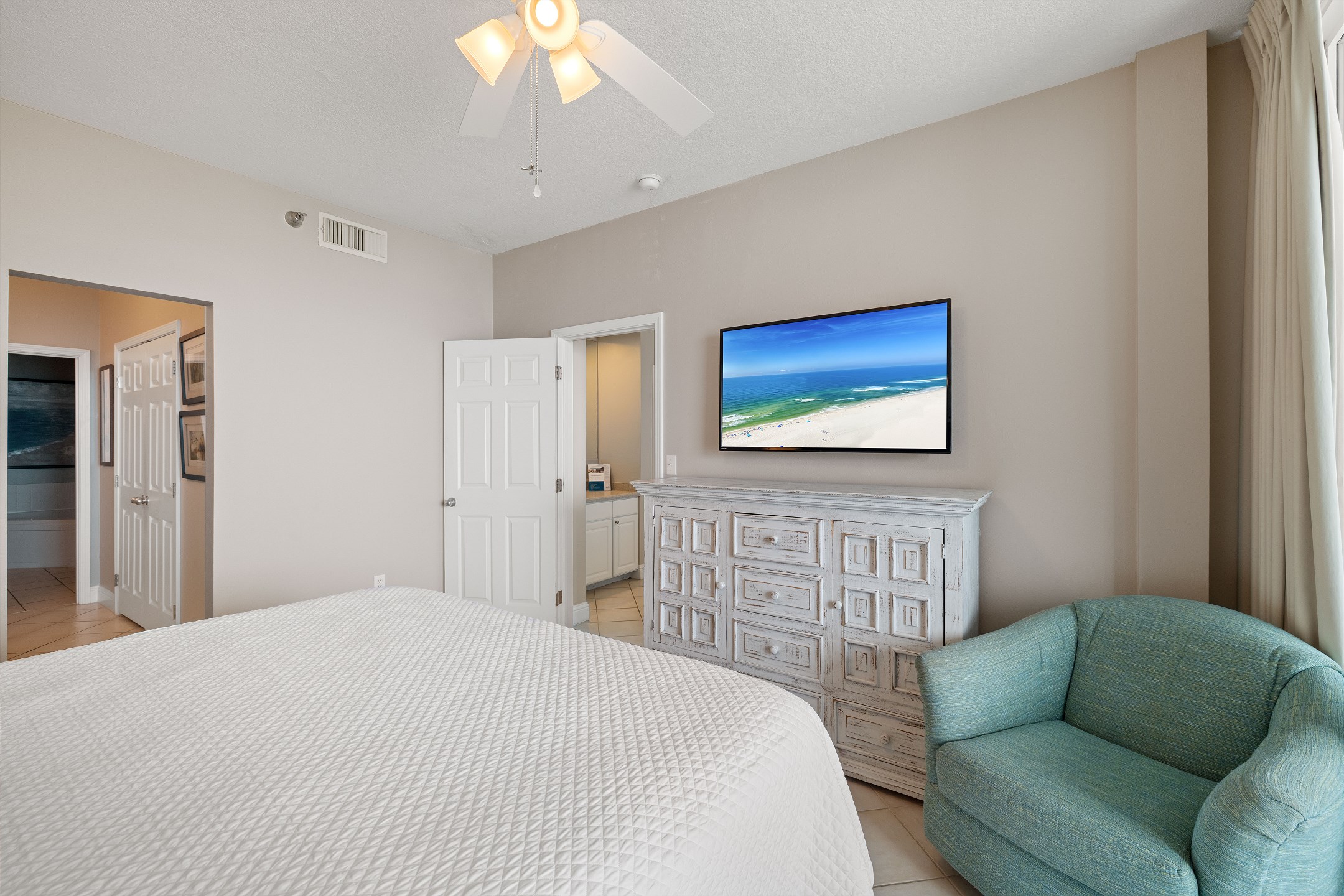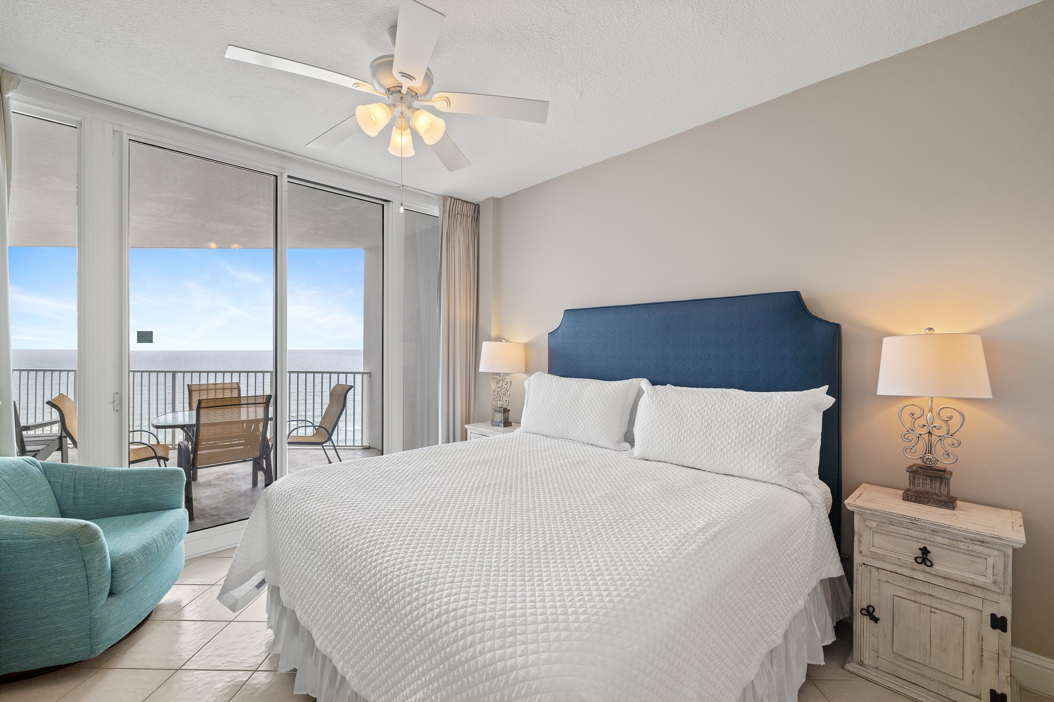 The living room features plenty of comfortable seating, a flat screen TV, and floor to ceiling windows that lead out to your private balcony overlooking the Gulf. This bright and airy space is perfect for gathering together after a day at the beach. The fully equipped kitchen includes stainless steel appliances, granite countertops, and a dining table, making it easy to prepare and enjoy meals during your stay.