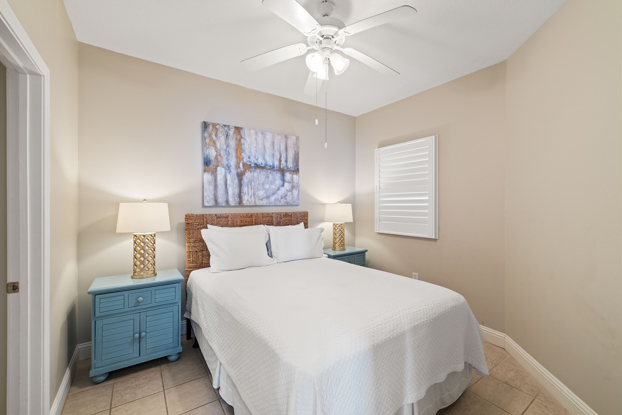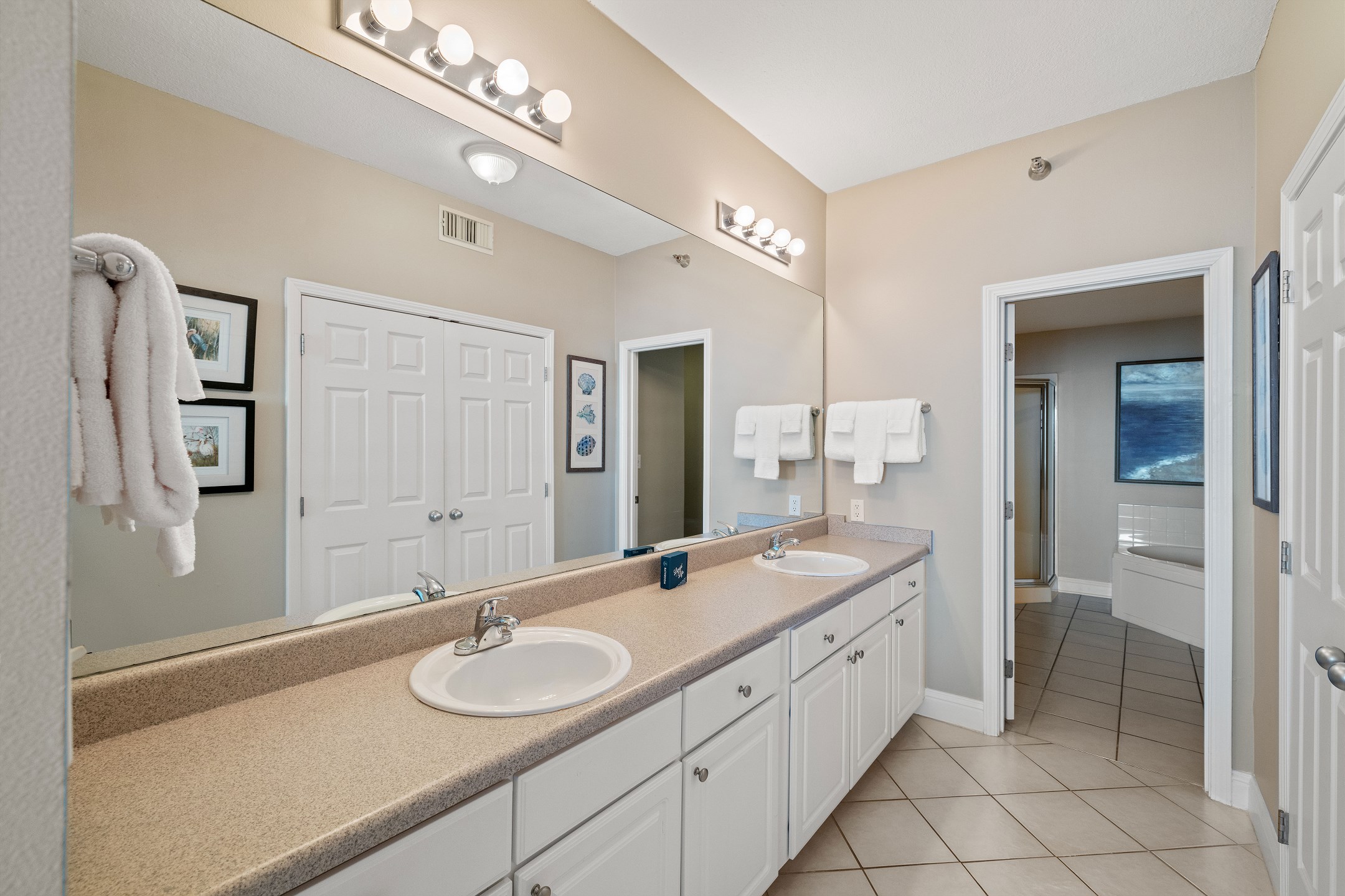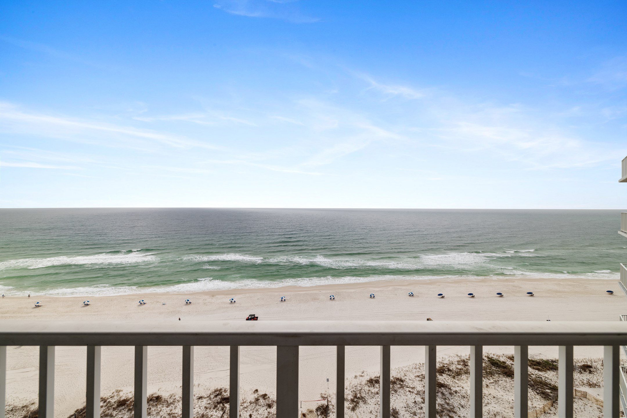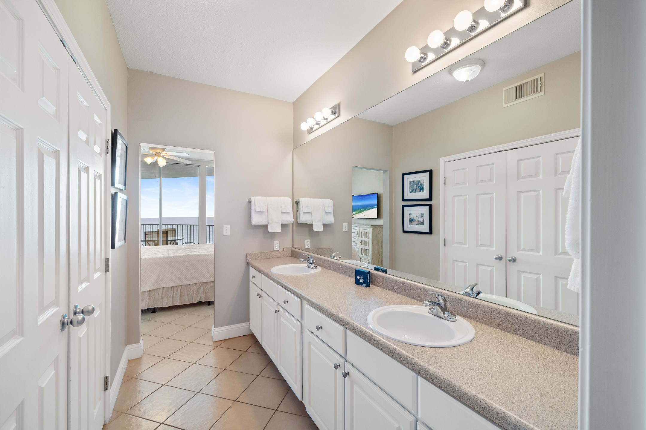 The living room features plenty of comfortable seating, a flat screen TV, and floor to ceiling windows that lead out to your private balcony overlooking the Gulf. This bright and airy space is perfect for gathering together after a day at the beach. The fully equipped kitchen includes stainless steel appliances, granite countertops, and a dining table, making it easy to prepare and enjoy meals during your stay.