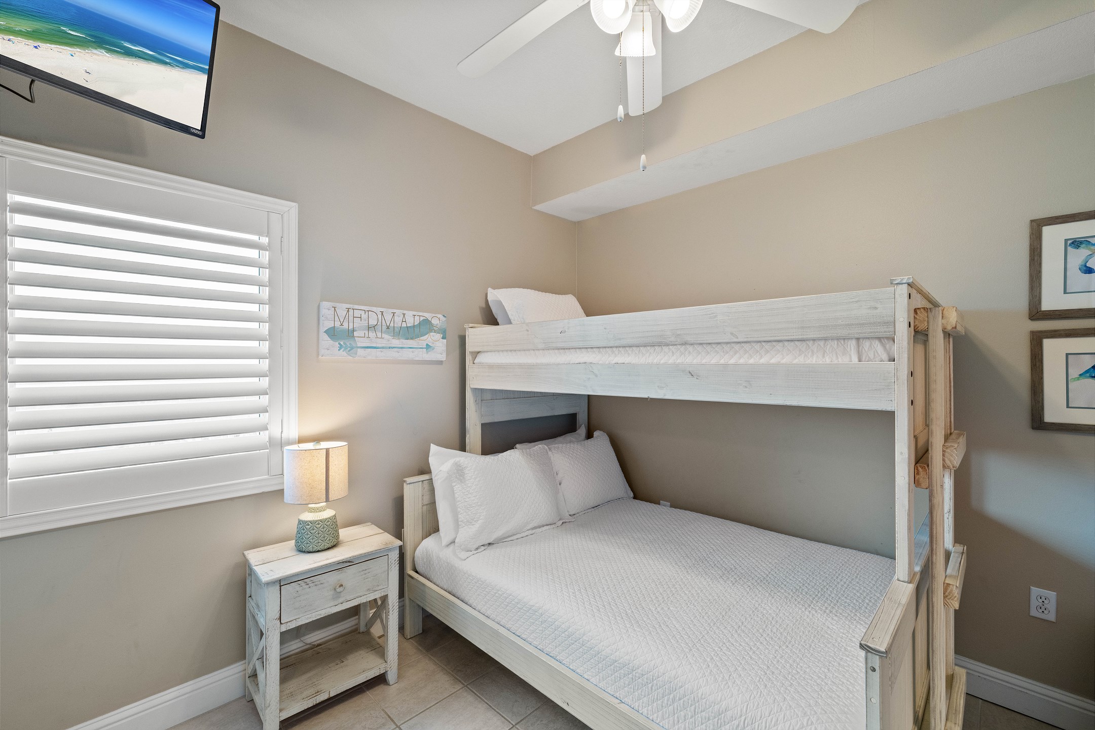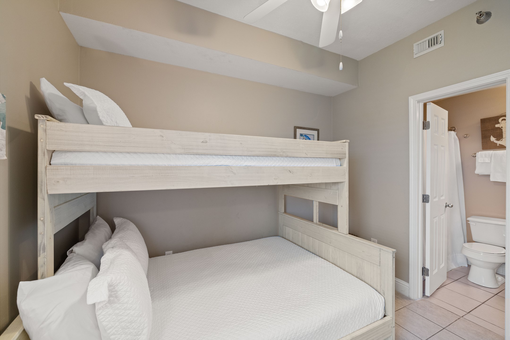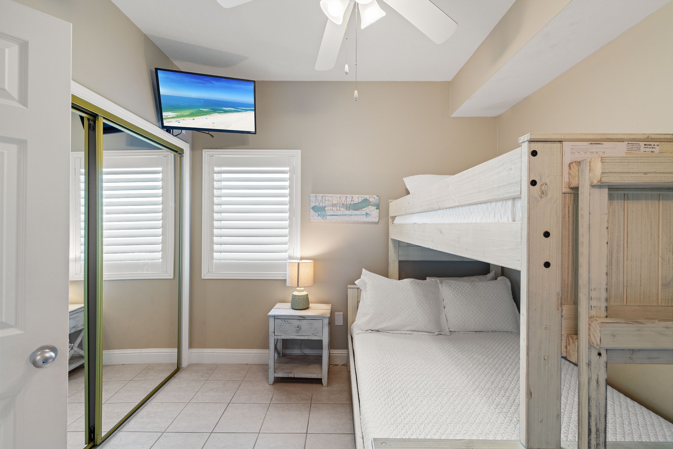 The primary bedroom offers a king bed, flat screen TV, floor to ceiling windows with balcony access, and a private ensuite bathroom featuring a jetted tub and a walk in shower. The second bedroom includes a queen bed and a flat screen TV, providing a cozy retreat for guests. The third bedroom features a twin over full bunk bed, a flat screen TV, and its own ensuite bathroom with a shower tub combination, making it ideal for kids or additional guests.