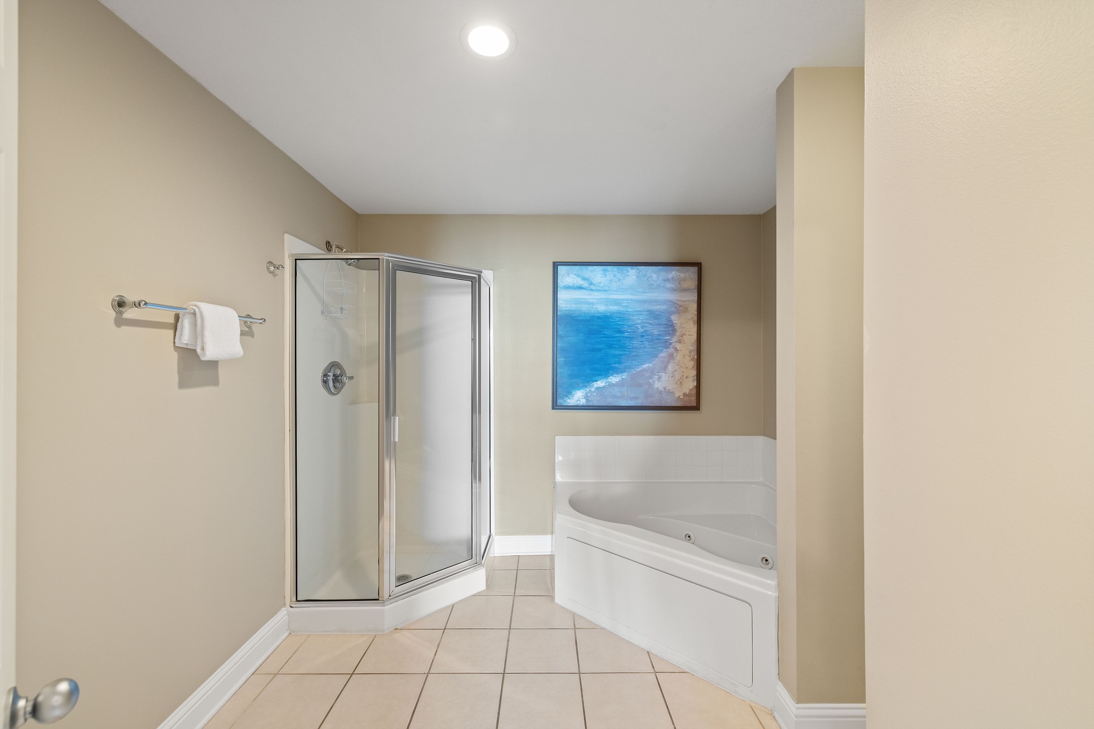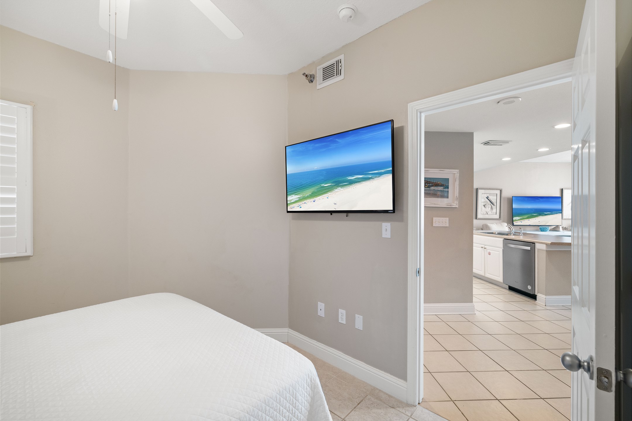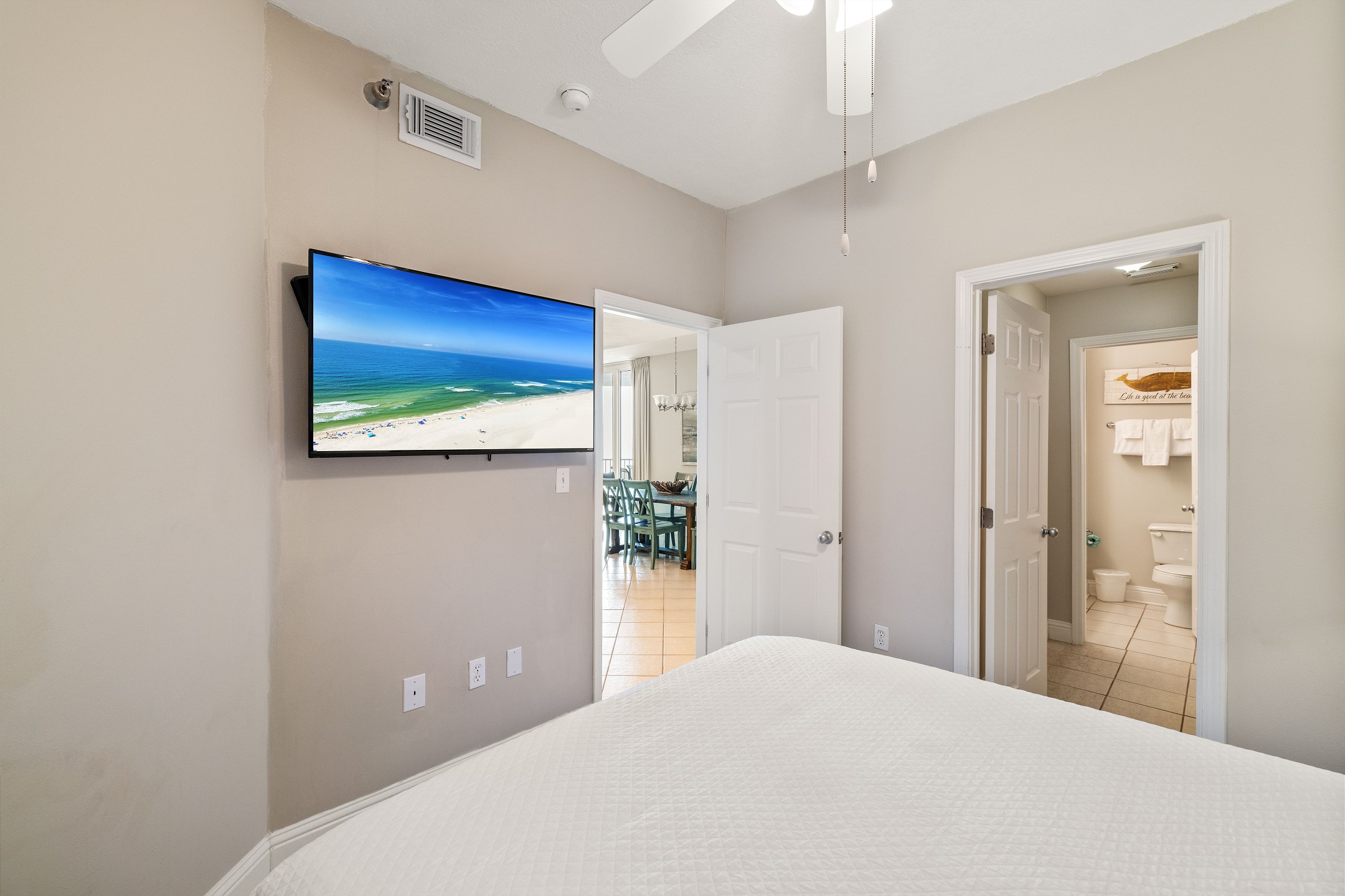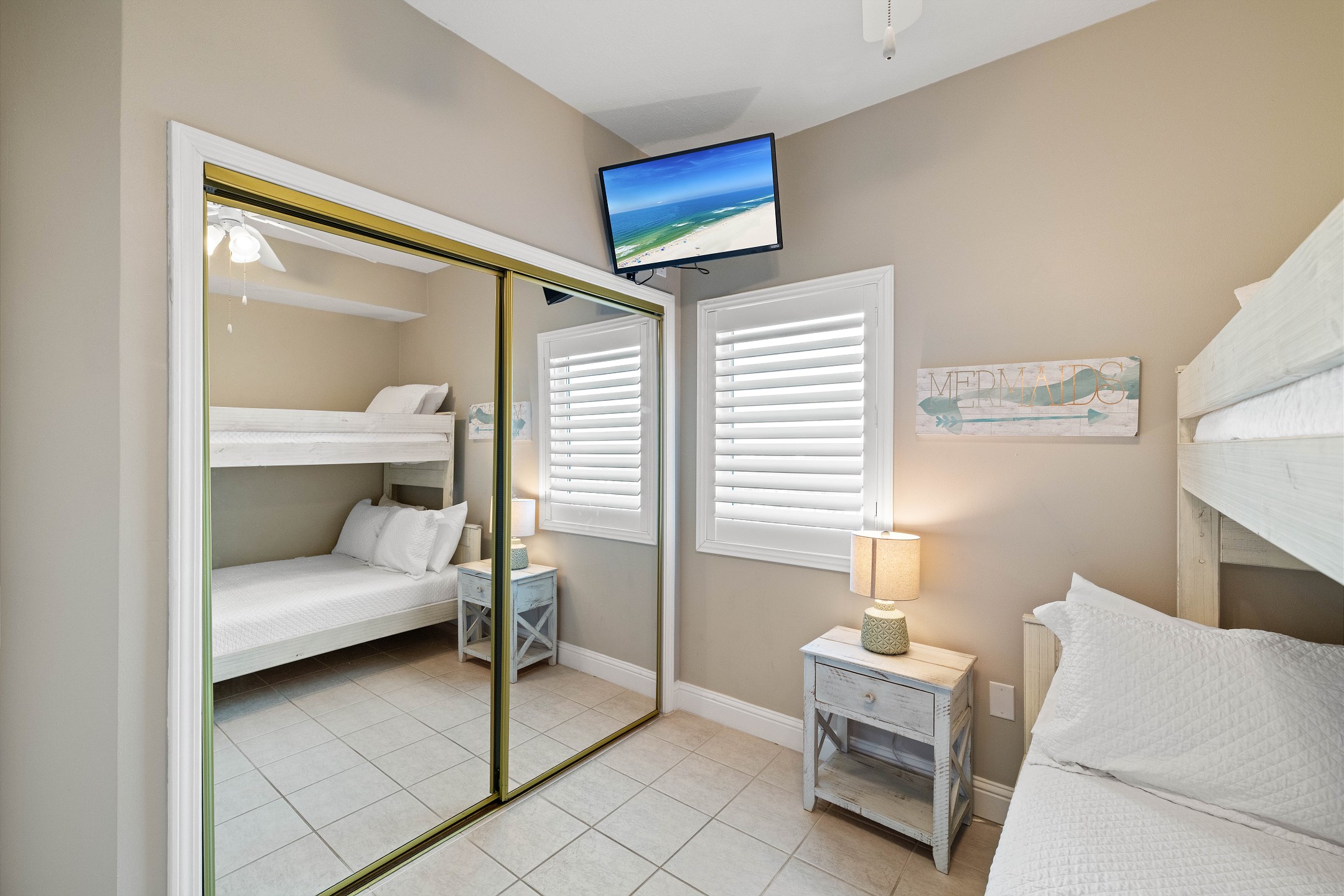 The primary bedroom offers a king bed, flat screen TV, floor to ceiling windows with balcony access, and a private ensuite bathroom featuring a jetted tub and a walk in shower. The second bedroom includes a queen bed and a flat screen TV, providing a cozy retreat for guests. The third bedroom features a twin over full bunk bed, a flat screen TV, and its own ensuite bathroom with a shower tub combination, making it ideal for kids or additional guests.