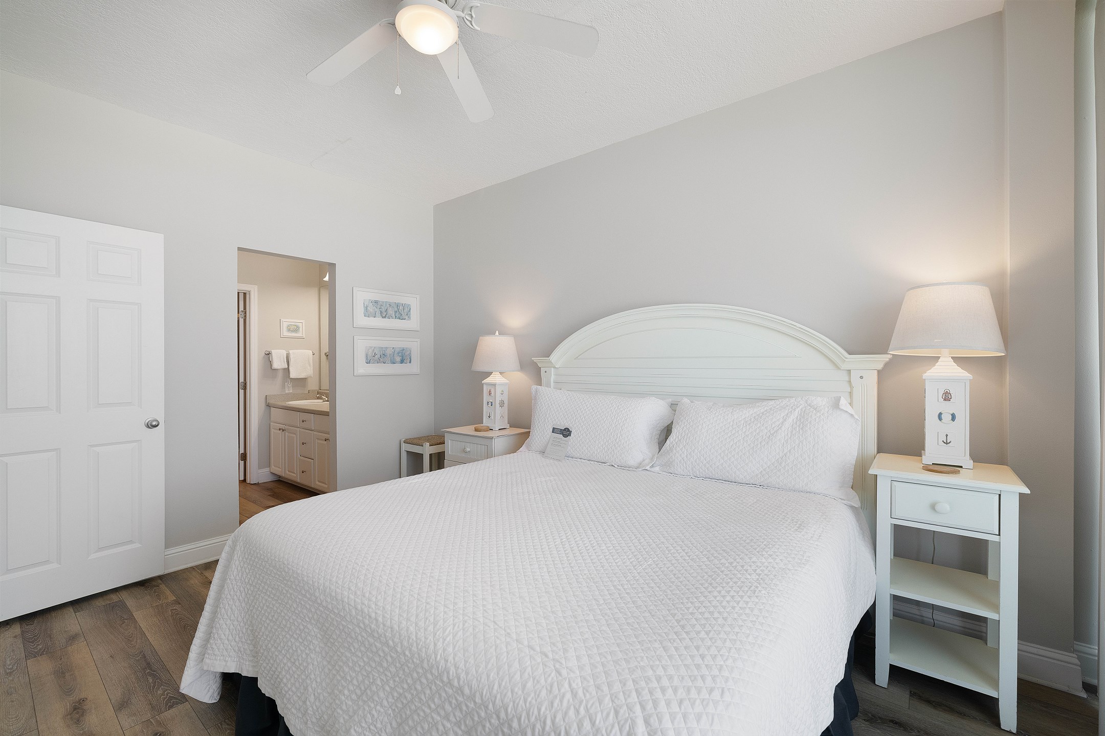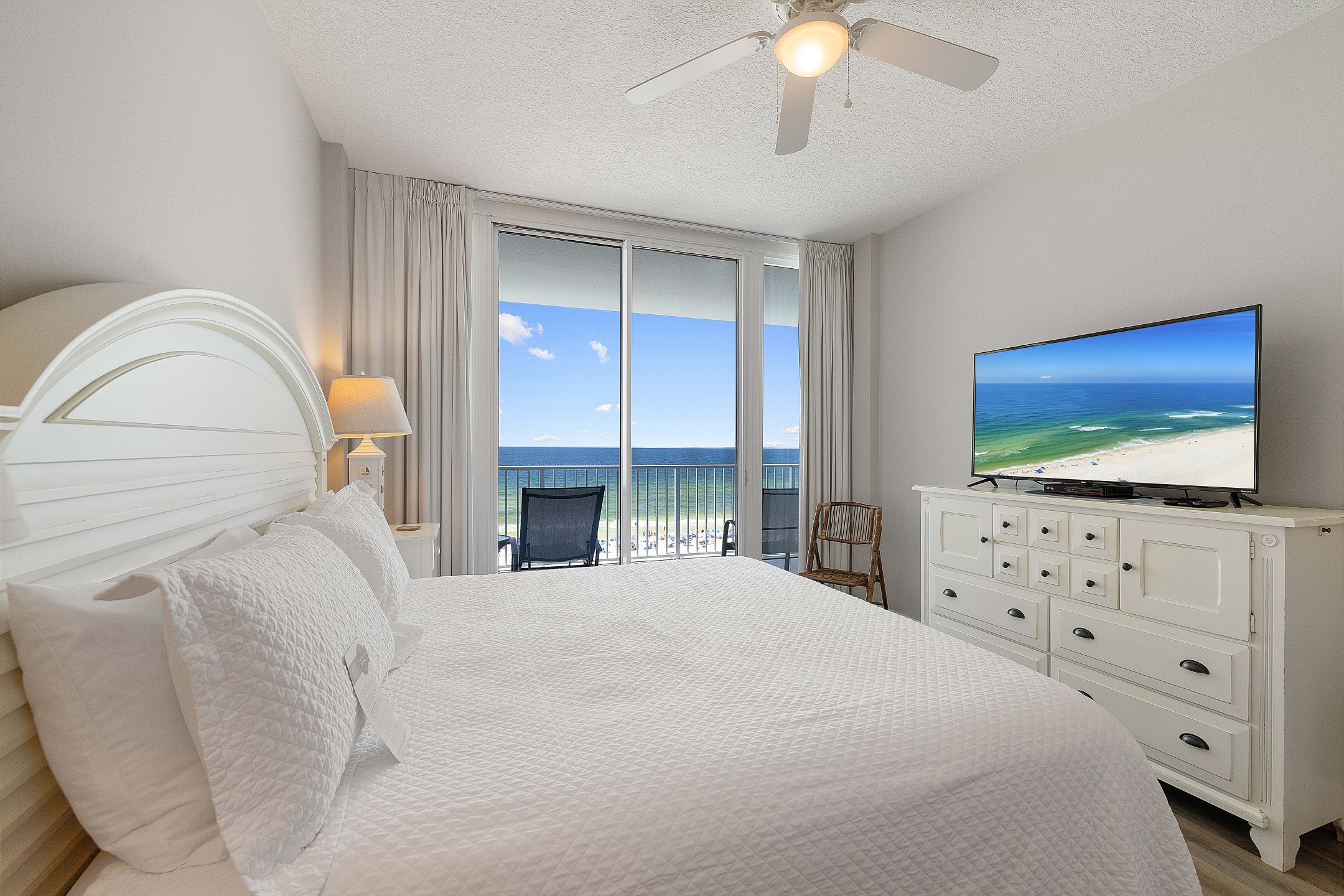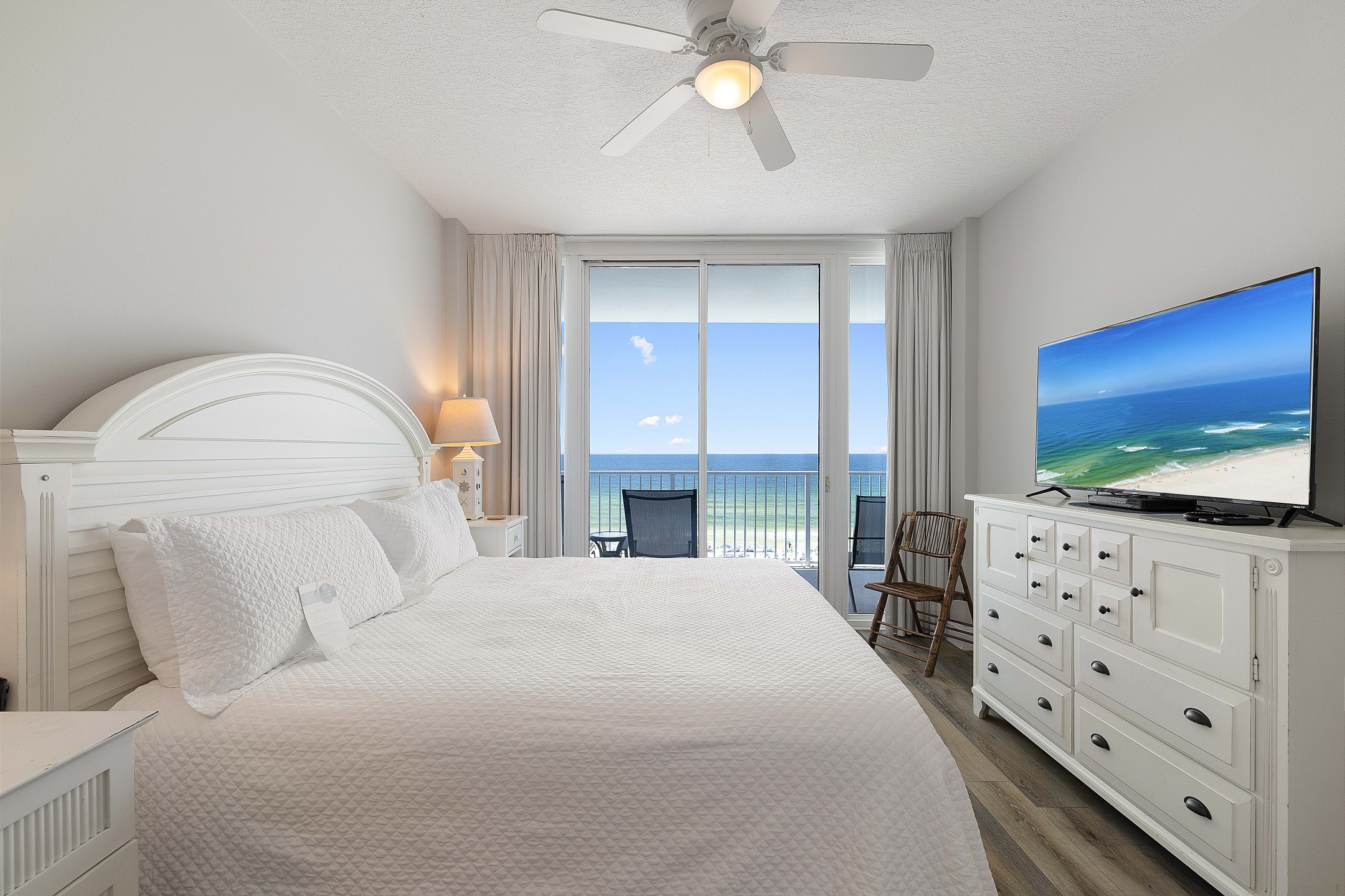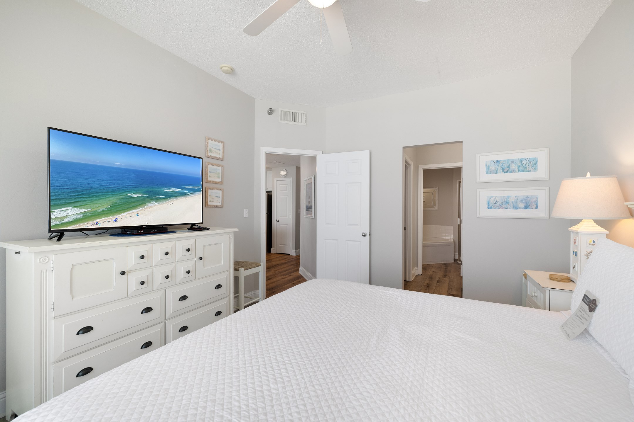 The Primary suite is a haven of tranquility, opening to the balcony and featuring a King bed with a Beauty Rest Adjustable mattress for unparalleled comfort, accompanied by a 50-inch flat-screen HD TV. The private bath, complete with a Jacuzzi tub and separate walk-in shower, provides a spa-like experience. A dressing area outside the large walk-in closet adds to the convenience and luxury.