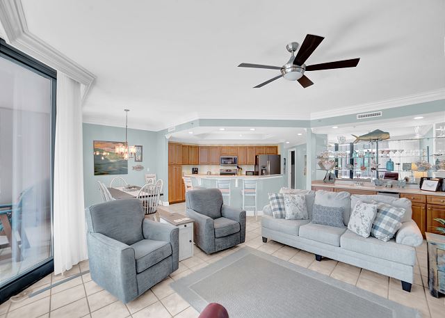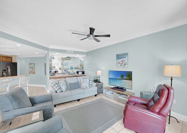 The condo is immaculate. Furniture was clean and comfortable. The kitchen was nicely equipped. It felt extremely comfortable. My children enjoyed the pools and lazy river. Staff on site was extremely friendly and helpful, and liquid life rentals online staff was very responsive. We had trouble checking in the unit, and it was a bit laborious to correct, as the door lock key wasn't programmed correctly, but the online staff was courteous and corrected the problem online somehow. The marvel of technology. One of my favorite aspects of this condo for me, the dad, is that the parking garage connects directly to your floor if you park on that deck, meaning no wait times for elevators if you didn't mind driving up three decks, which I didn't. The location is nice as you have all the amenities of the bay, great views, access to a small and pleasant beach, but don't have the extreme traffic that is always present on beach road. Overall, I would stay at this location again.