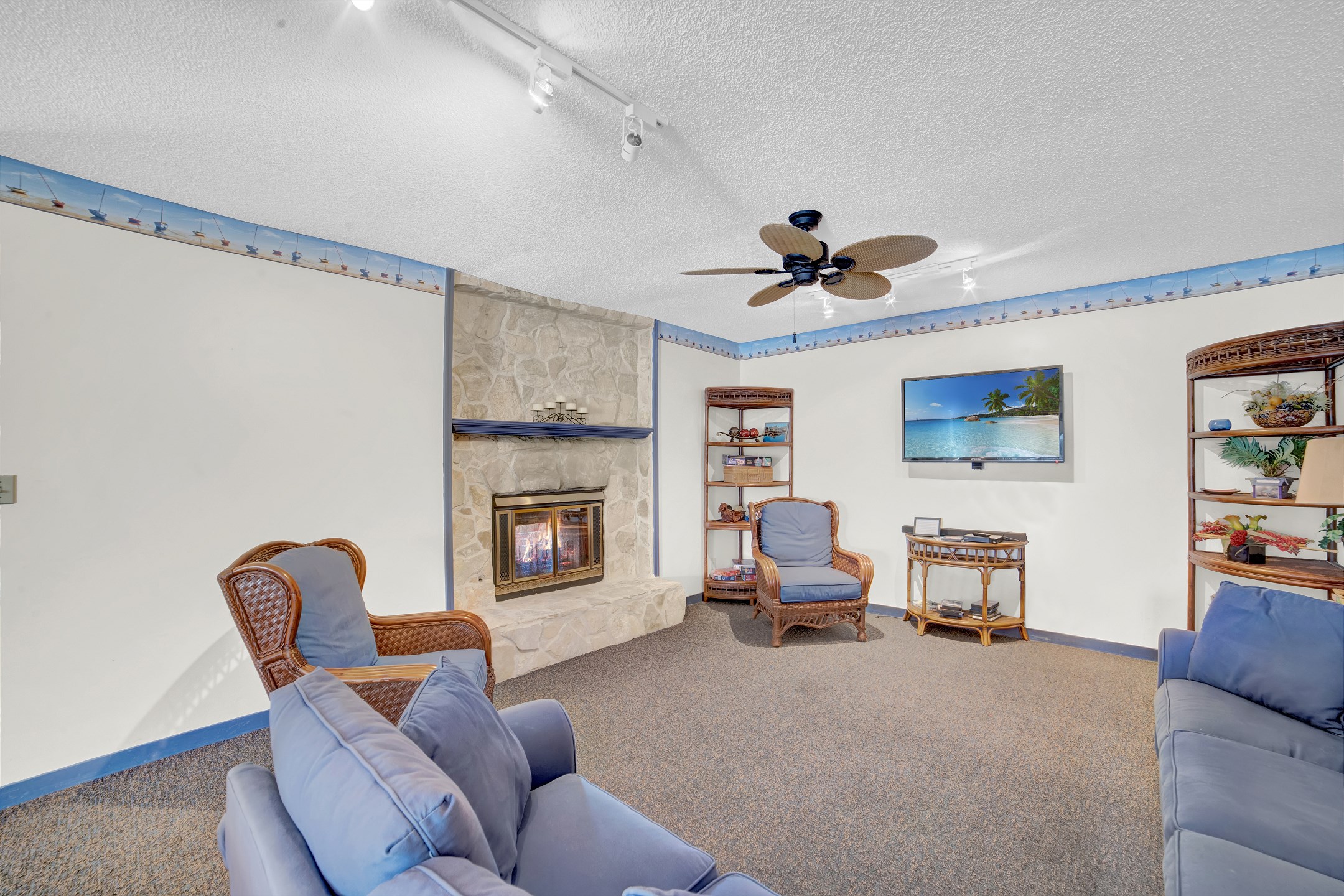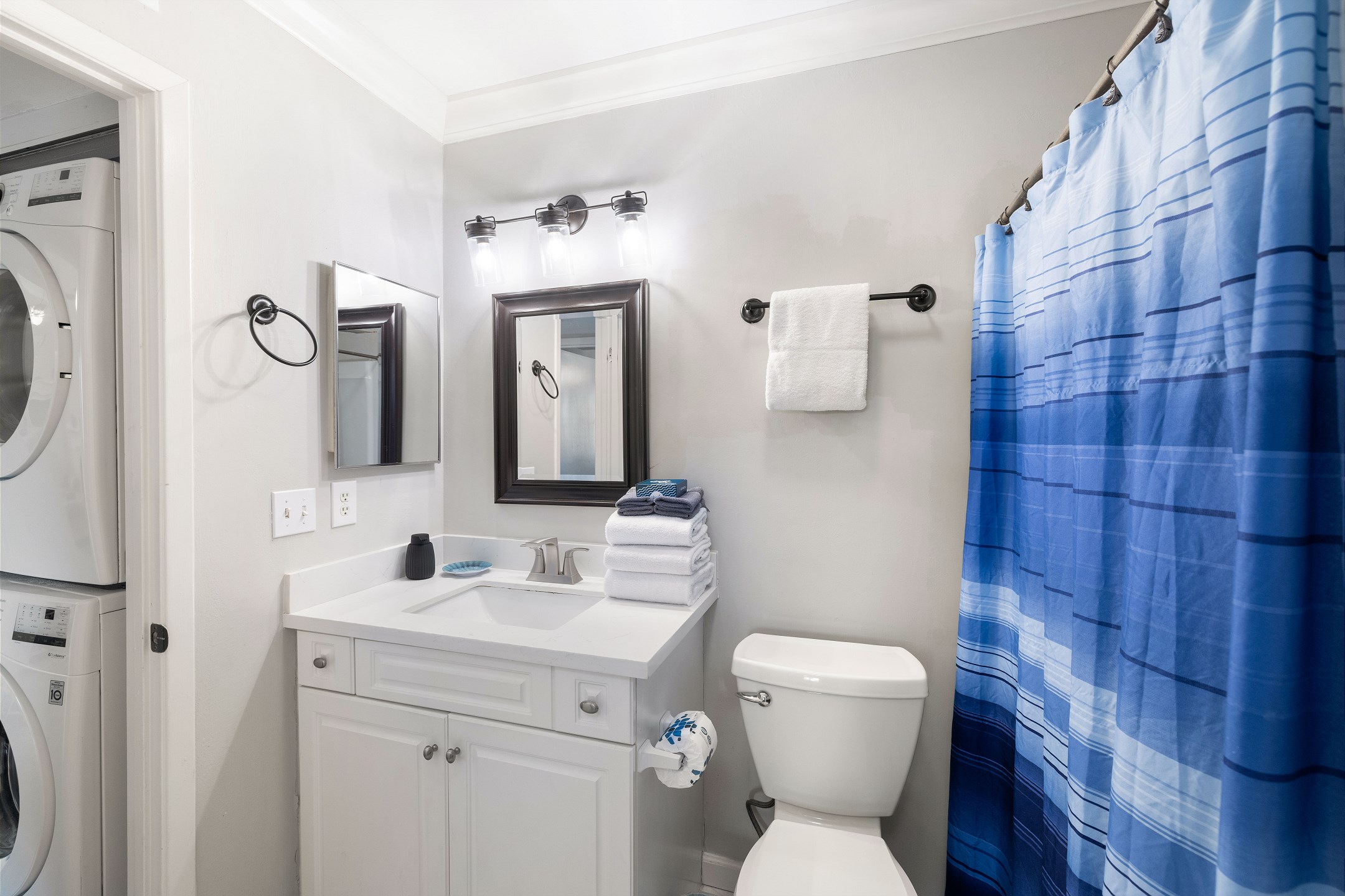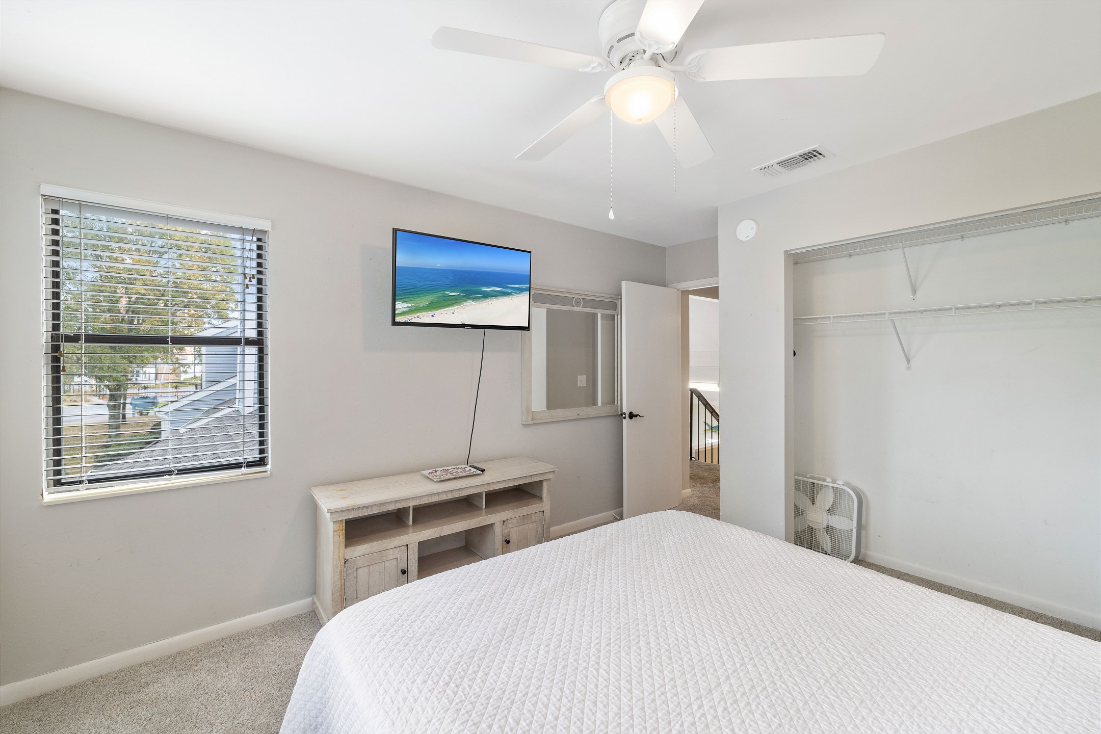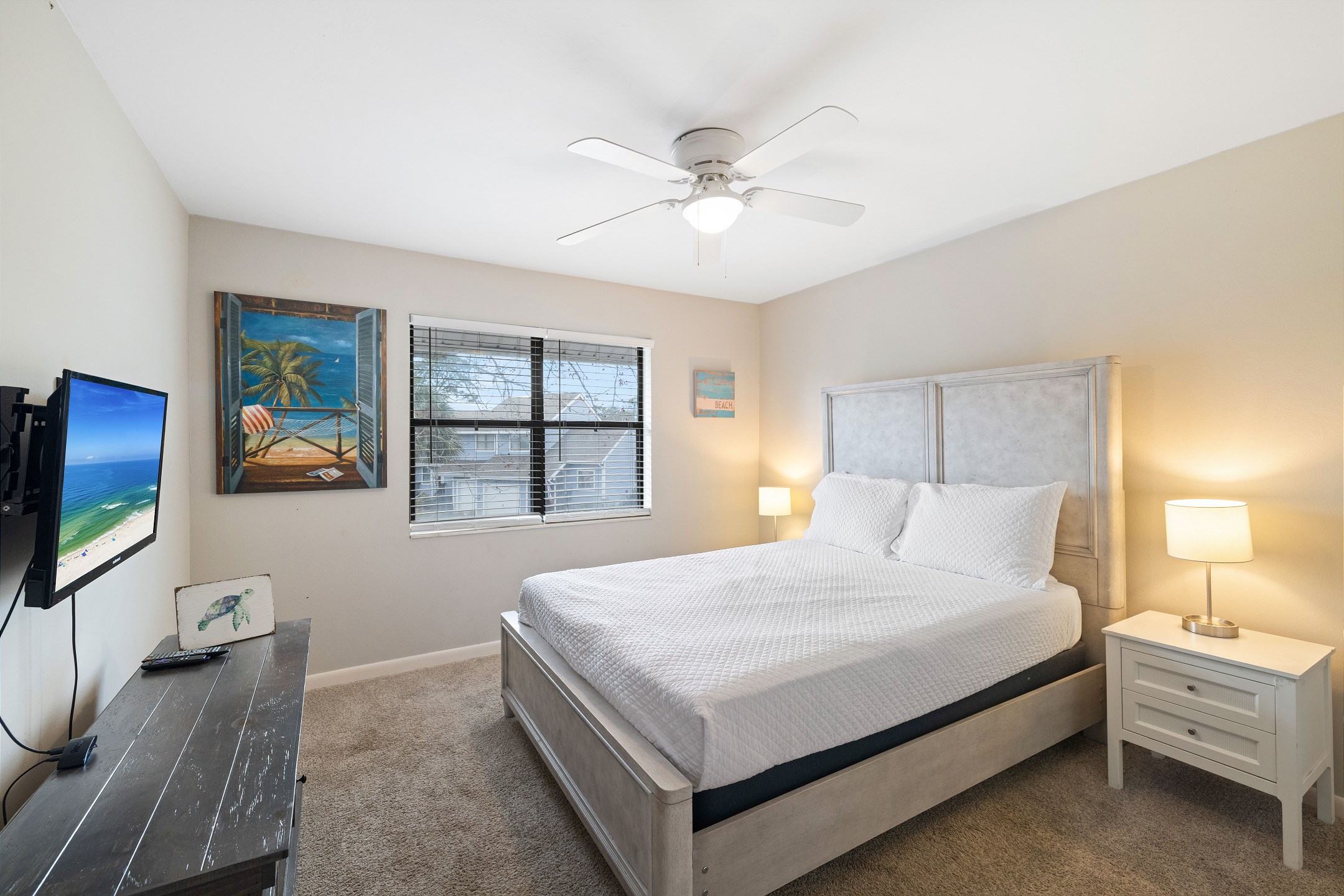 The primary bedroom is conveniently located downstairs and features a comfortable king sized bed, ensuite access to the bathroom with a tub and shower combo, and a private entrance to the back deck. Upstairs you will find two additional bedrooms, each offering a queen sized bed and its own flat screen TV. The second full bathroom, also with a tub and shower combo, is located on this level for easy access.