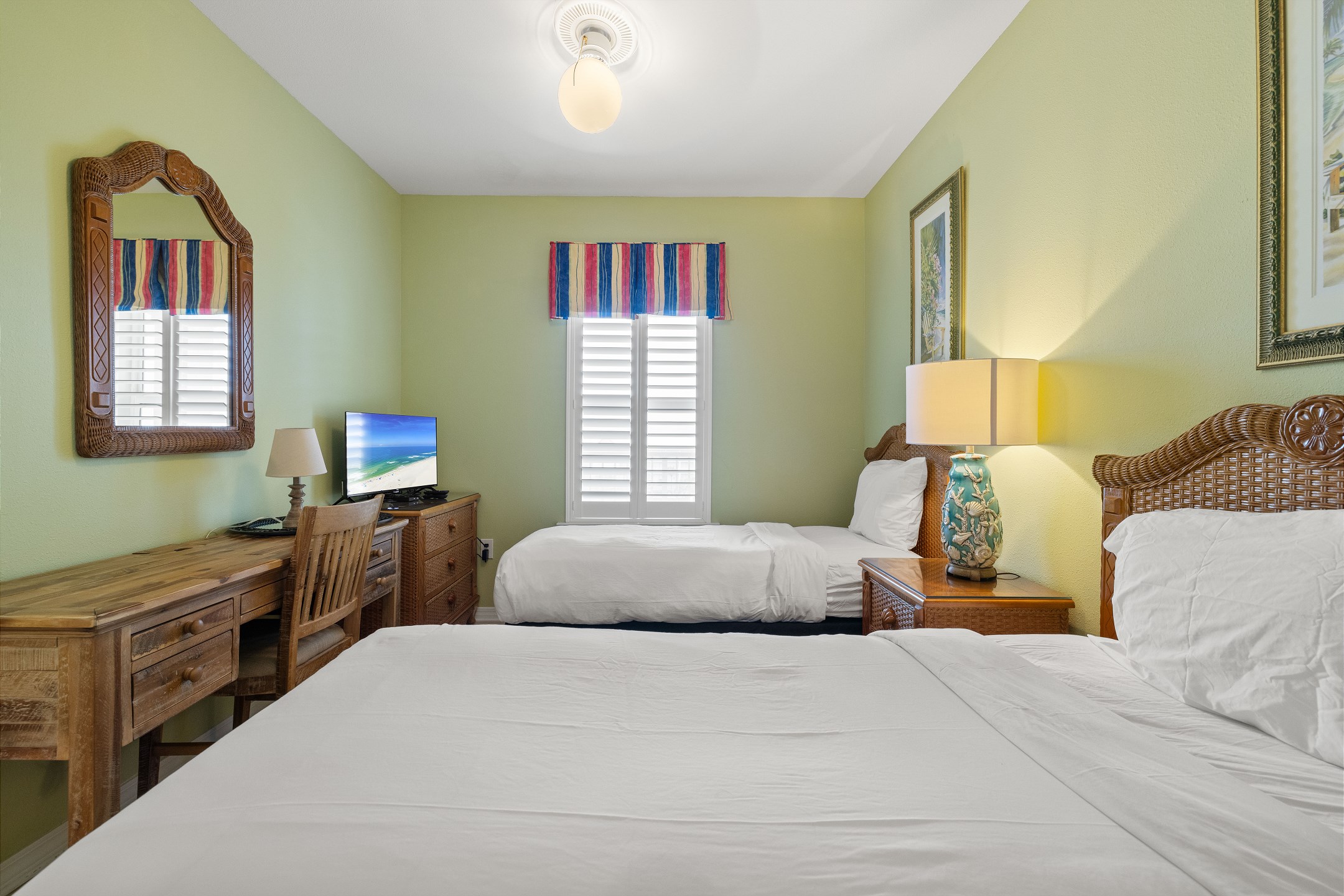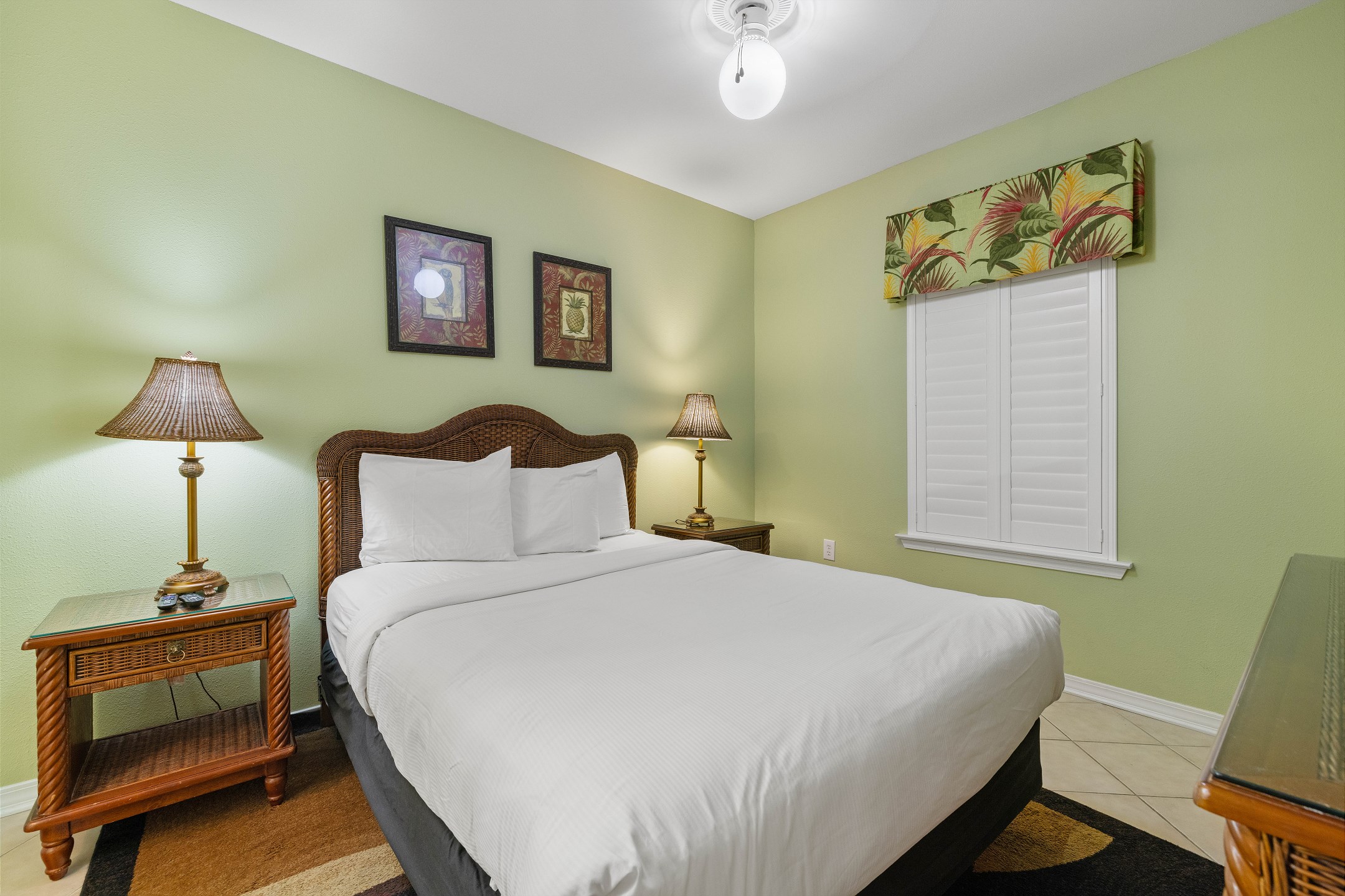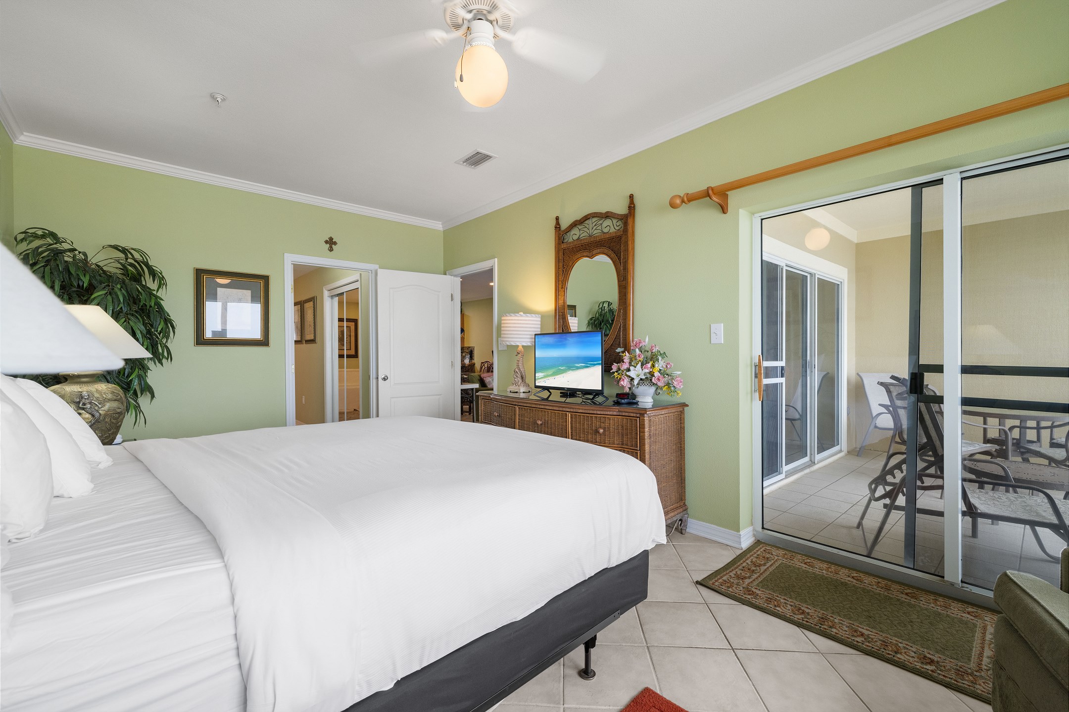 The generously sized bedrooms offer ample privacy, with a master bedroom featuring a king bed, a large walk-in shower, and a separate jacuzzi tub. The second bedroom offers a queen bed, while the third bedroom includes two twin beds.
