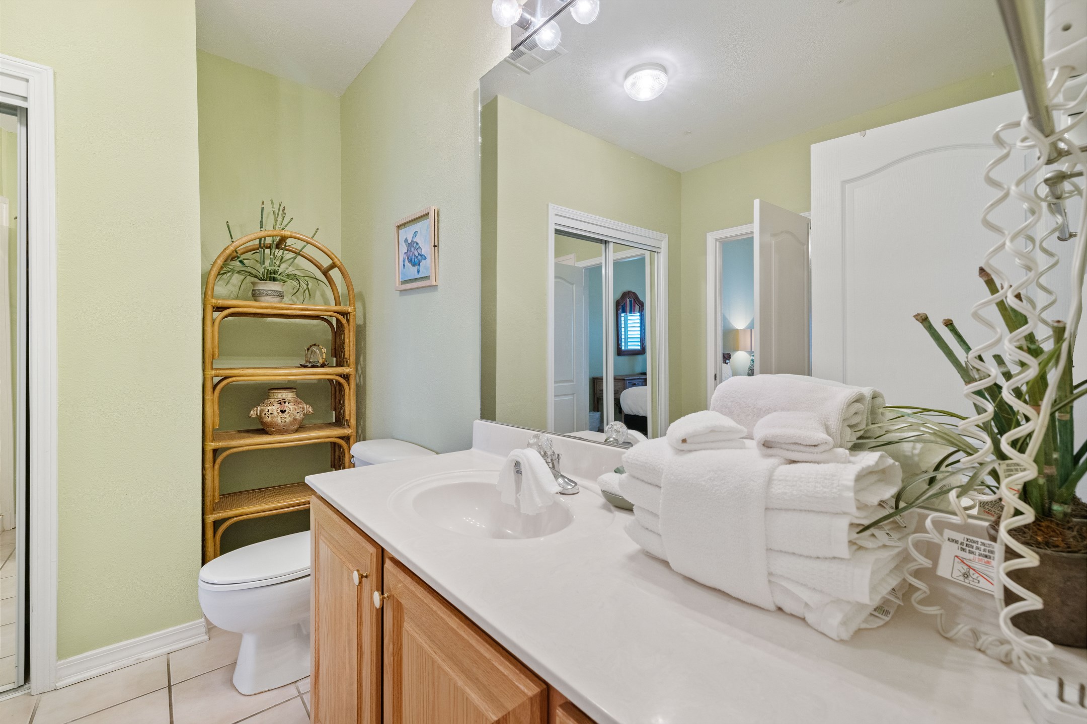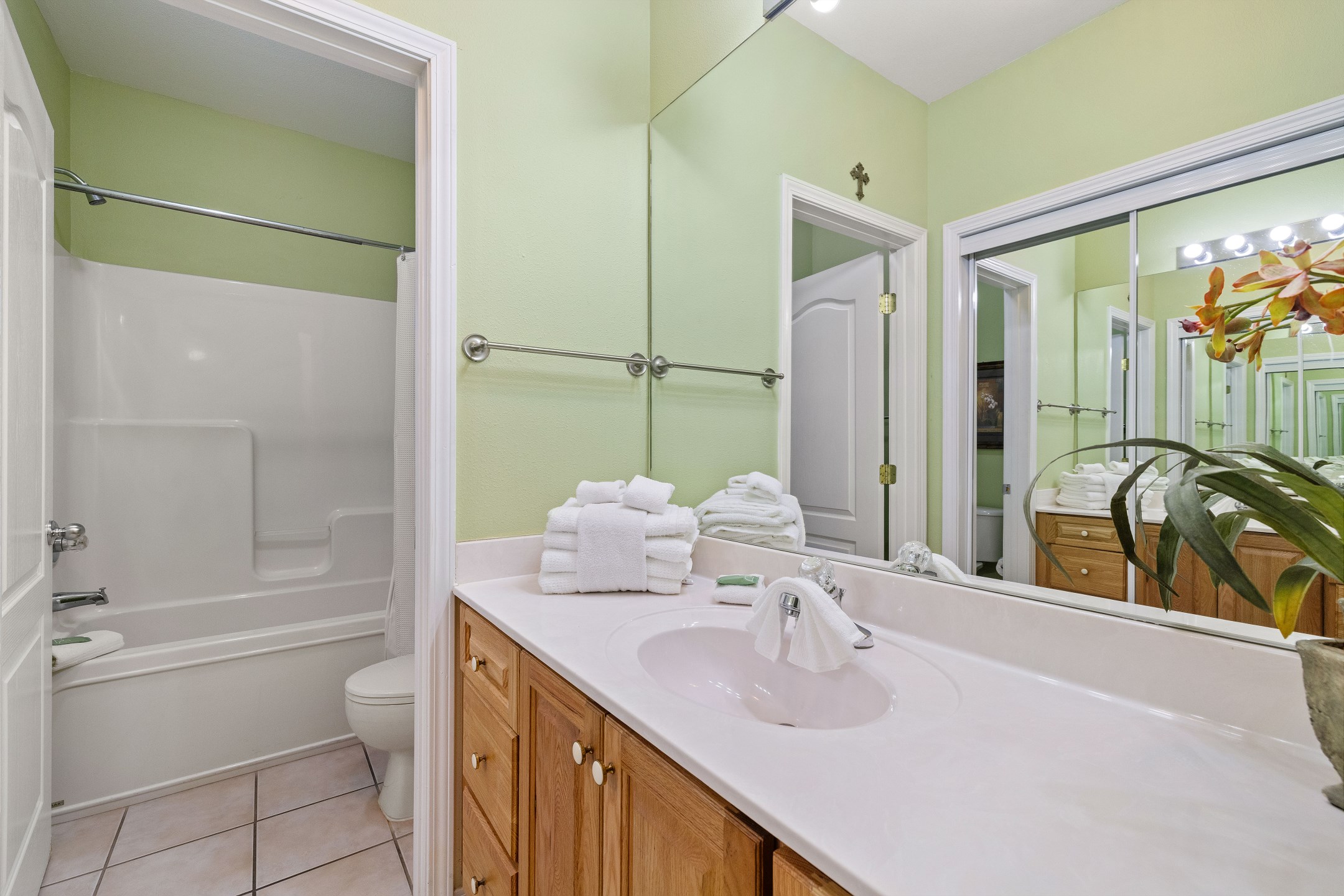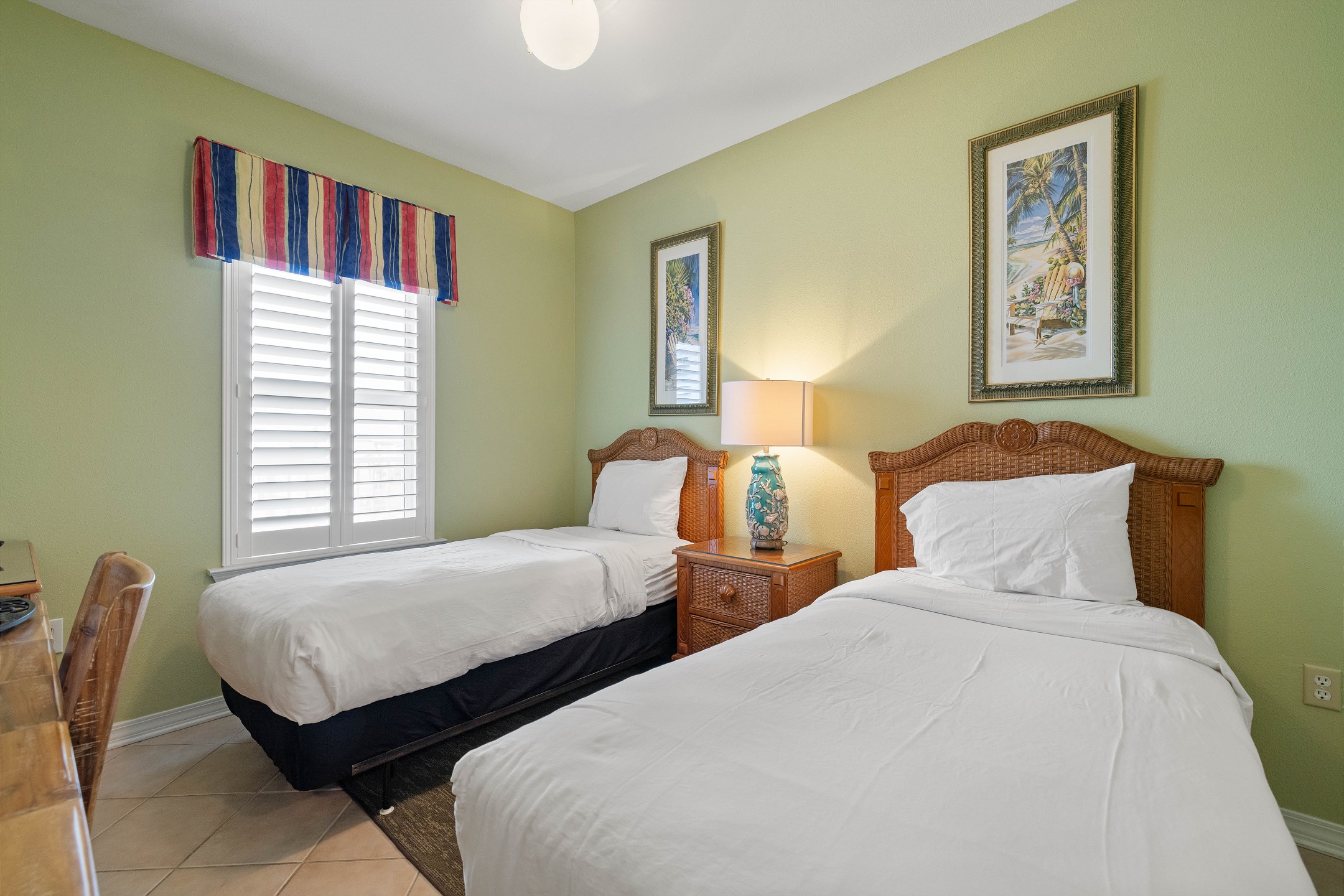 The generously sized bedrooms offer ample privacy, with a master bedroom featuring a king bed, a large walk-in shower, and a separate jacuzzi tub. The second bedroom offers a queen bed, while the third bedroom includes two twin beds.