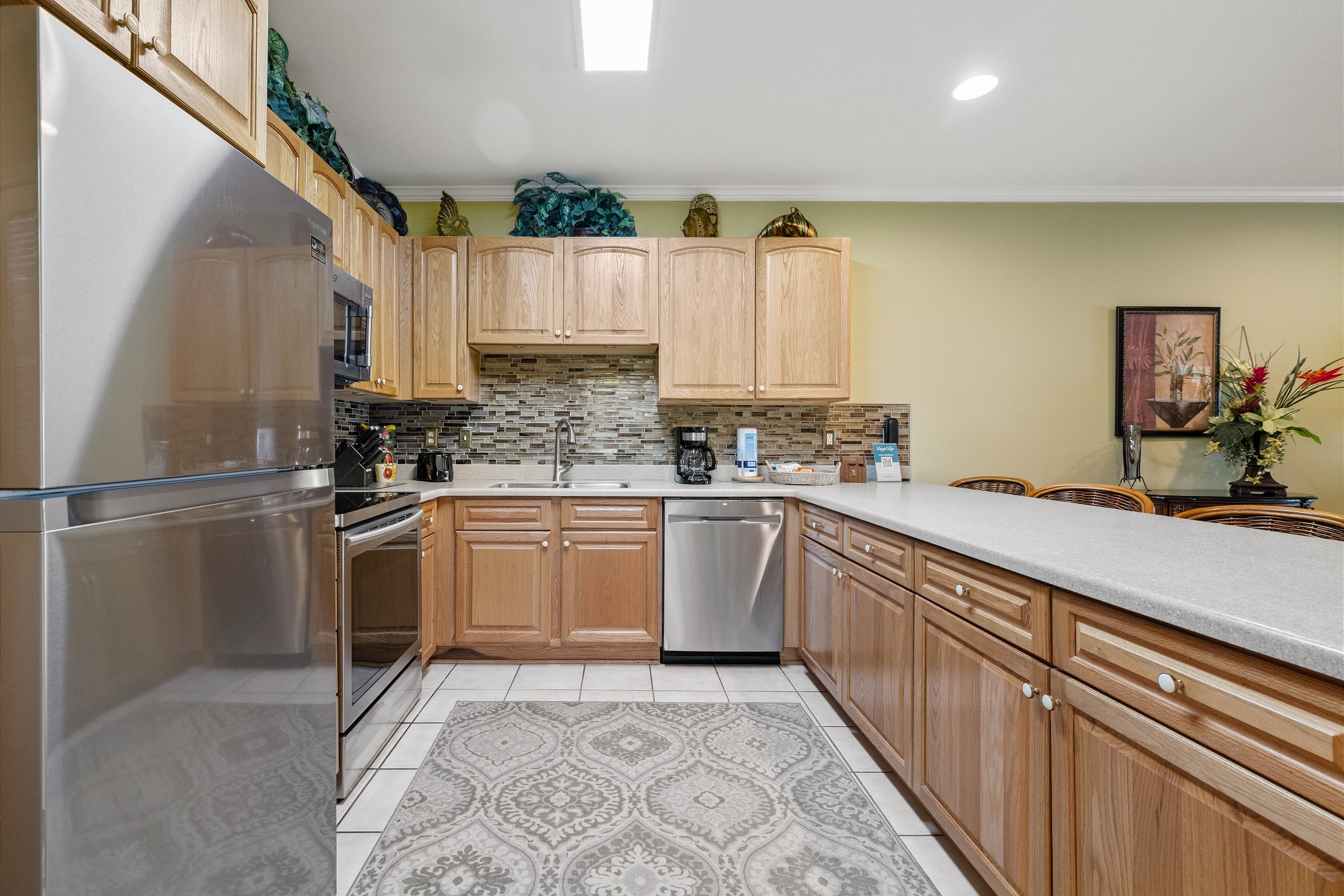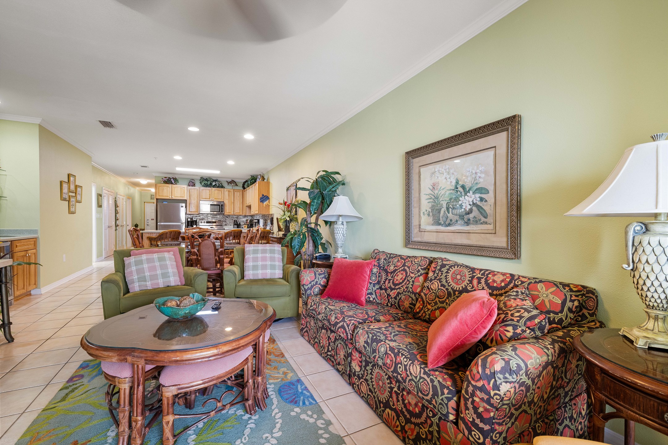 The fully equipped kitchen includes everything you need to prepare home-cooked meals, complete with granite countertops, stainless steel appliances, and a cozy dining area. The open-concept layout flows effortlessly into the living area, where you'll find a flat-screen TV and ample seating for your group.