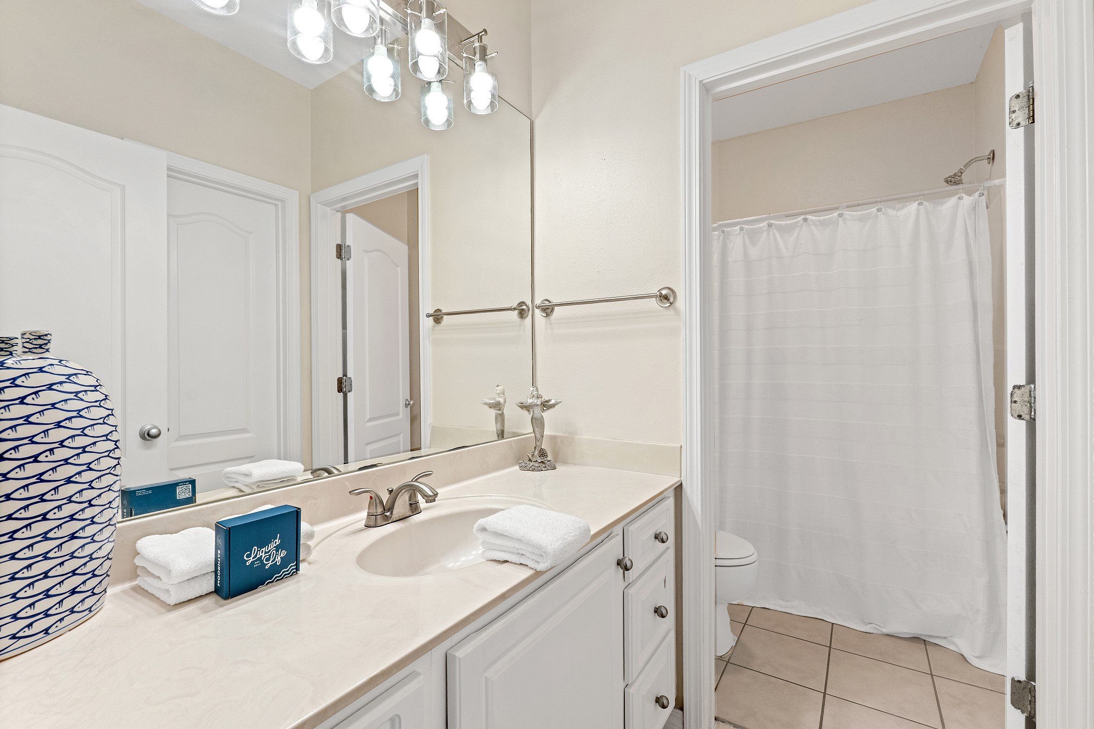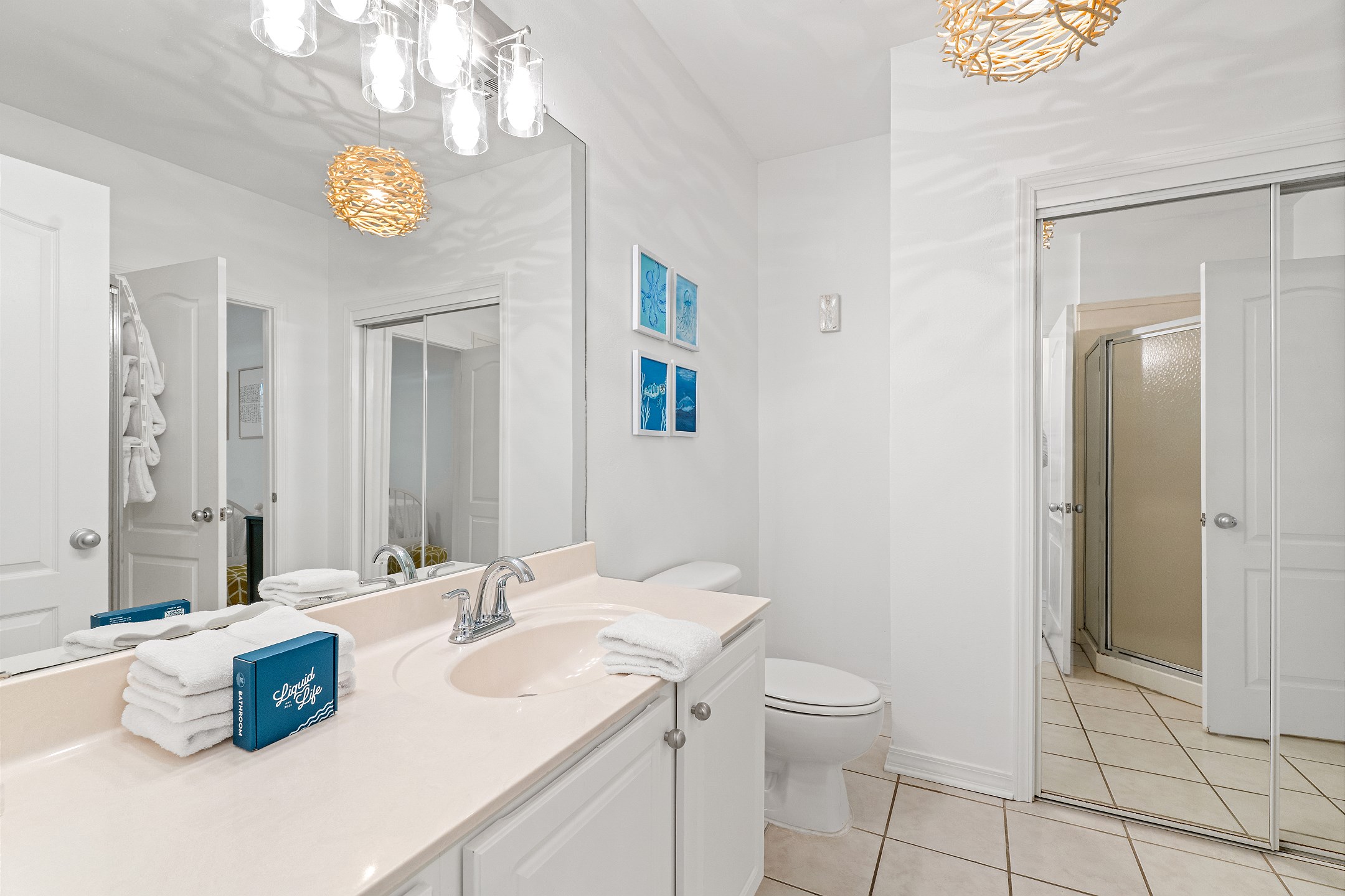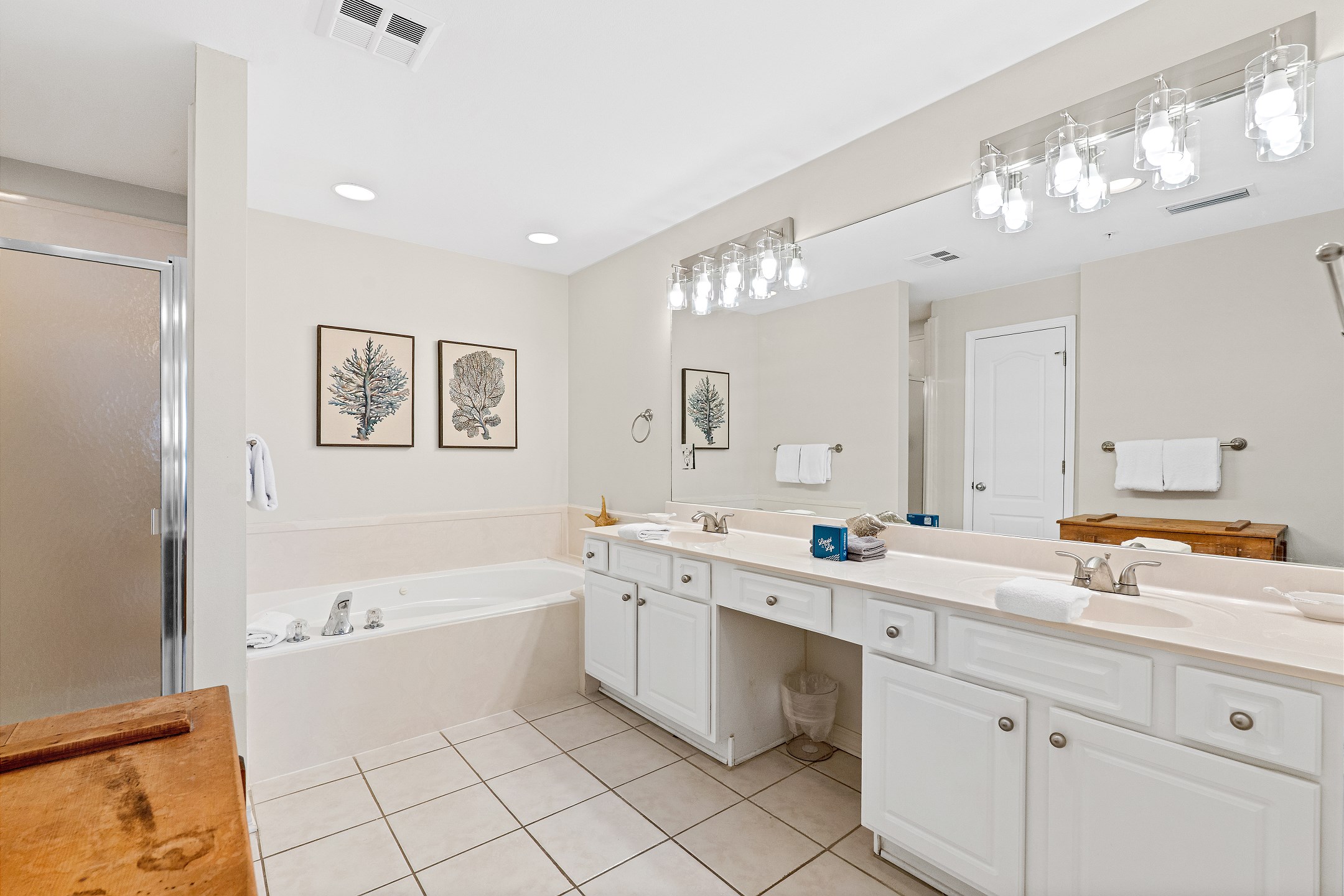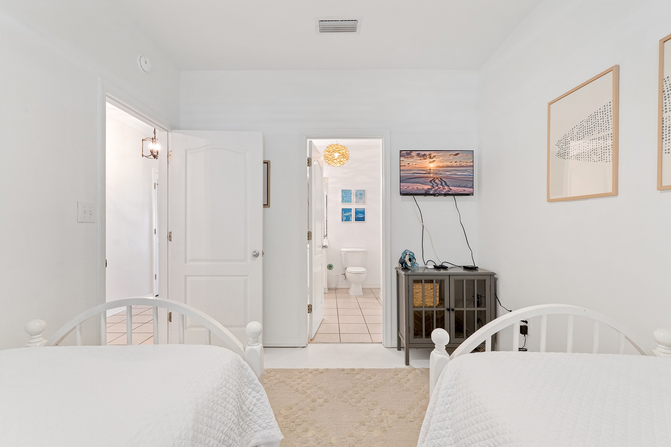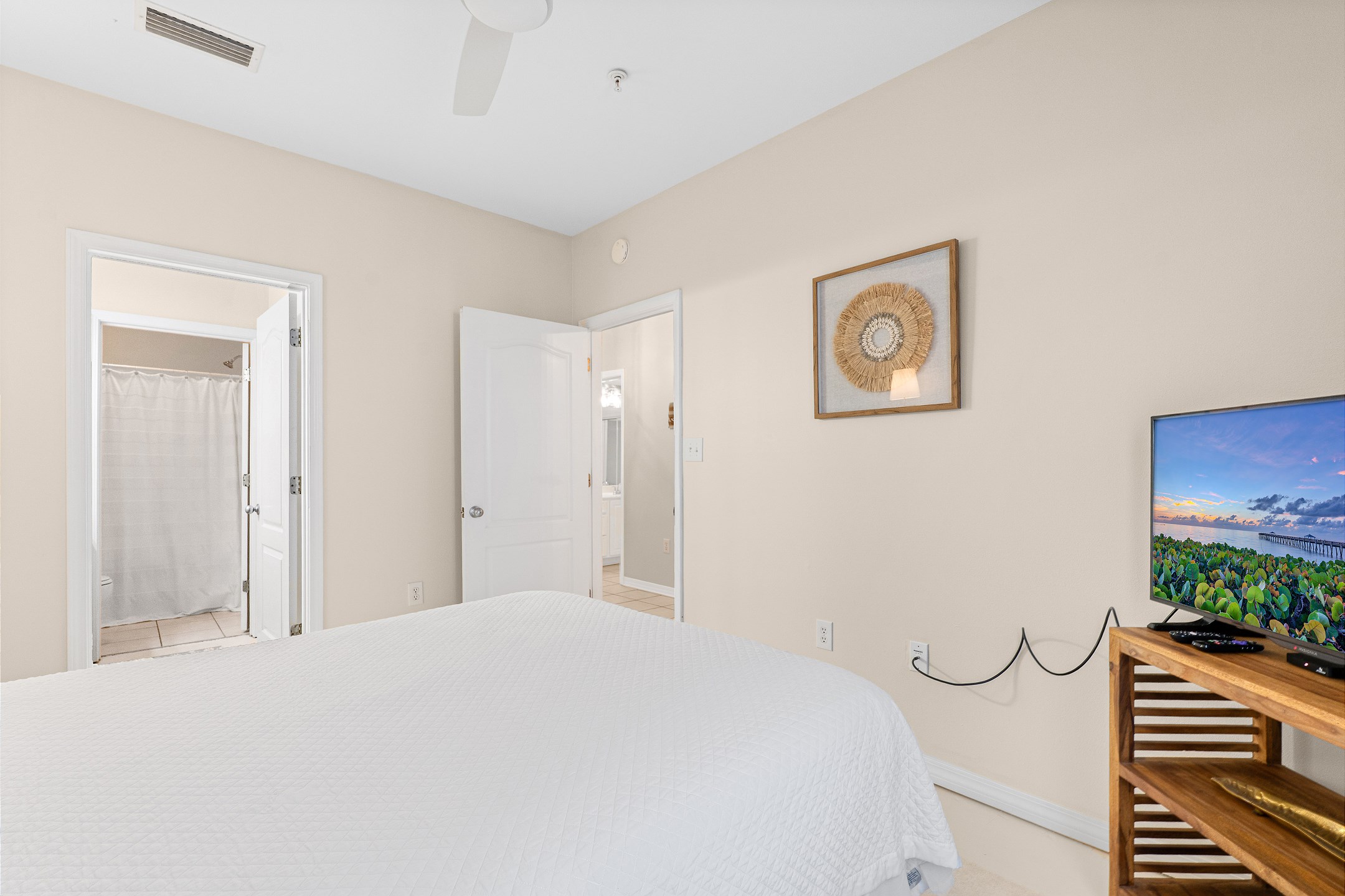 The primary bedroom features a king bed and a spacious ensuite bathroom with a dual sink vanity, a walk in shower, and a soaking bathtub. The second bedroom offers a cozy queen bed and flat screen tv, while the third bedroom includes two twin beds, making it ideal for family or guests. A full size washer and dryer are also included in the unit for added convenience.