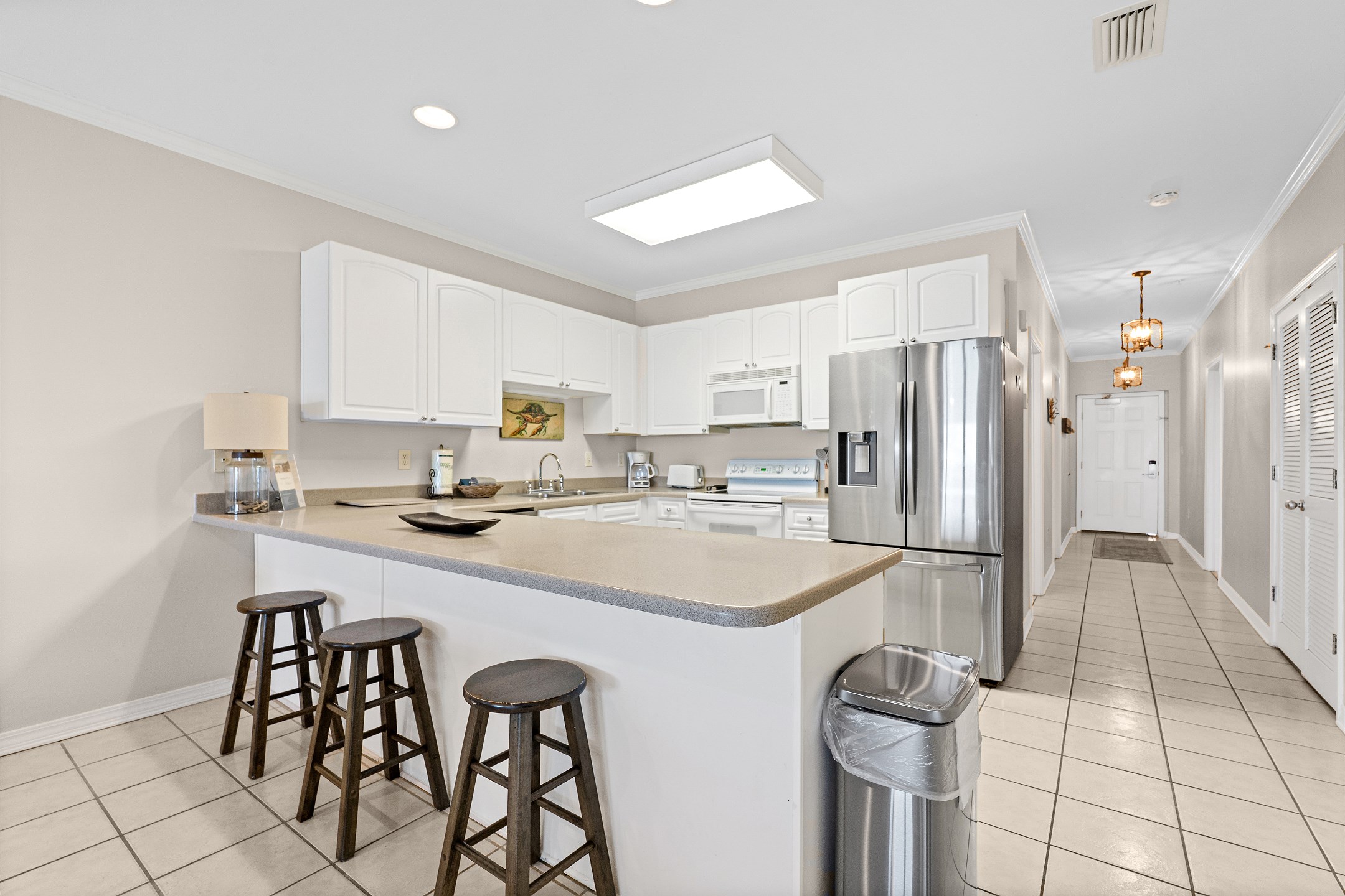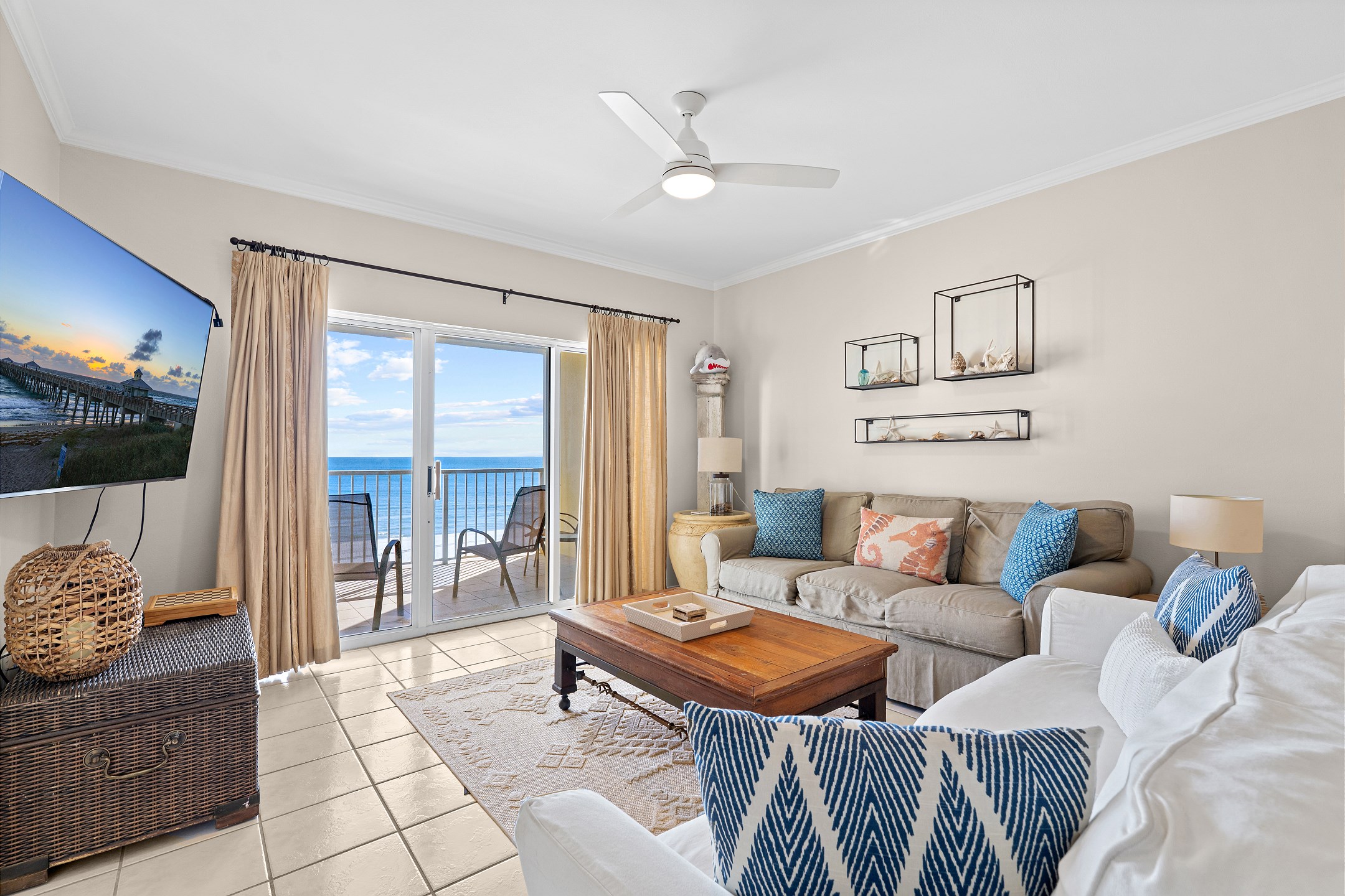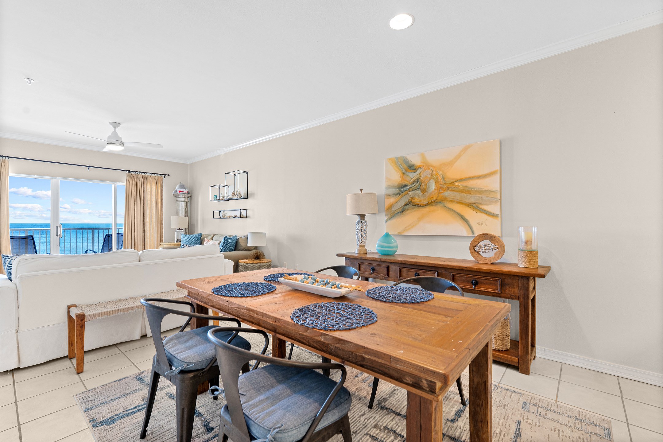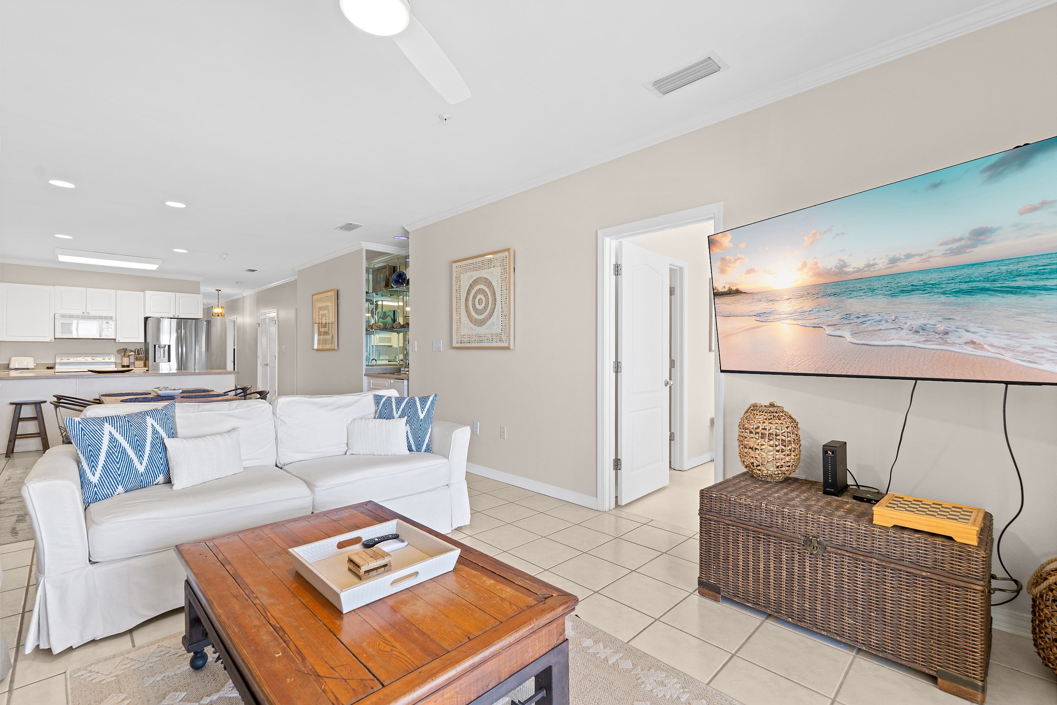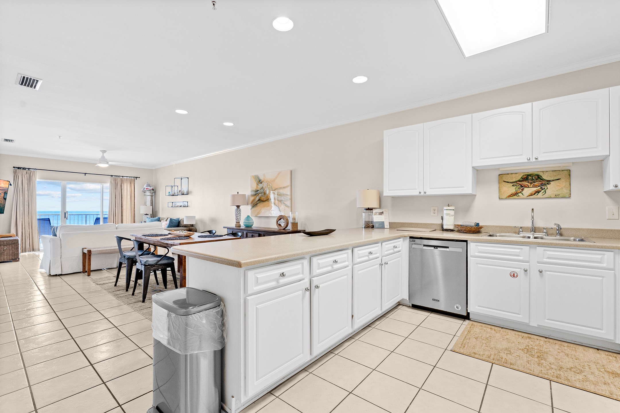 The living room is filled with natural light and provides direct access to a private balcony overlooking the Gulf, creating the perfect space to relax and enjoy the coastal scenery. The fully equipped kitchen includes everything you need for your stay, along with a wet bar and a dining table for easy meals and gatherings.