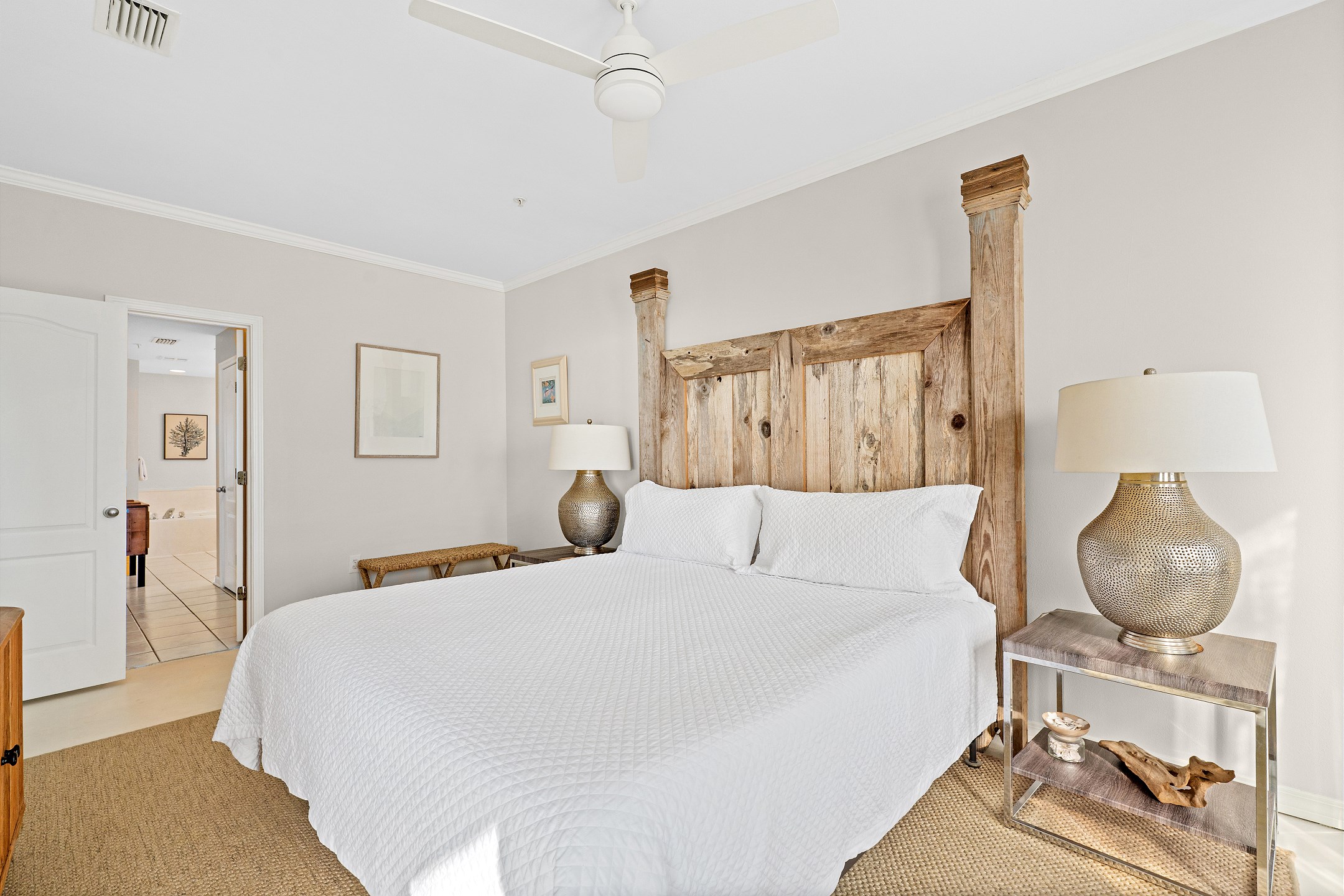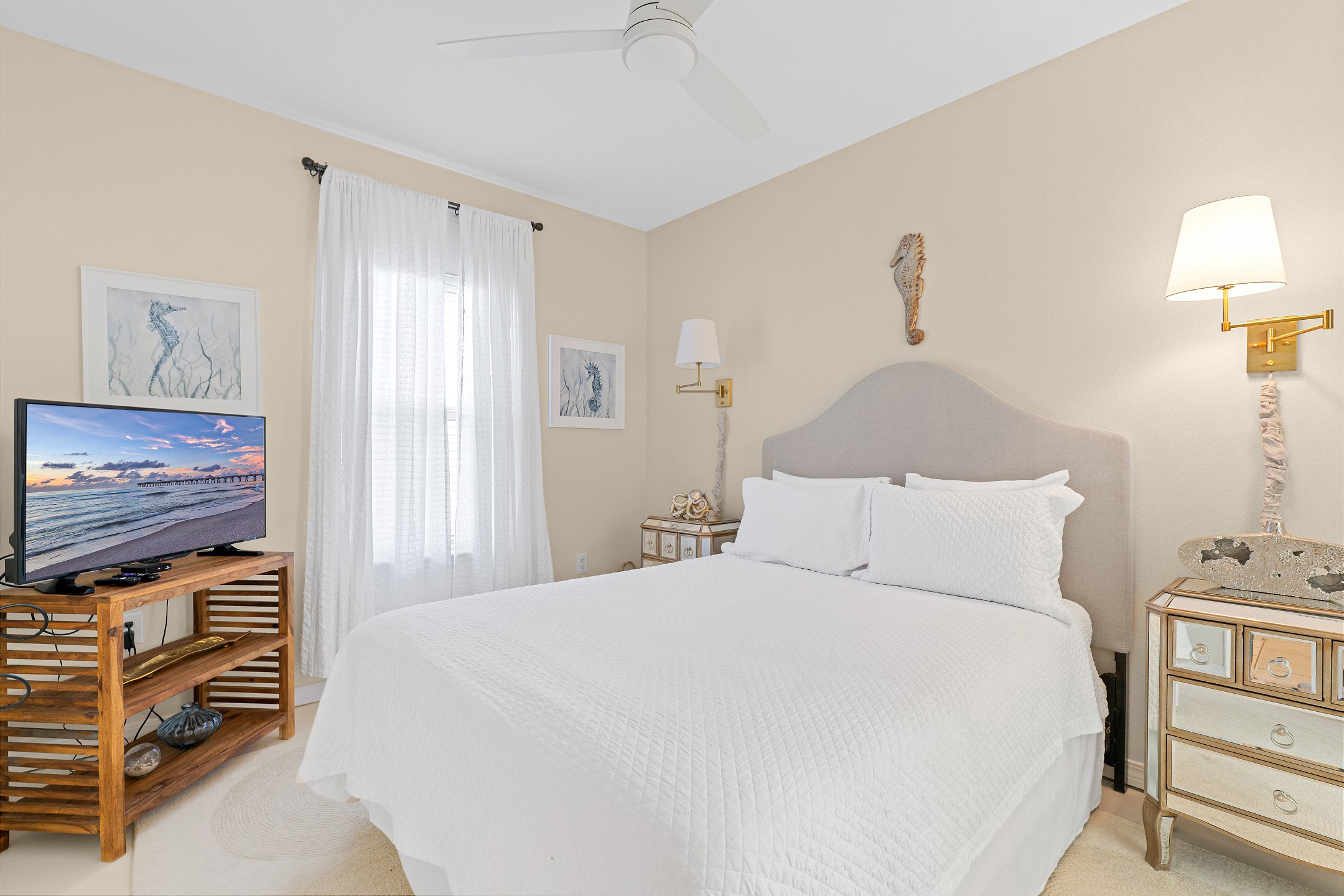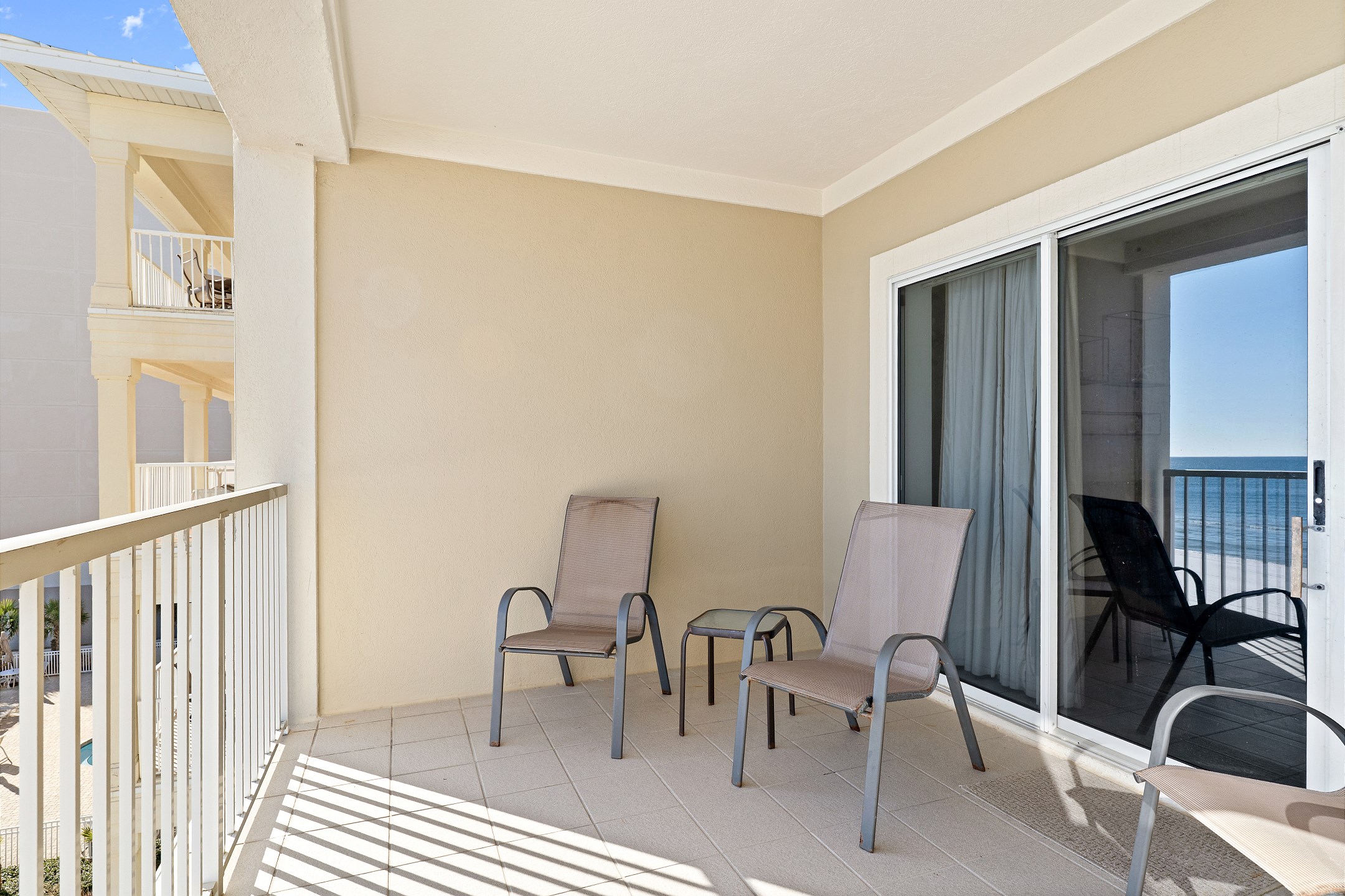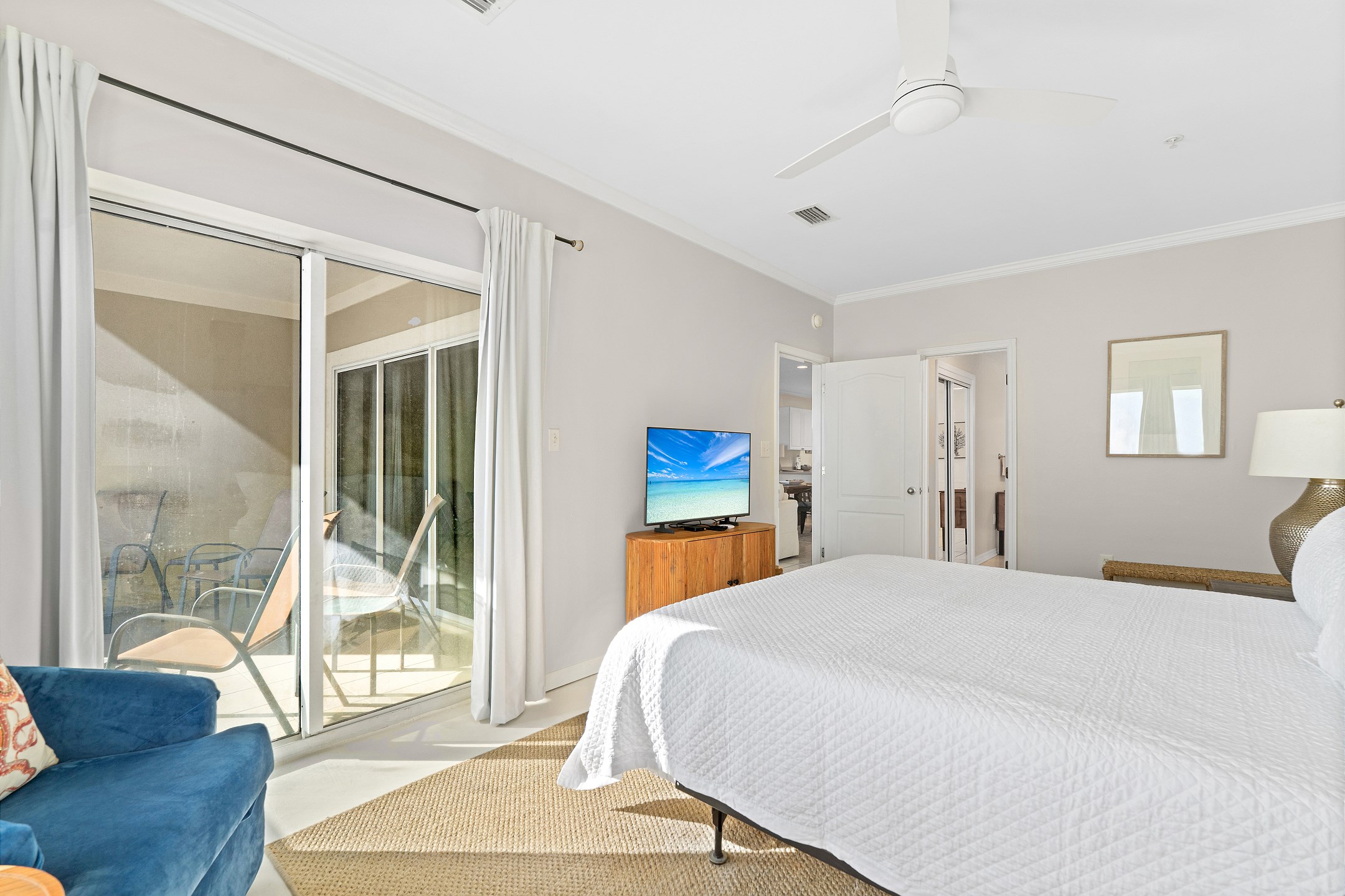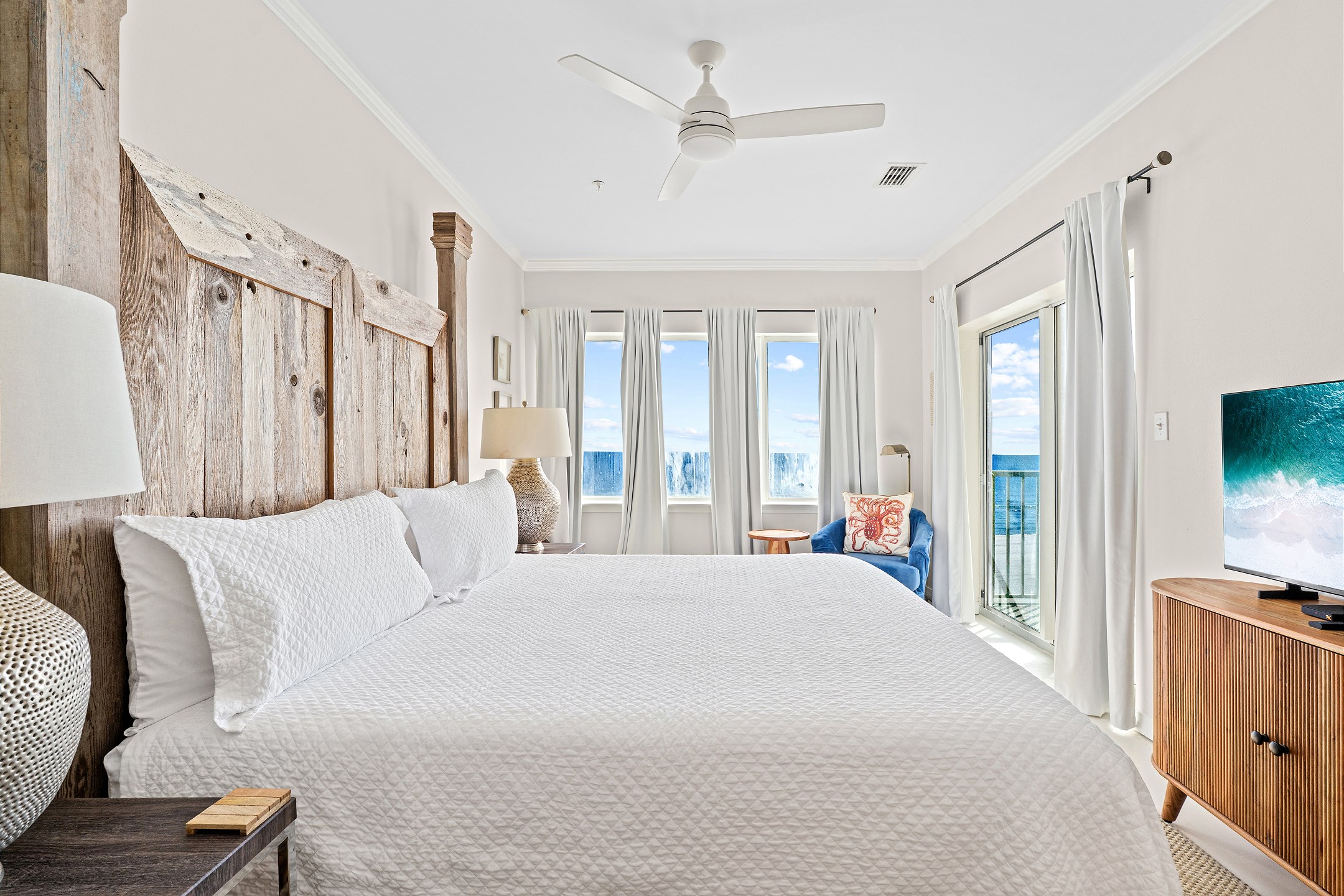 The living room is filled with natural light and provides direct access to a private balcony overlooking the Gulf, creating the perfect space to relax and enjoy the coastal scenery. The fully equipped kitchen includes everything you need for your stay, along with a wet bar and a dining table for easy meals and gatherings.