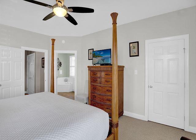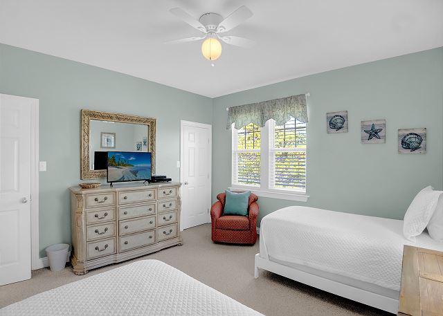 The primary suite offers a king-sized bed, an ensuite bathroom with a double vanity, walk-in shower, soaking tub, and a spacious closet. The second bedroom features a queen bed and a private ensuite bathroom with a walk-in shower, while the third bedroom includes two twin beds—great for kids or extra guests. A loft area provides even more sleeping accommodations with a twin bed and a sofa sleeper, ensuring everyone has a comfortable place to rest.