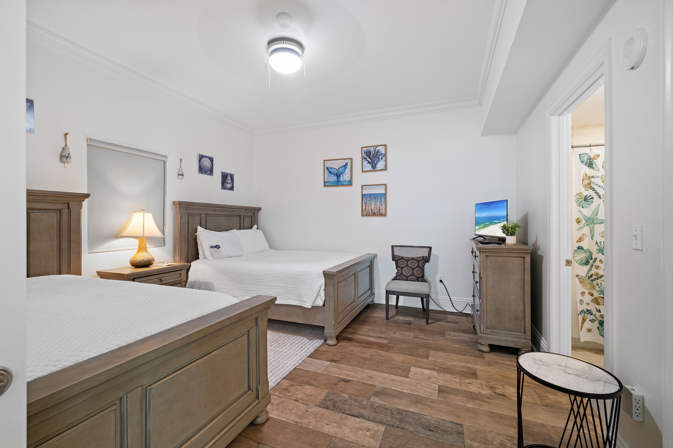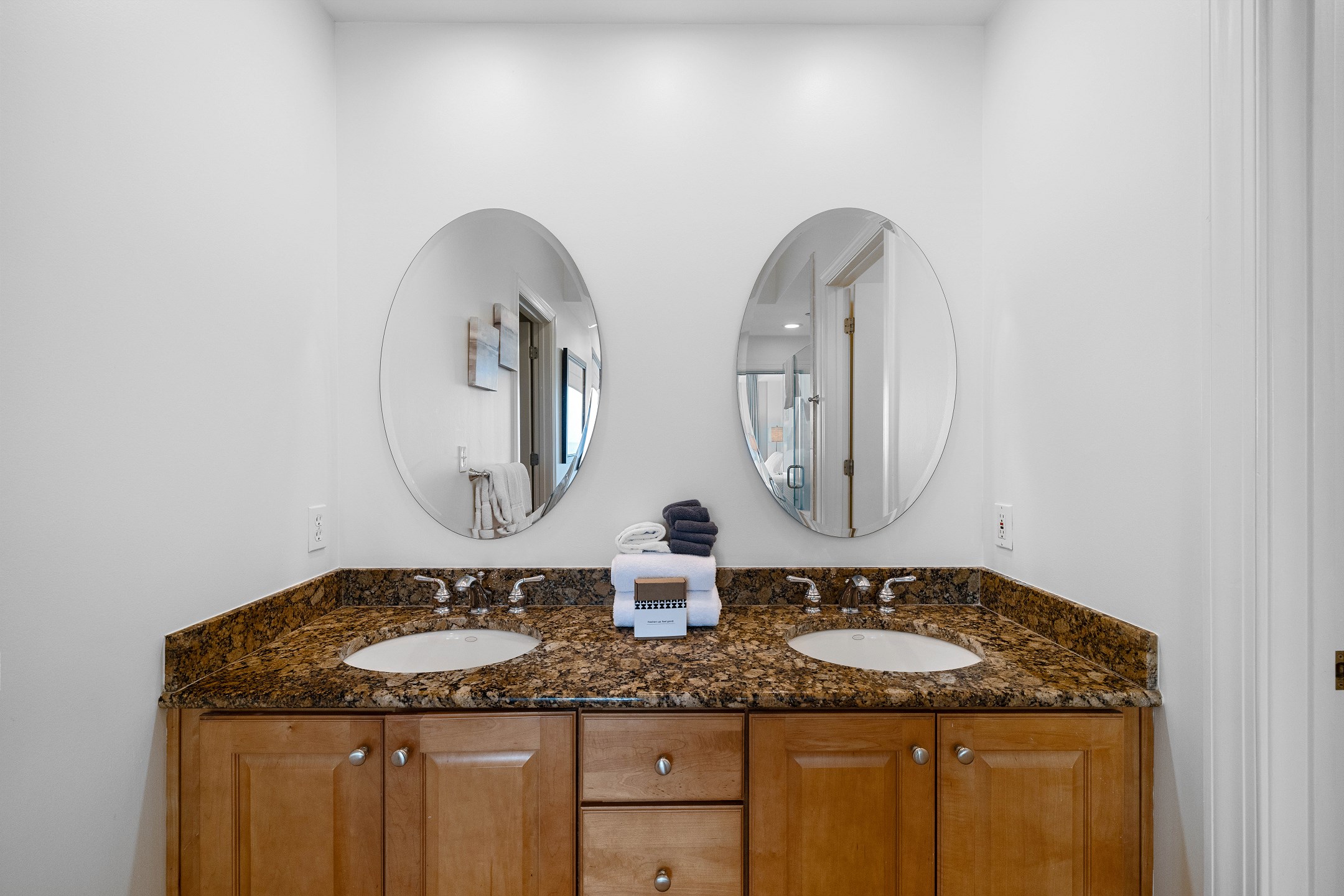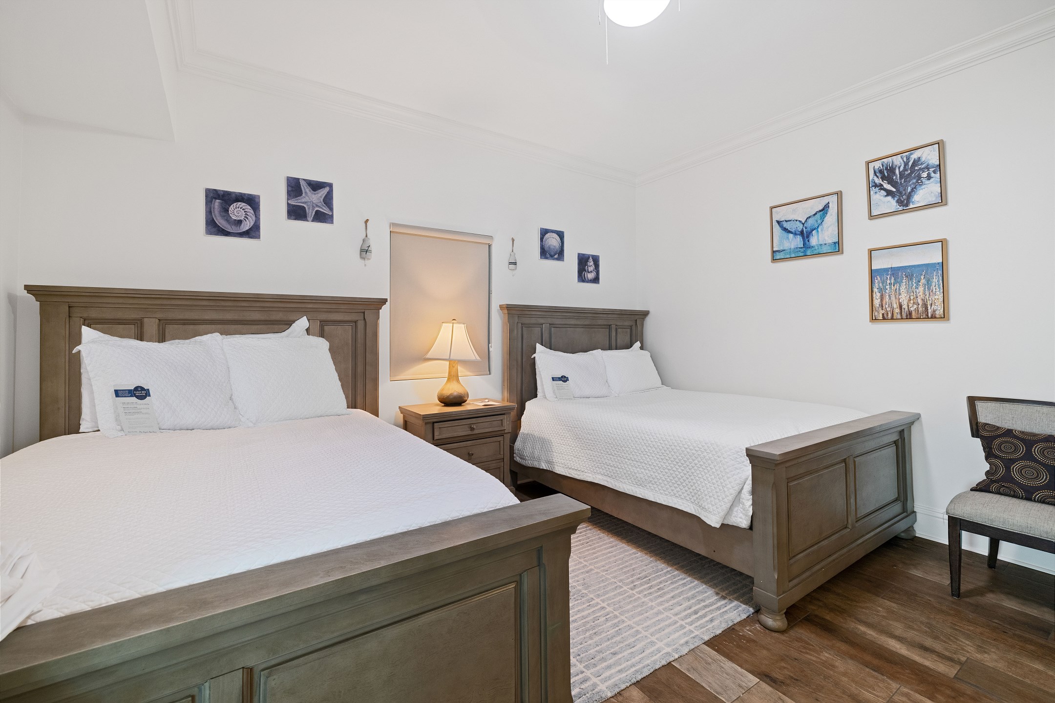 The primary suite offers a king bed and an ensuite bathroom designed for ultimate relaxation, featuring a whirlpool tub set in stone, a walk-in shower, dual vanity, and a spacious walk-in closet. The second bedroom has two queen beds, while the third and fourth bedrooms each offer a king bed. Every bedroom enjoys its own private bathroom, with an additional half bath conveniently located off the entryway. The living room also includes a sofa sleeper for extra accommodations.