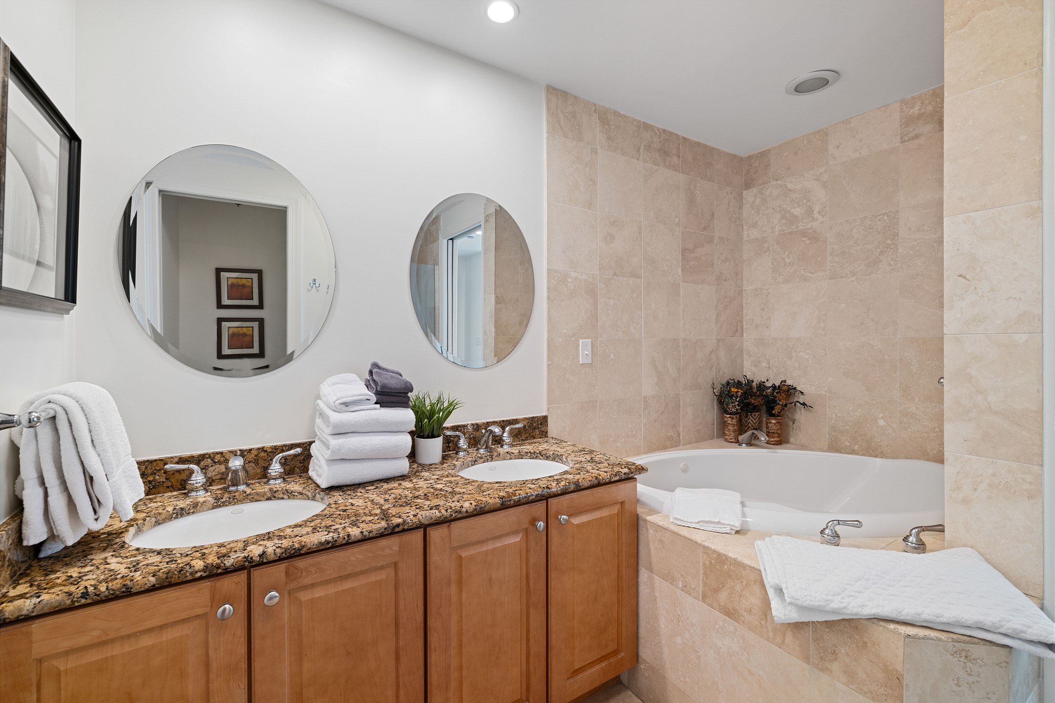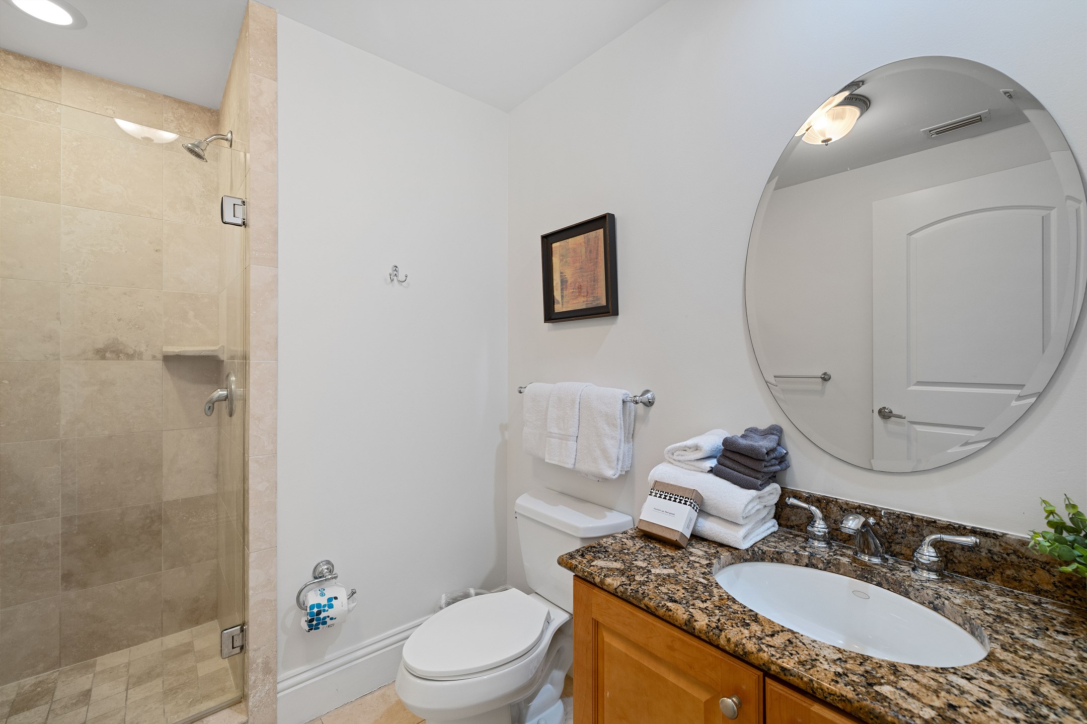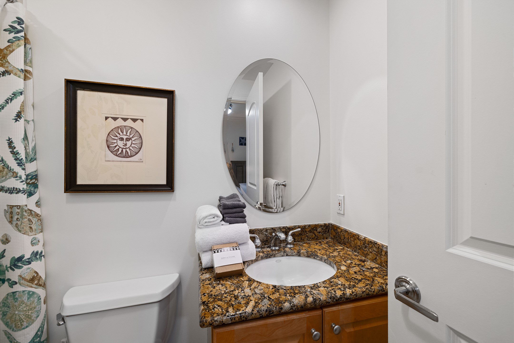 The primary suite offers a king bed and an ensuite bathroom designed for ultimate relaxation, featuring a whirlpool tub set in stone, a walk-in shower, dual vanity, and a spacious walk-in closet. The second bedroom has two queen beds, while the third and fourth bedrooms each offer a king bed. Every bedroom enjoys its own private bathroom, with an additional half bath conveniently located off the entryway. The living room also includes a sofa sleeper for extra accommodations.