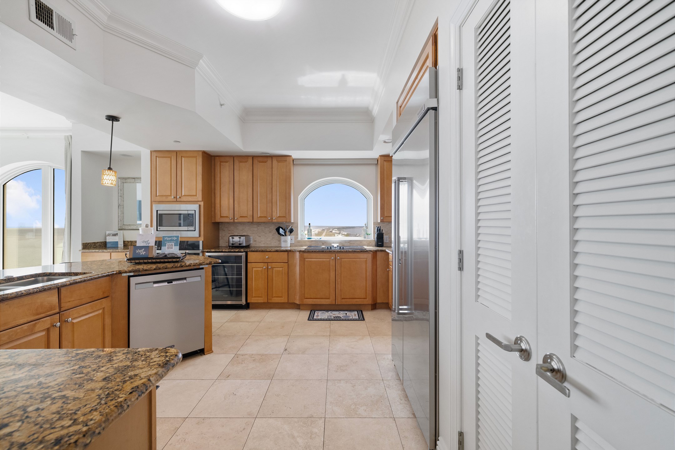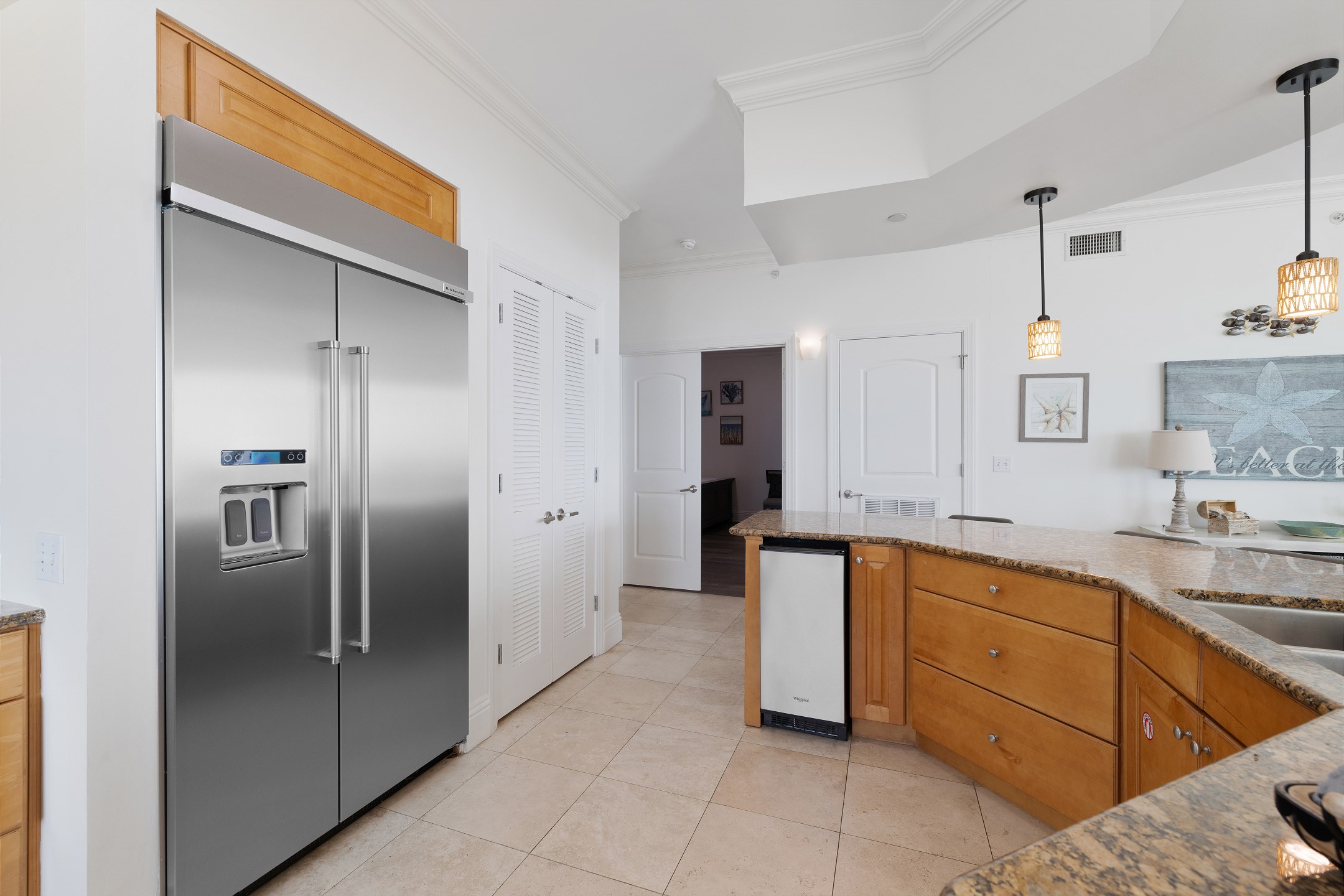 This exquisite retreat features tile floors throughout and expansive floor-to-ceiling windows, filling the space with natural light and stunning views. The spacious living area opens to a private balcony, perfect for enjoying panoramic sights of Gulf Shores. The gourmet kitchen boasts granite countertops, top-of-the-line stainless steel appliances, a beverage cooler, and a dining table for shared meals.