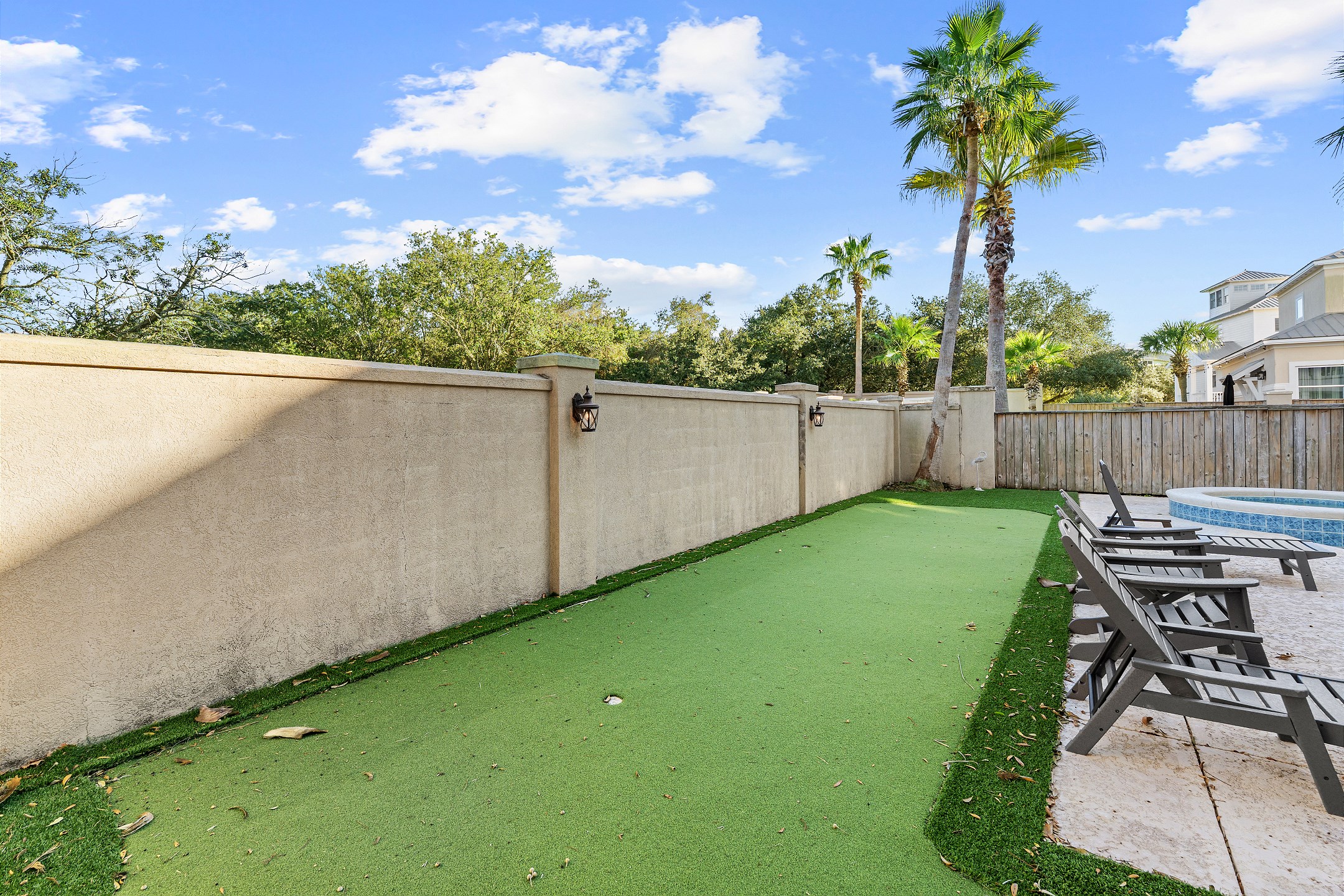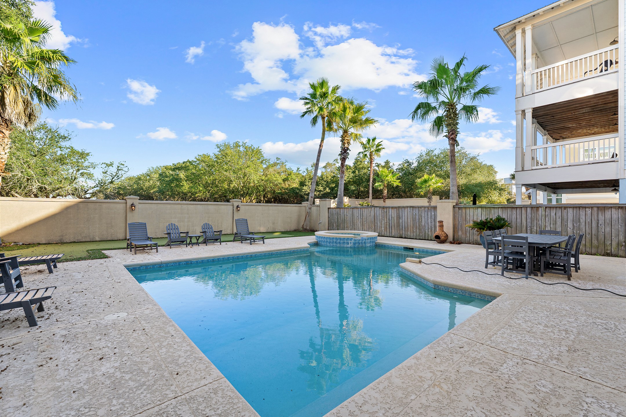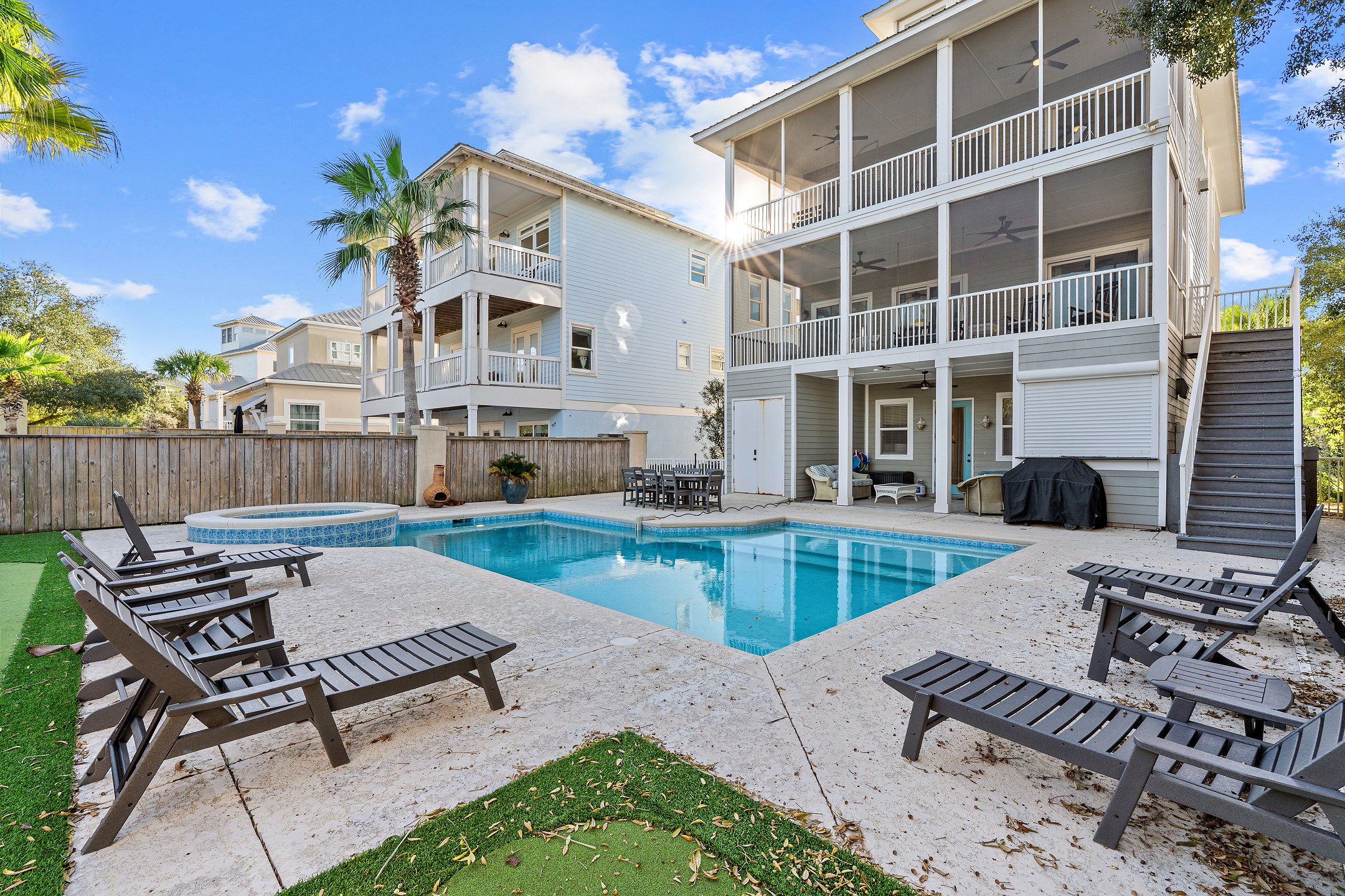 Step outside and unwind in your backyard oasis, complete with a private pool, relaxing hot tub, and your very own putting green. For added comfort, pool heating is available upon request for an additional $70. Both the balconies and patio offer plenty of seating, and the patio includes an outdoor kitchen with a grilling area, making it perfect for outdoor dining and entertaining. Additional conveniences include an interior elevator and an electric car charging port.