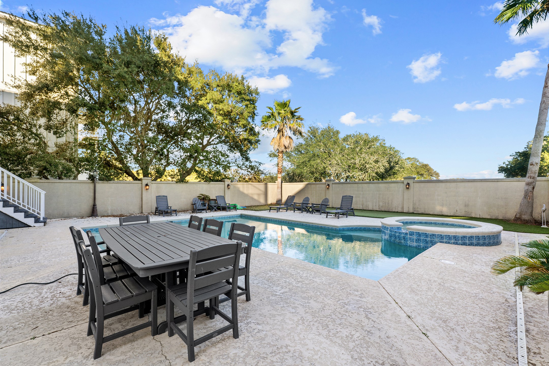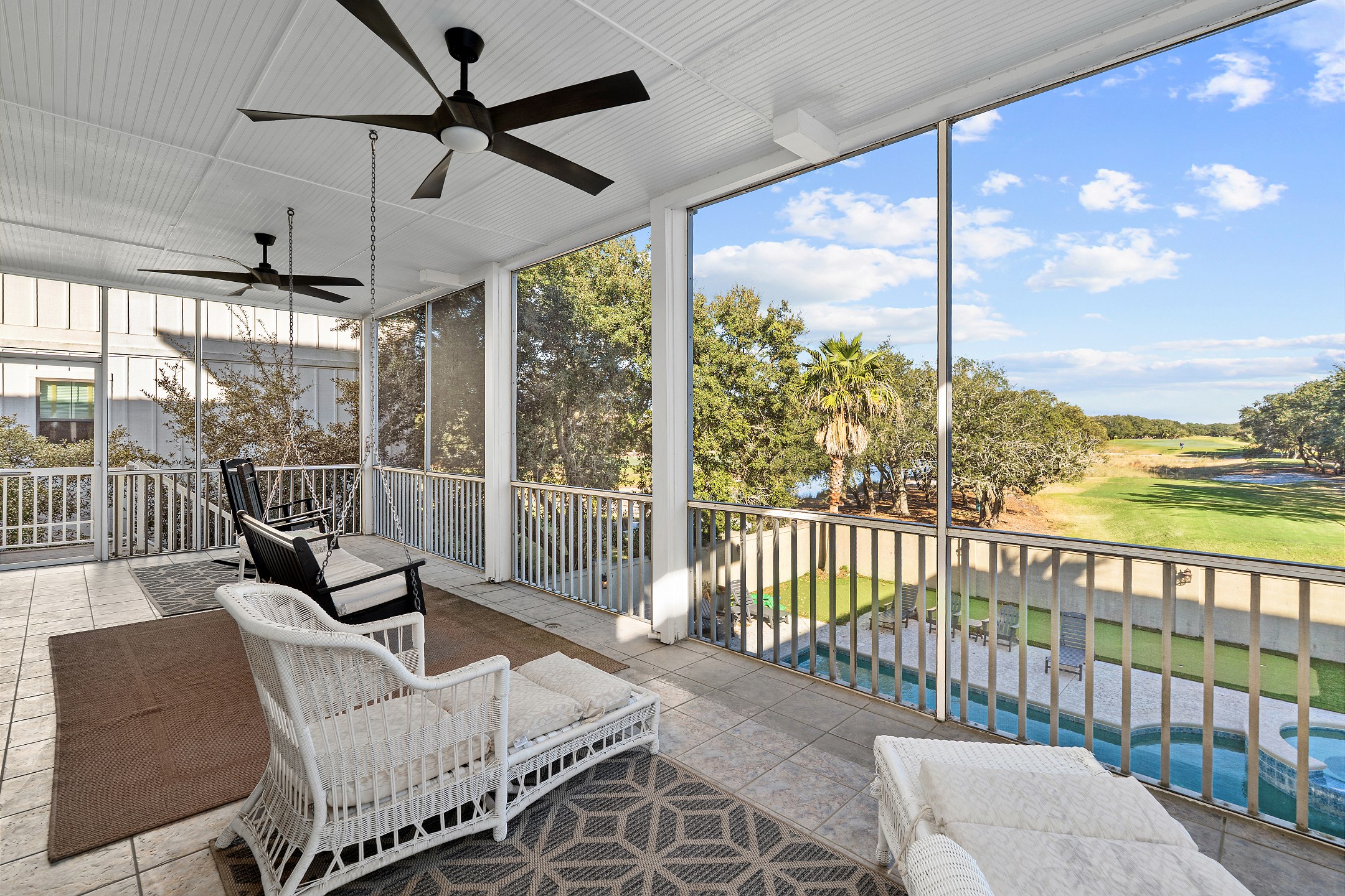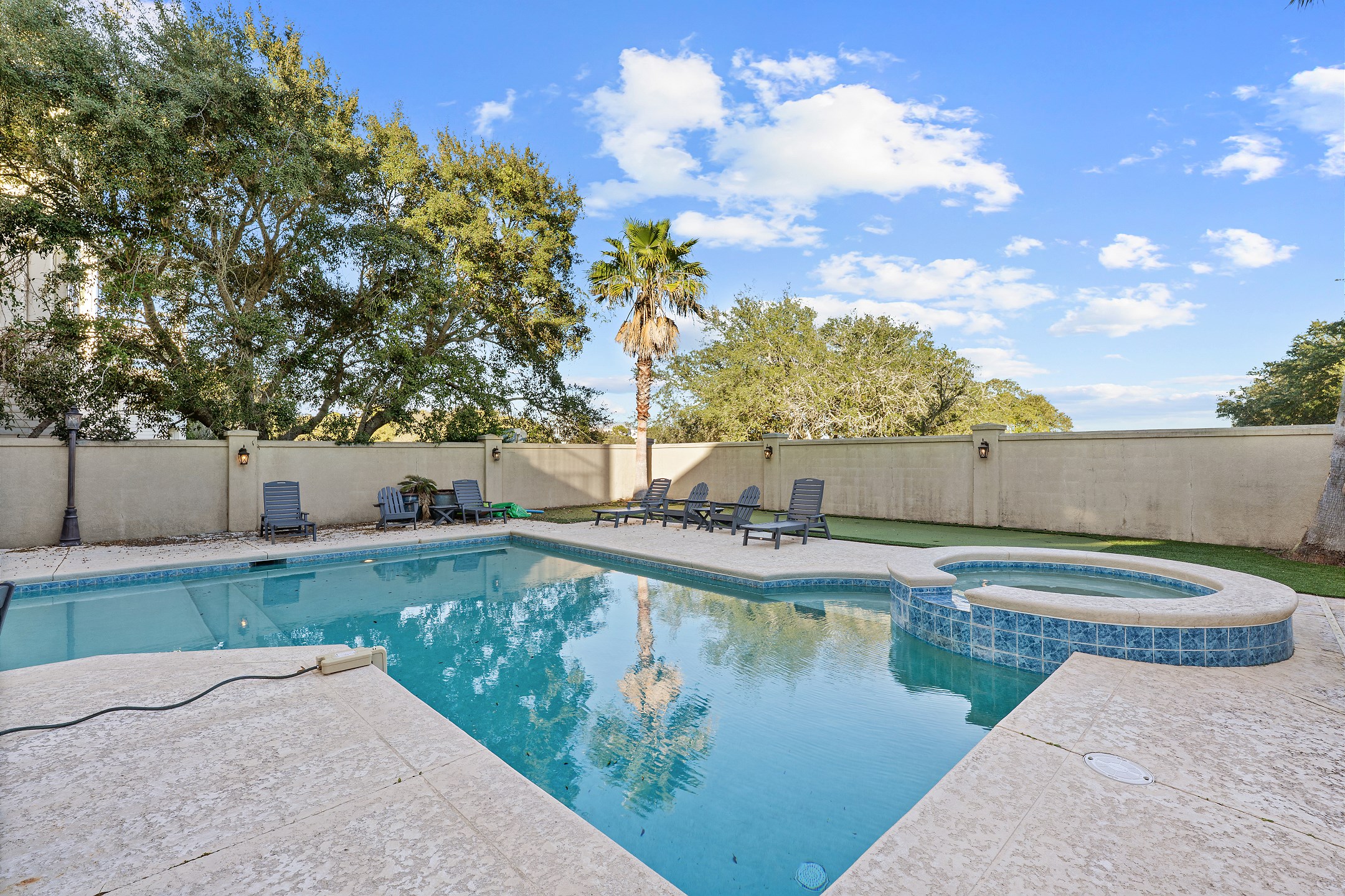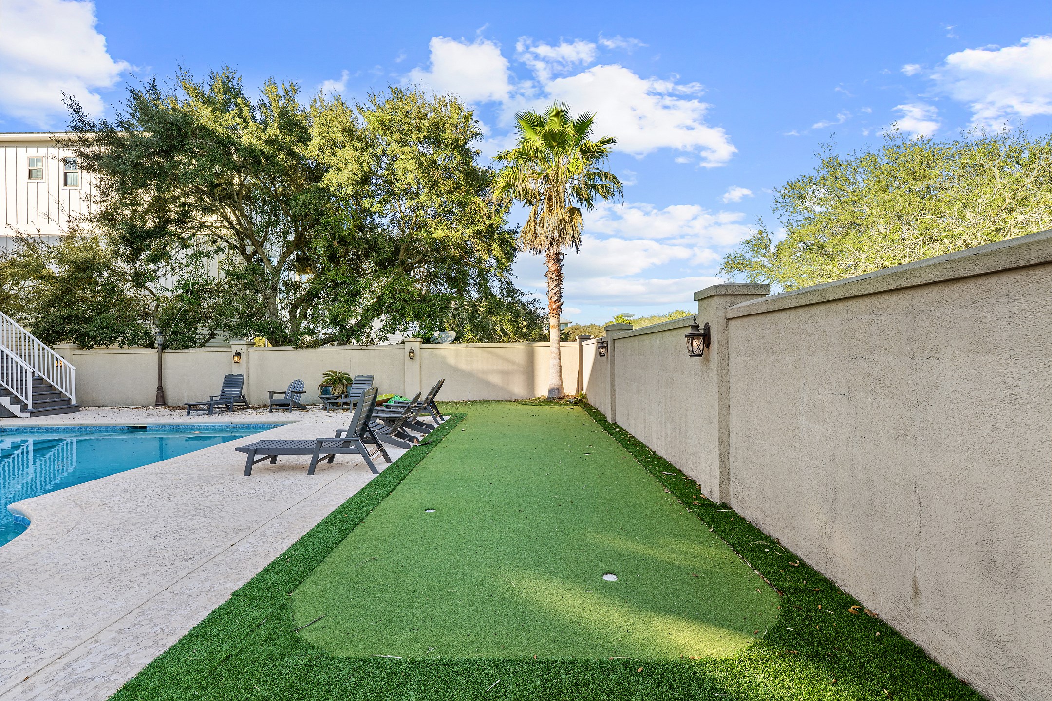 Step outside and unwind in your backyard oasis, complete with a private pool, relaxing hot tub, and your very own putting green. For added comfort, pool heating is available upon request for an additional $70. Both the balconies and patio offer plenty of seating, and the patio includes an outdoor kitchen with a grilling area, making it perfect for outdoor dining and entertaining. Additional conveniences include an interior elevator and an electric car charging port.