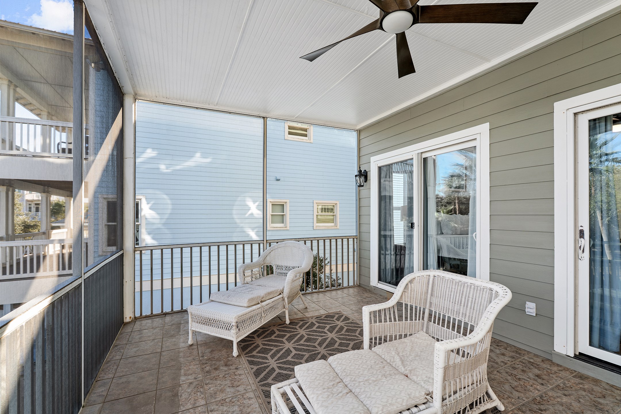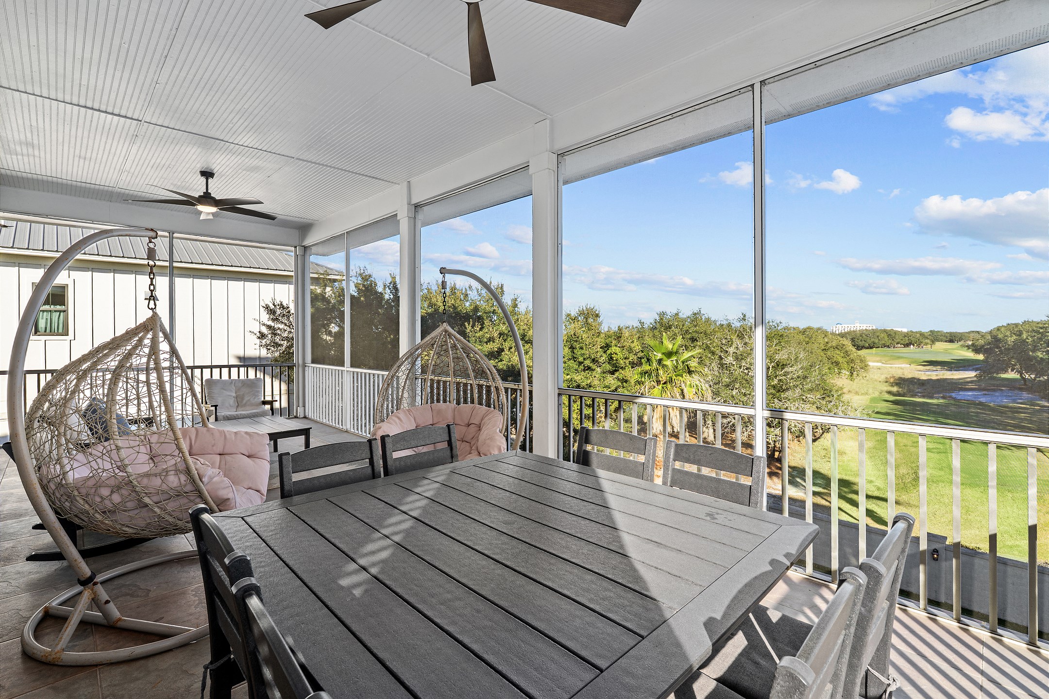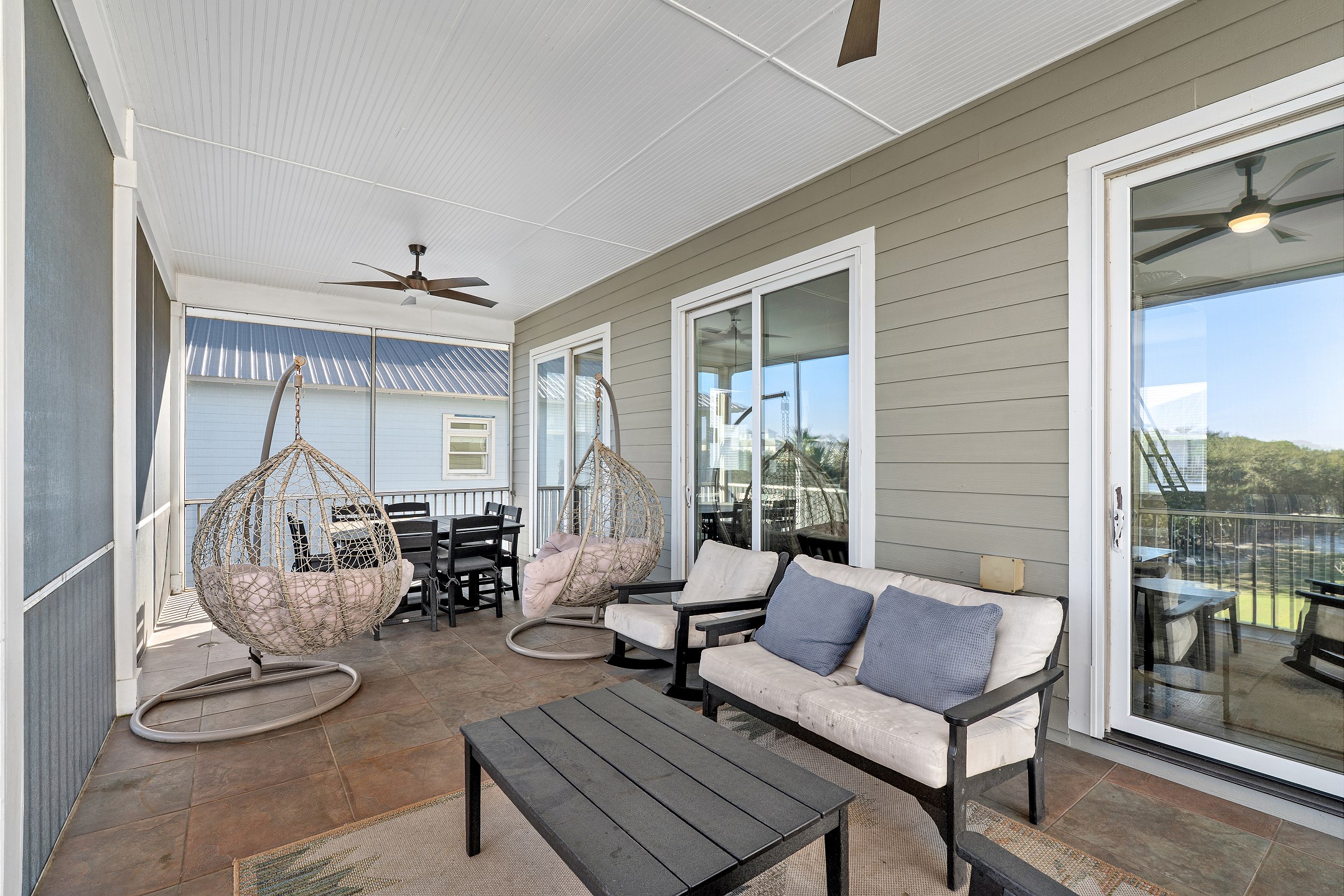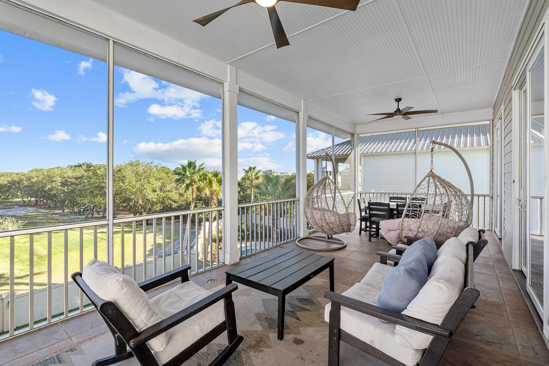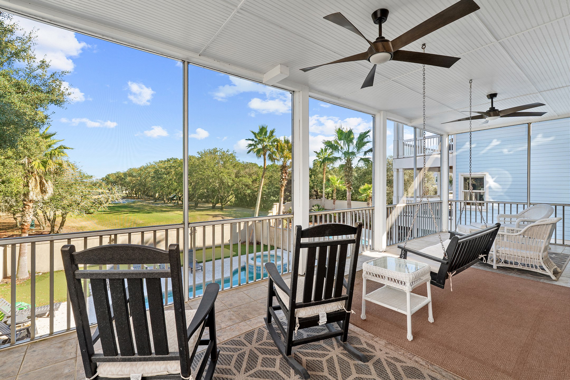 The second floor features two primary suites, both with king beds and access to a screened-in balcony. The first primary suite includes an ensuite bathroom with a dual sink vanity, a walk-in shower, and a jacuzzi tub. The second primary suite offers an ensuite bathroom with a shower and tub combination, providing a comfortable and private retreat for guests. The crow's nest on the top level is filled with natural light and features a twin daybed, creating a fun and relaxing escape.