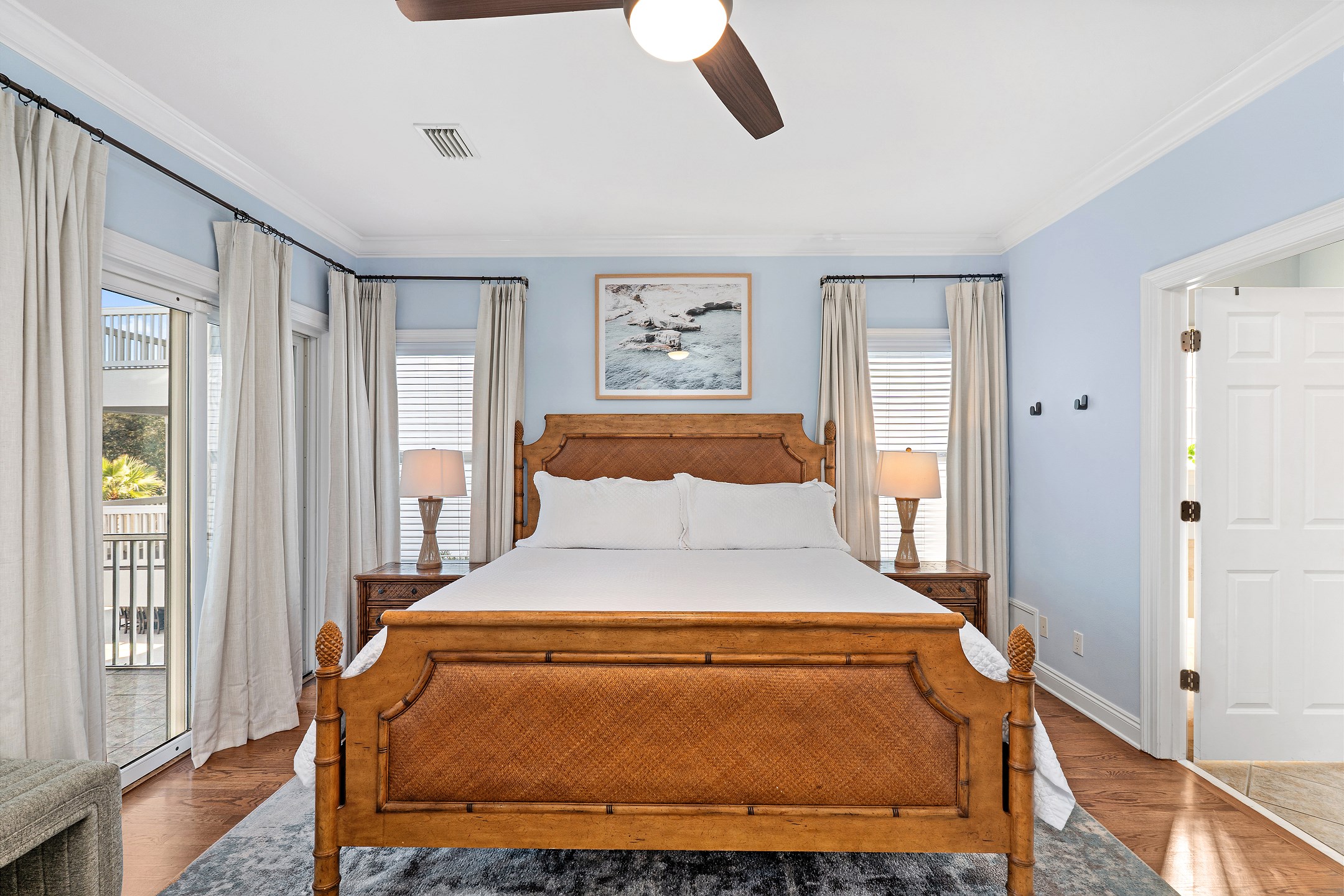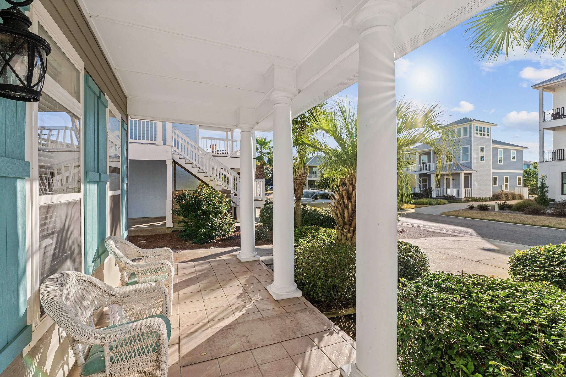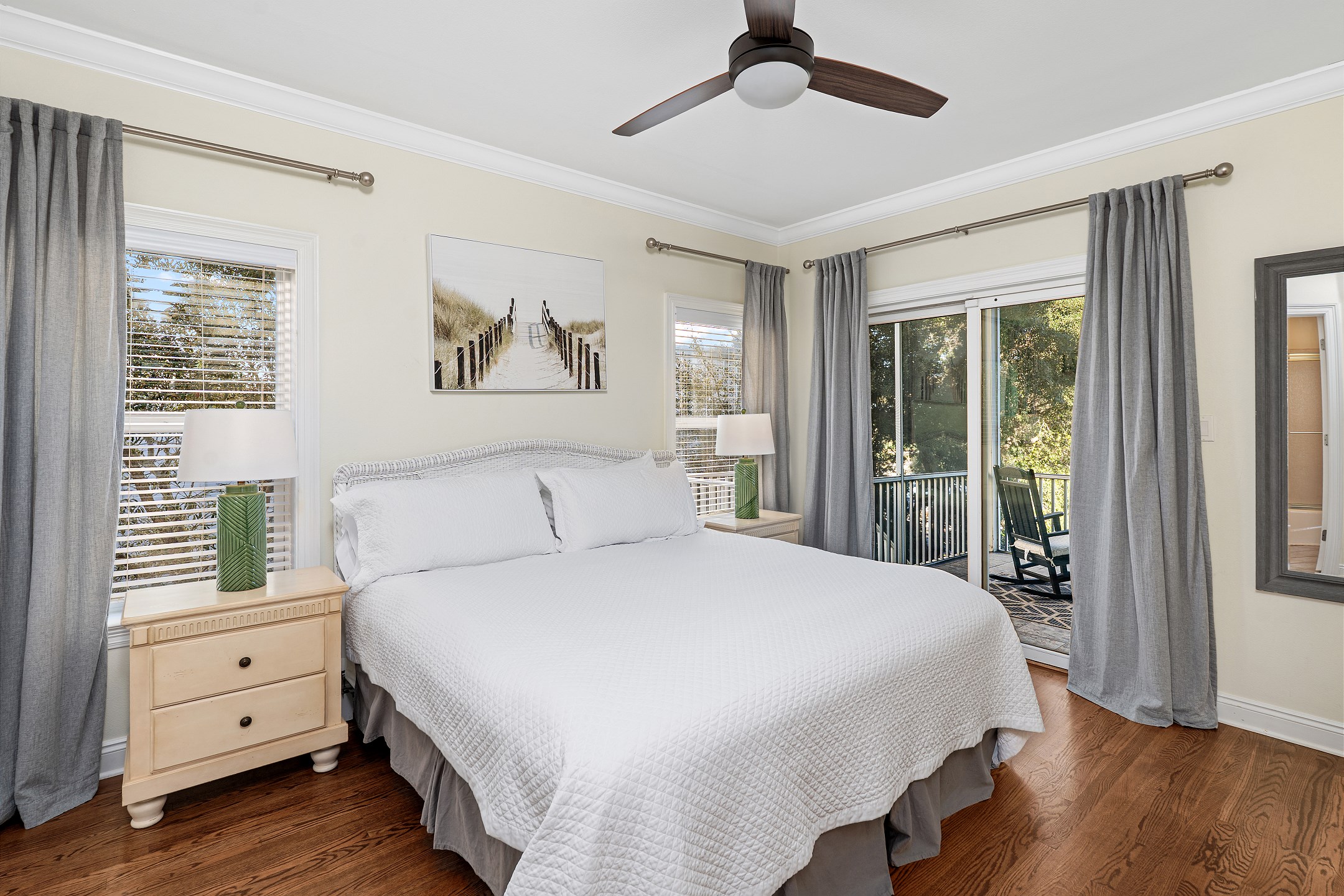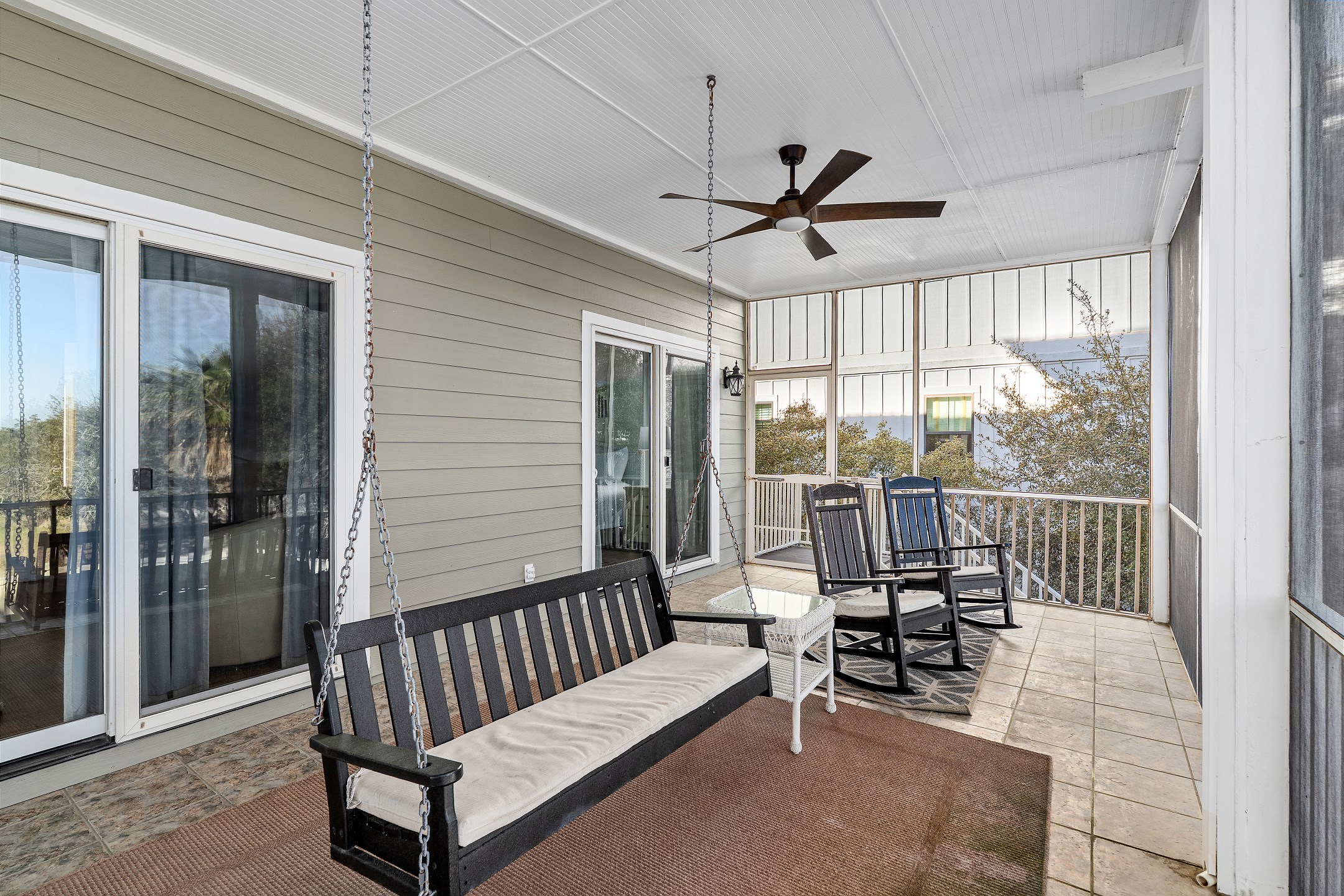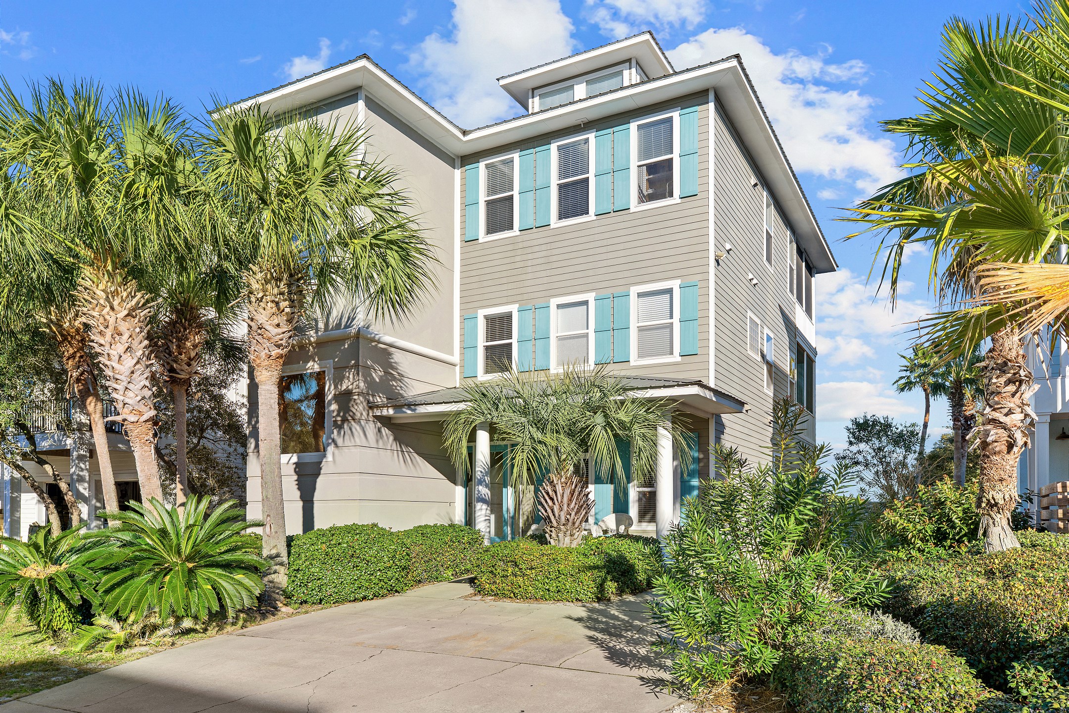 The second floor features two primary suites, both with king beds and access to a screened-in balcony. The first primary suite includes an ensuite bathroom with a dual sink vanity, a walk-in shower, and a jacuzzi tub. The second primary suite offers an ensuite bathroom with a shower and tub combination, providing a comfortable and private retreat for guests. The crow's nest on the top level is filled with natural light and features a twin daybed, creating a fun and relaxing escape.