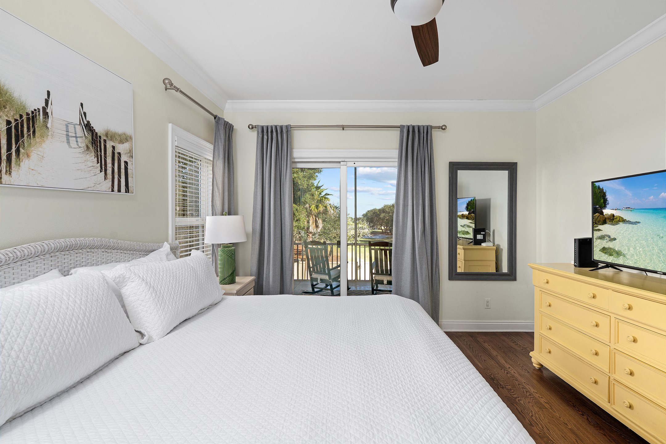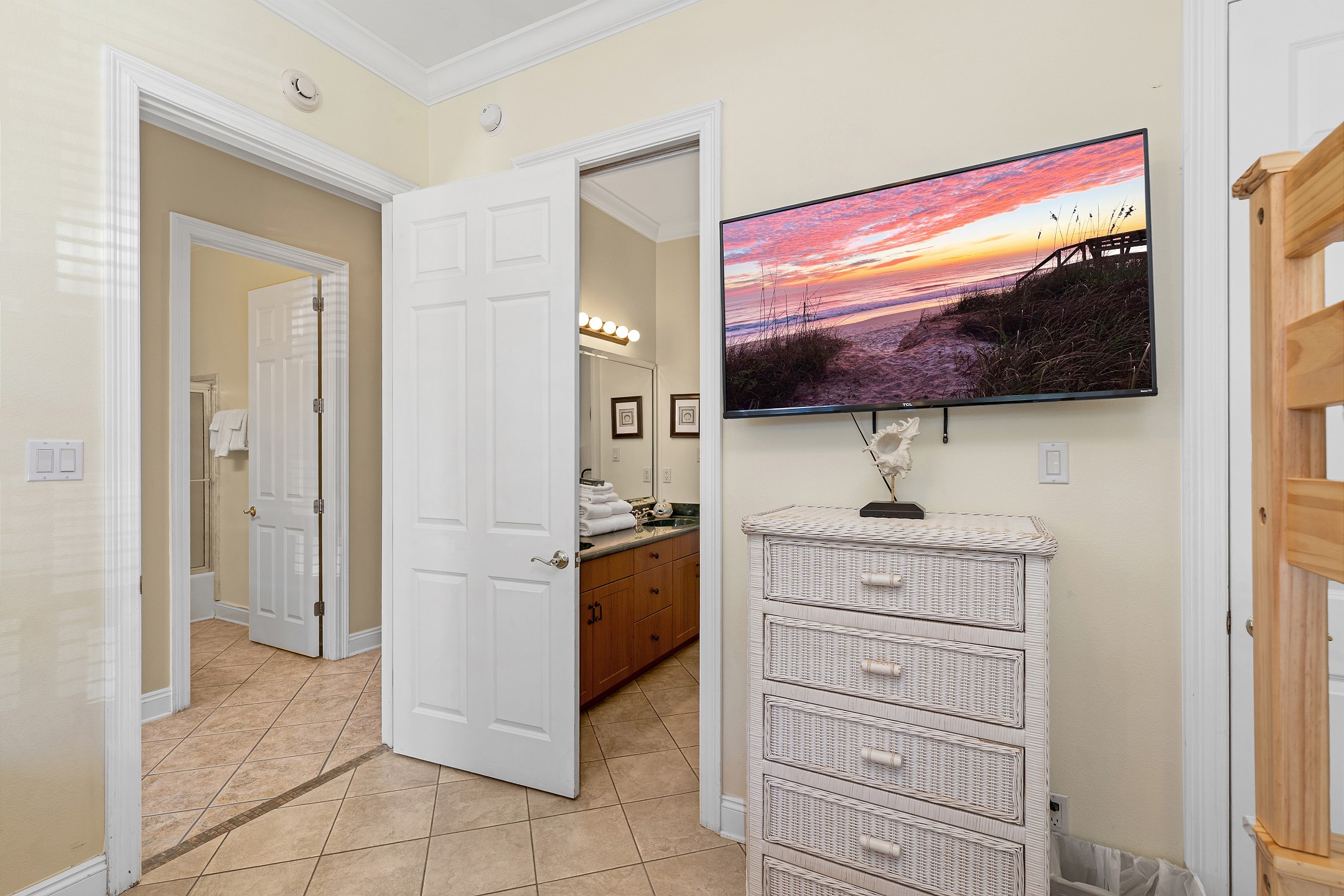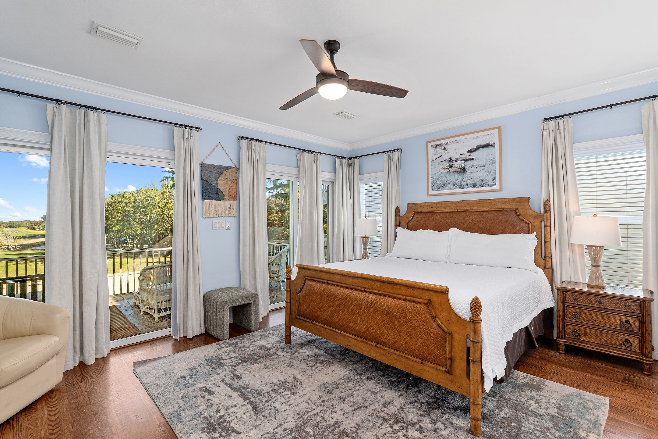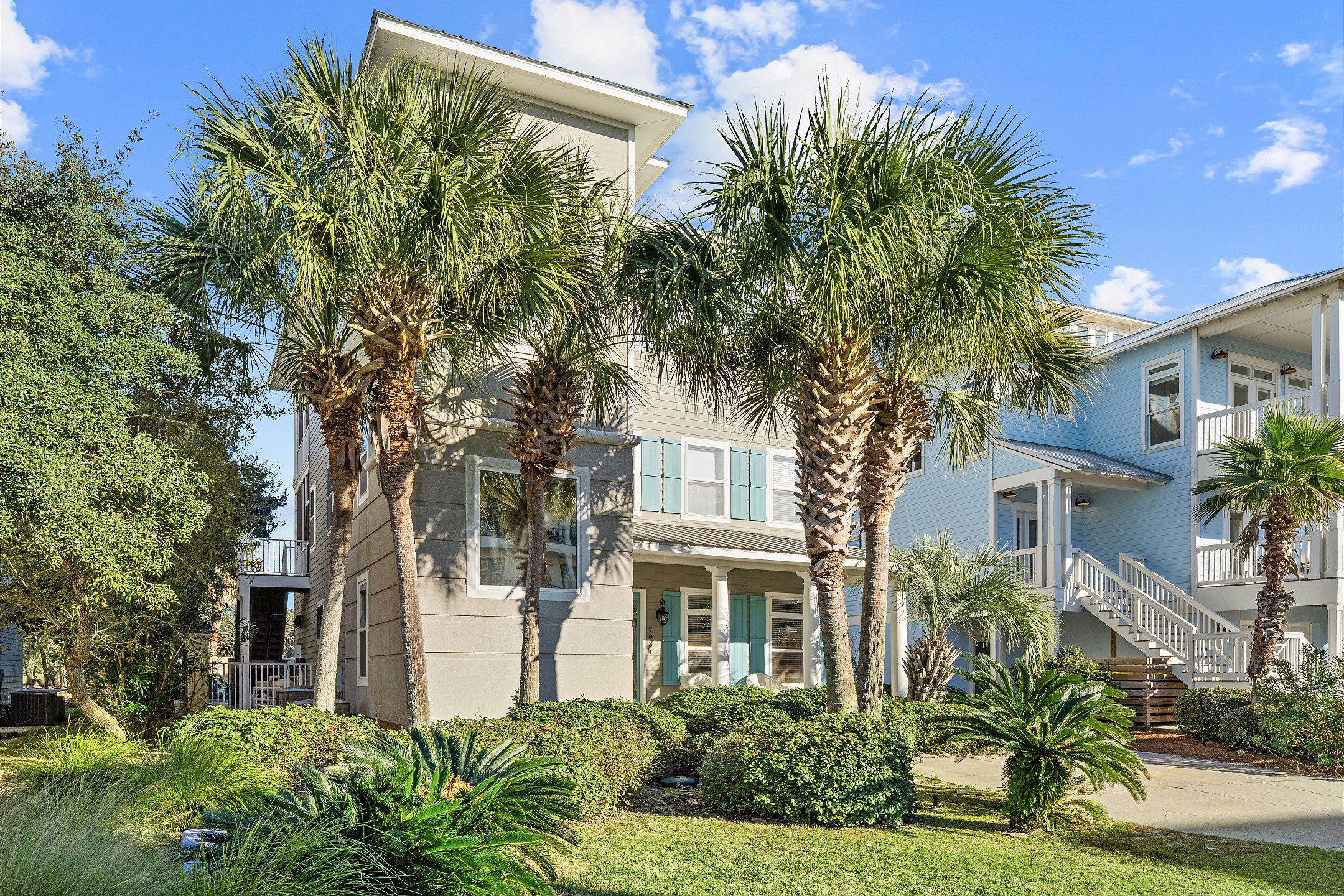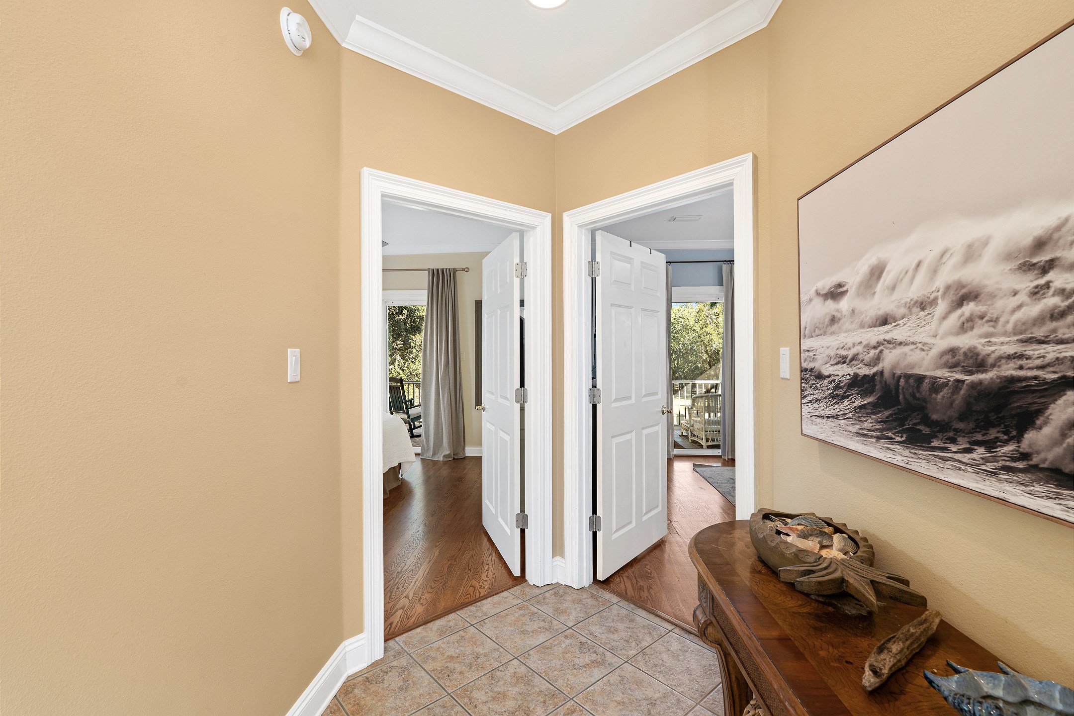 The second floor features two primary suites, both with king beds and access to a screened-in balcony. The first primary suite includes an ensuite bathroom with a dual sink vanity, a walk-in shower, and a jacuzzi tub. The second primary suite offers an ensuite bathroom with a shower and tub combination, providing a comfortable and private retreat for guests. The crow's nest on the top level is filled with natural light and features a twin daybed, creating a fun and relaxing escape.