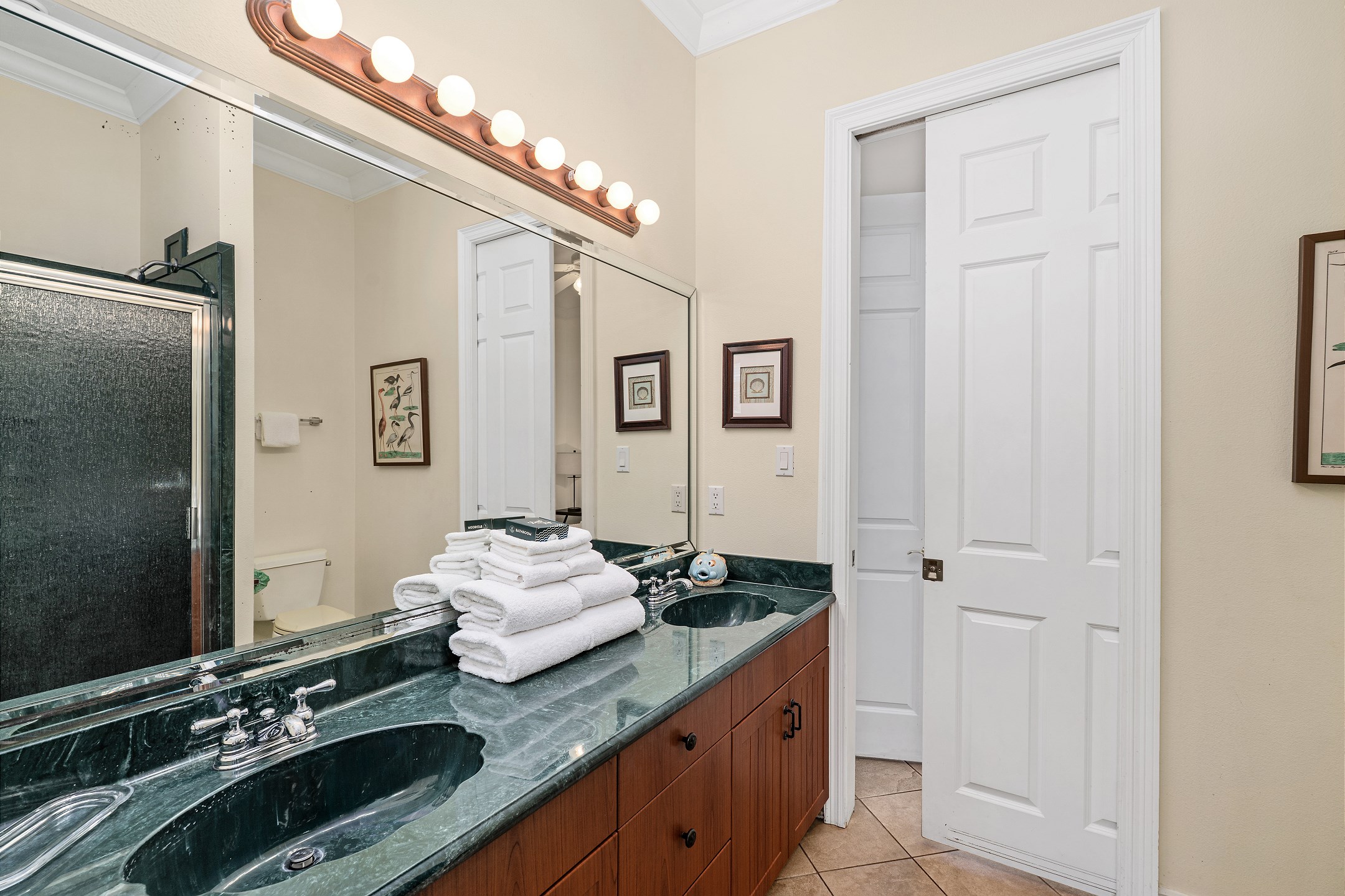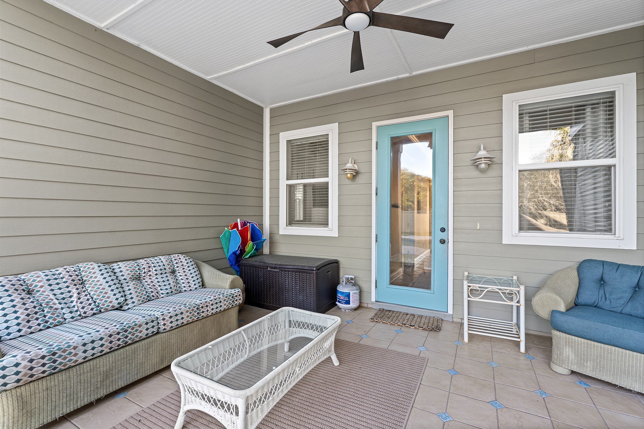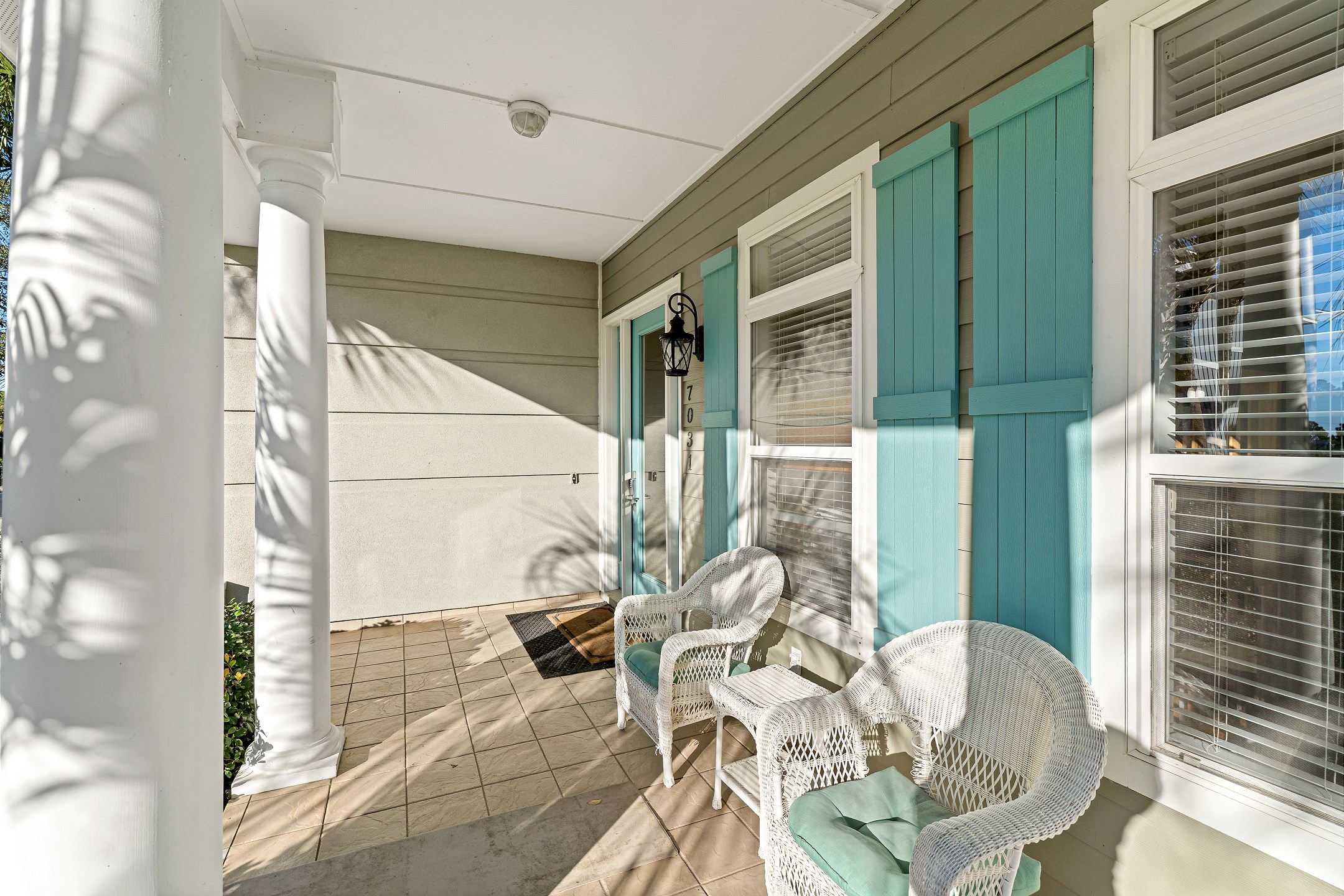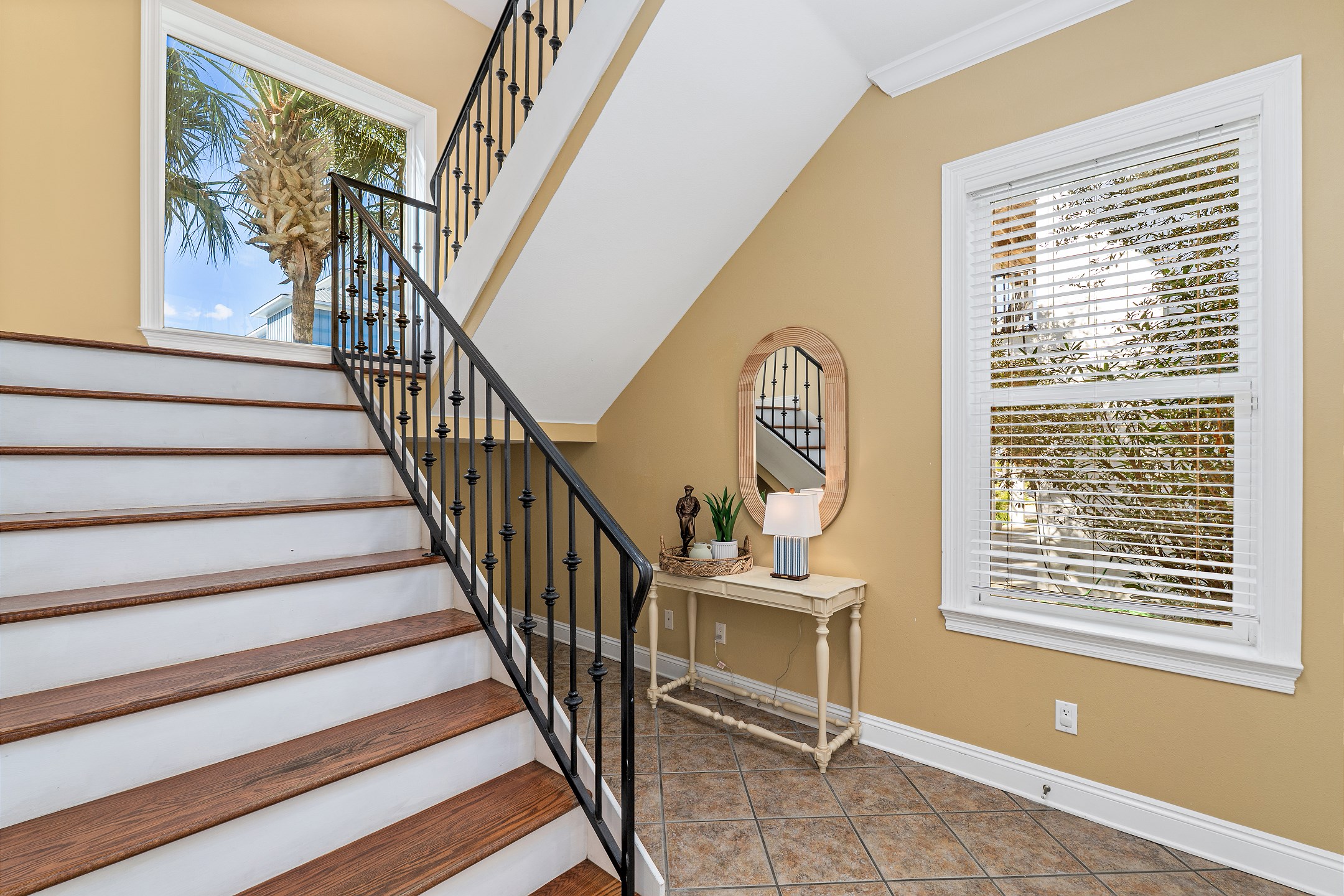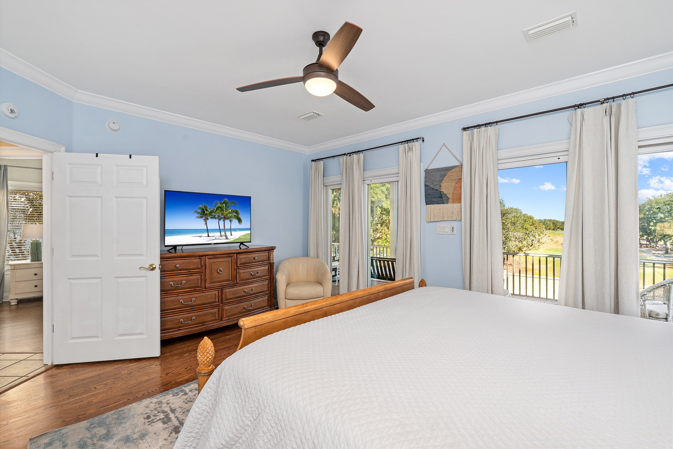 The second floor features two primary suites, both with king beds and access to a screened-in balcony. The first primary suite includes an ensuite bathroom with a dual sink vanity, a walk-in shower, and a jacuzzi tub. The second primary suite offers an ensuite bathroom with a shower and tub combination, providing a comfortable and private retreat for guests. The crow's nest on the top level is filled with natural light and features a twin daybed, creating a fun and relaxing escape.