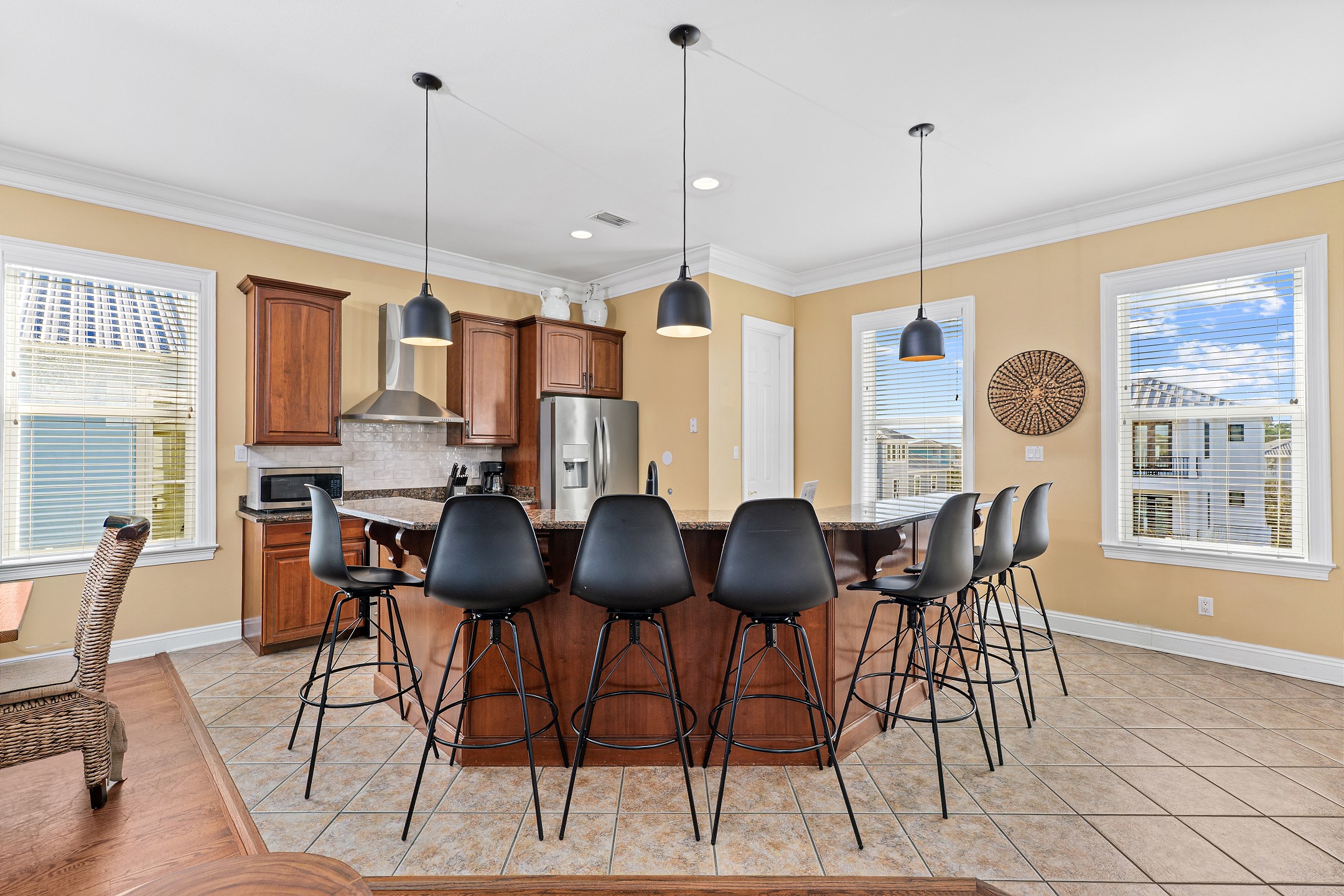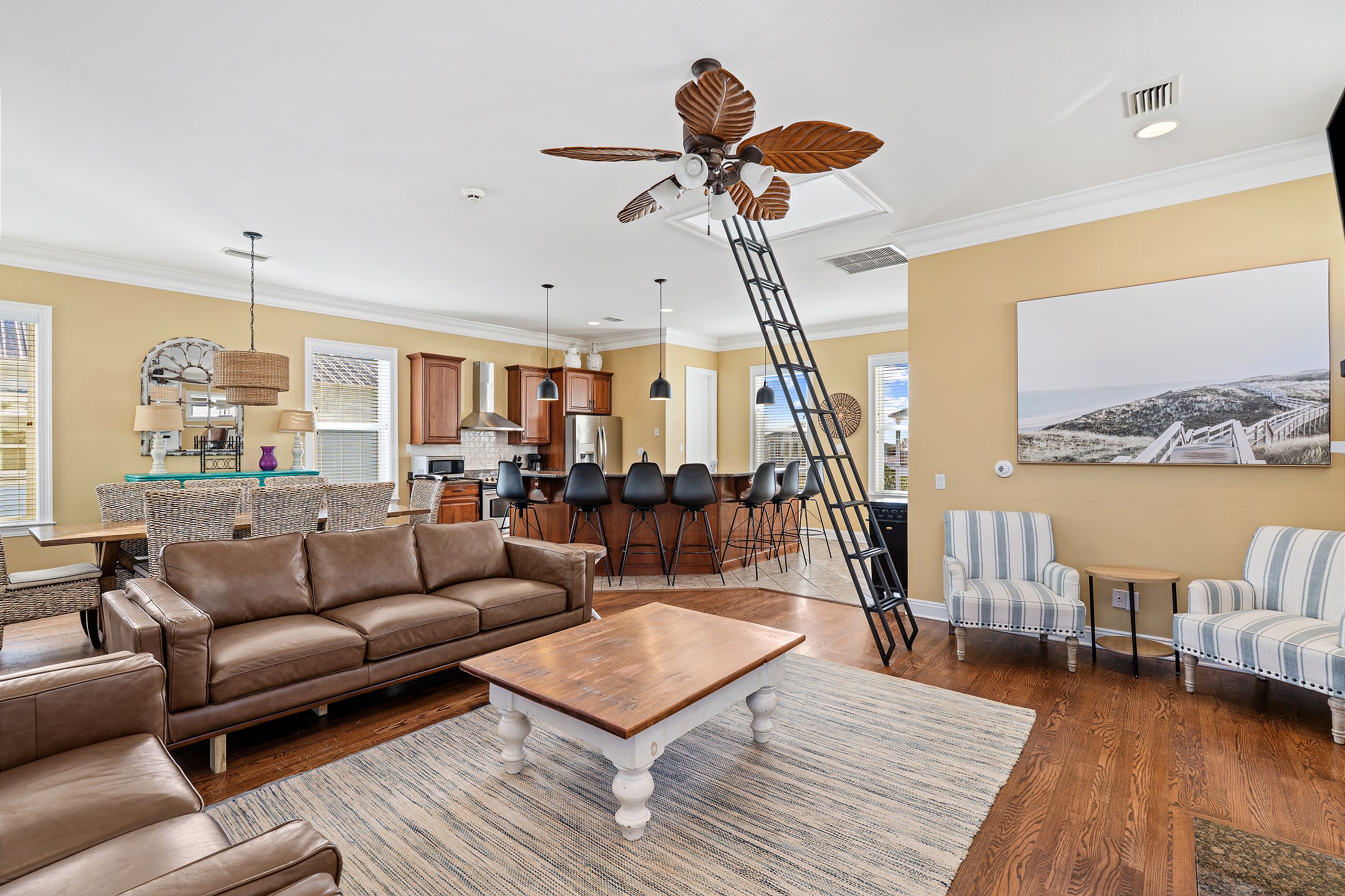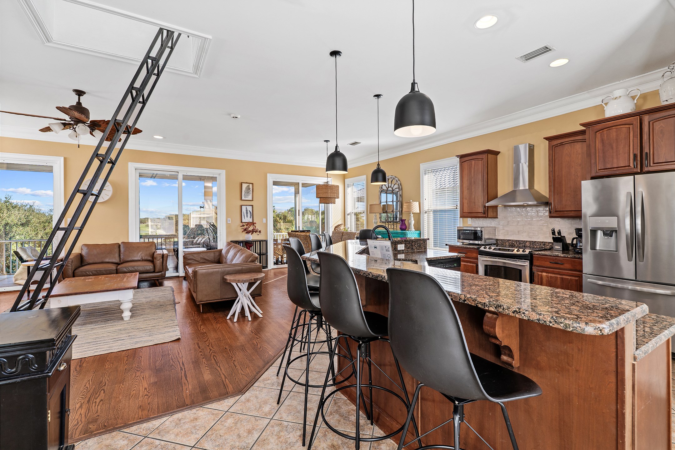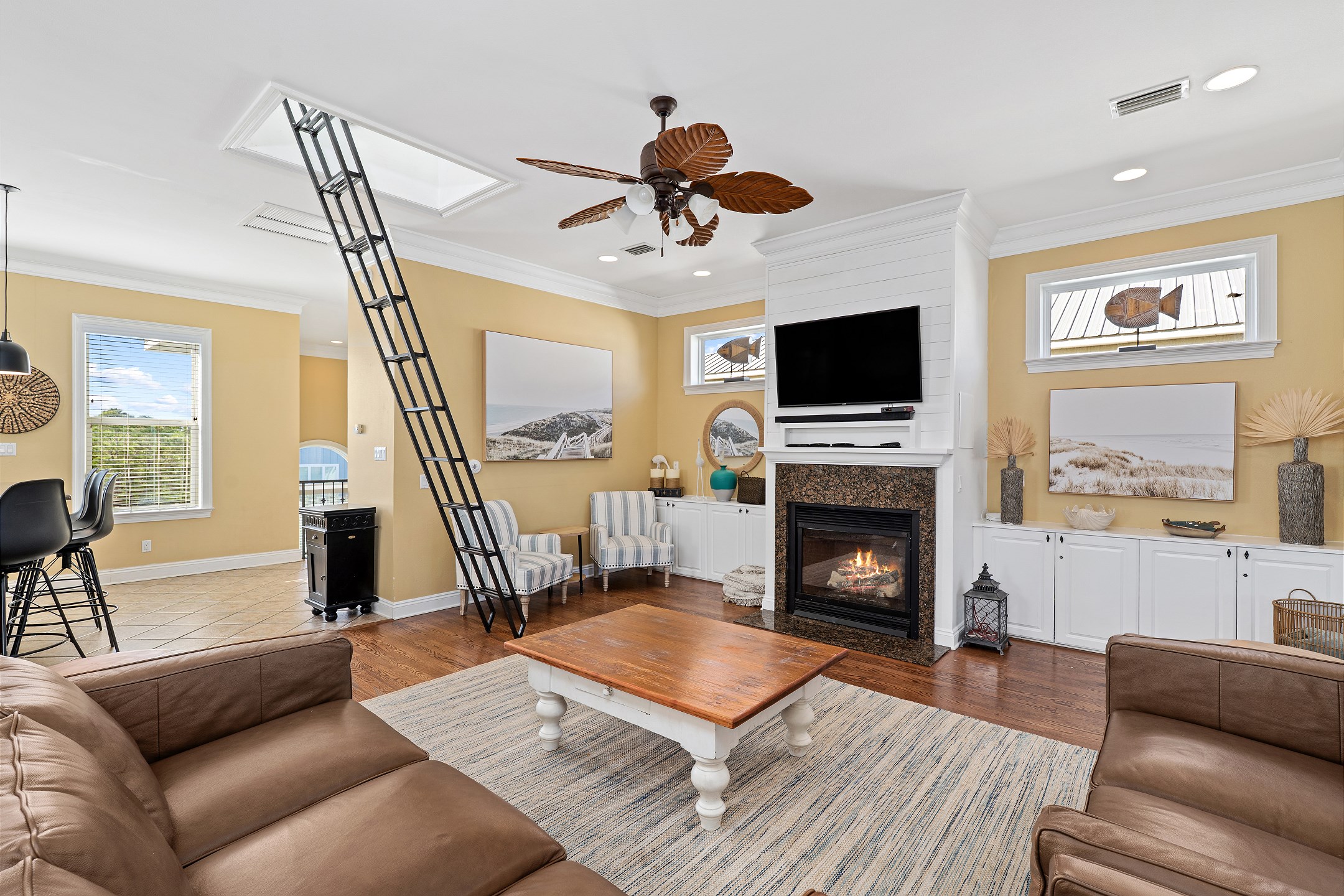 The inviting living room features ample seating, a flat screen TV, a cozy fireplace, and direct access to a private balcony, making it the perfect gathering space for family and friends. Stairs from the living area lead up to the crow's nest, a light-filled retreat featuring a twin daybed, ideal for relaxing or enjoying quiet time. The fully equipped kitchen is designed for entertaining and includes stainless steel appliances, granite countertops, and a large dining table for shared meals and celebrations.