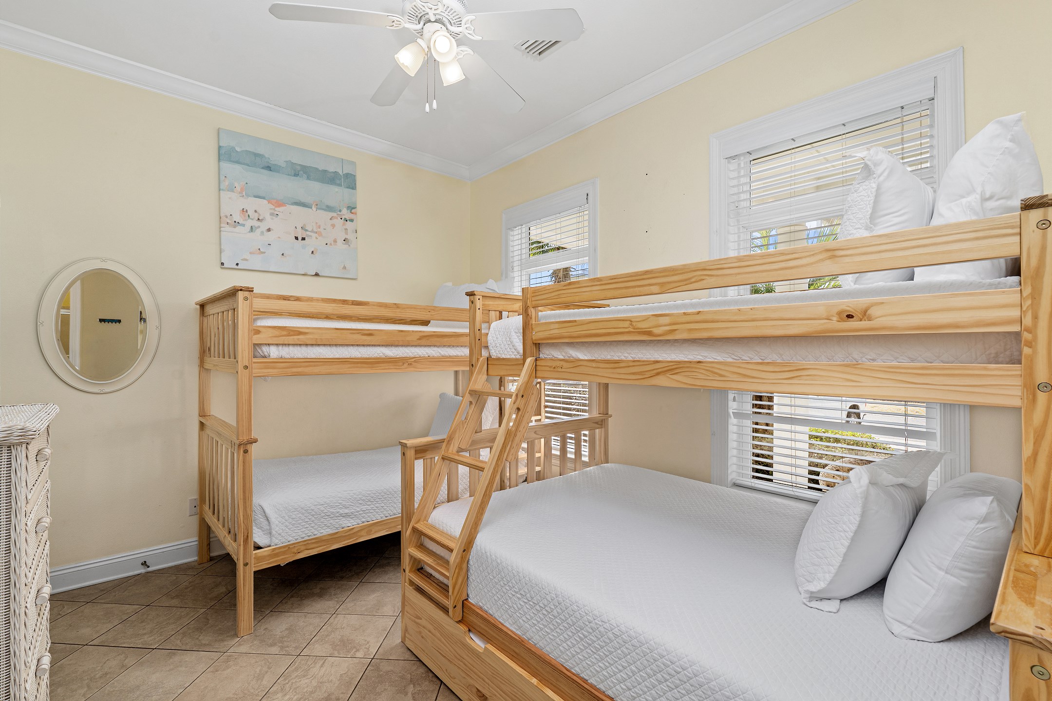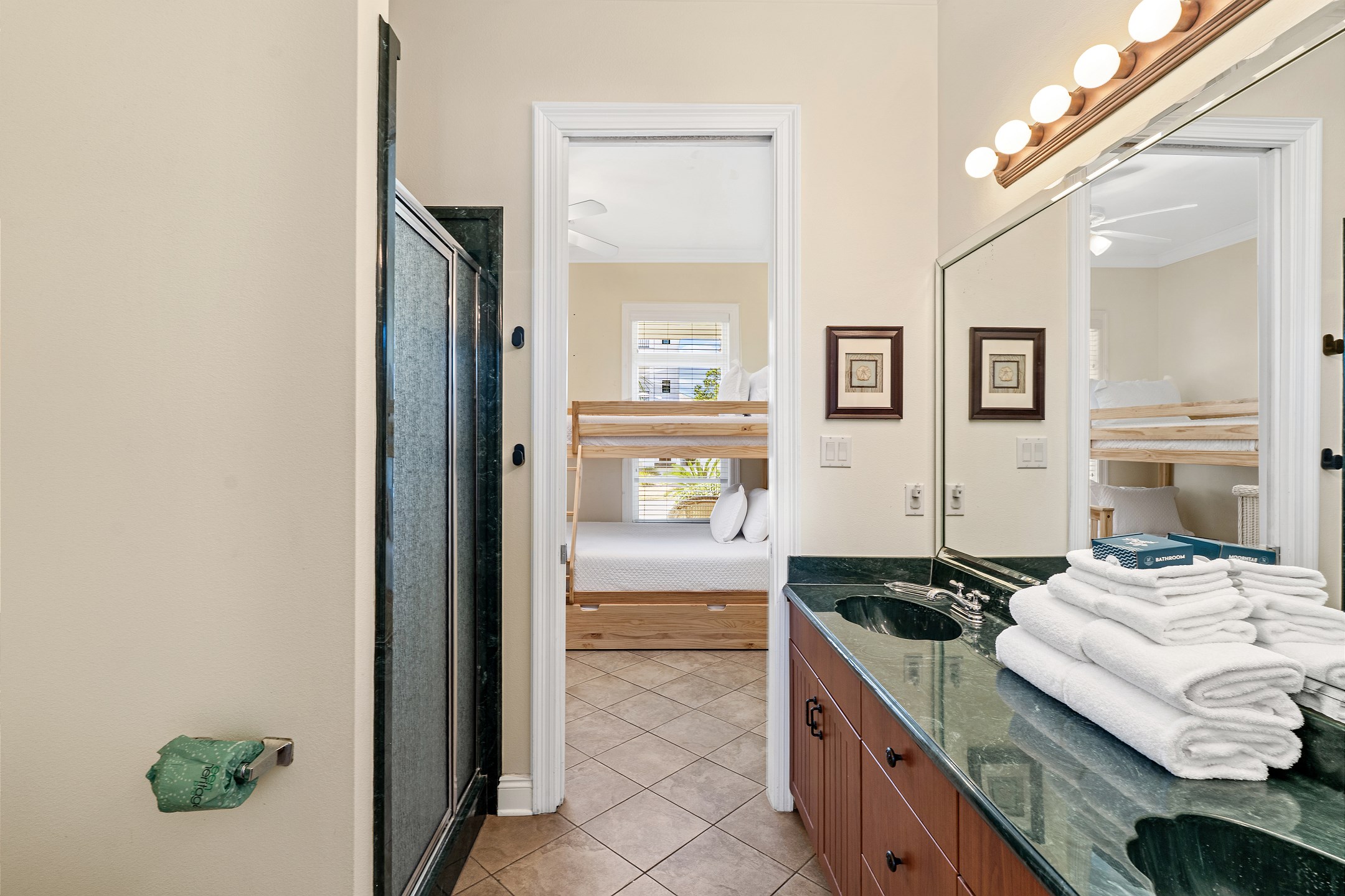 On the first floor, the first bedroom features a king bed and a flat-screen TV. The second bedroom also features a king bed and shares a Jack and Jill bathroom with the third bedroom, a bunk room that includes a twin over twin bunk, a twin over full bunk, and a twin trundle. This bathroom features a walk-in shower, creating a convenient and flexible sleeping arrangement for families and groups.