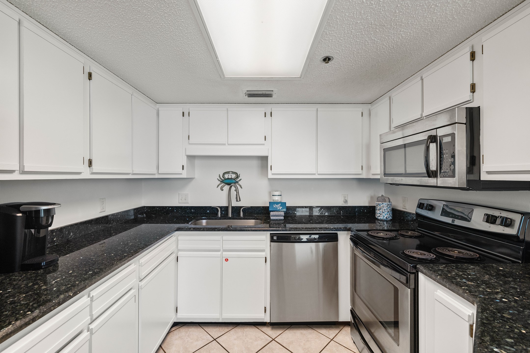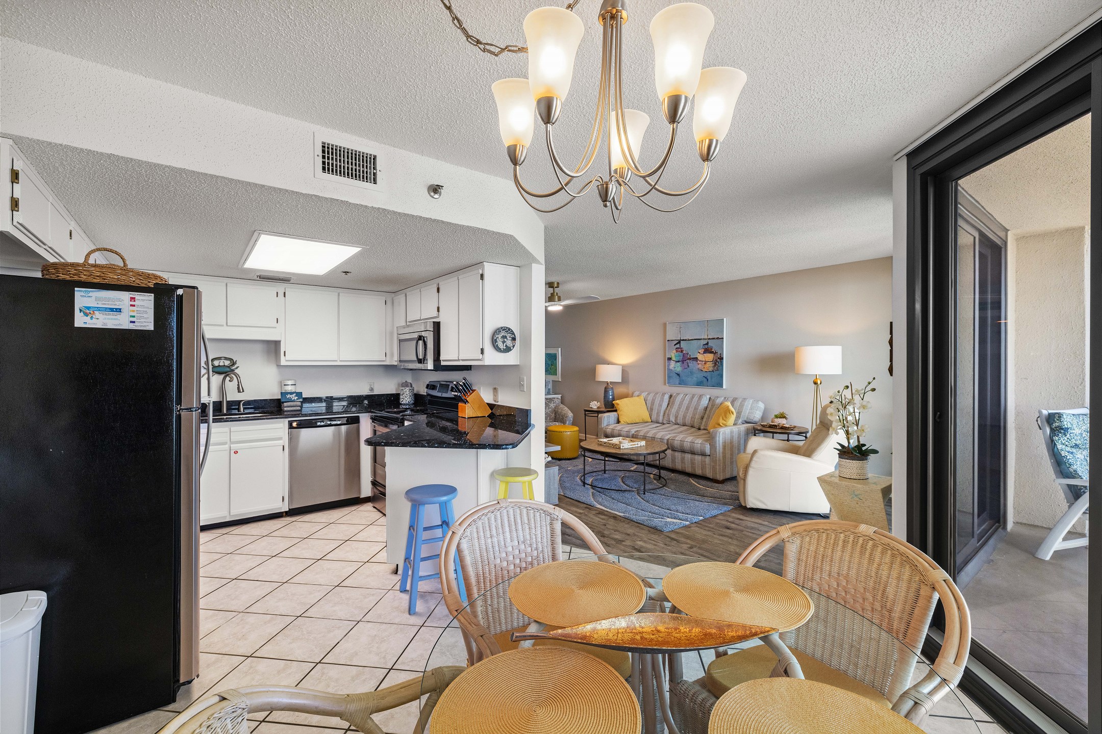 The heart of the condo, the living room, is a welcoming space that includes a sofa sleeper to comfortably host additional guests. The kitchen, a harmonious blend of style and function, is fully equipped with granite countertops and a cozy breakfast nook, perfect for enjoying your morning coffee or preparing delicious meals.